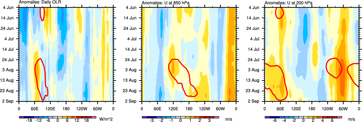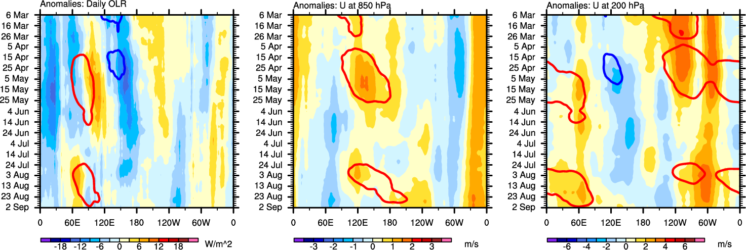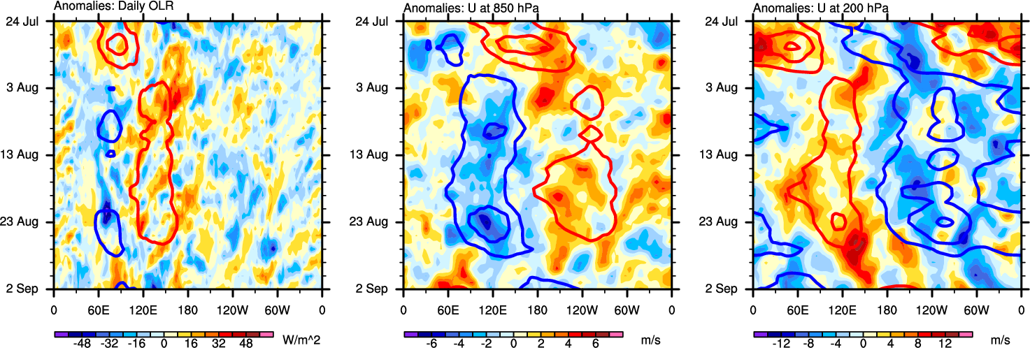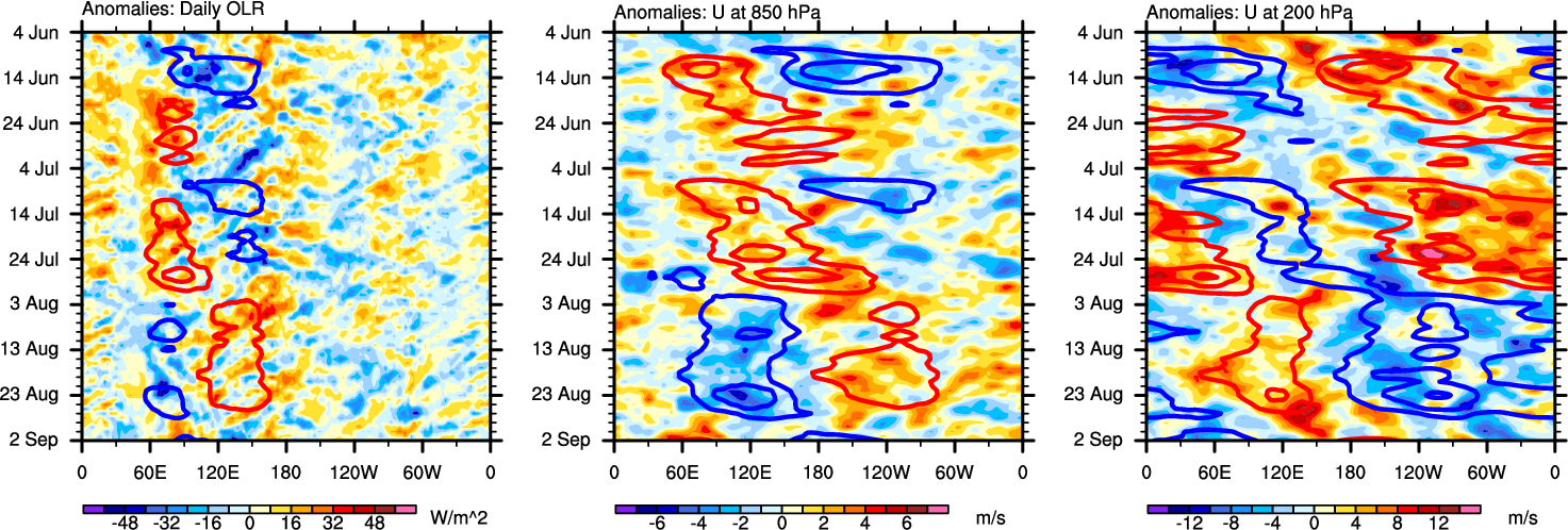 The Hovmöllers show longitude-time plots for OLR, U-850, and U-200. The shading indicates the observed anomalies, while the contours are the projection of those anomalies onto the RMM EOFs.