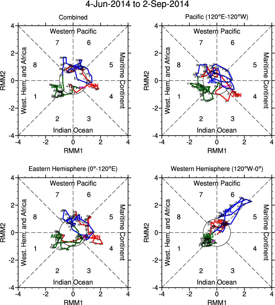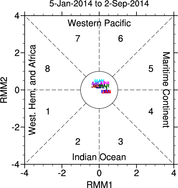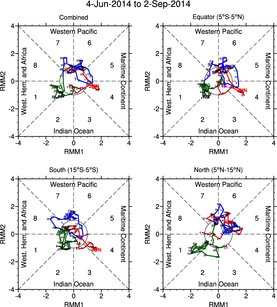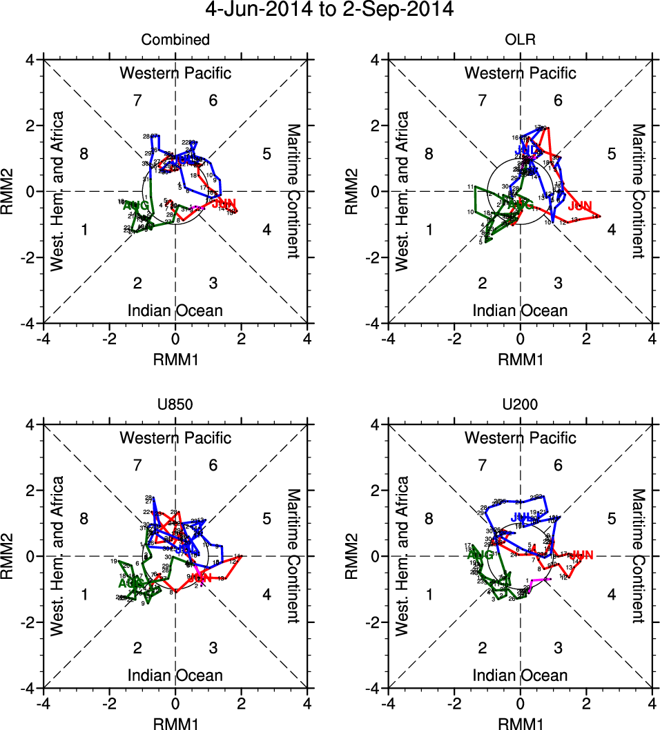 Wheeler and Hendon (2004) constructed the RMM index for monitoring the MJO. This index consists of the first two principal components (PCs) of OLR, 850-hPa zonal wind, and 200-hPa zonal wind averaged 15S-15N.