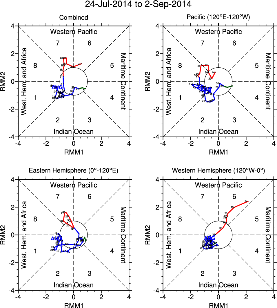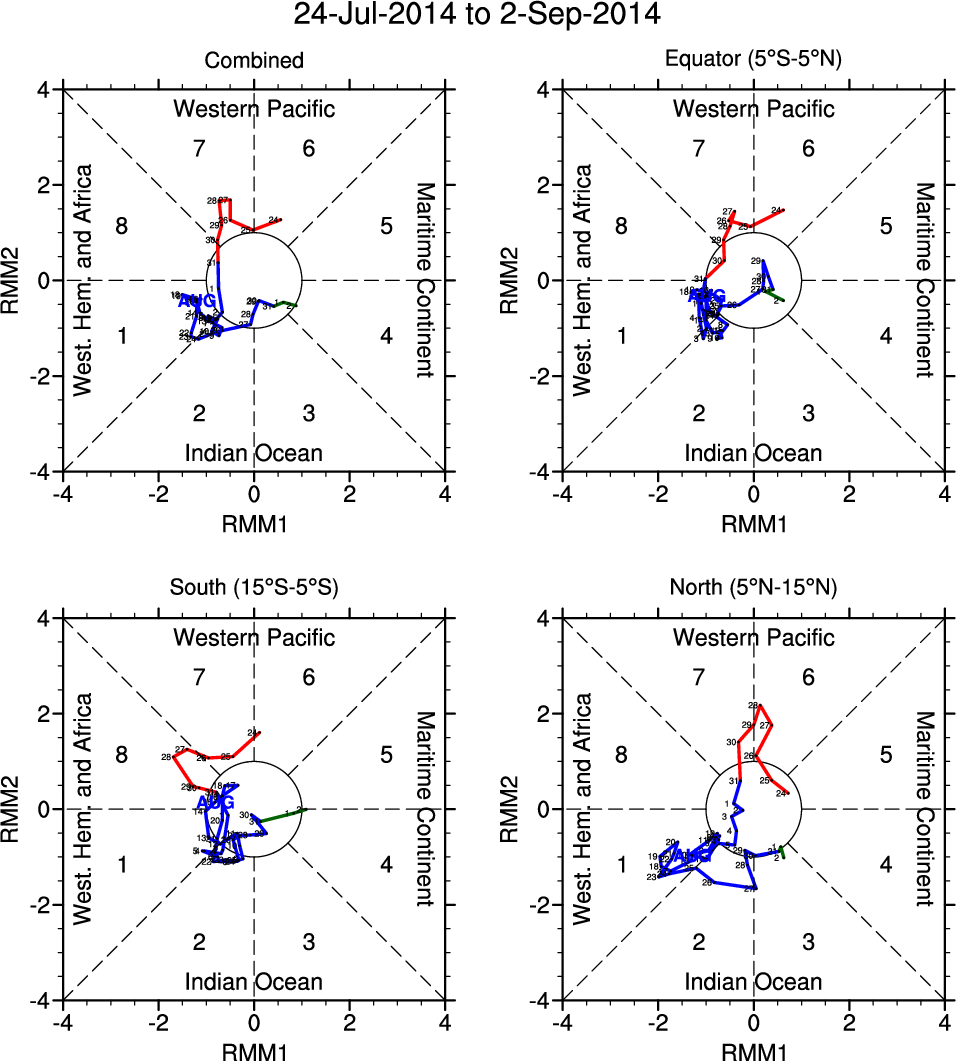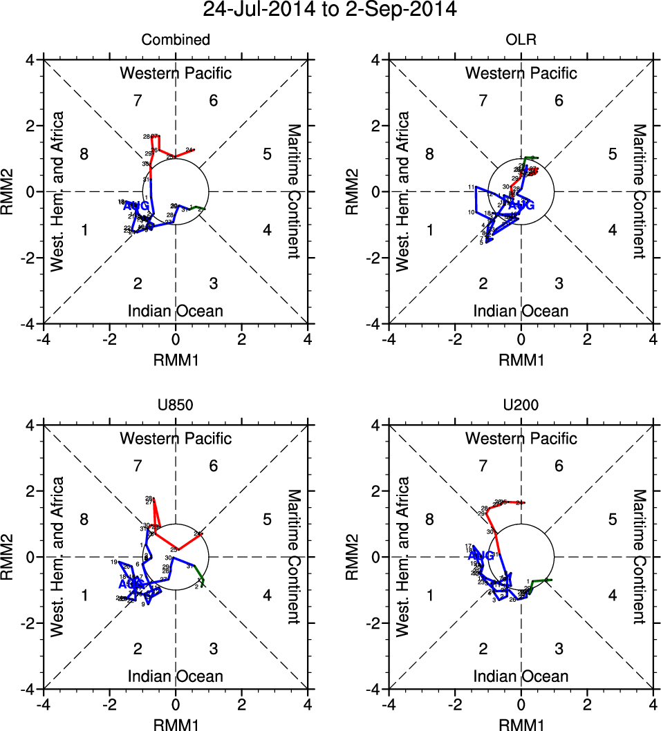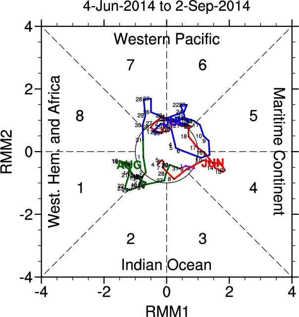Wheeler and Hendon (2004) constructed the RMM index for monitoring the MJO. This index consists of the first two principal components (PCs) of OLR, 850-hPa zonal wind, and 200-hPa zonal wind averaged 15S-15N.