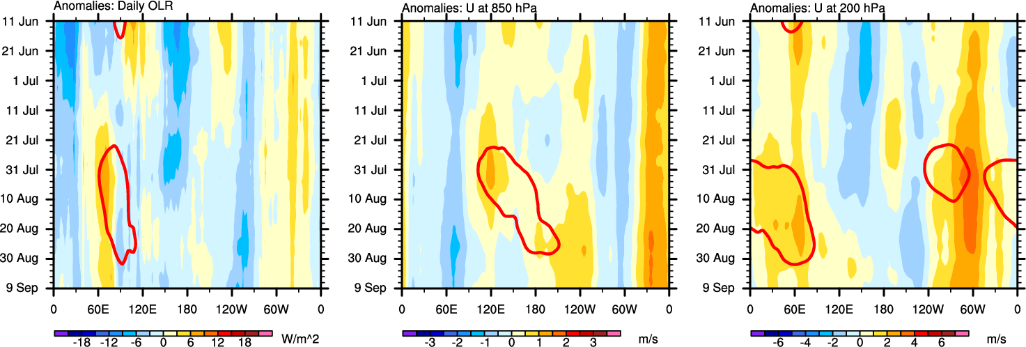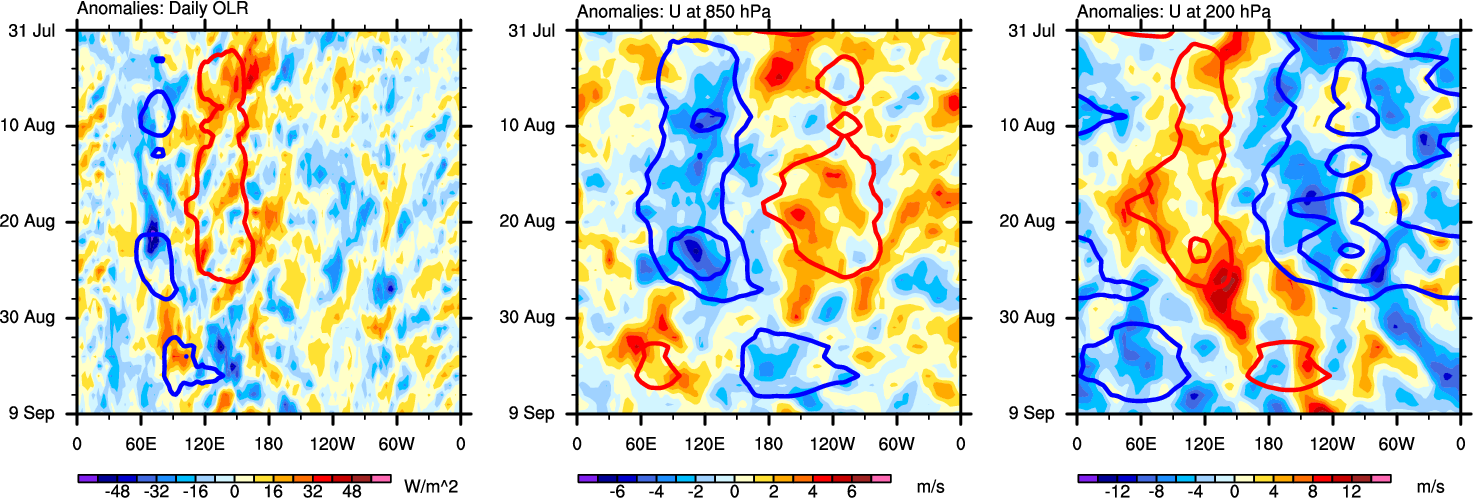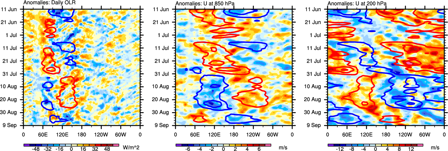 The Hovmöllers show longitude-time plots for OLR, U-850, and U-200. The shading indicates the observed anomalies, while the contours are the projection of those anomalies onto the RMM EOFs.