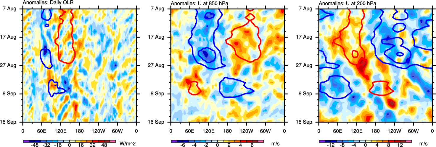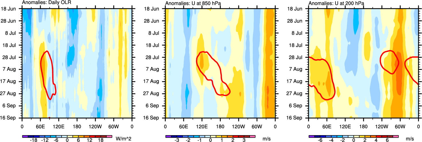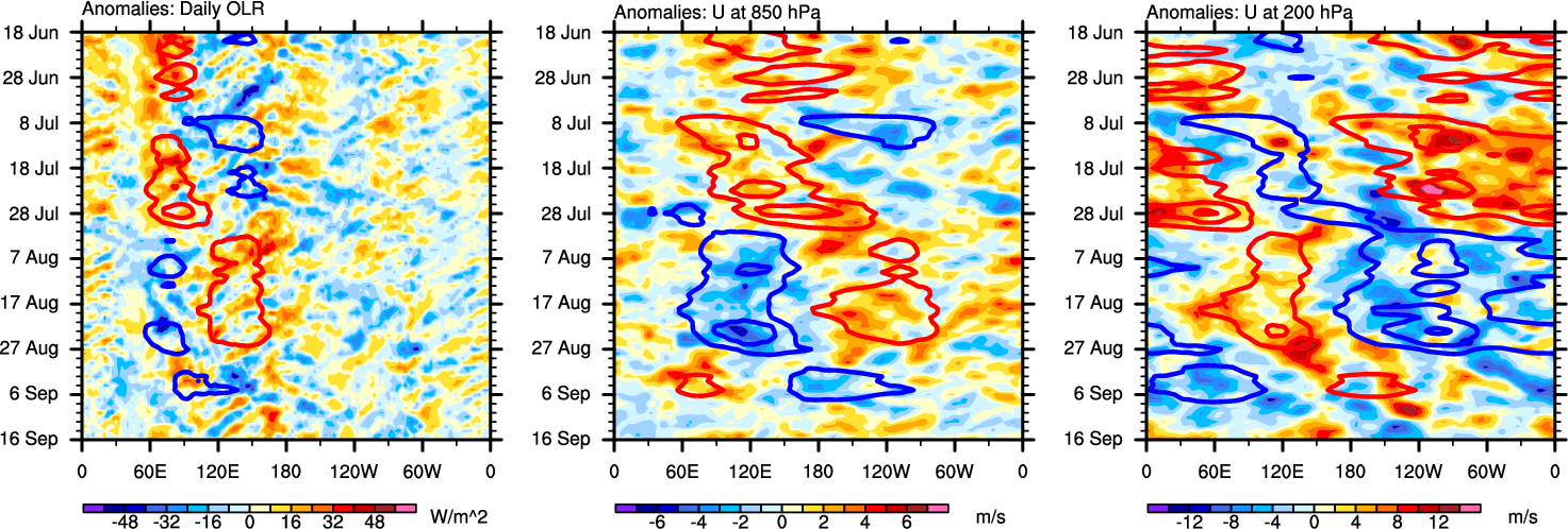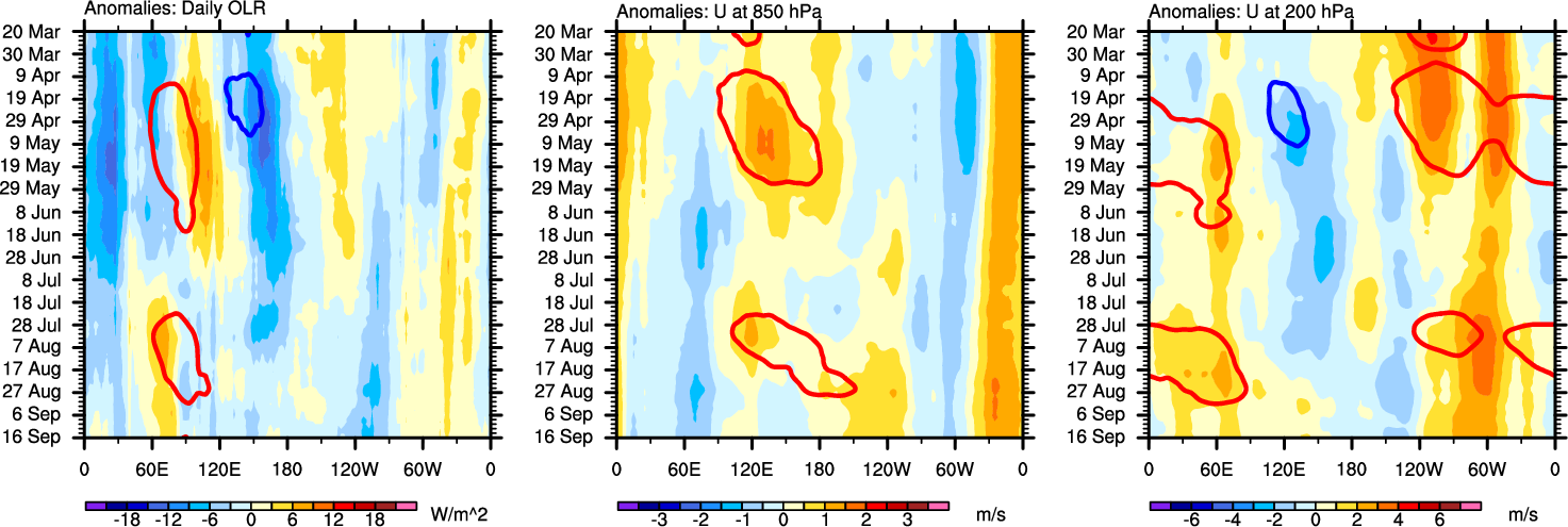 The Hovmöllers show longitude-time plots for OLR, U-850, and U-200. The shading indicates the observed anomalies, while the contours are the projection of those anomalies onto the RMM EOFs.