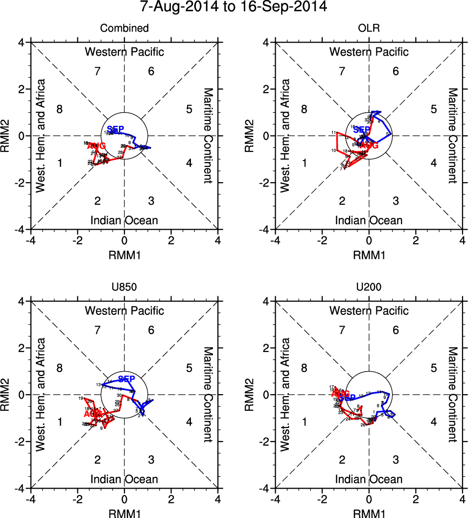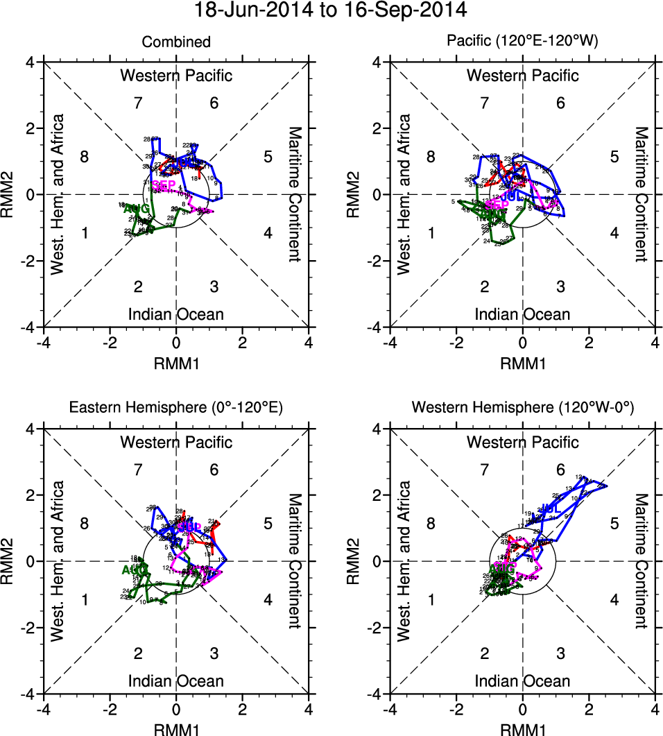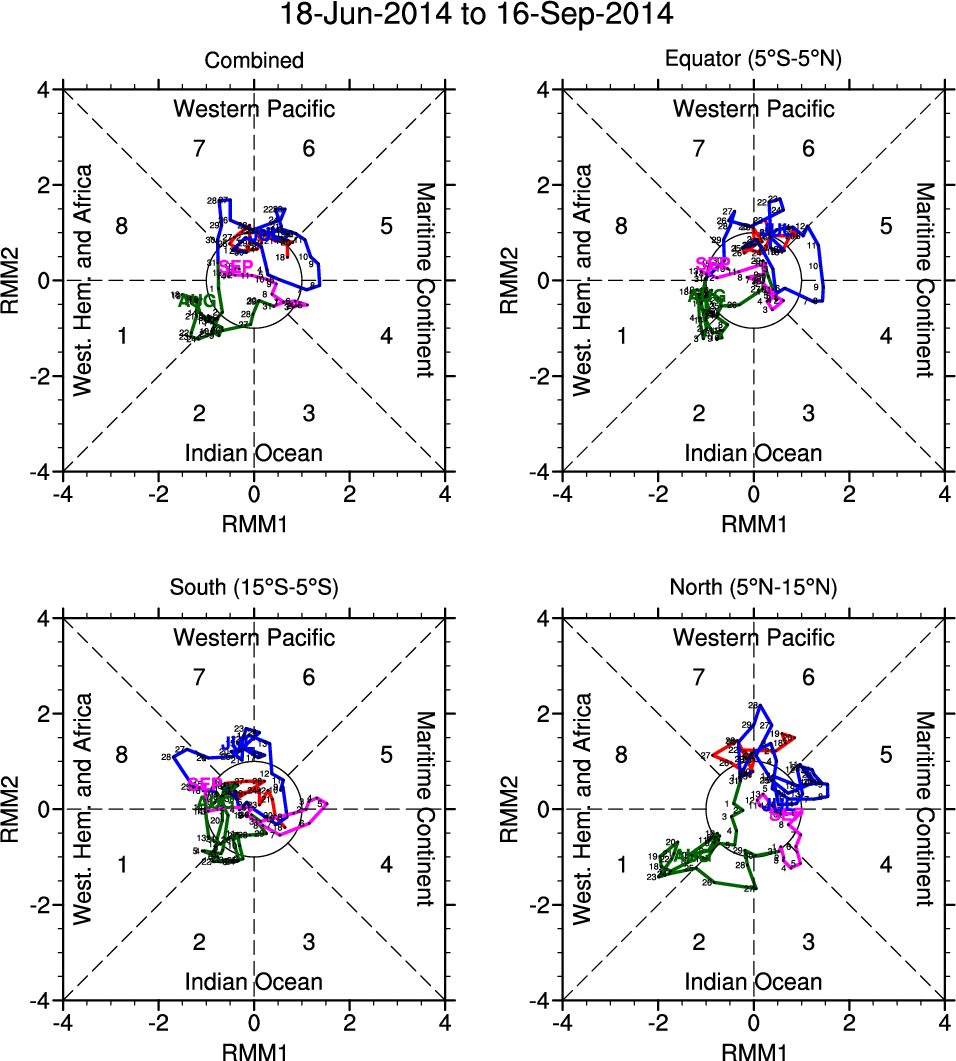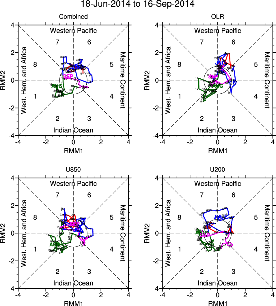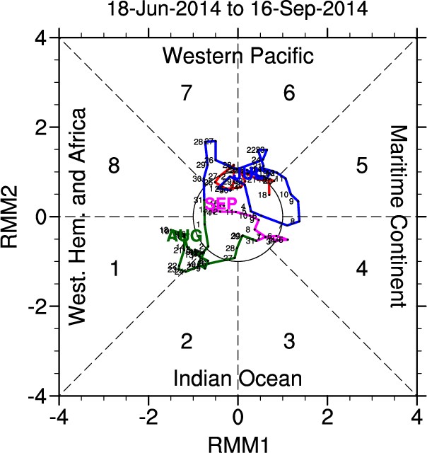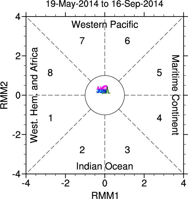 Wheeler and Hendon (2004) constructed the RMM index for monitoring the MJO. This index consists of the first two principal components (PCs) of OLR, 850-hPa zonal wind, and 200-hPa zonal wind averaged 15S-15N.