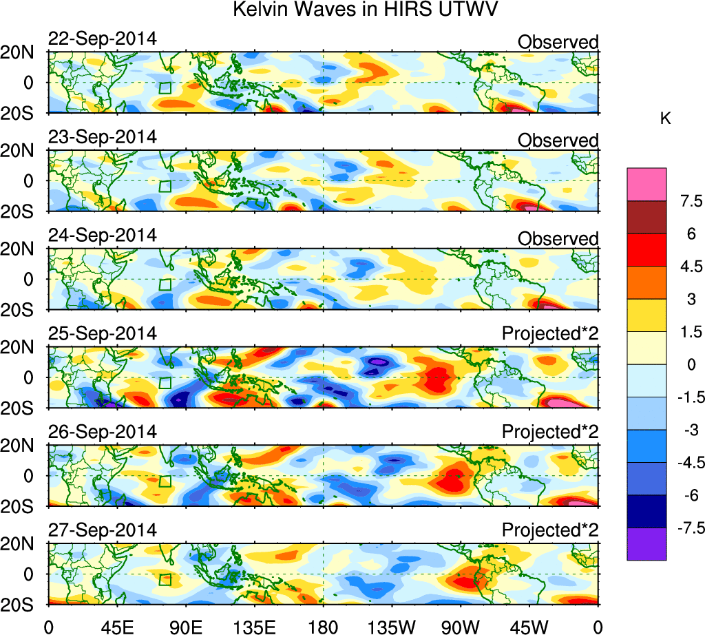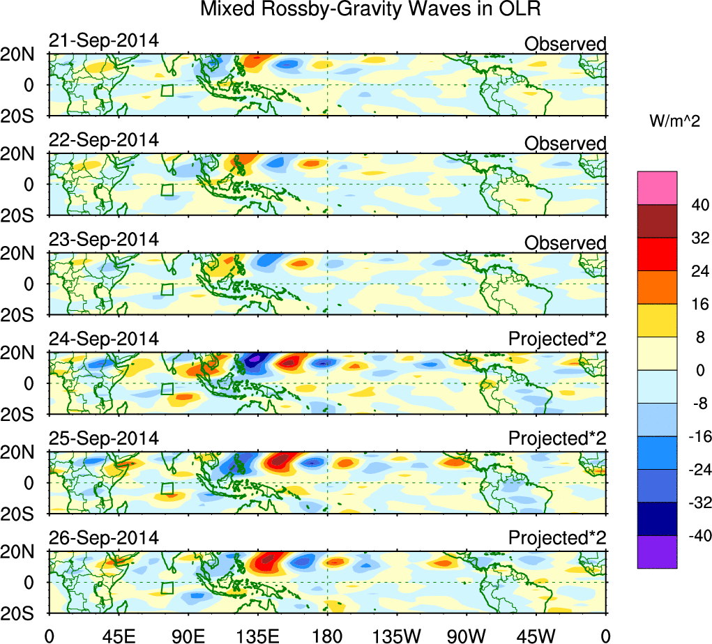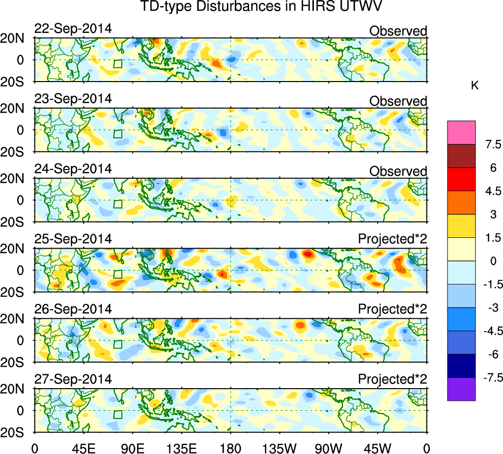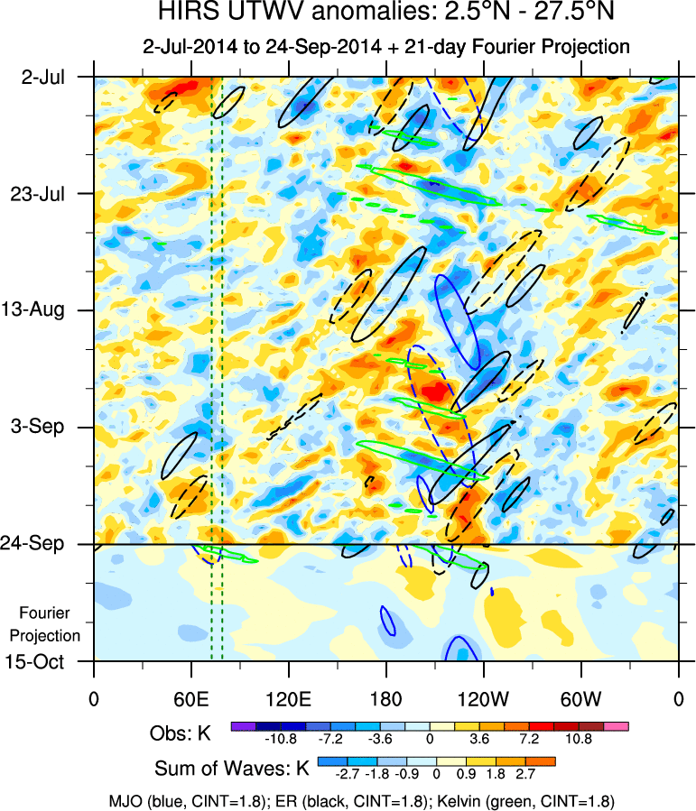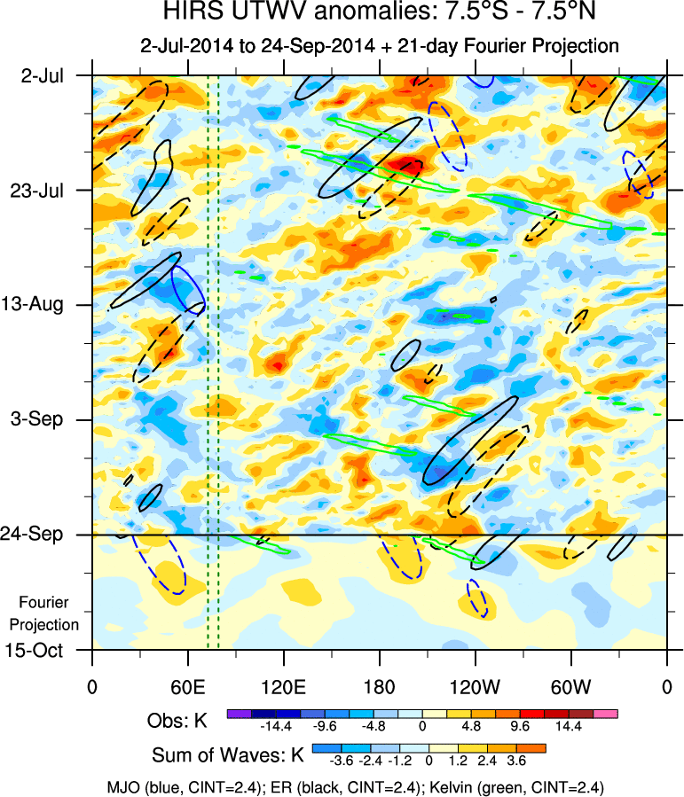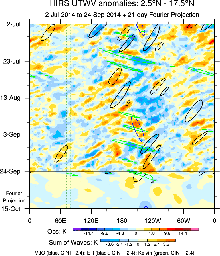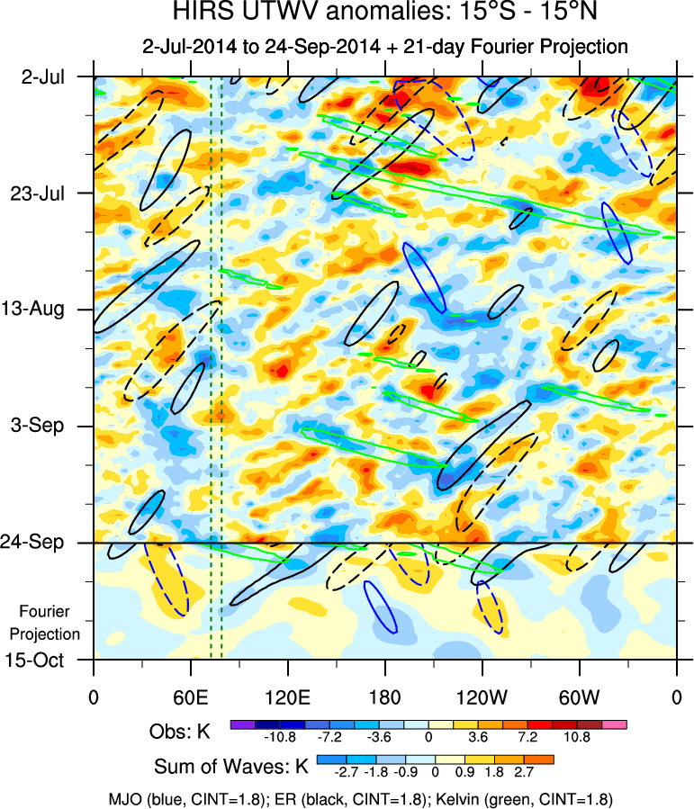 To identify tropical waves in near real-time, the OLR and UTWV data are filtered following Wheeler & Weickmann (2001 MWR). The daily anomalies are calculated using the first 3 harmonics of the seasonal cycle for 1979–2009. Missing values are then filled using linear interpolation in space and time. The most recent 365 days of anomalies are padded with 659 days of zeroes, and the result is filtered for each wave type.