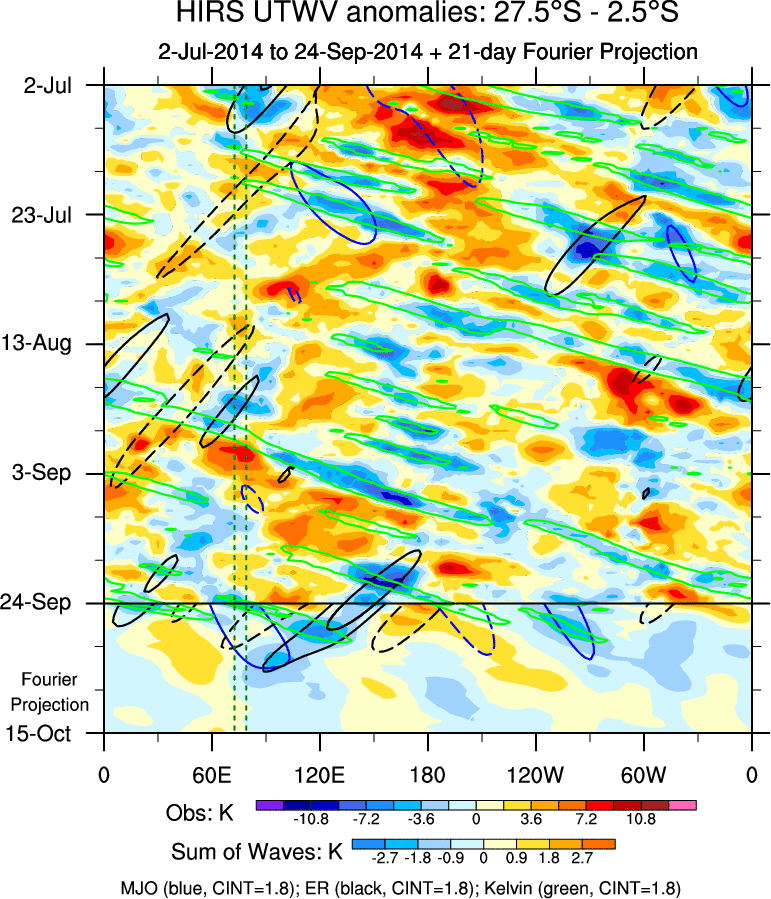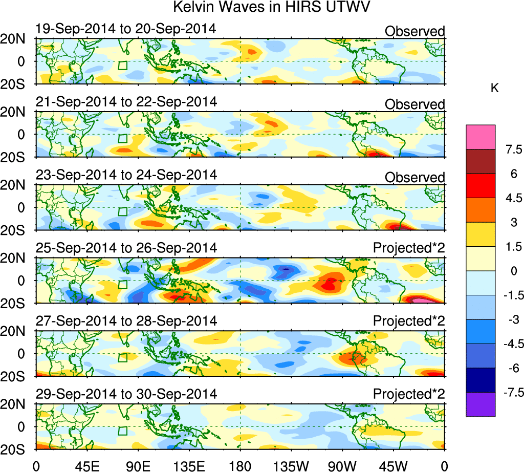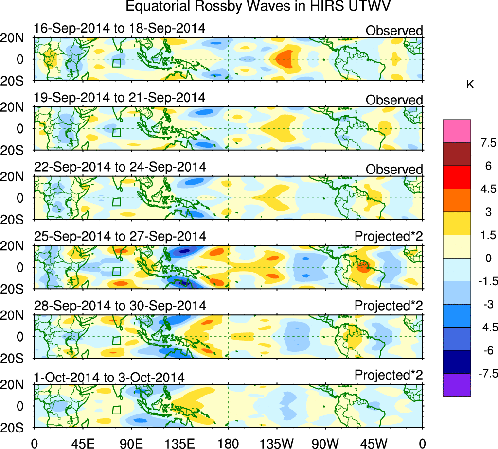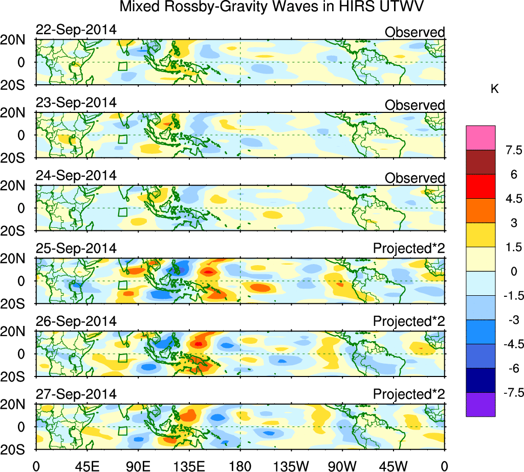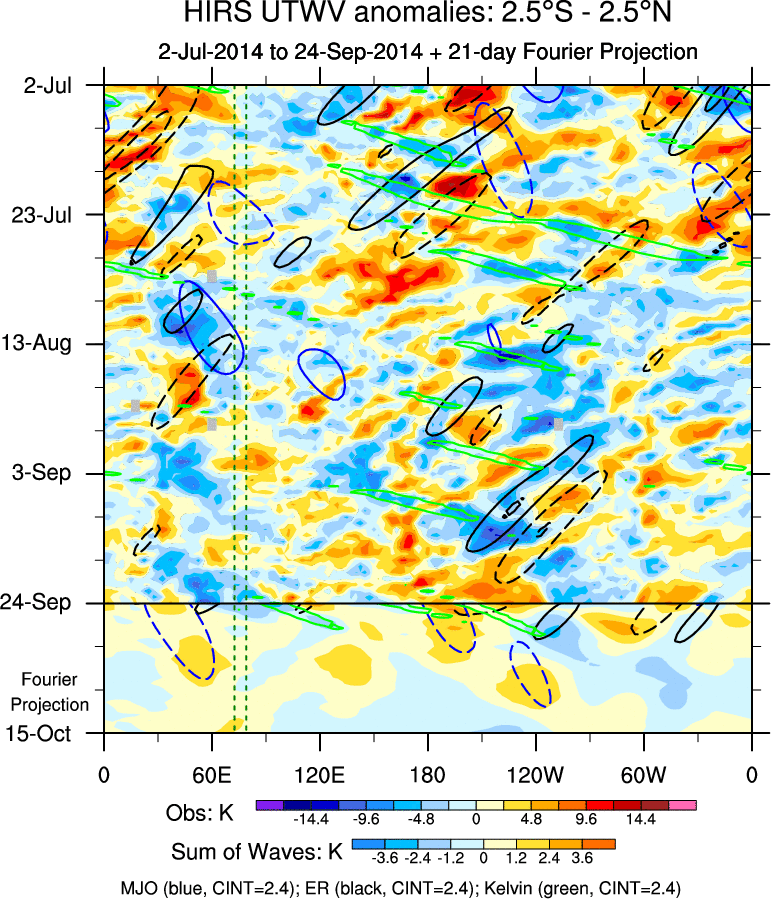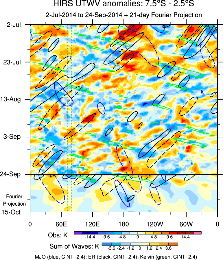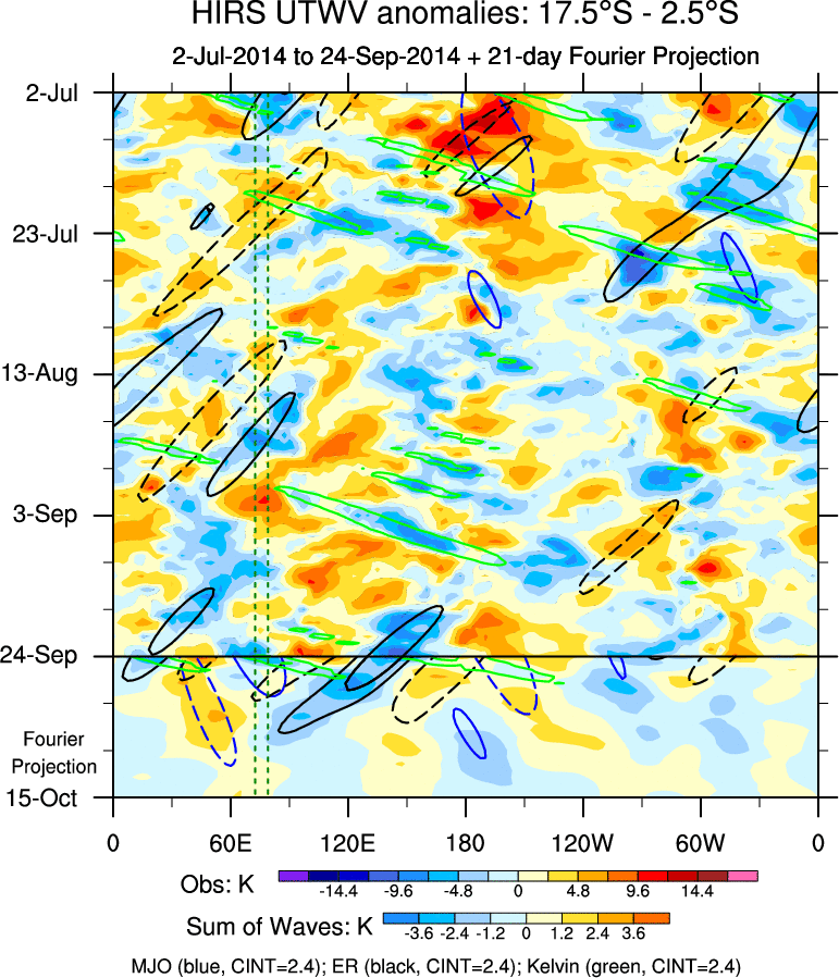 To identify tropical waves in near real-time, the OLR and UTWV data are filtered following Wheeler & Weickmann (2001 MWR). The daily anomalies are calculated using the first 3 harmonics of the seasonal cycle for 1979–2009. Missing values are then filled using linear interpolation in space and time. The most recent 365 days of anomalies are padded with 659 days of zeroes, and the result is filtered for each wave type.