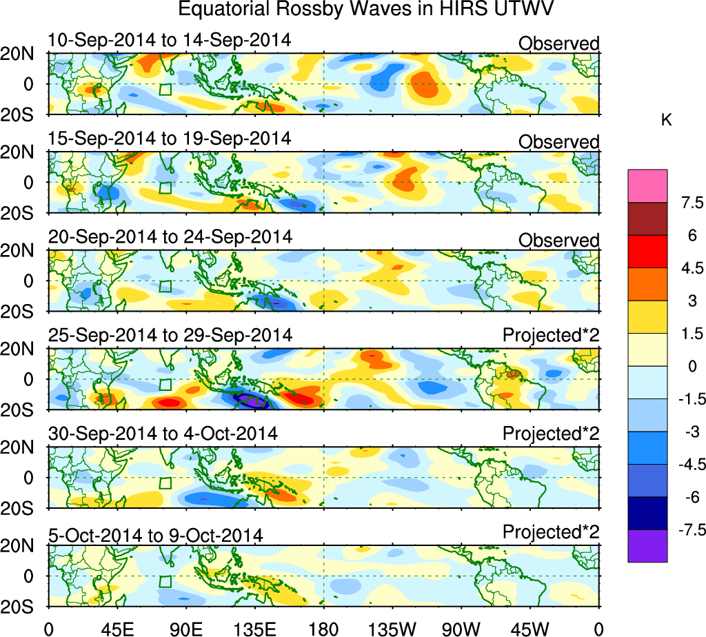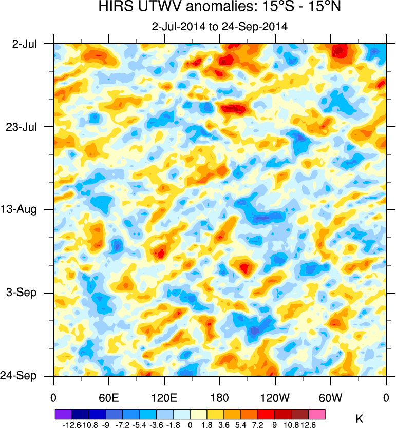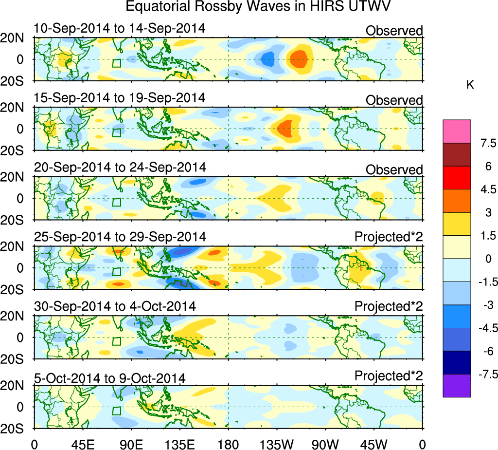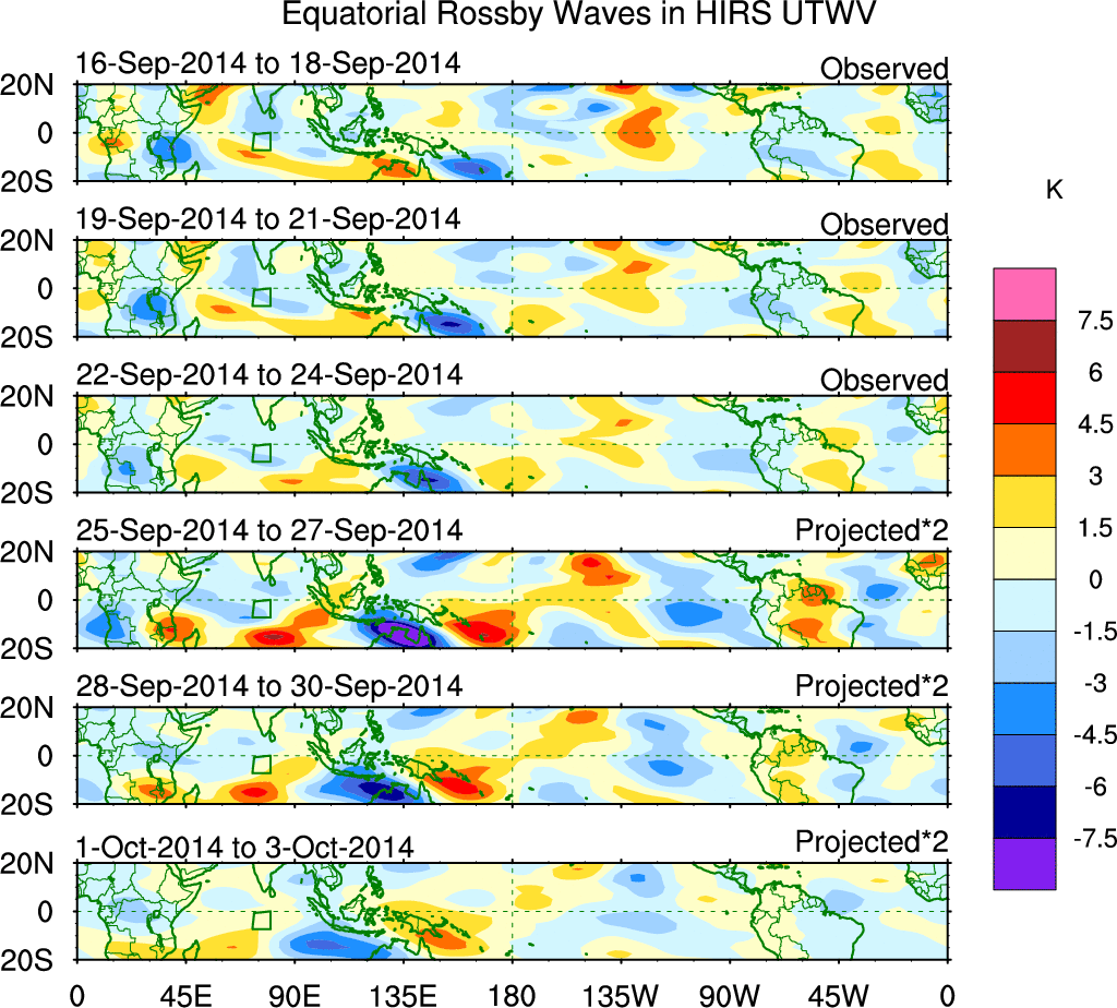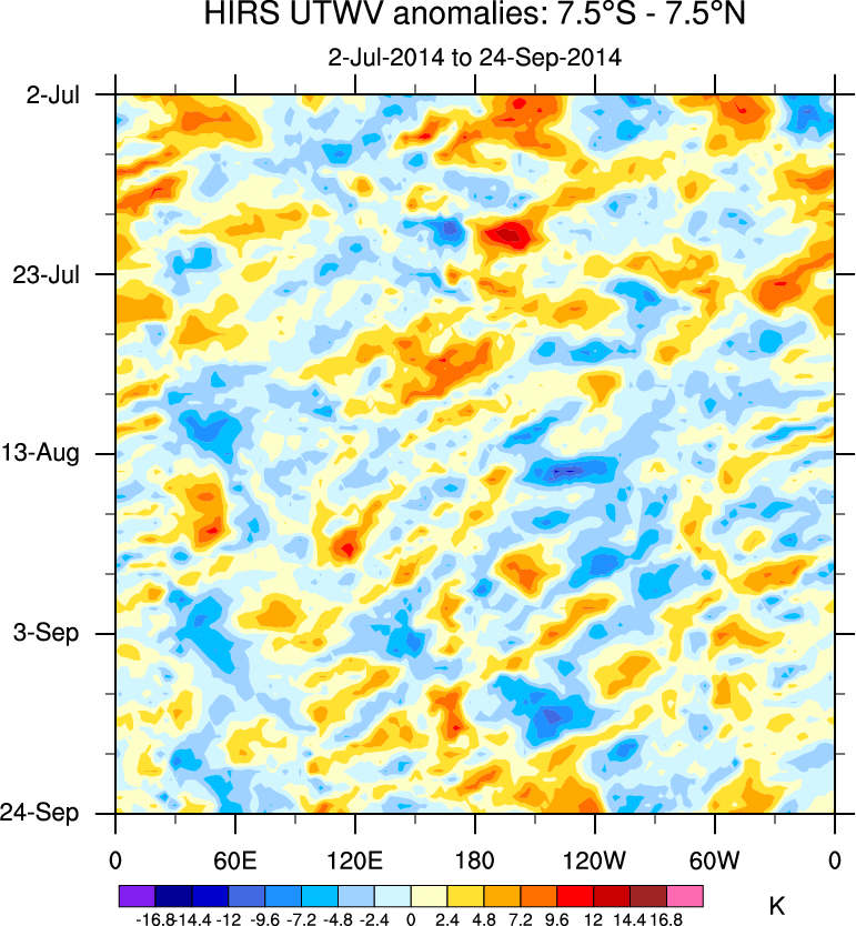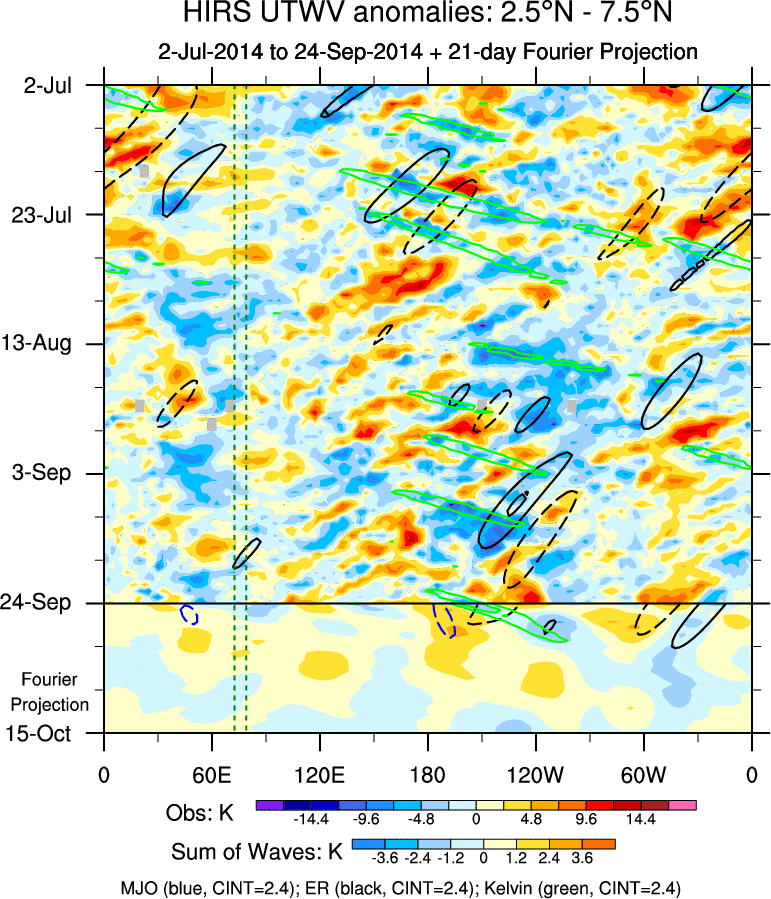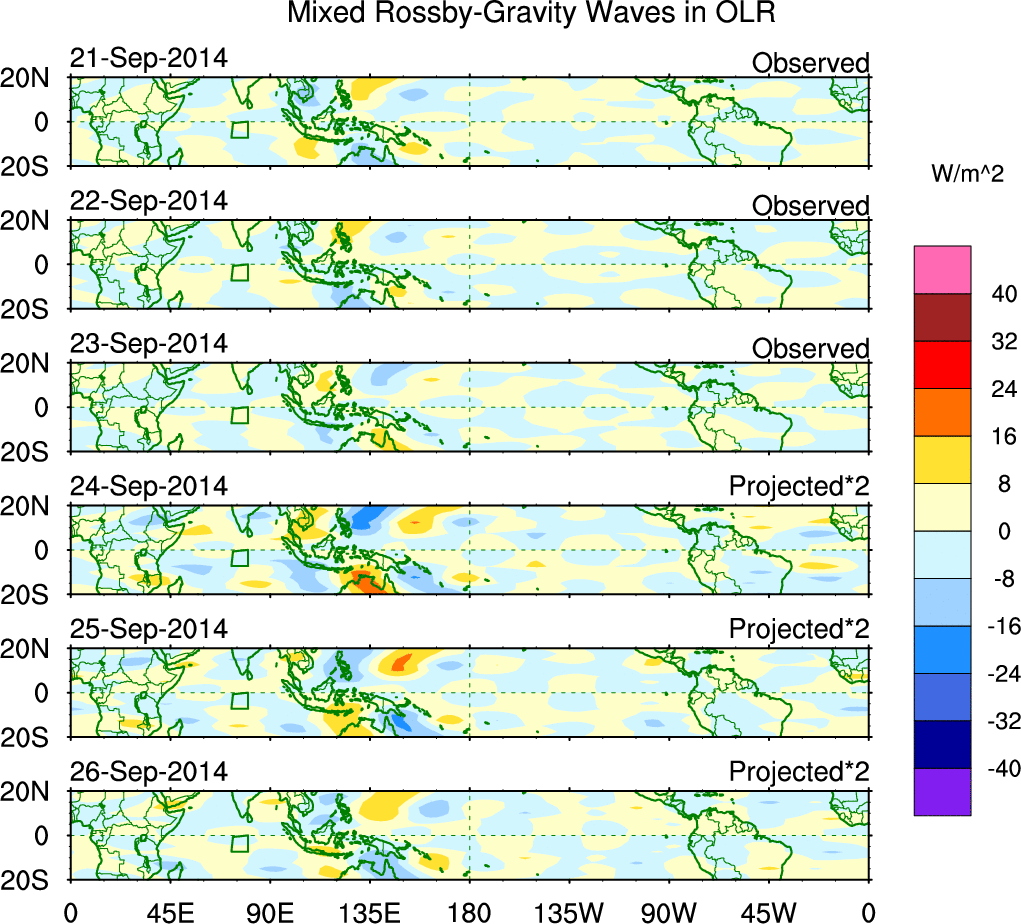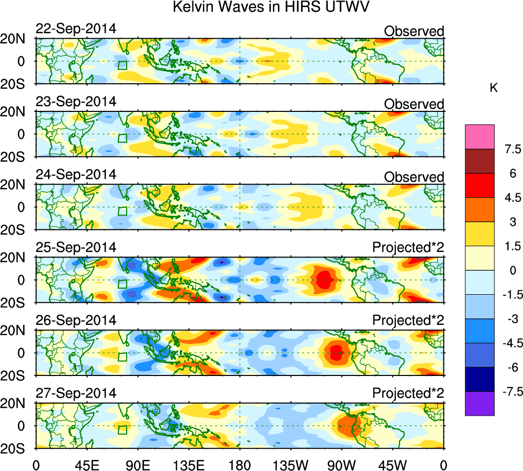 To identify tropical waves in near real-time, the OLR and UTWV data are filtered following Wheeler & Weickmann (2001 MWR). The daily anomalies are calculated using the first 3 harmonics of the seasonal cycle for 1979–2009. Missing values are then filled using linear interpolation in space and time. The most recent 365 days of anomalies are padded with 659 days of zeroes, and the result is filtered for each wave type.