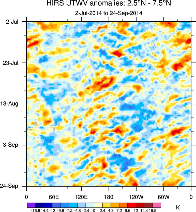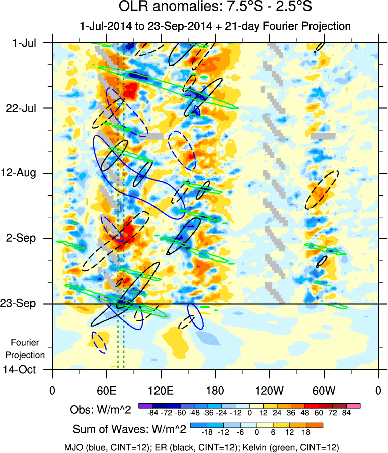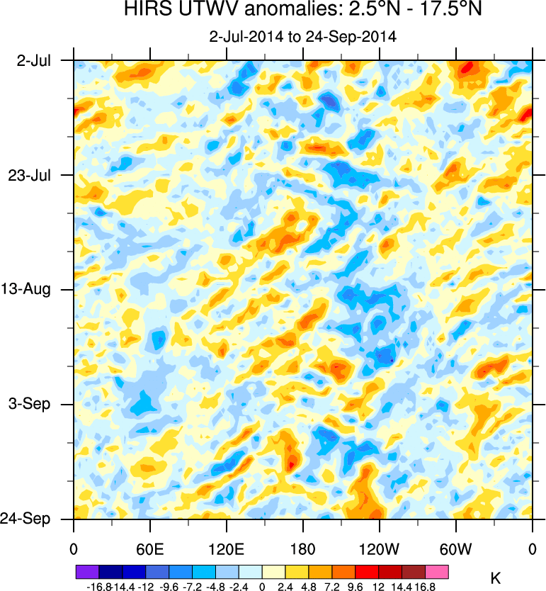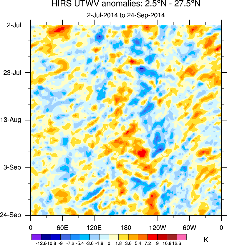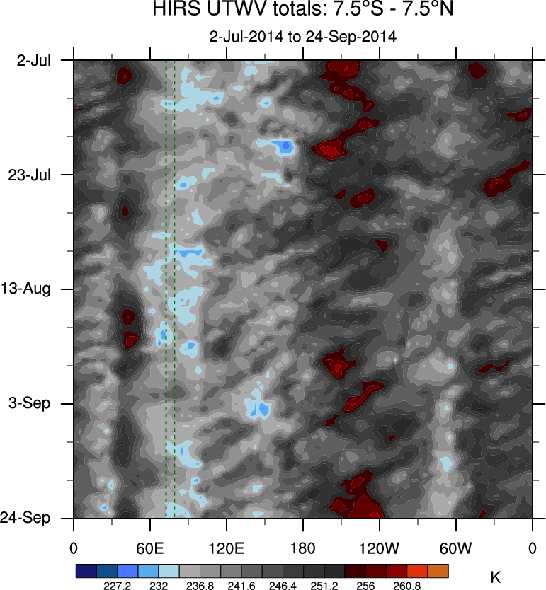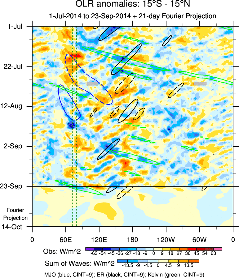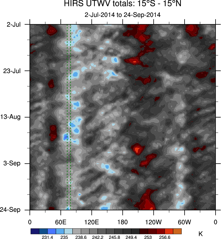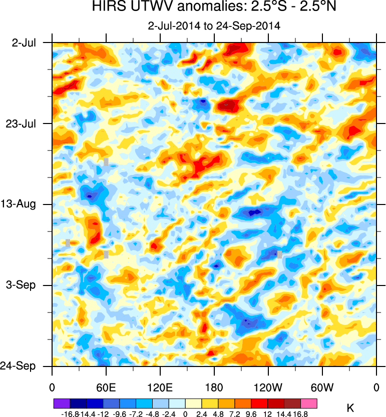 To identify tropical waves in near real-time, the OLR and UTWV data are filtered following Wheeler & Weickmann (2001 MWR). The daily anomalies are calculated using the first 3 harmonics of the seasonal cycle for 1979–2009. Missing values are then filled using linear interpolation in space and time. The most recent 365 days of anomalies are padded with 659 days of zeroes, and the result is filtered for each wave type.