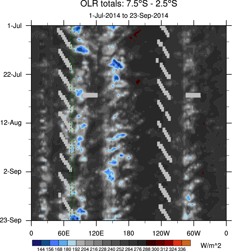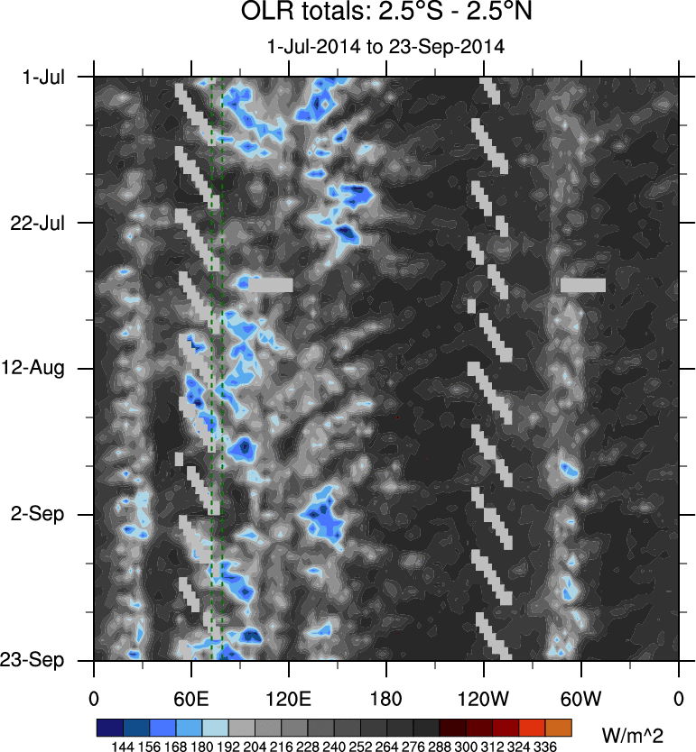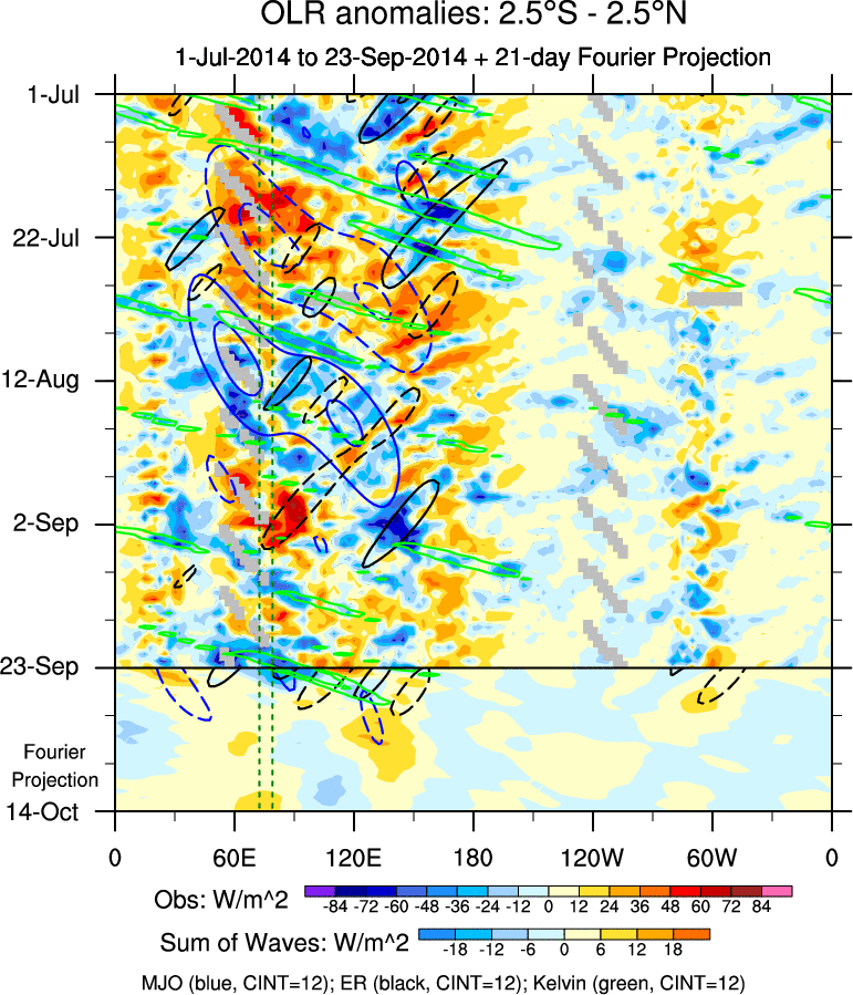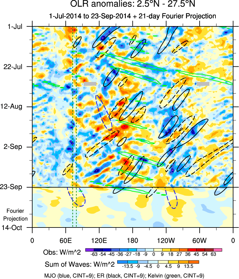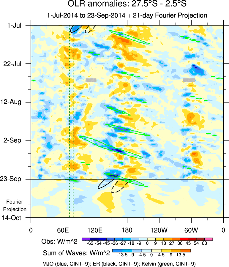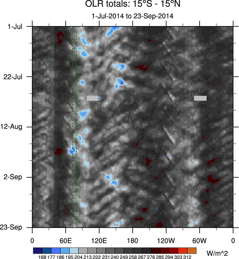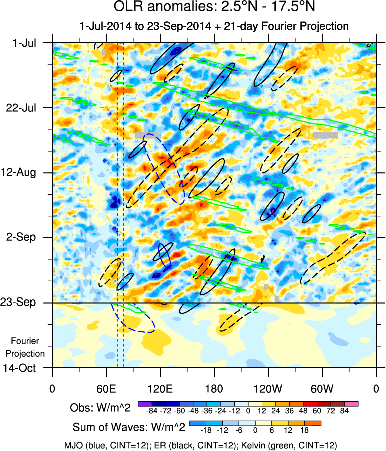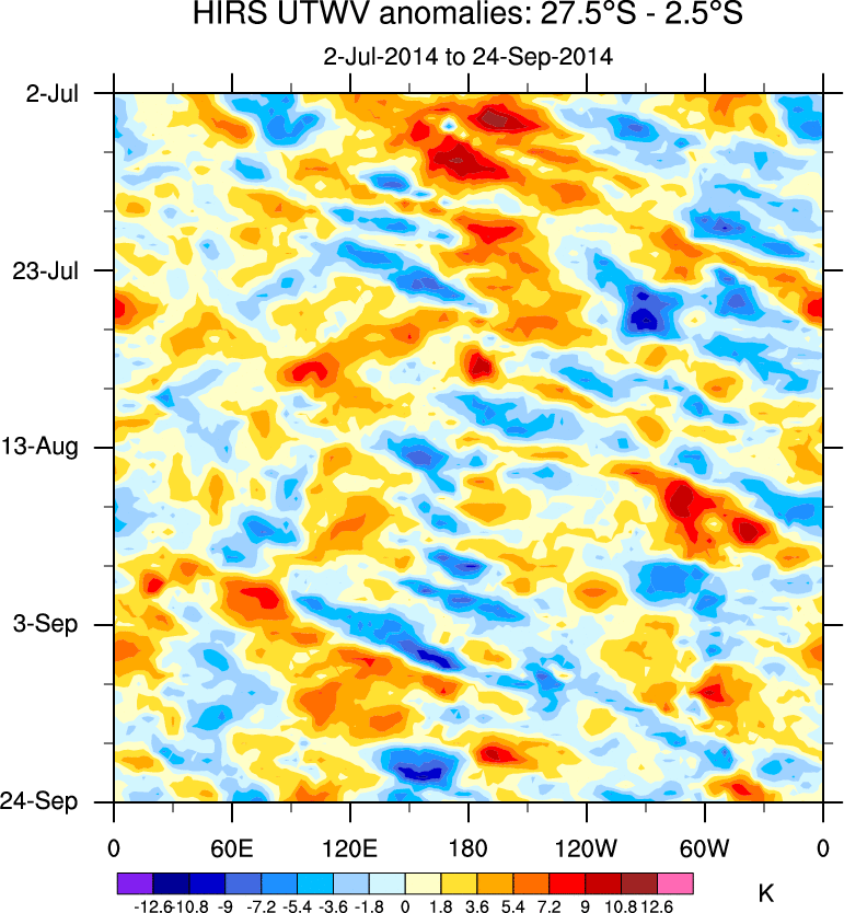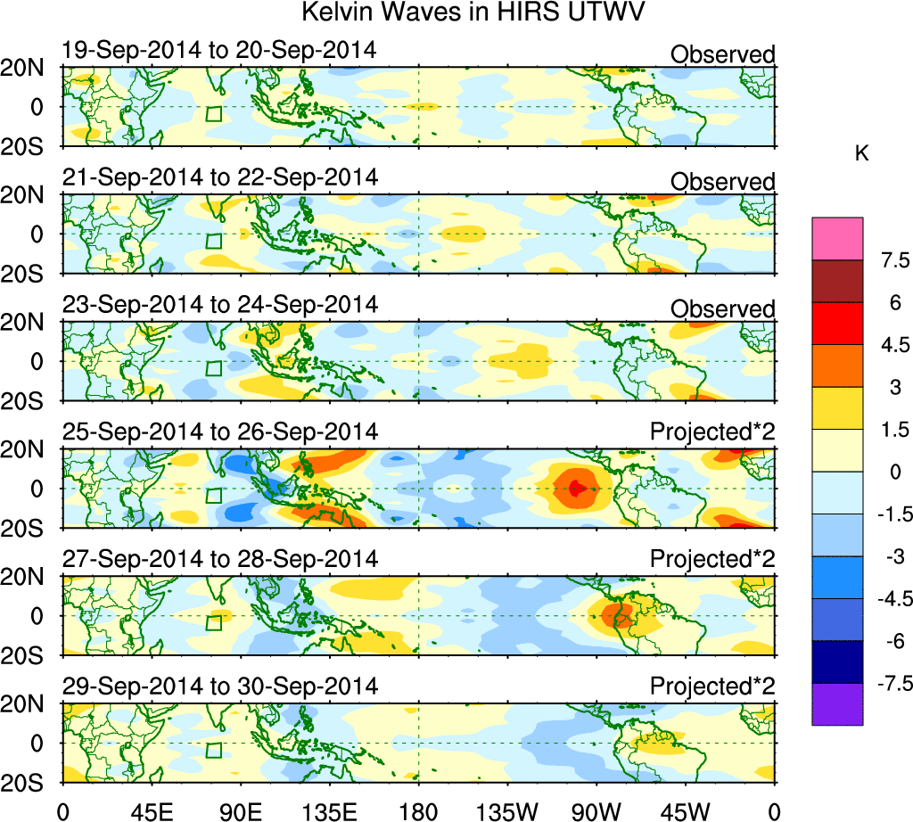To identify tropical waves in near real-time, the OLR and UTWV data are filtered following Wheeler & Weickmann (2001 MWR). The daily anomalies are calculated using the first 3 harmonics of the seasonal cycle for 1979–2009. Missing values are then filled using linear interpolation in space and time. The most recent 365 days of anomalies are padded with 659 days of zeroes, and the result is filtered for each wave type.
