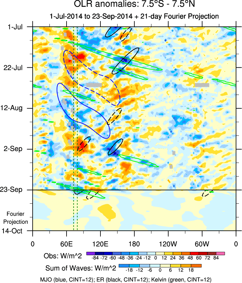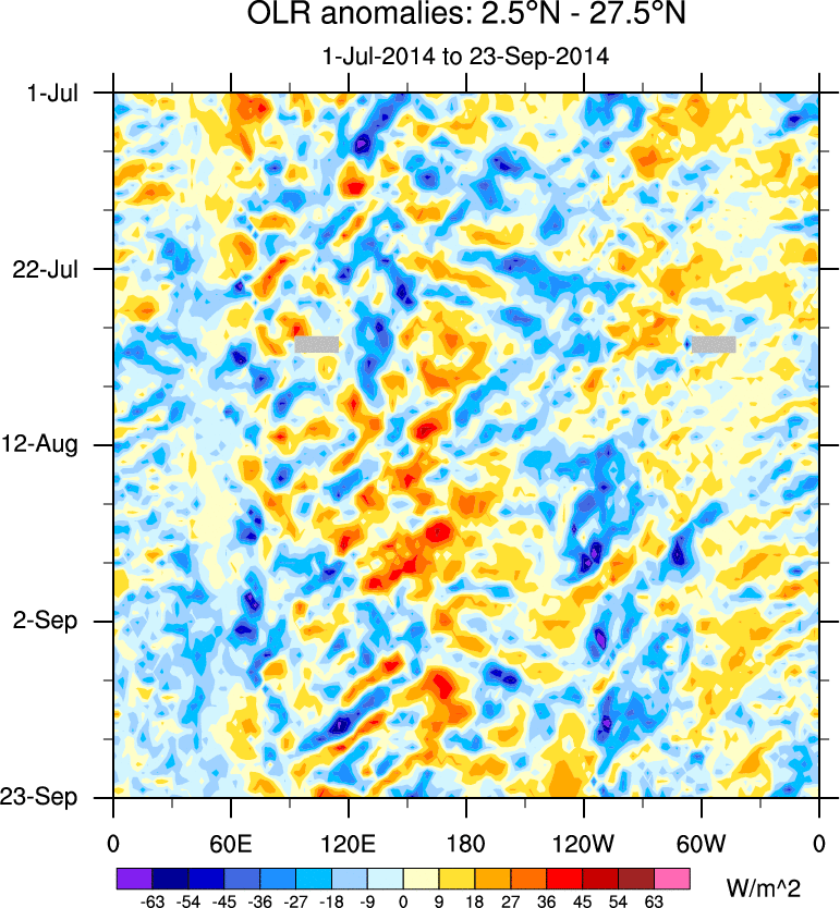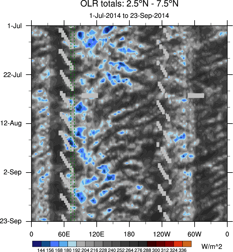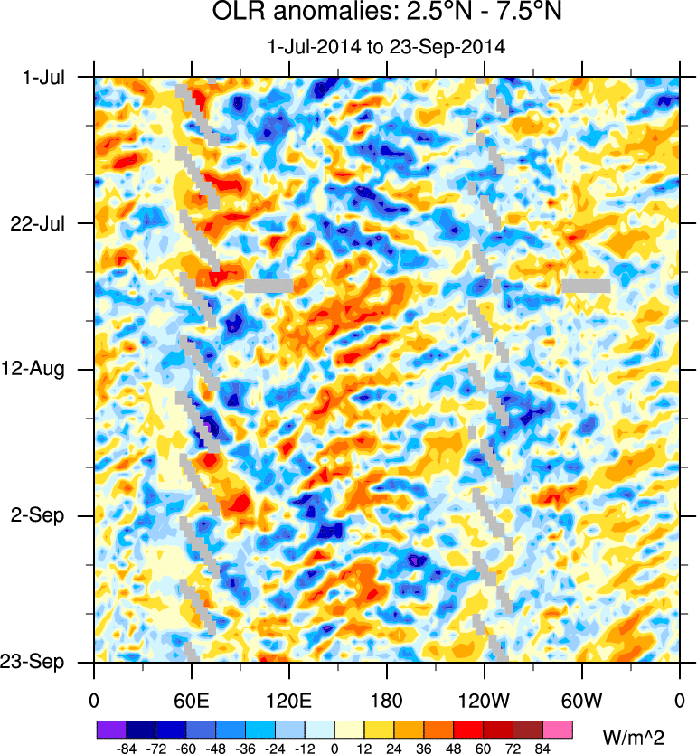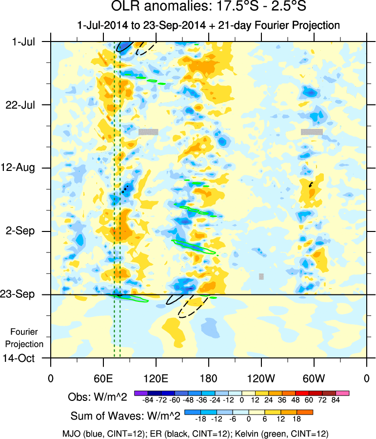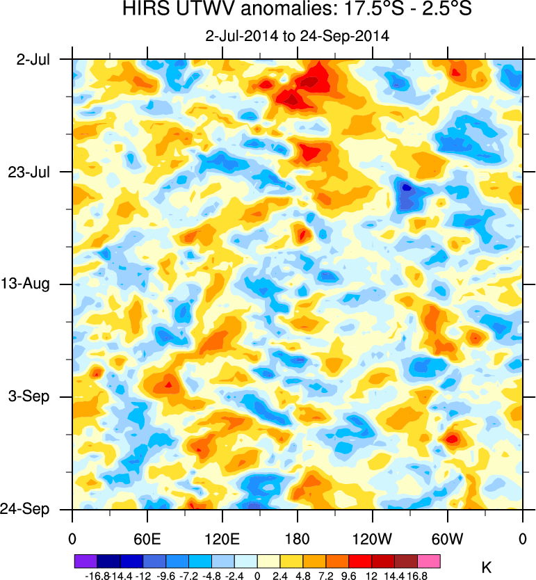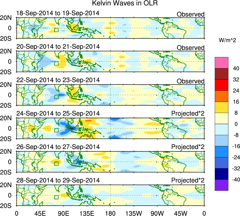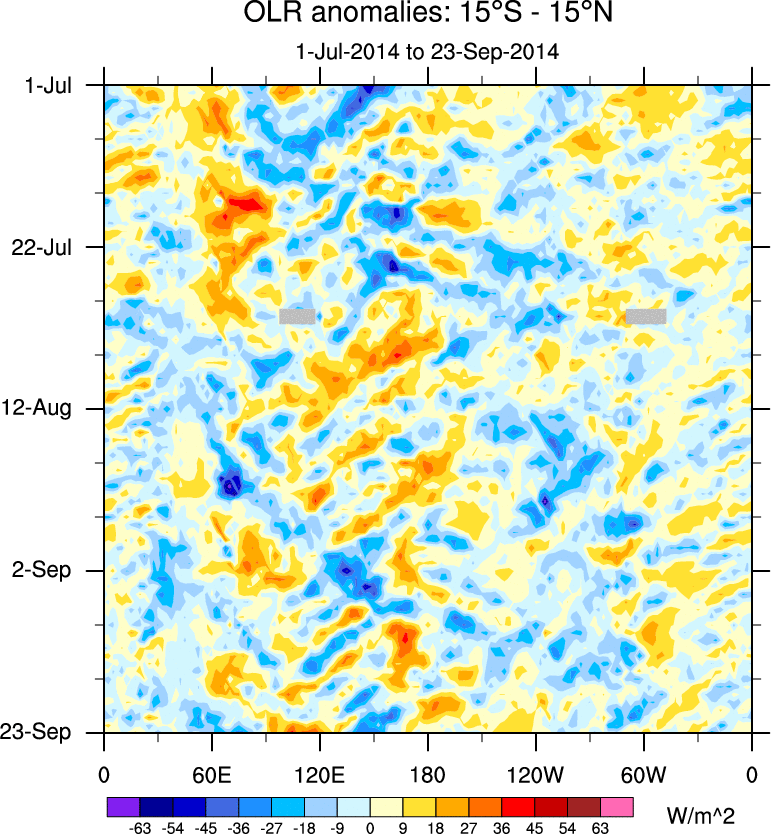 To identify tropical waves in near real-time, the OLR and UTWV data are filtered following Wheeler & Weickmann (2001 MWR). The daily anomalies are calculated using the first 3 harmonics of the seasonal cycle for 1979–2009. Missing values are then filled using linear interpolation in space and time. The most recent 365 days of anomalies are padded with 659 days of zeroes, and the result is filtered for each wave type.