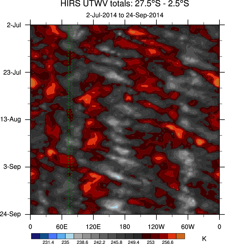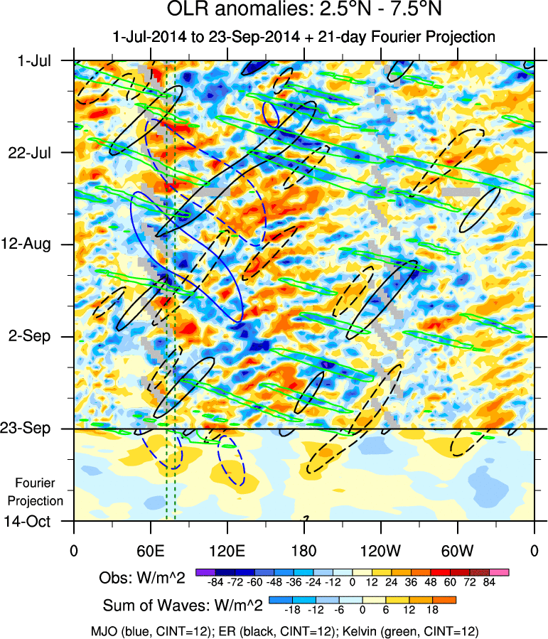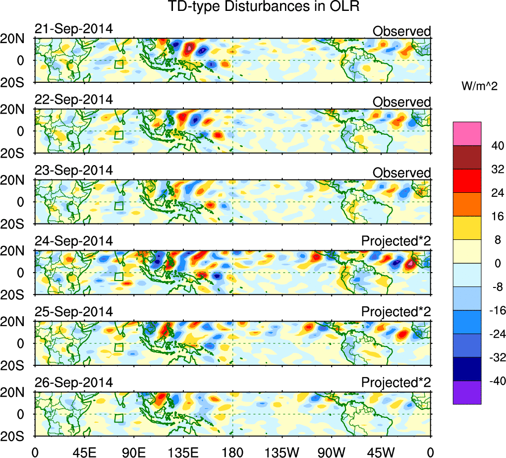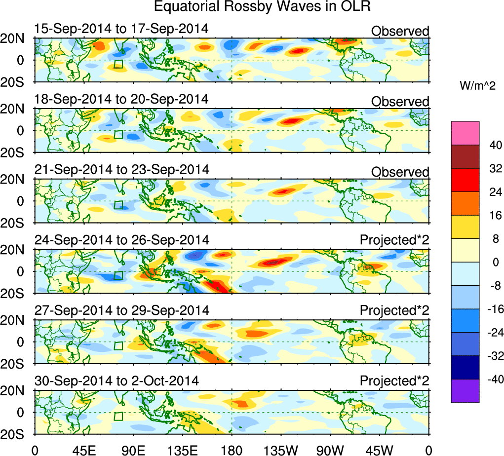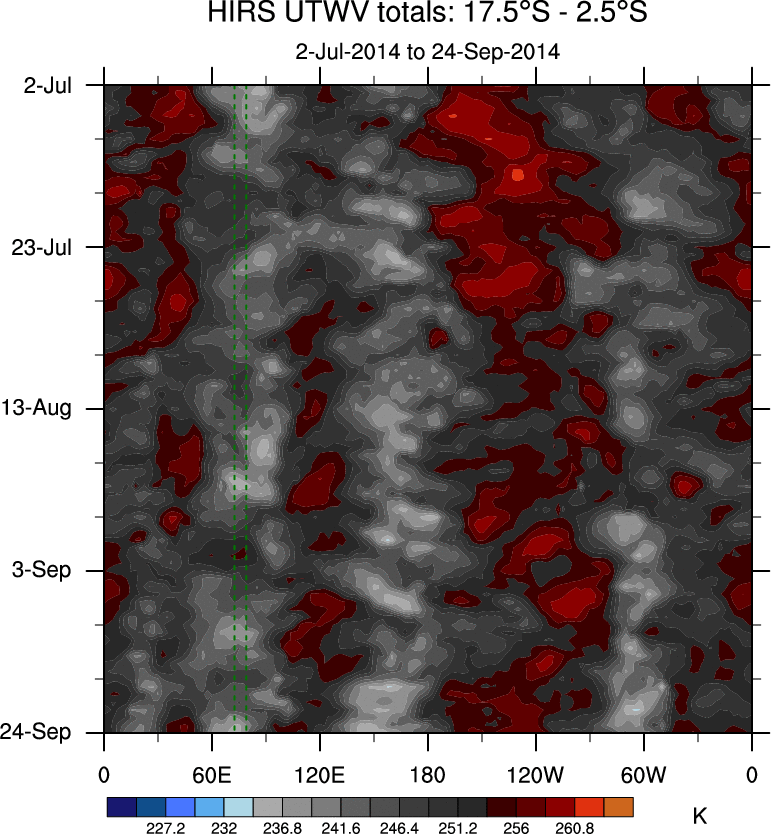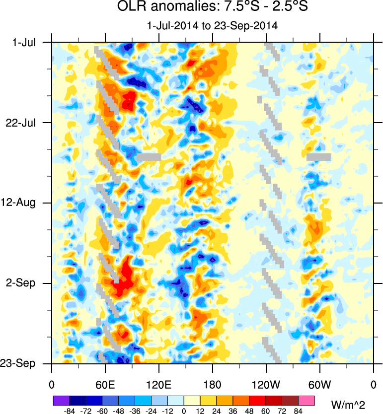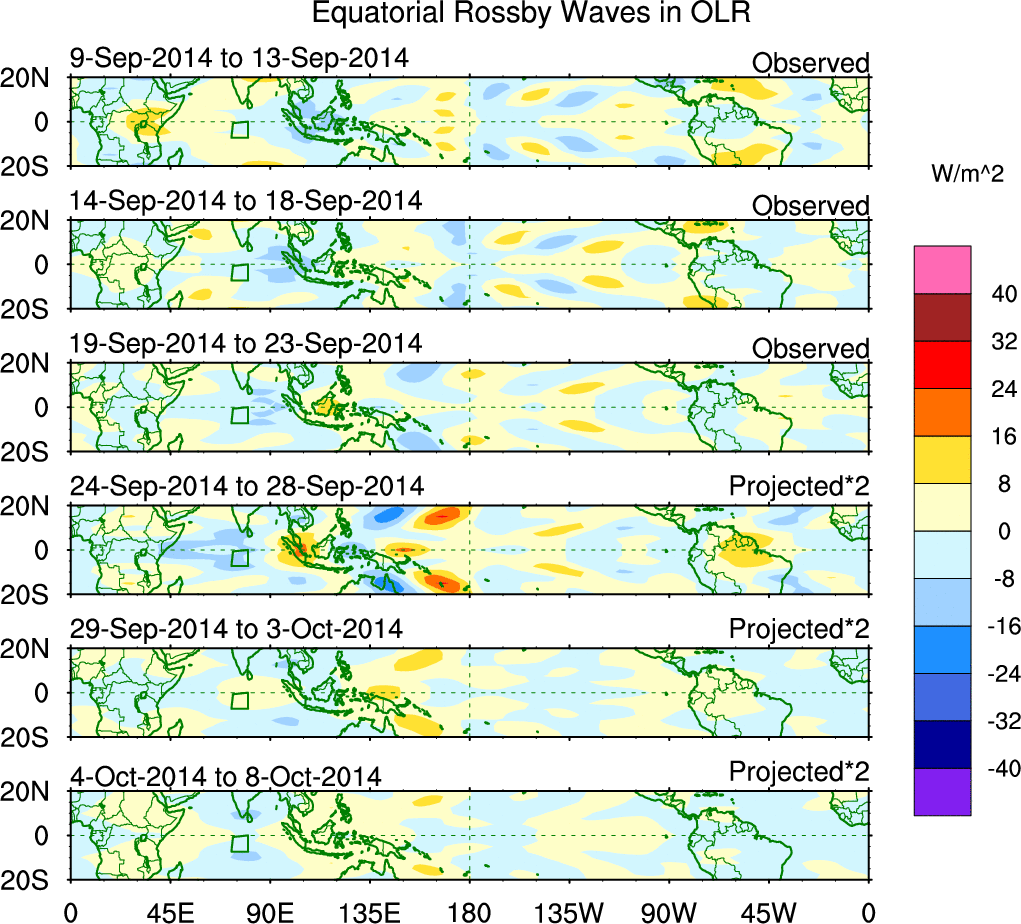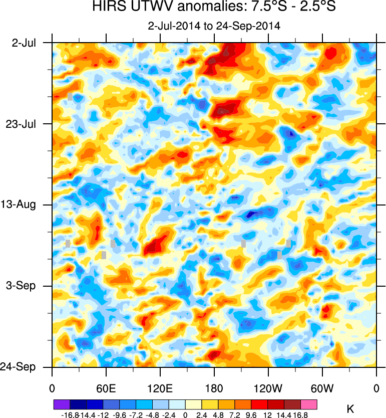 To identify tropical waves in near real-time, the OLR and UTWV data are filtered following Wheeler & Weickmann (2001 MWR). The daily anomalies are calculated using the first 3 harmonics of the seasonal cycle for 1979–2009. Missing values are then filled using linear interpolation in space and time. The most recent 365 days of anomalies are padded with 659 days of zeroes, and the result is filtered for each wave type.