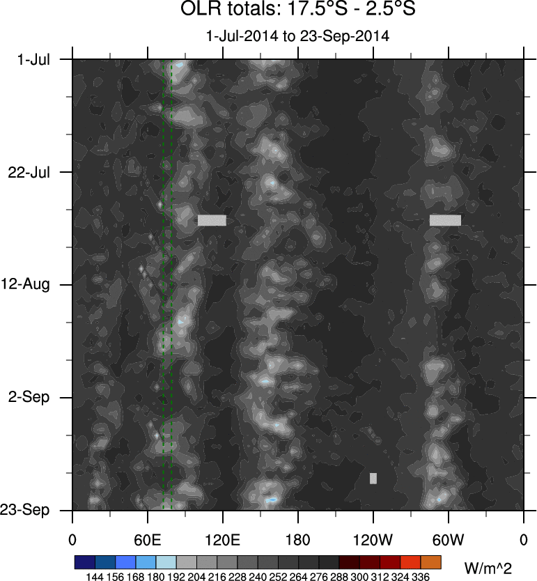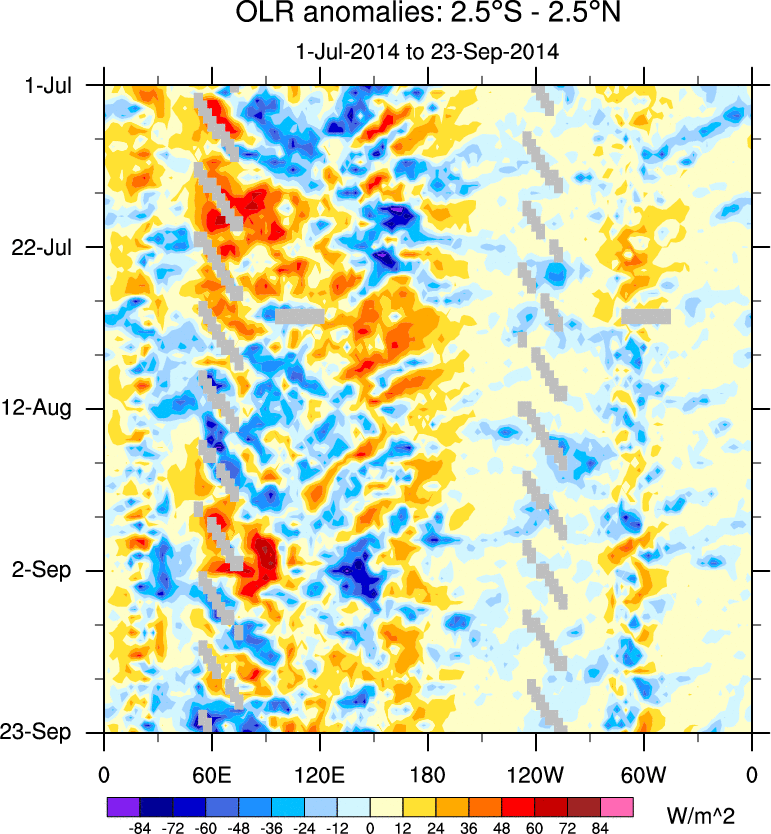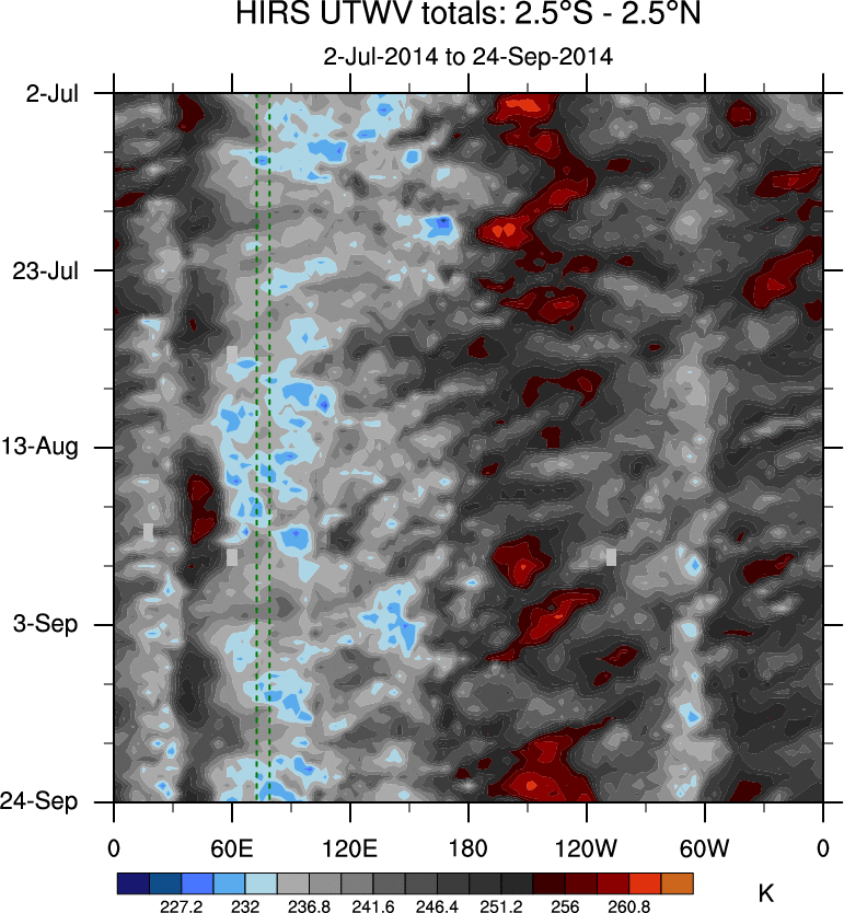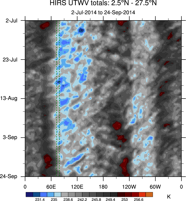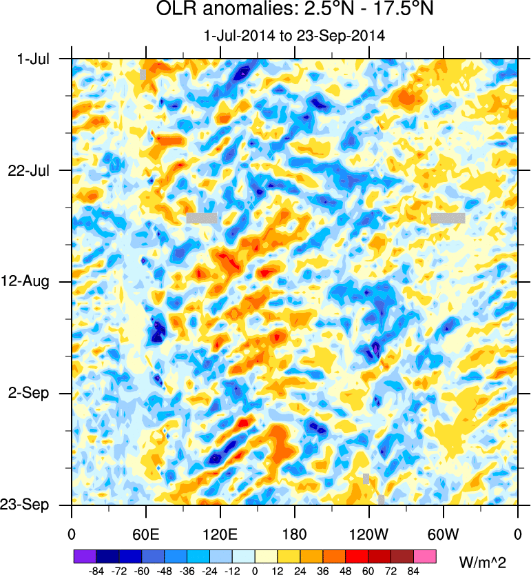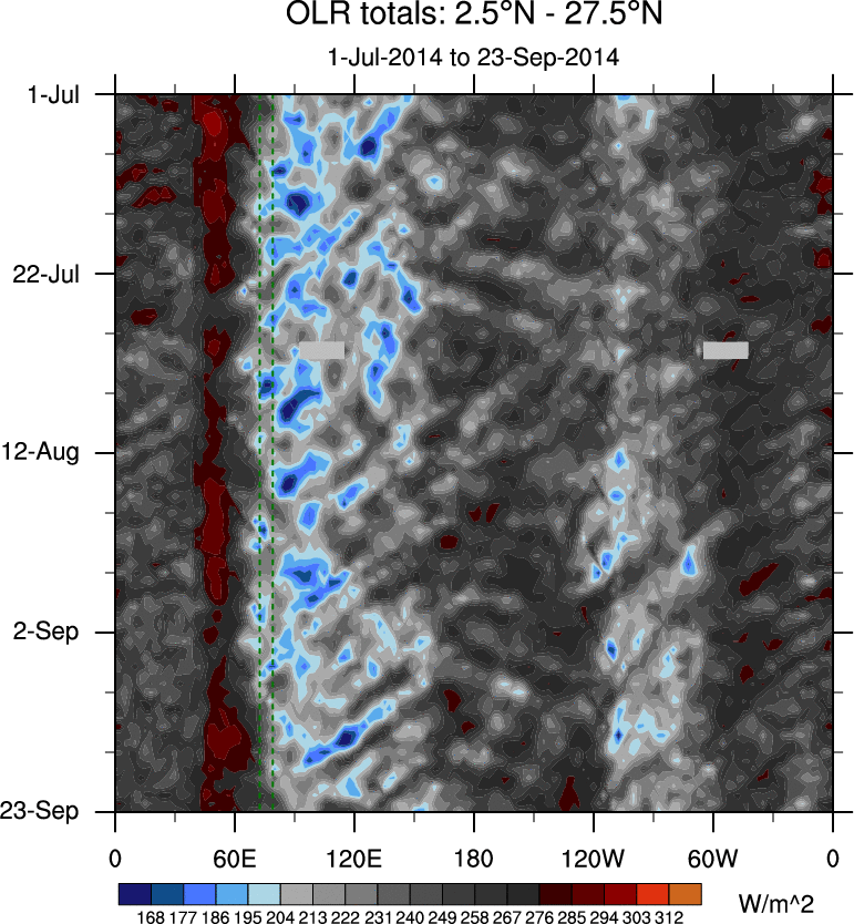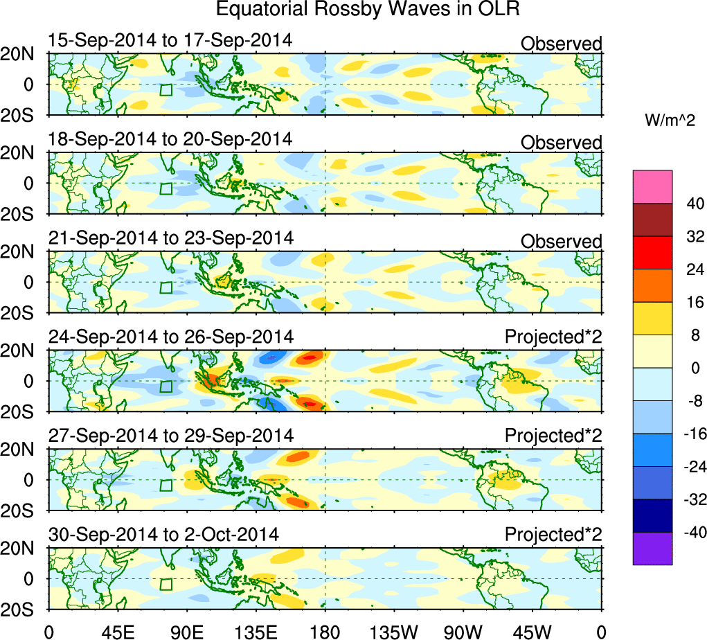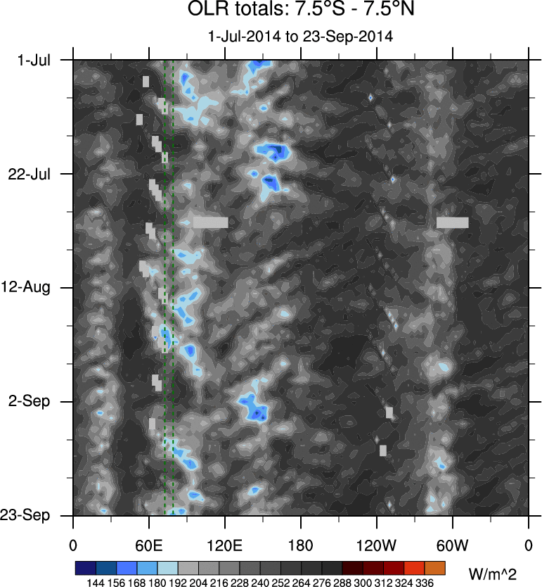 To identify tropical waves in near real-time, the OLR and UTWV data are filtered following Wheeler & Weickmann (2001 MWR). The daily anomalies are calculated using the first 3 harmonics of the seasonal cycle for 1979–2009. Missing values are then filled using linear interpolation in space and time. The most recent 365 days of anomalies are padded with 659 days of zeroes, and the result is filtered for each wave type.