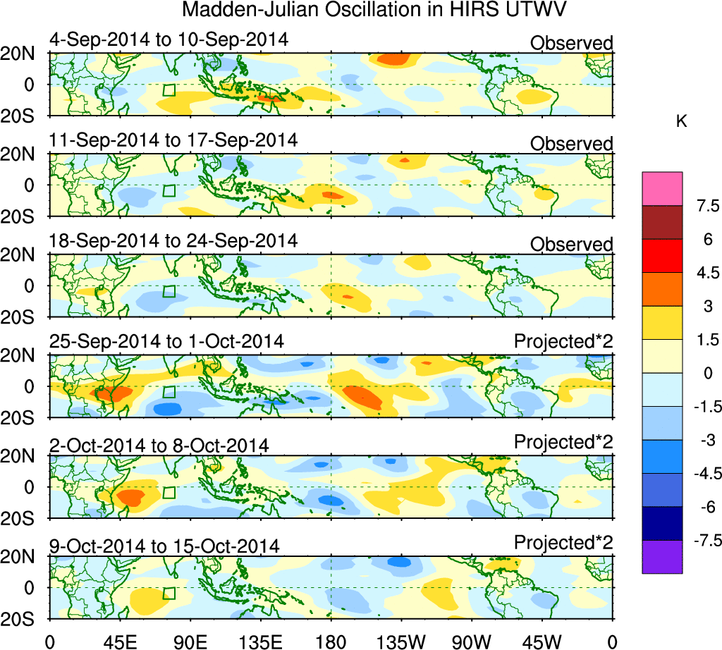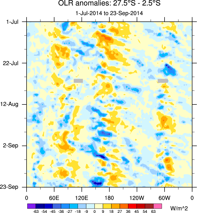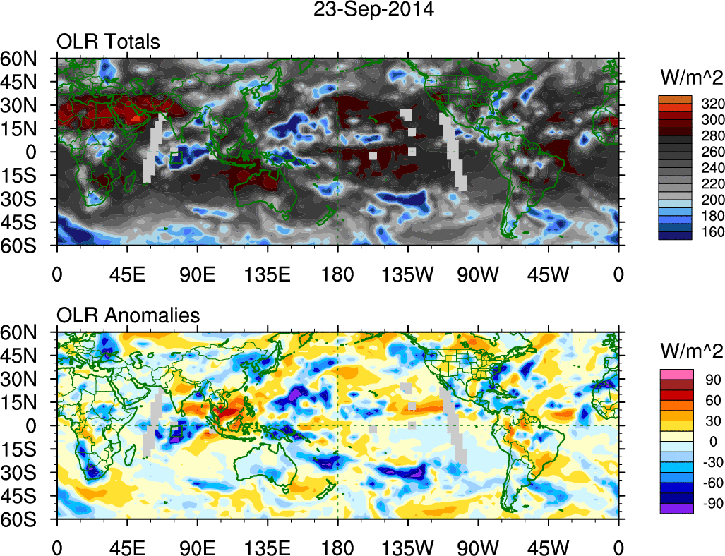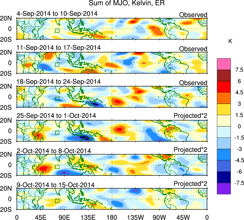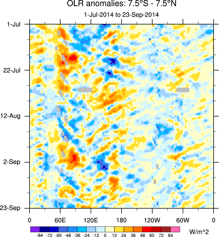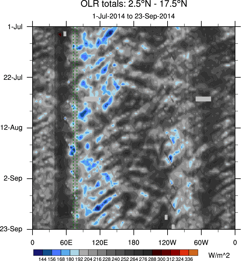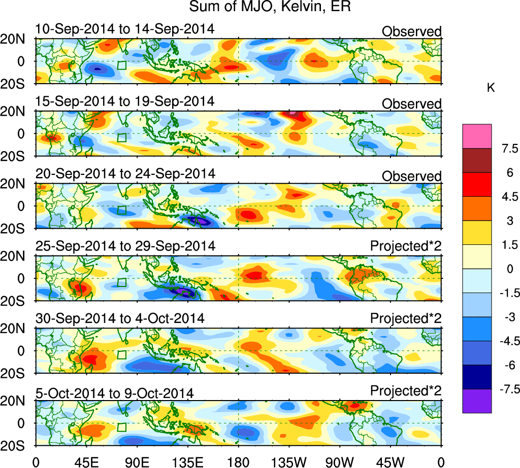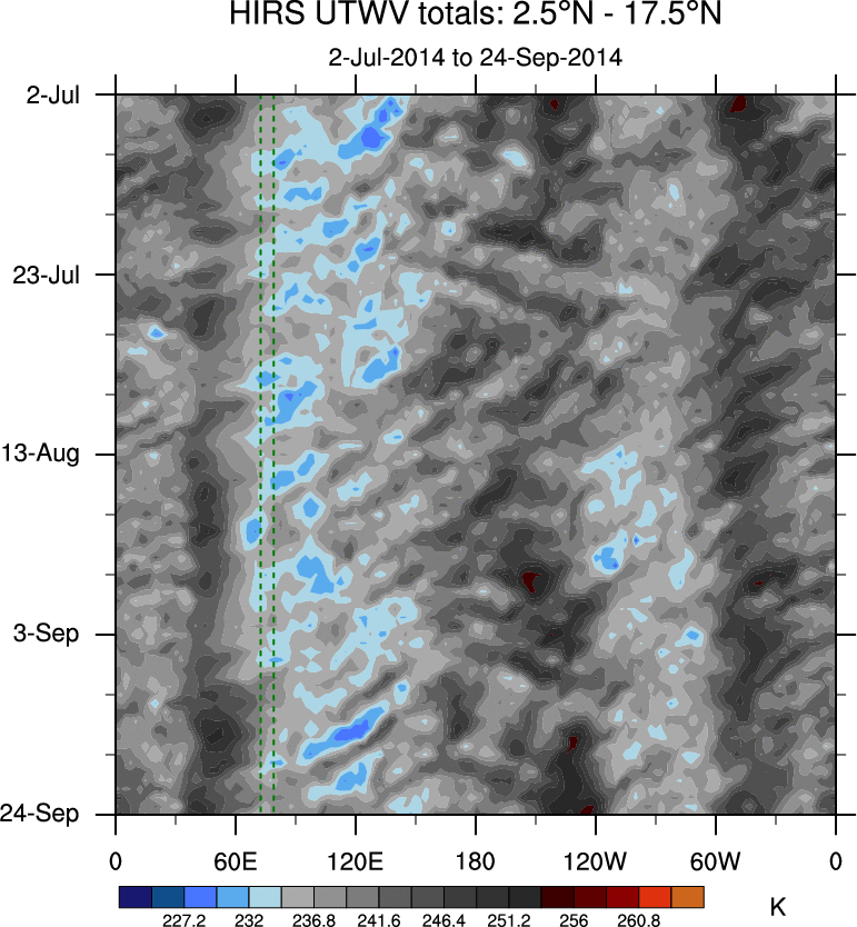 To identify tropical waves in near real-time, the OLR and UTWV data are filtered following Wheeler & Weickmann (2001 MWR). The daily anomalies are calculated using the first 3 harmonics of the seasonal cycle for 1979–2009. Missing values are then filled using linear interpolation in space and time. The most recent 365 days of anomalies are padded with 659 days of zeroes, and the result is filtered for each wave type.