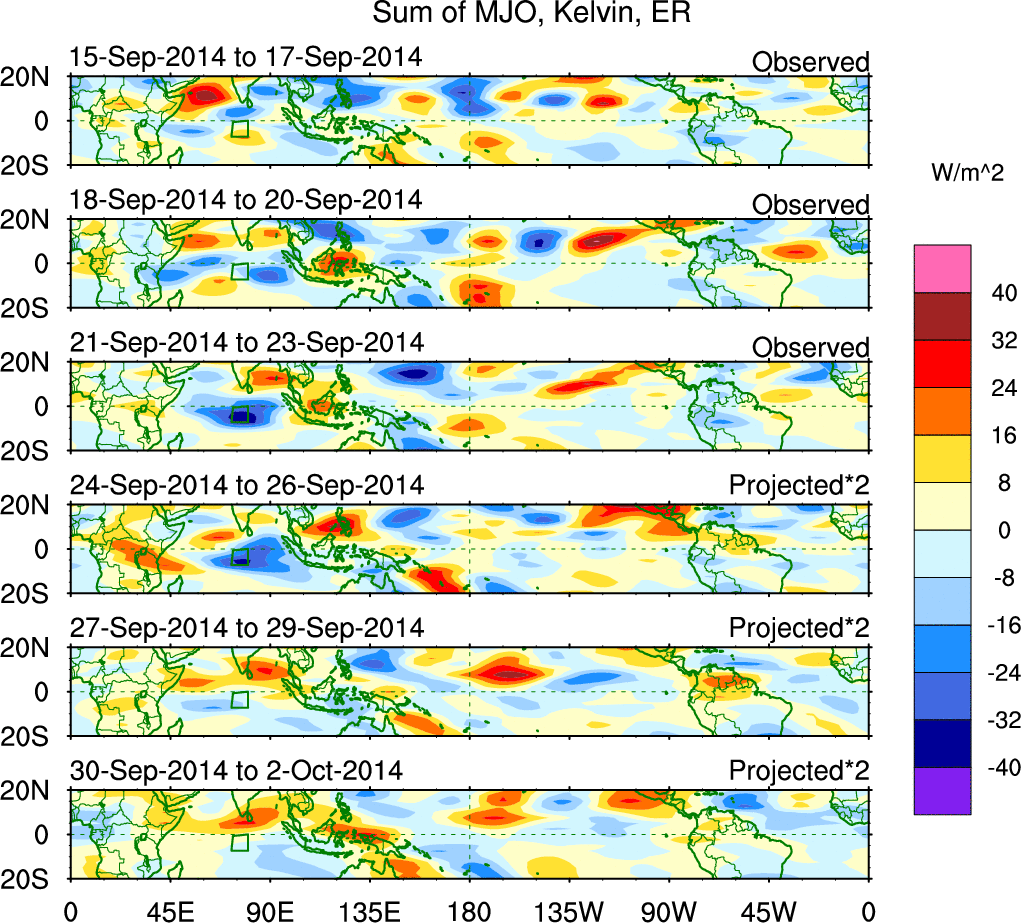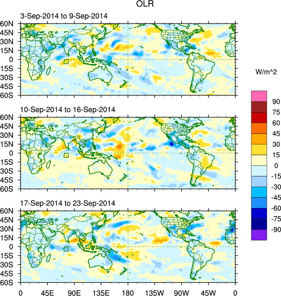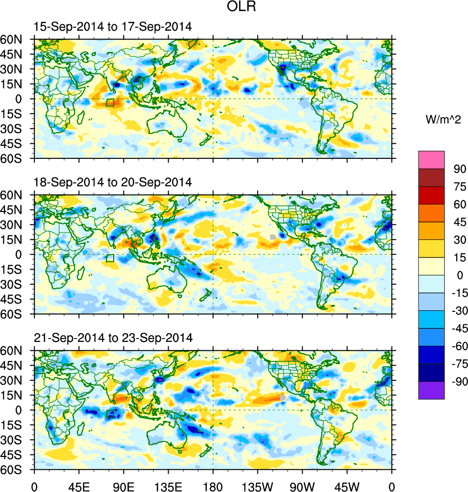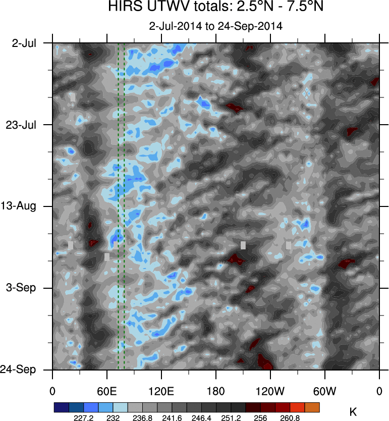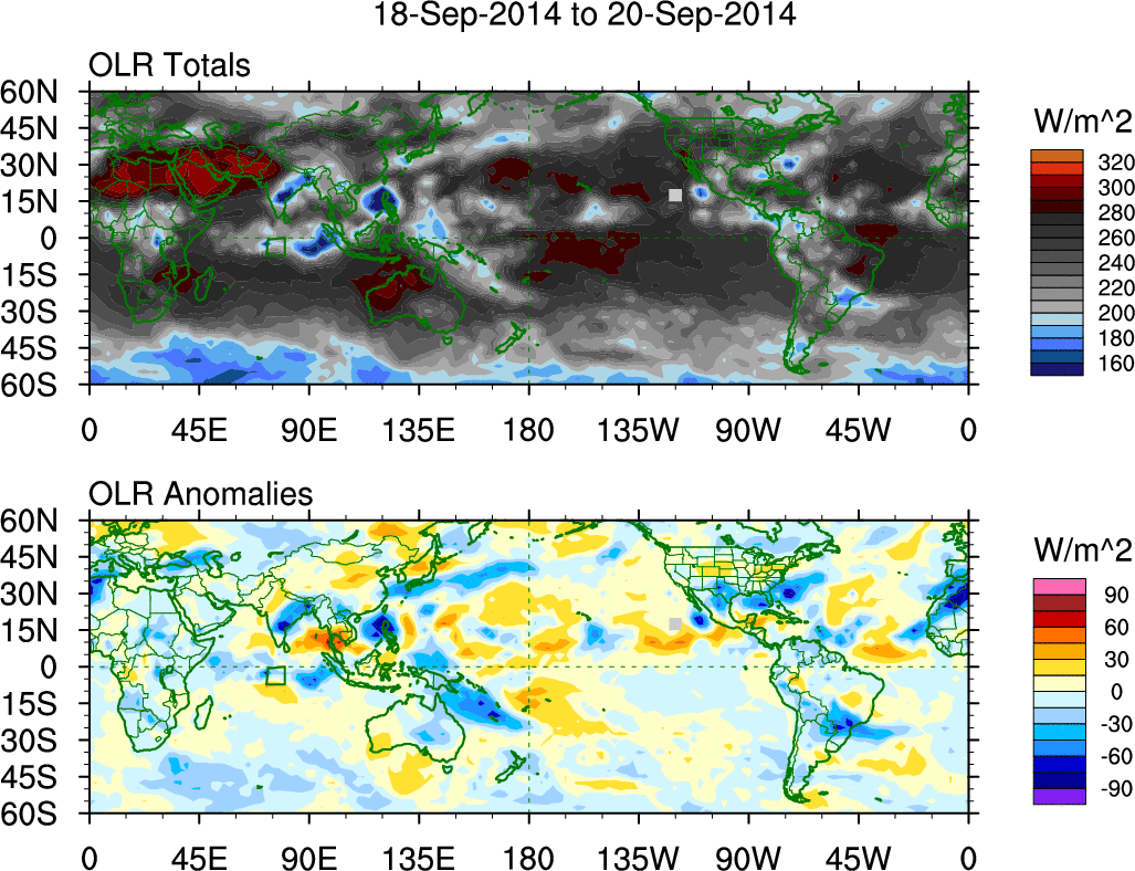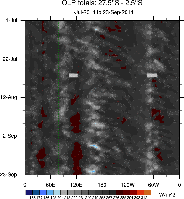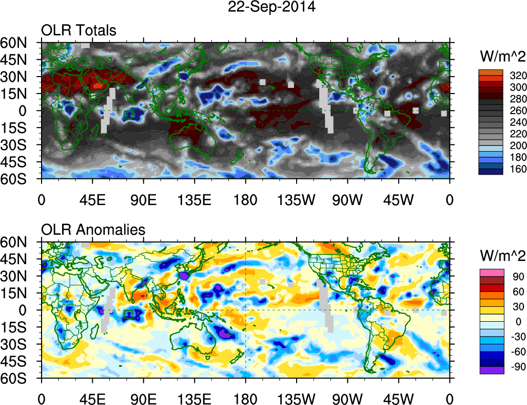 To identify tropical waves in near real-time, the OLR and UTWV data are filtered following Wheeler & Weickmann (2001 MWR). The daily anomalies are calculated using the first 3 harmonics of the seasonal cycle for 1979–2009. Missing values are then filled using linear interpolation in space and time. The most recent 365 days of anomalies are padded with 659 days of zeroes, and the result is filtered for each wave type.