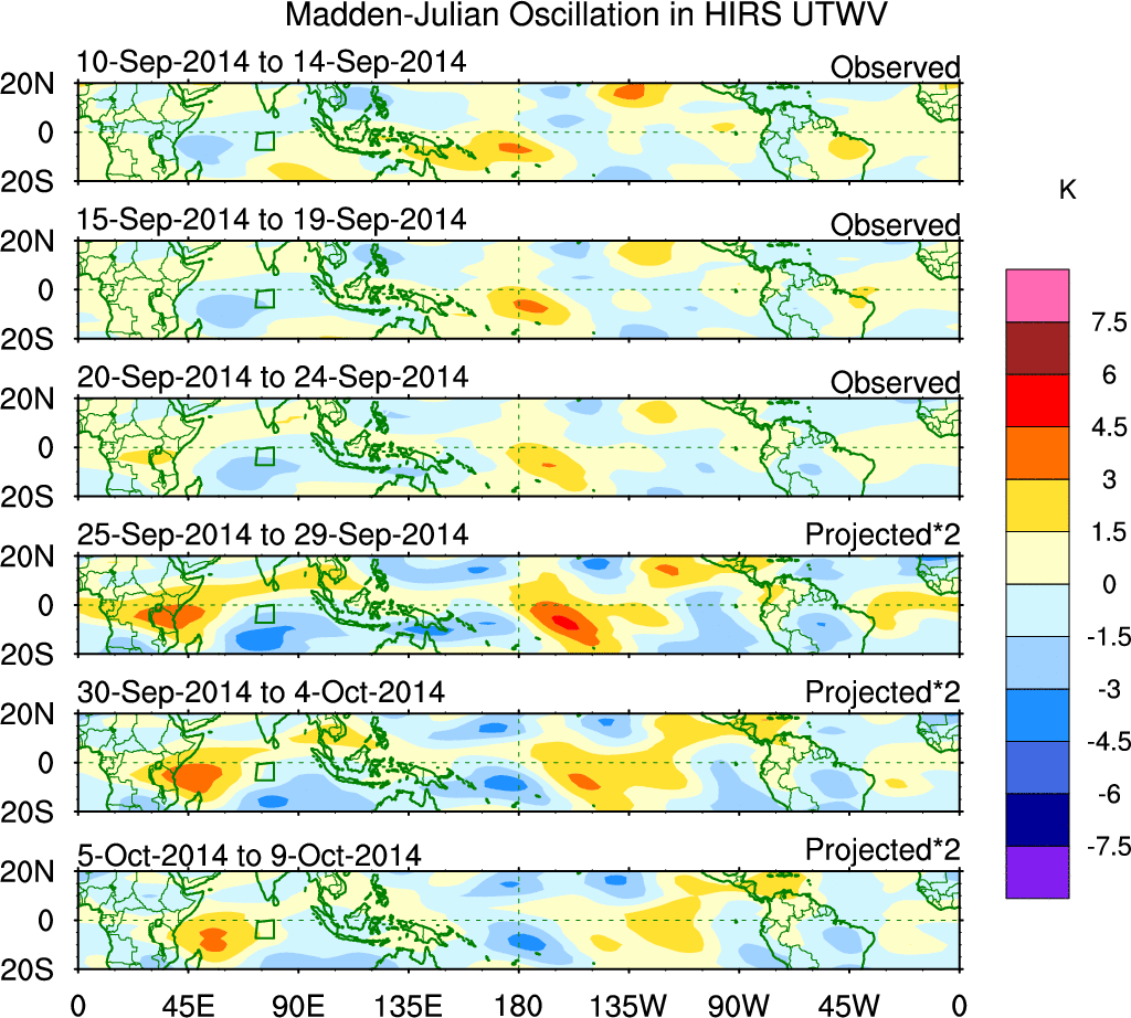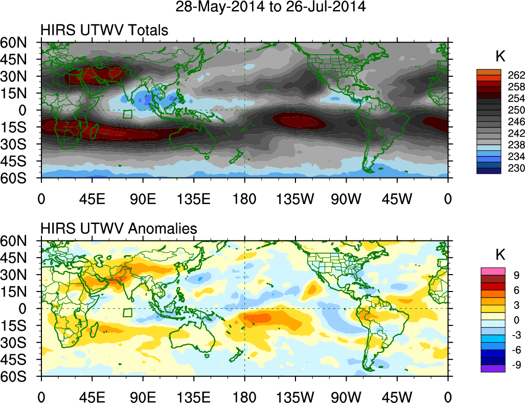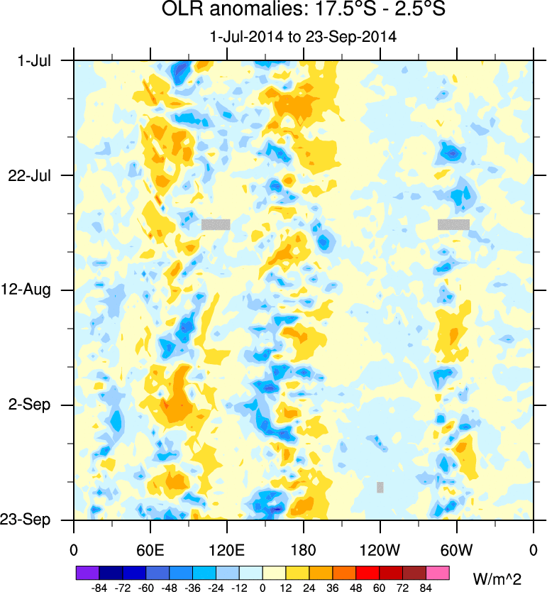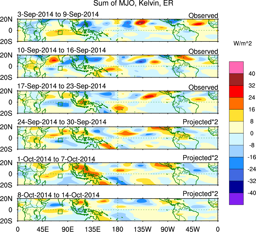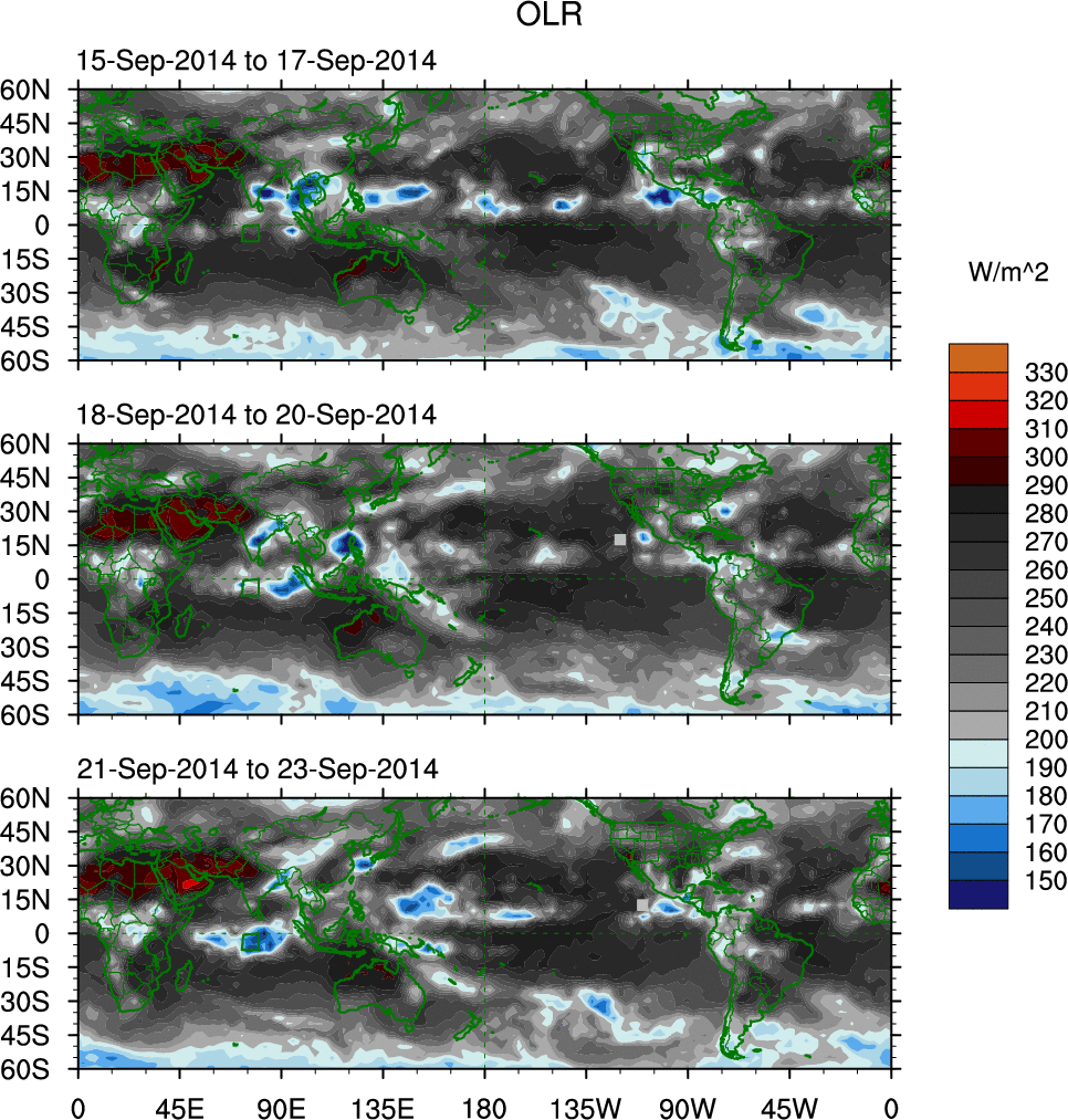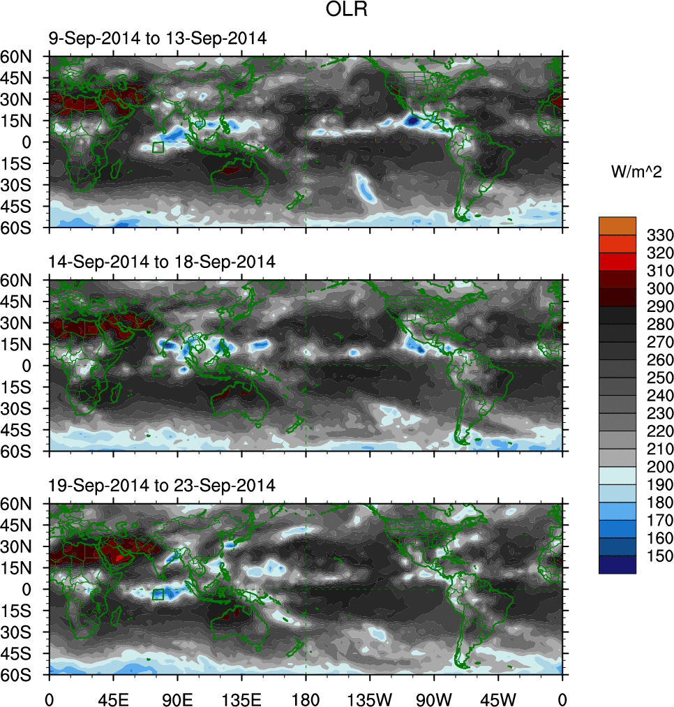 To identify tropical waves in near real-time, the OLR and UTWV data are filtered following Wheeler & Weickmann (2001 MWR). The daily anomalies are calculated using the first 3 harmonics of the seasonal cycle for 1979–2009. Missing values are then filled using linear interpolation in space and time. The most recent 365 days of anomalies are padded with 659 days of zeroes, and the result is filtered for each wave type.
