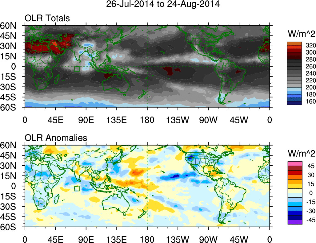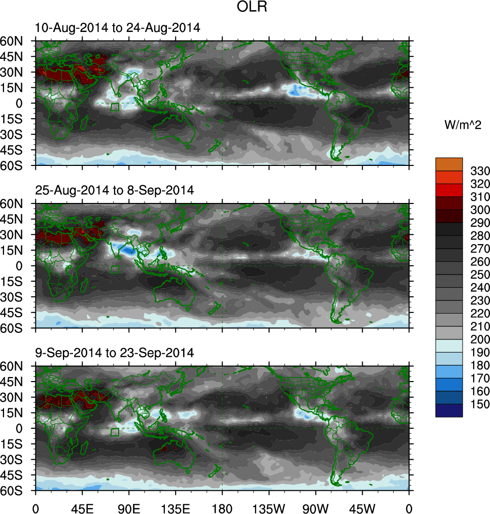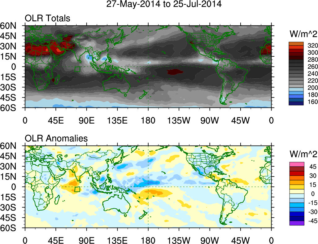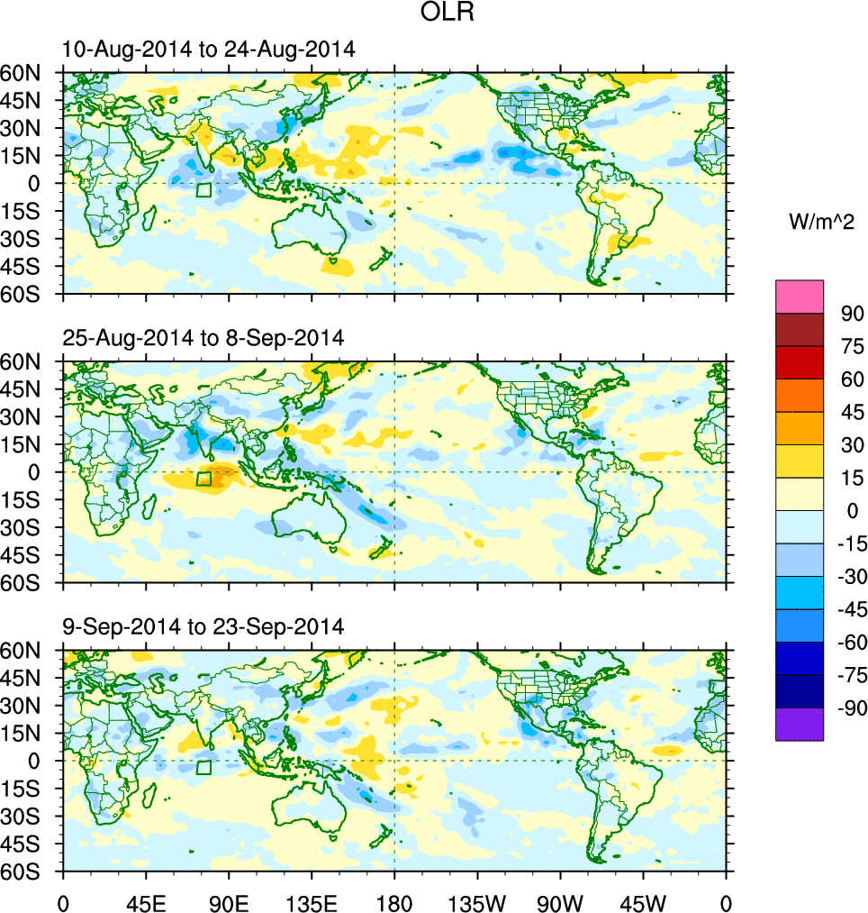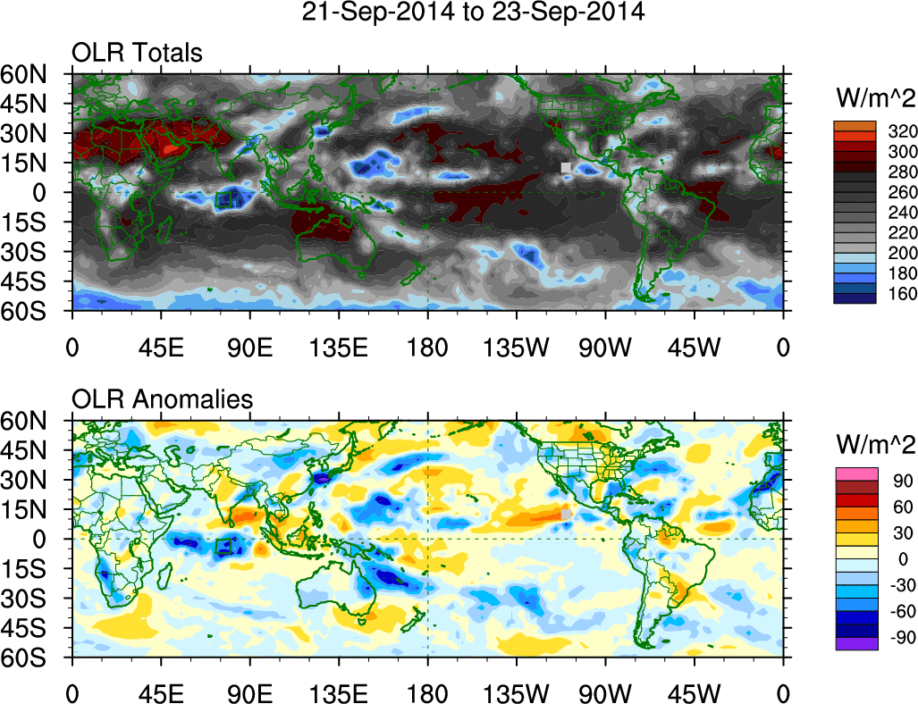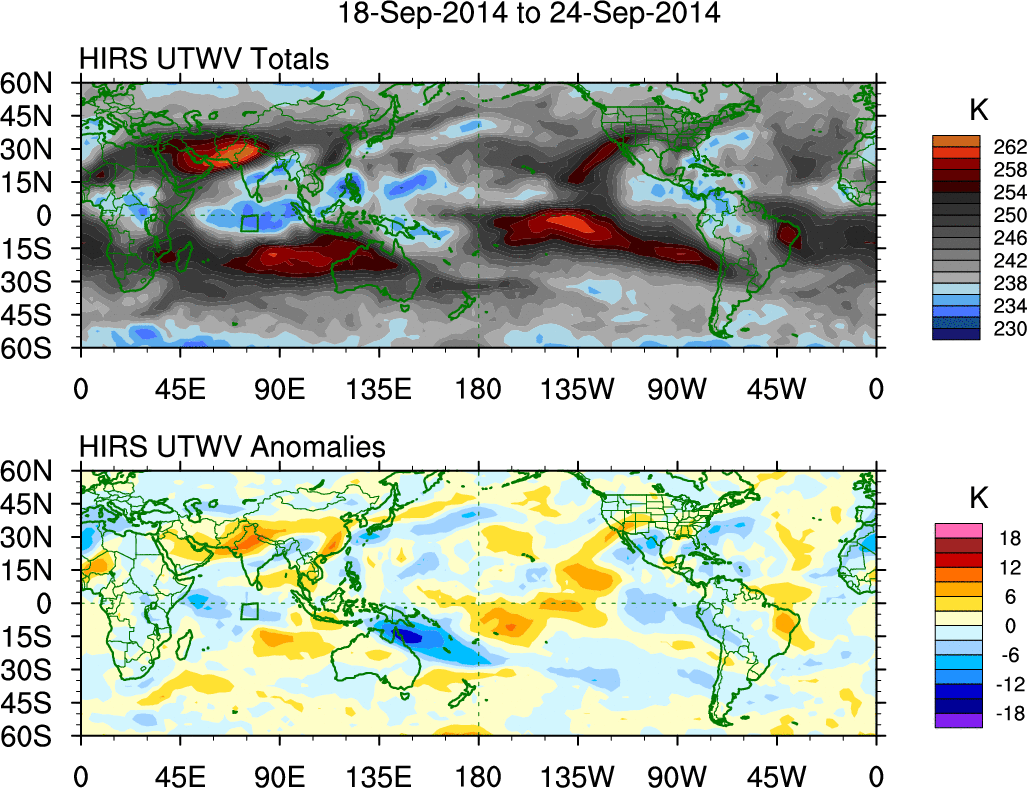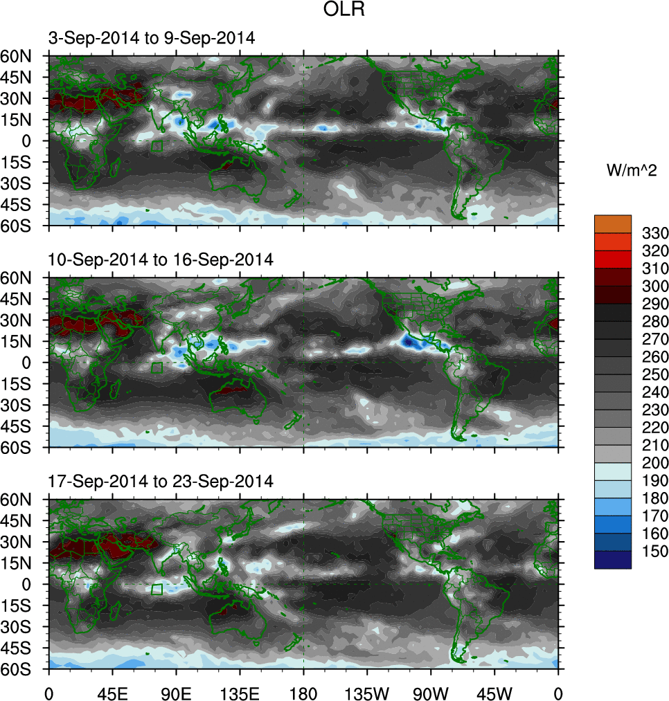 To identify tropical waves in near real-time, the OLR and UTWV data are filtered following Wheeler & Weickmann (2001 MWR). The daily anomalies are calculated using the first 3 harmonics of the seasonal cycle for 1979–2009. Missing values are then filled using linear interpolation in space and time. The most recent 365 days of anomalies are padded with 659 days of zeroes, and the result is filtered for each wave type.