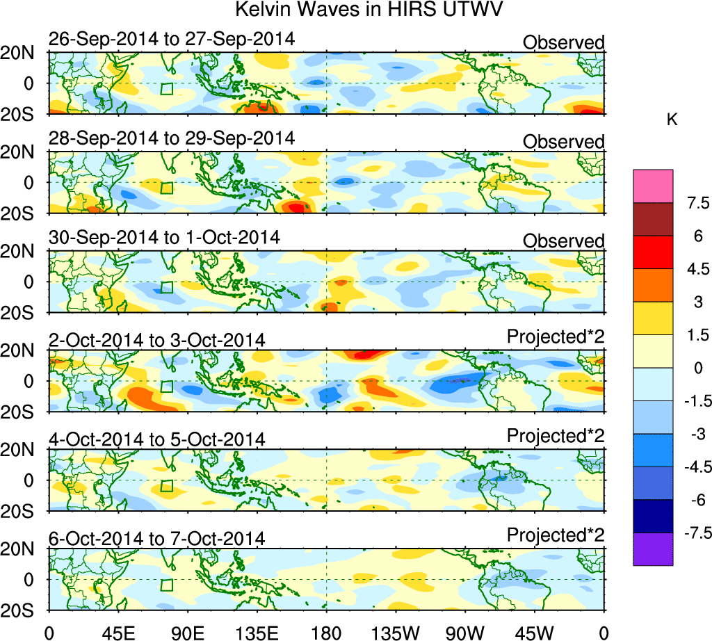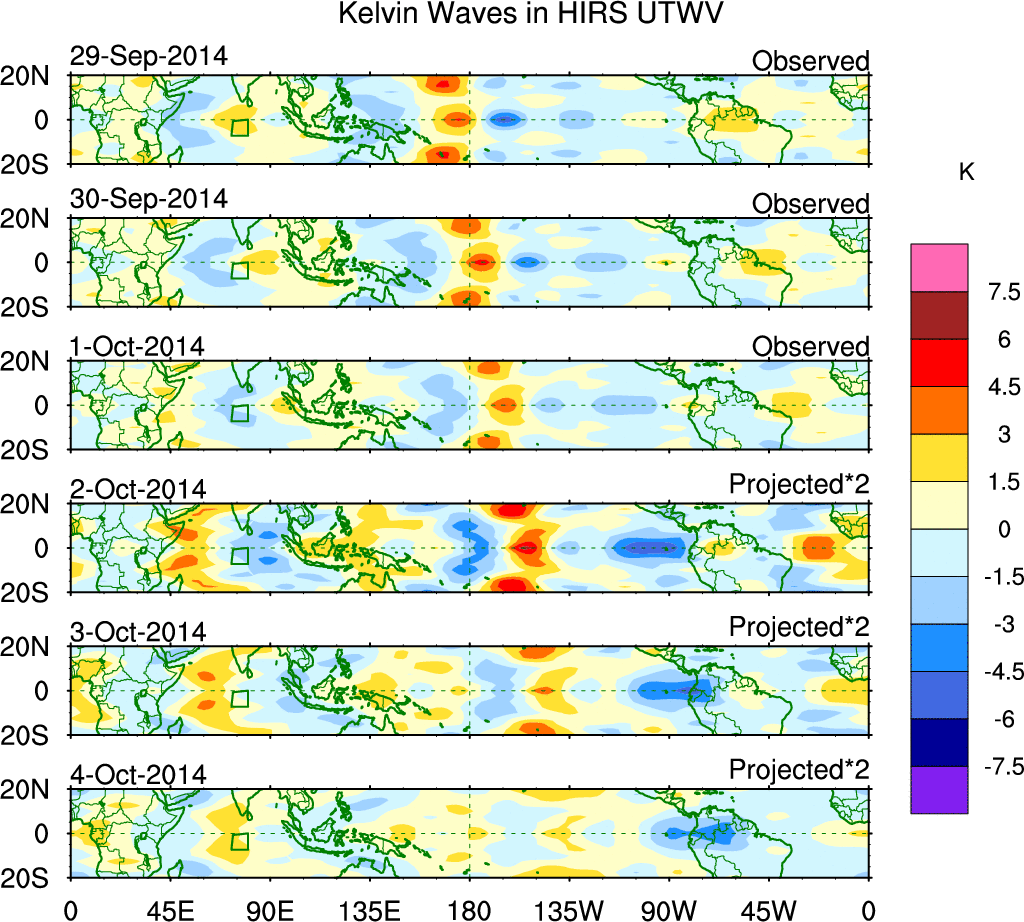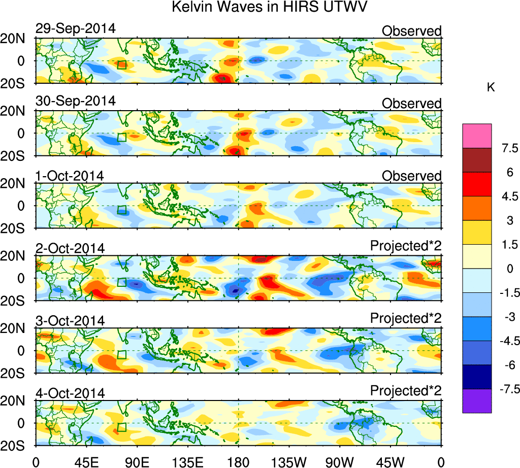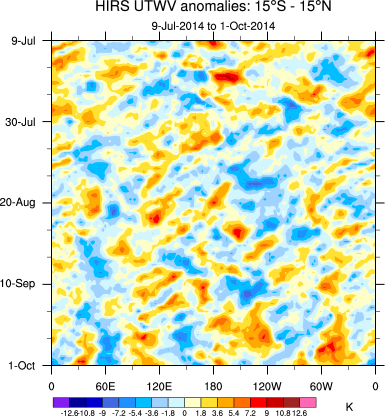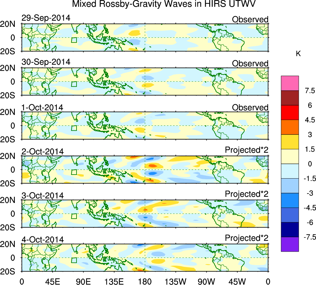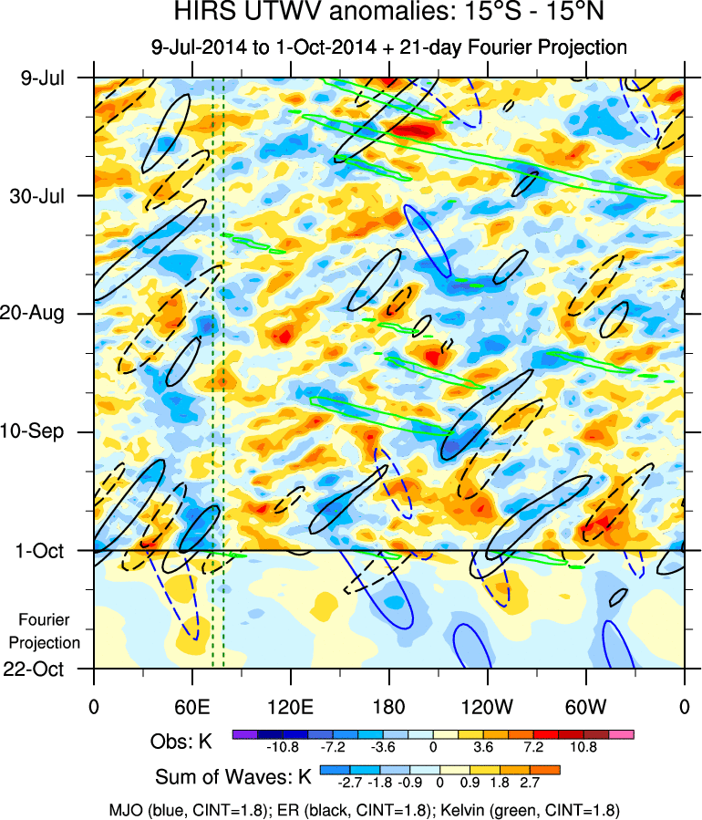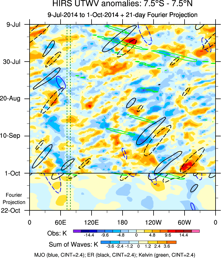 To identify tropical waves in near real-time, the OLR and UTWV data are filtered following Wheeler & Weickmann (2001 MWR). The daily anomalies are calculated using the first 3 harmonics of the seasonal cycle for 1979–2009. Missing values are then filled using linear interpolation in space and time. The most recent 365 days of anomalies are padded with 659 days of zeroes, and the result is filtered for each wave type.