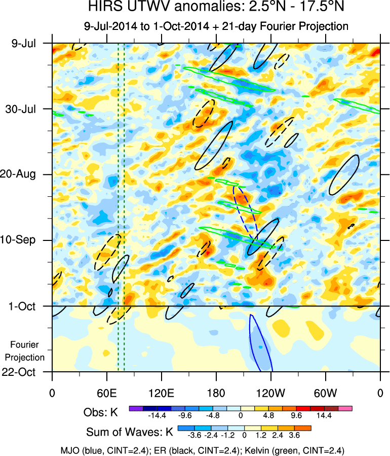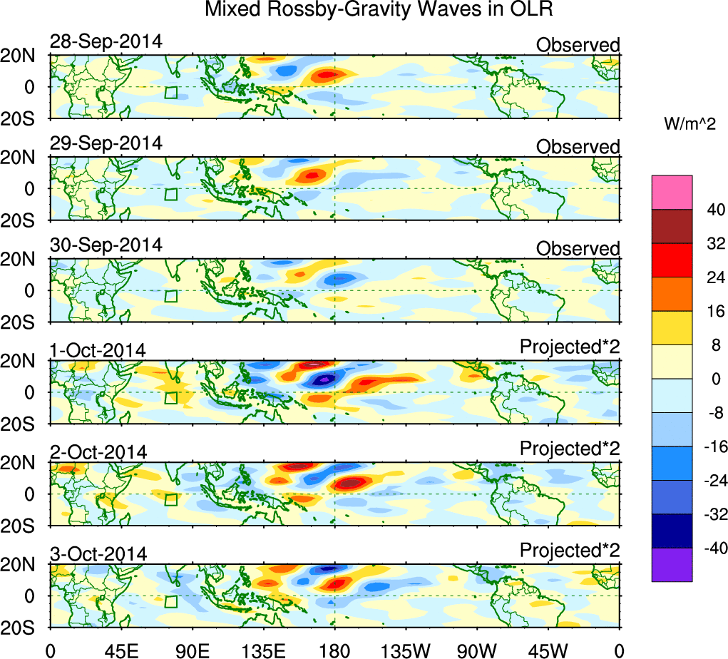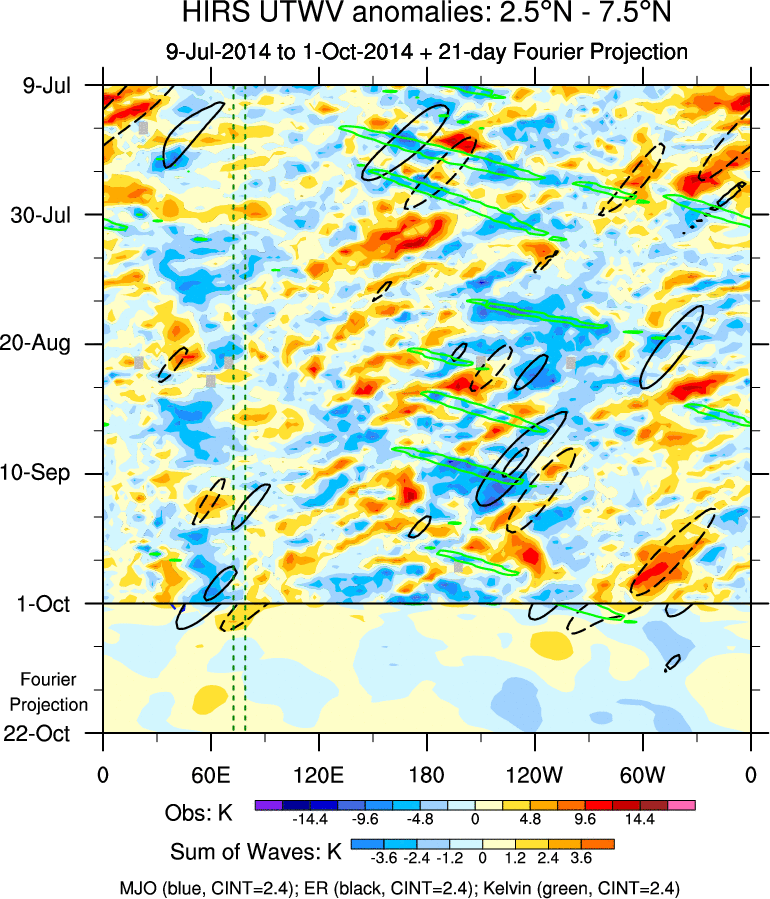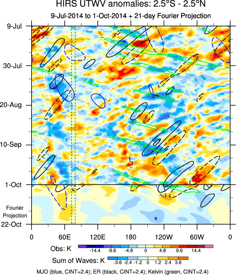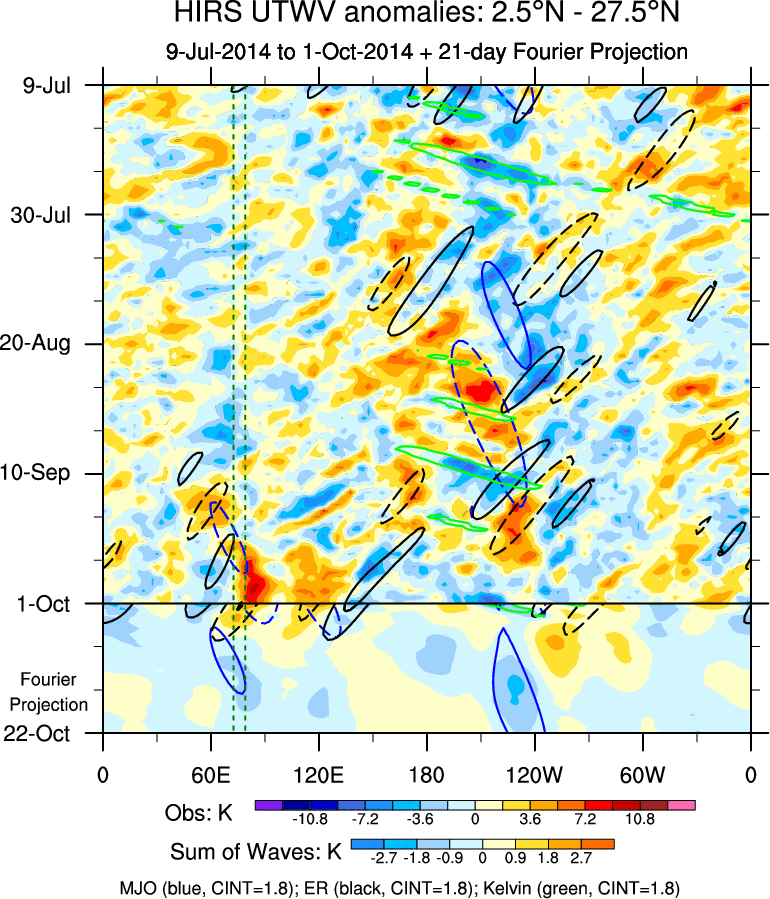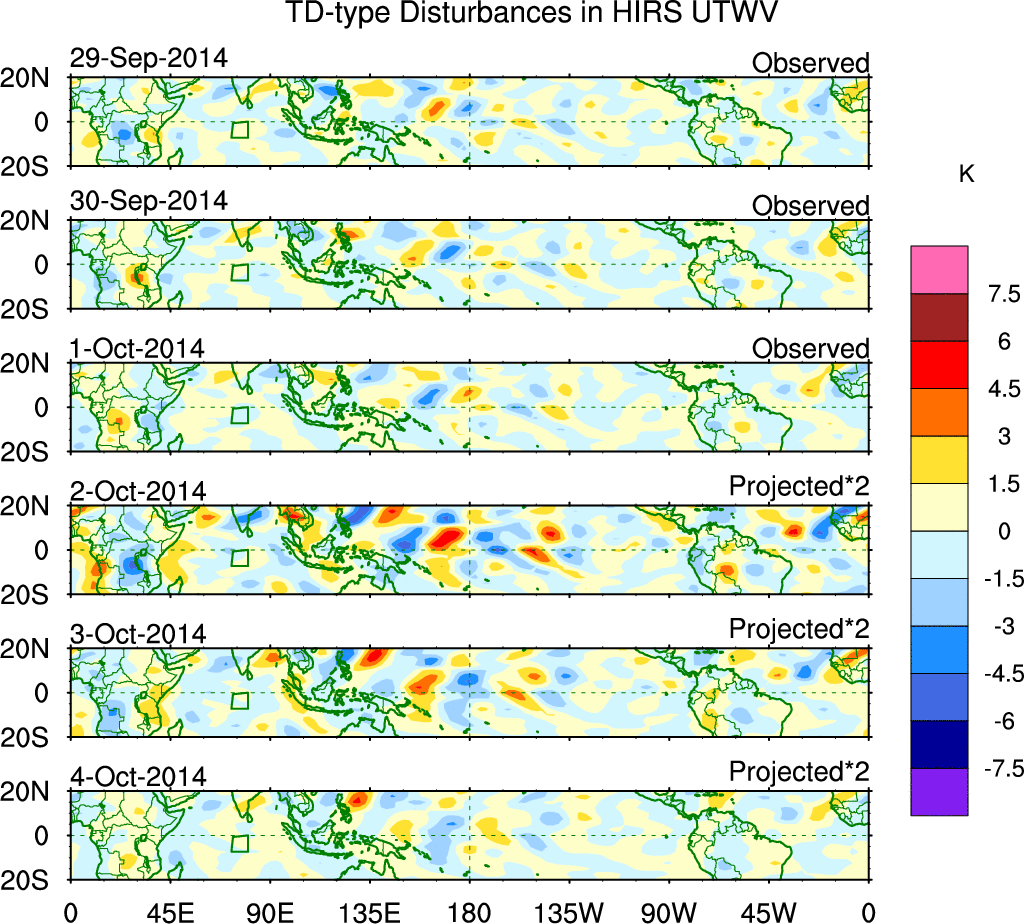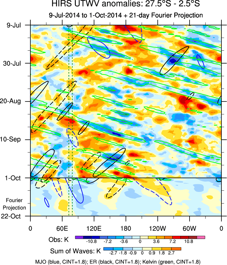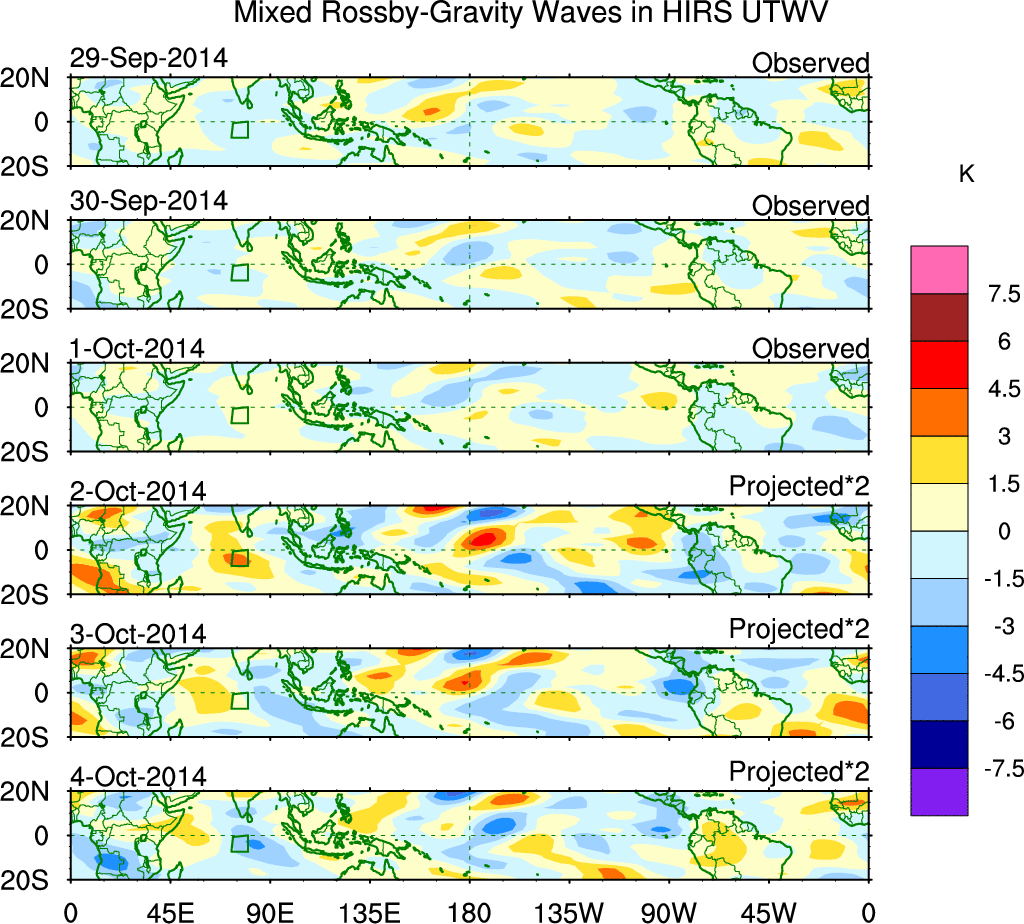 To identify tropical waves in near real-time, the OLR and UTWV data are filtered following Wheeler & Weickmann (2001 MWR). The daily anomalies are calculated using the first 3 harmonics of the seasonal cycle for 1979–2009. Missing values are then filled using linear interpolation in space and time. The most recent 365 days of anomalies are padded with 659 days of zeroes, and the result is filtered for each wave type.