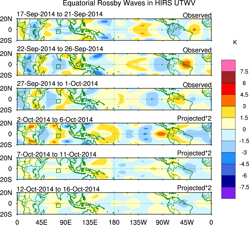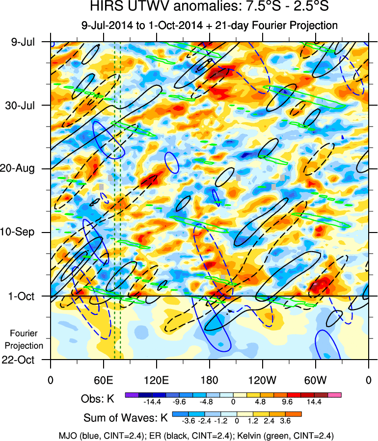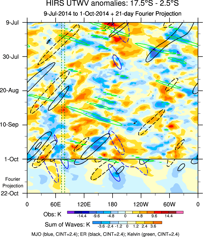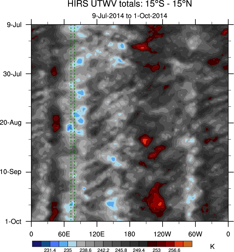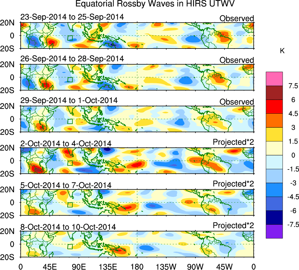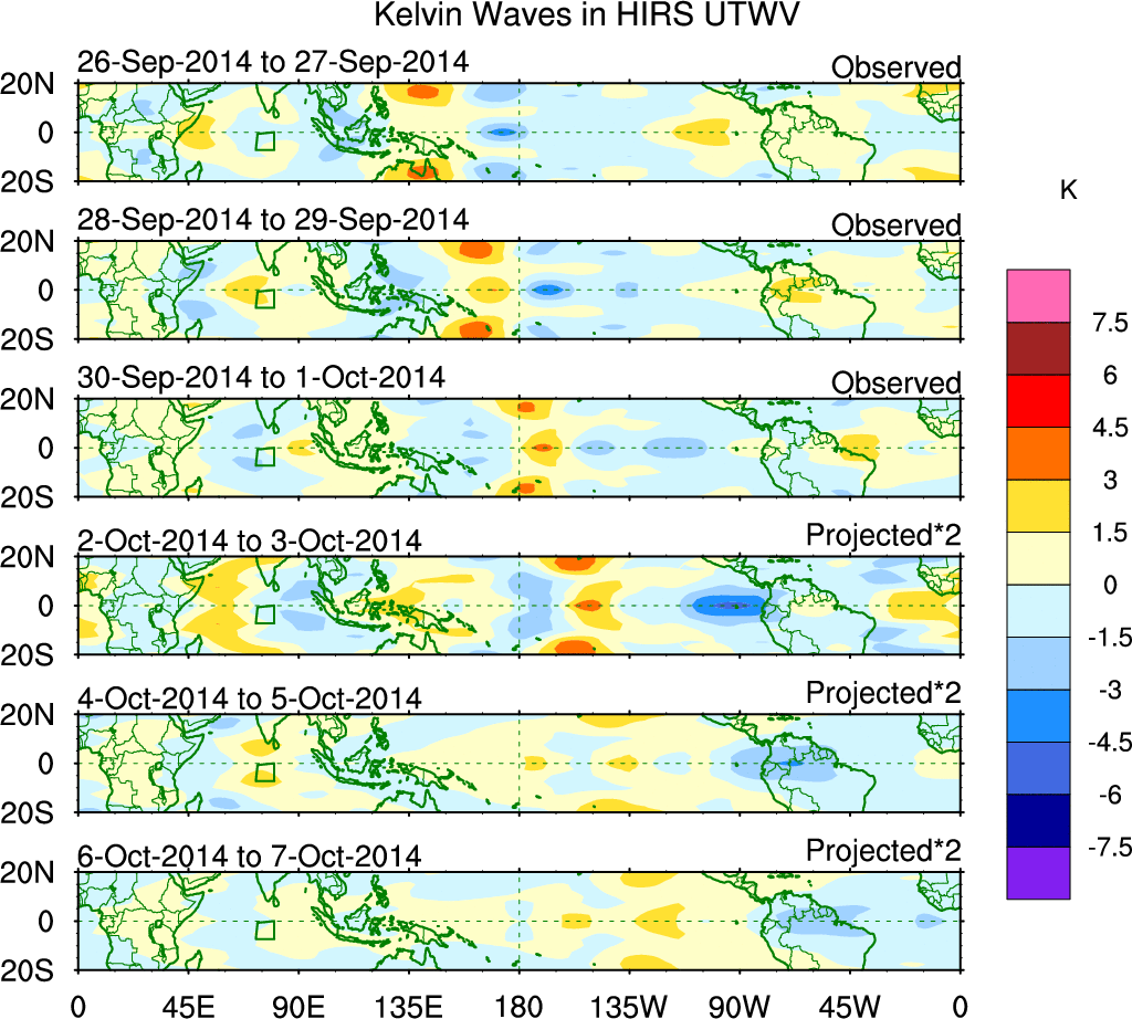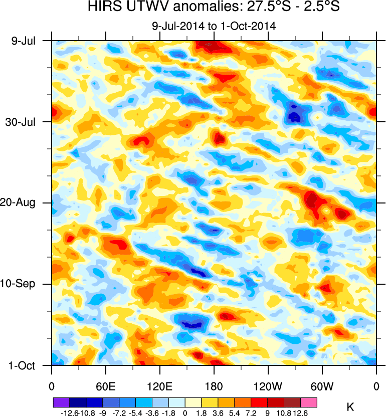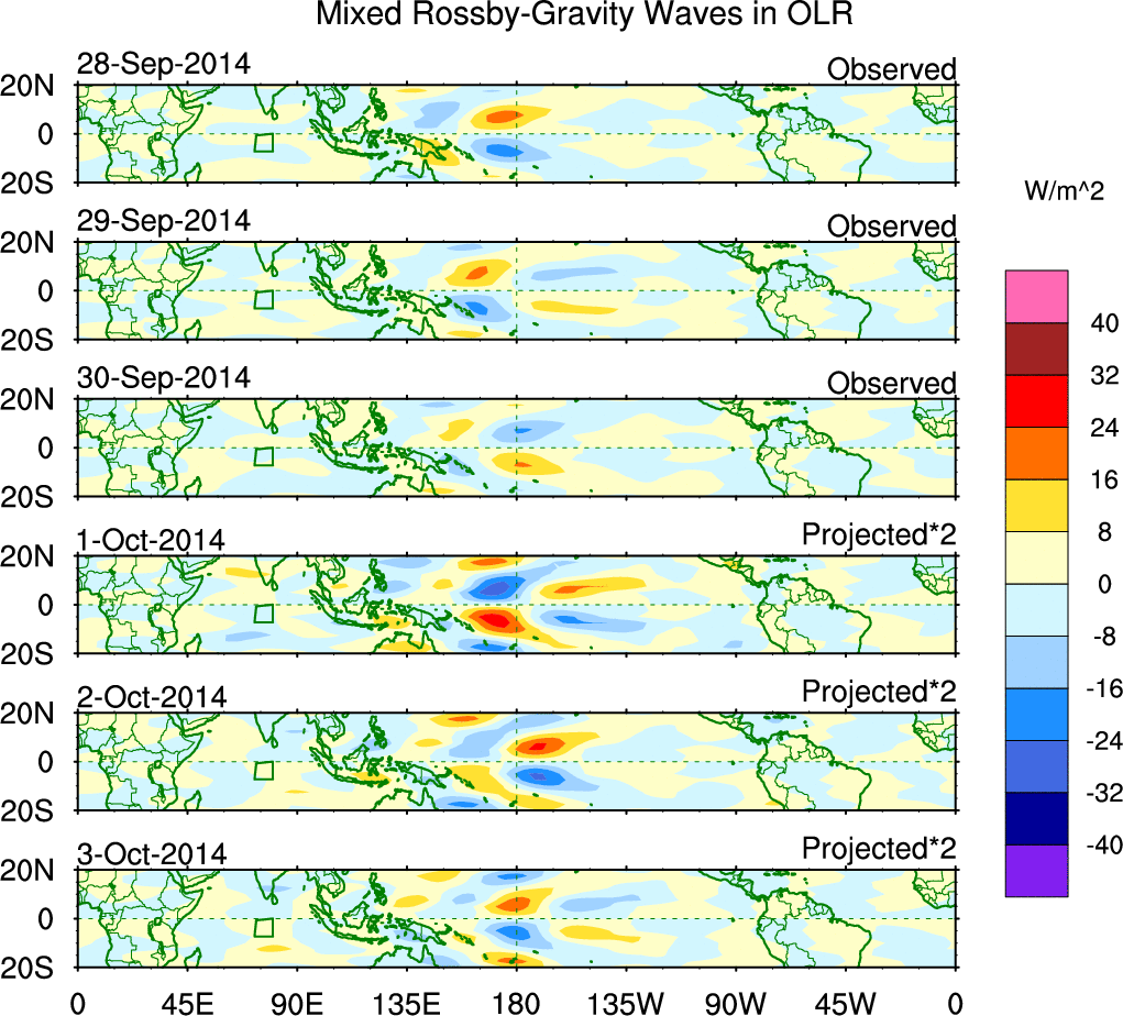 To identify tropical waves in near real-time, the OLR and UTWV data are filtered following Wheeler & Weickmann (2001 MWR). The daily anomalies are calculated using the first 3 harmonics of the seasonal cycle for 1979–2009. Missing values are then filled using linear interpolation in space and time. The most recent 365 days of anomalies are padded with 659 days of zeroes, and the result is filtered for each wave type.