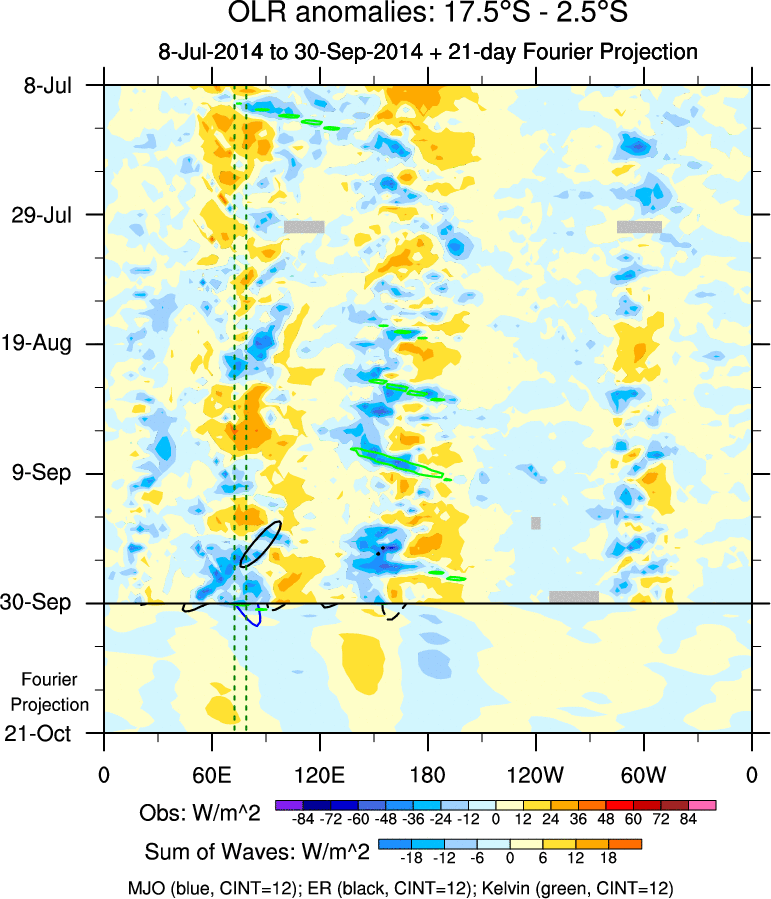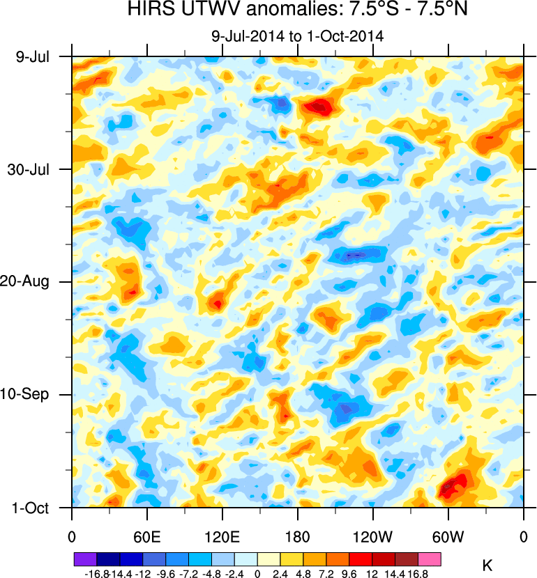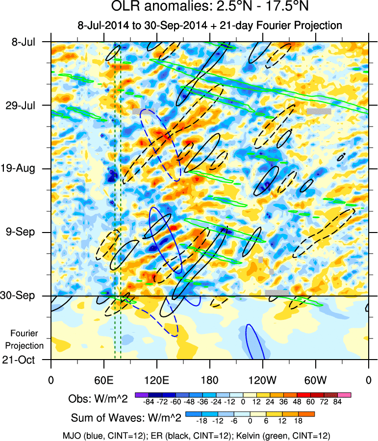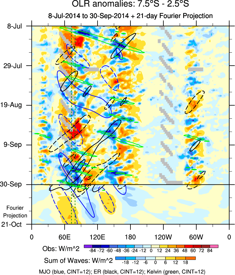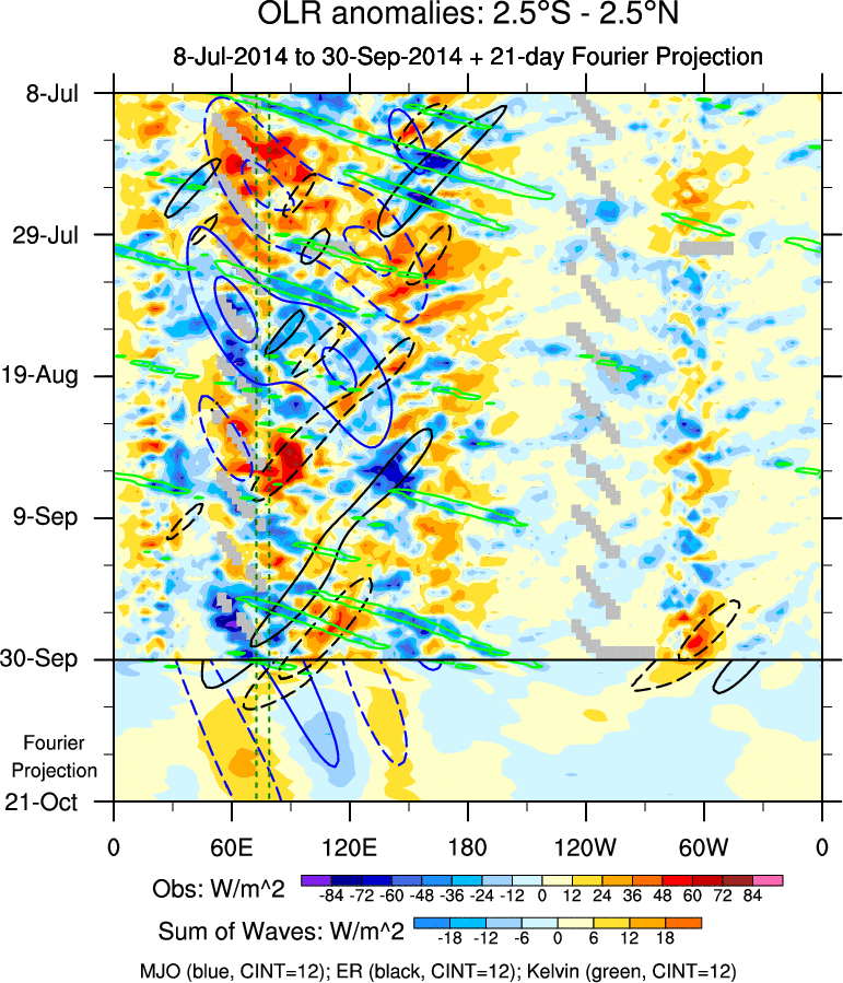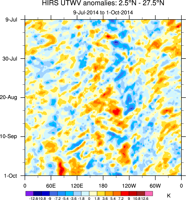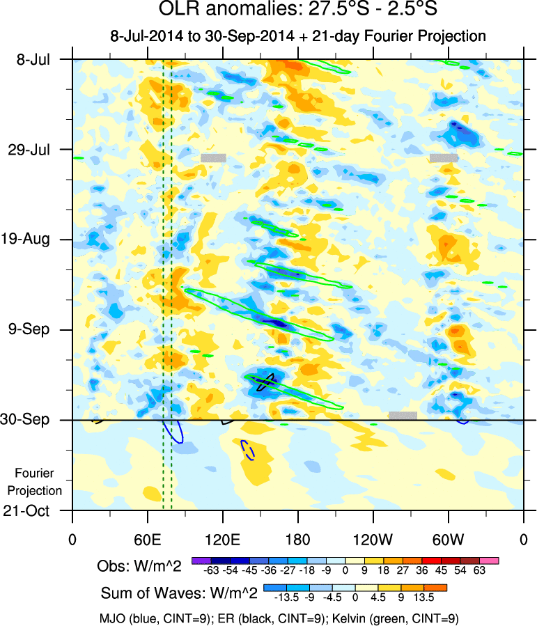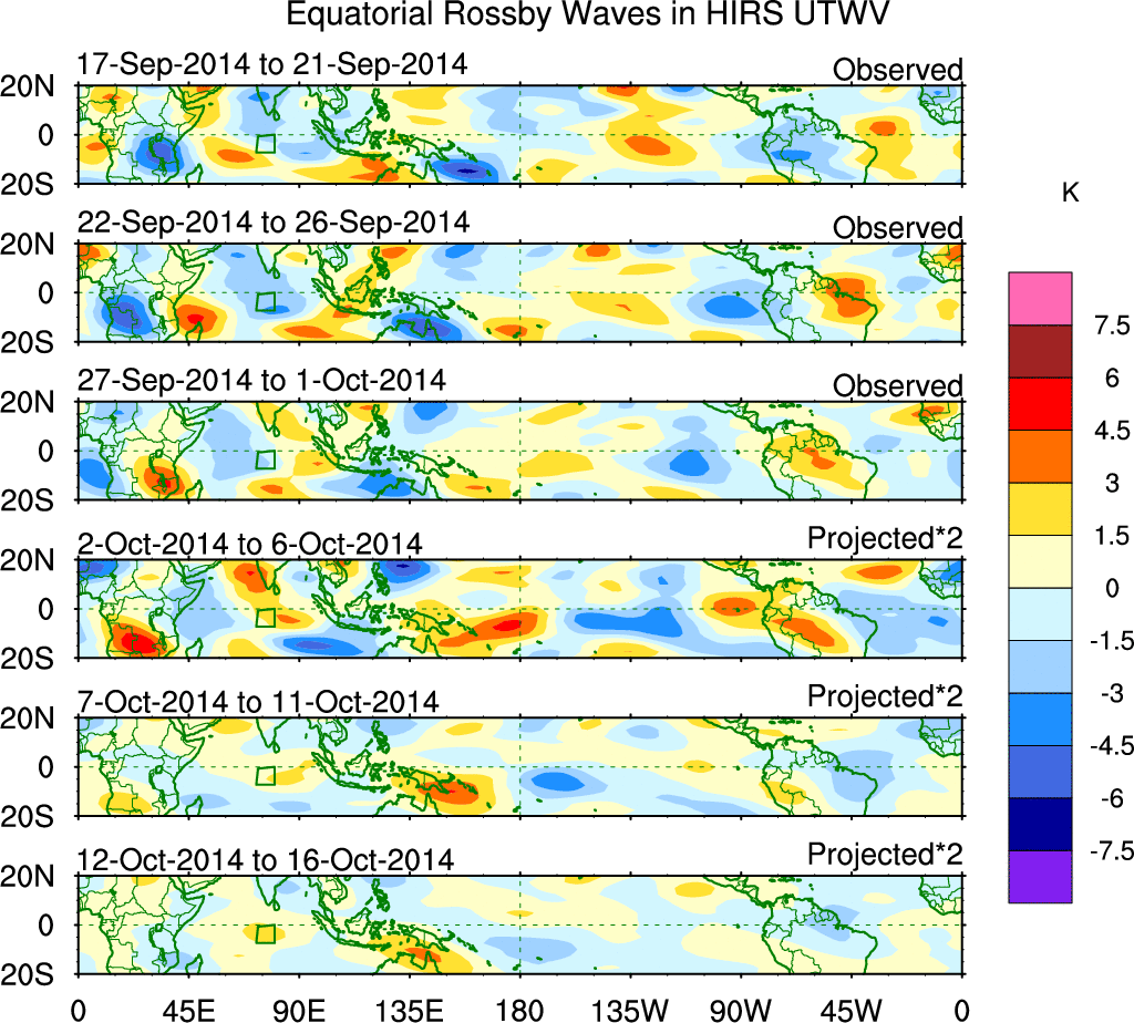 To identify tropical waves in near real-time, the OLR and UTWV data are filtered following Wheeler & Weickmann (2001 MWR). The daily anomalies are calculated using the first 3 harmonics of the seasonal cycle for 1979–2009. Missing values are then filled using linear interpolation in space and time. The most recent 365 days of anomalies are padded with 659 days of zeroes, and the result is filtered for each wave type.