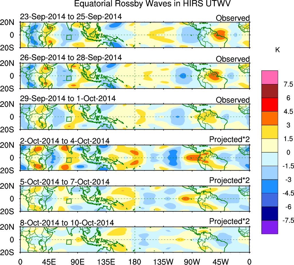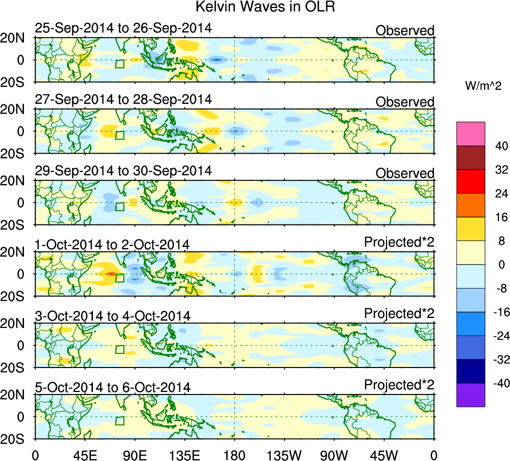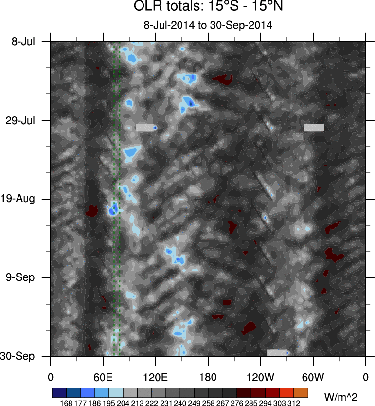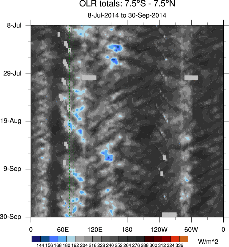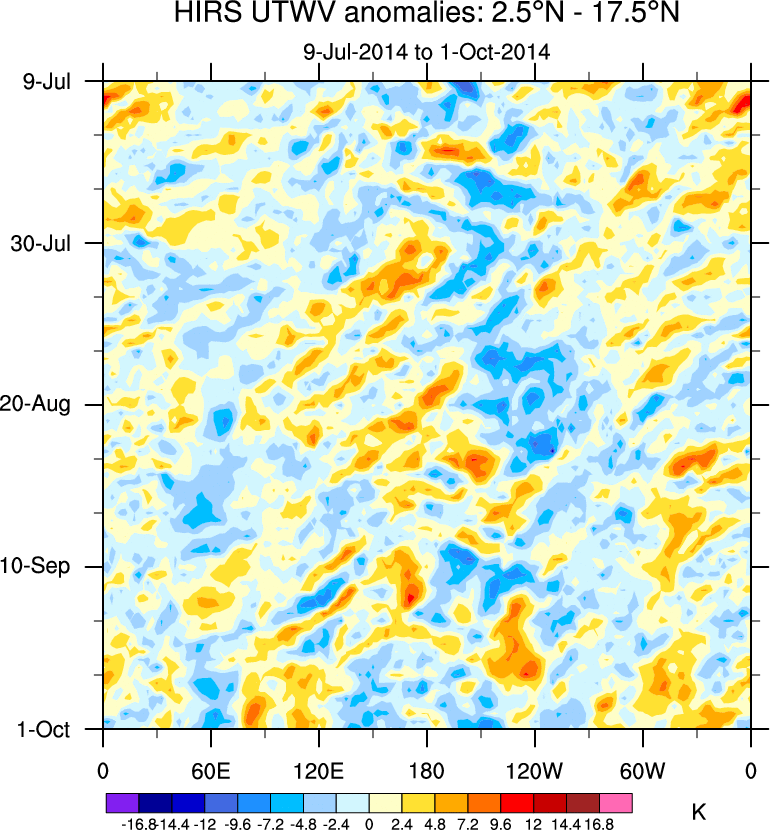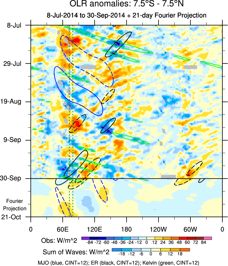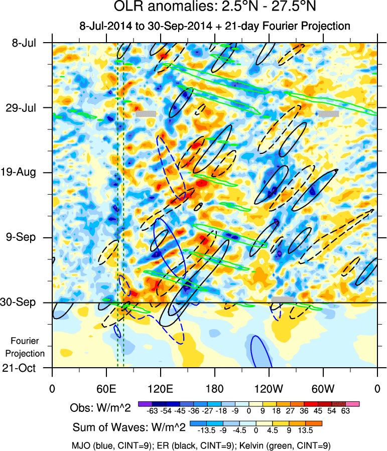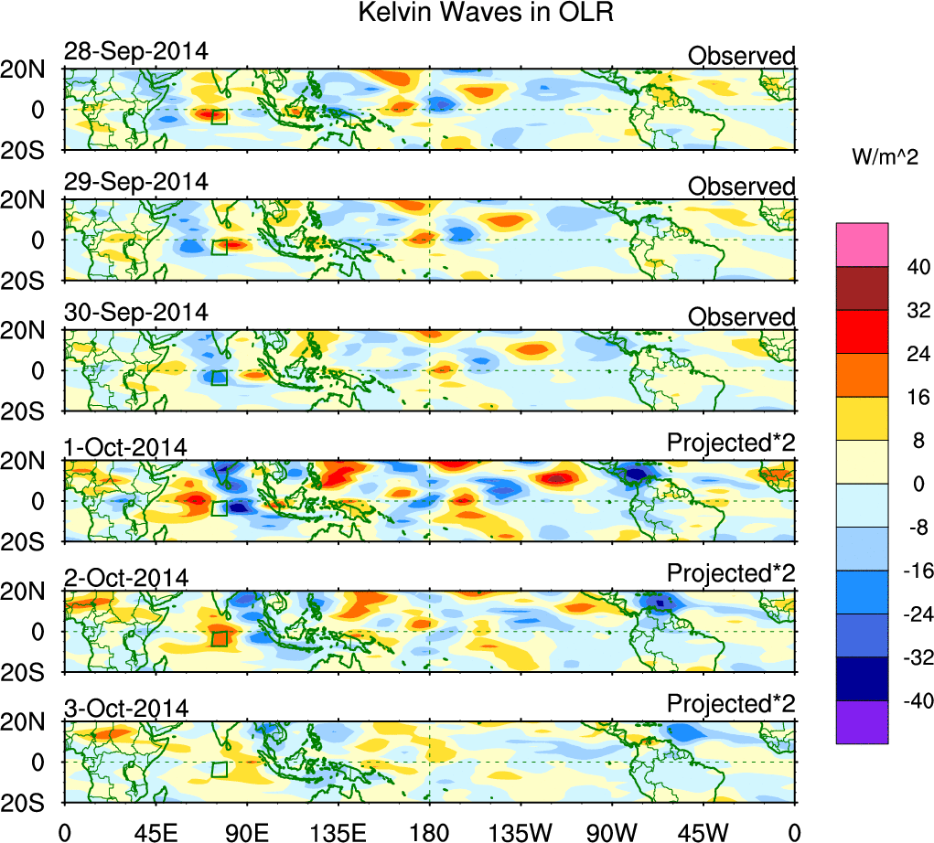 To identify tropical waves in near real-time, the OLR and UTWV data are filtered following Wheeler & Weickmann (2001 MWR). The daily anomalies are calculated using the first 3 harmonics of the seasonal cycle for 1979–2009. Missing values are then filled using linear interpolation in space and time. The most recent 365 days of anomalies are padded with 659 days of zeroes, and the result is filtered for each wave type.