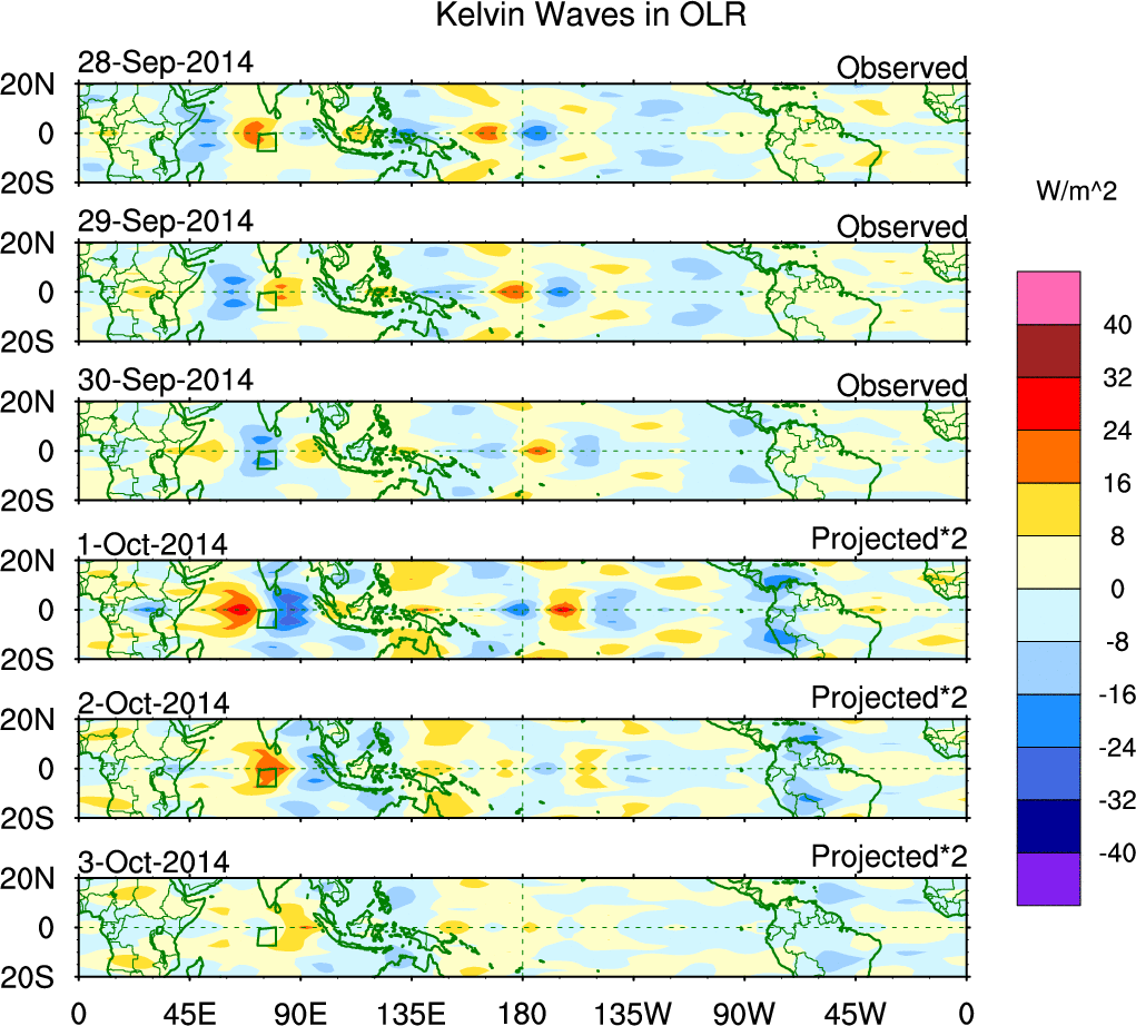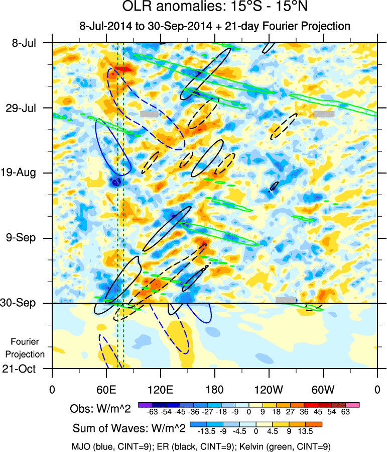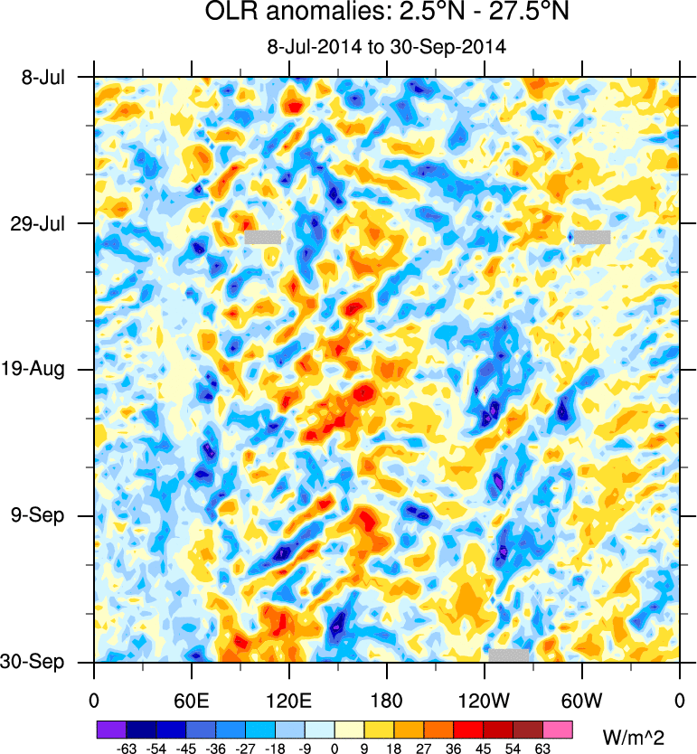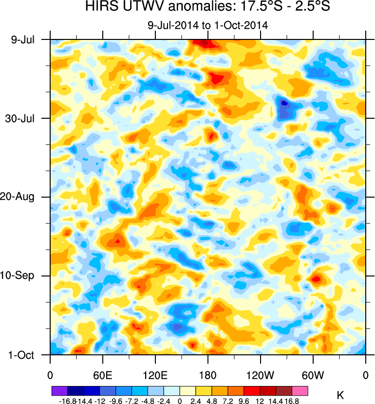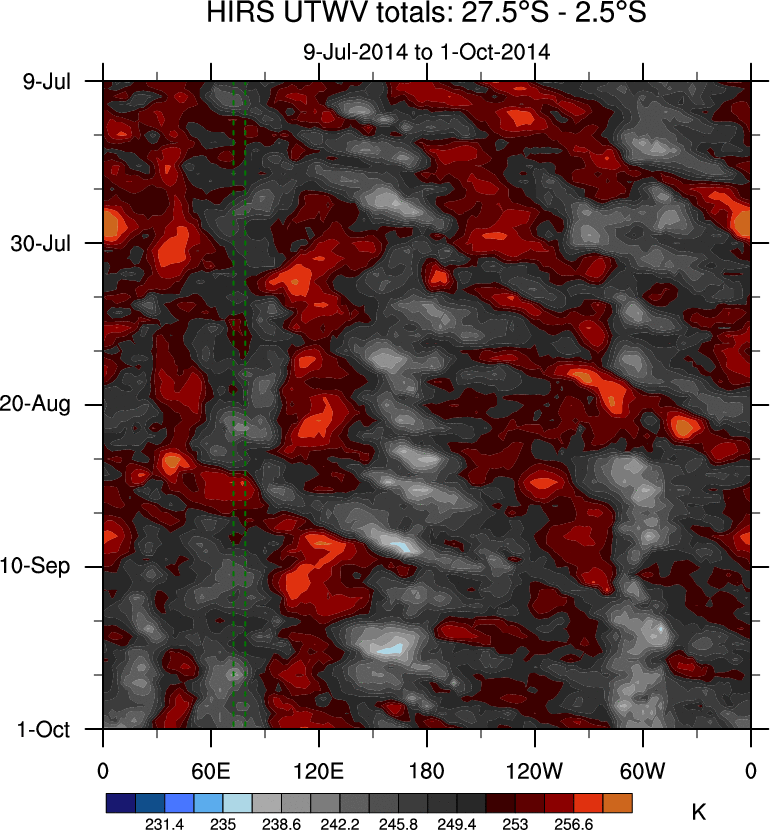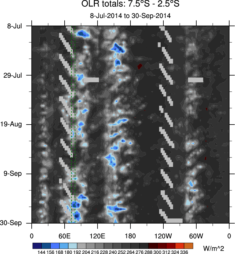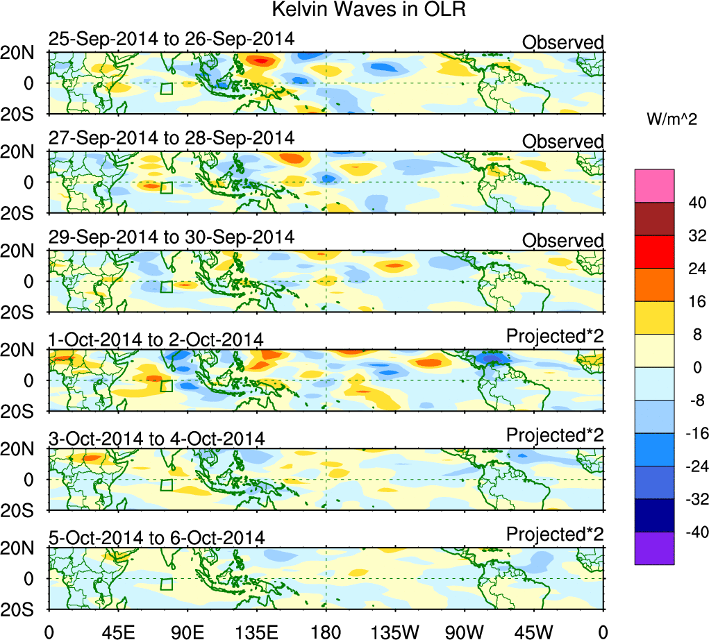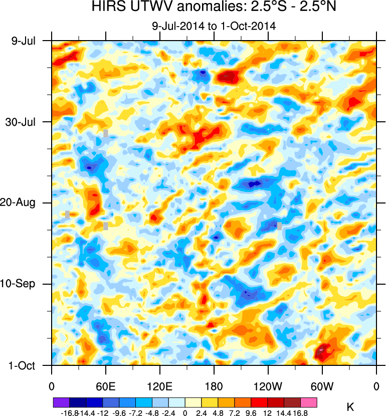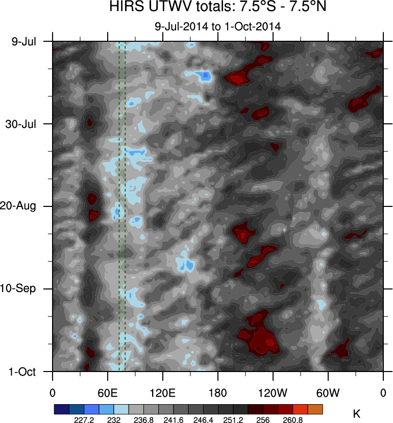 To identify tropical waves in near real-time, the OLR and UTWV data are filtered following Wheeler & Weickmann (2001 MWR). The daily anomalies are calculated using the first 3 harmonics of the seasonal cycle for 1979–2009. Missing values are then filled using linear interpolation in space and time. The most recent 365 days of anomalies are padded with 659 days of zeroes, and the result is filtered for each wave type.