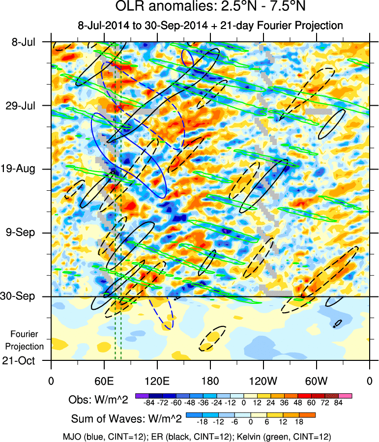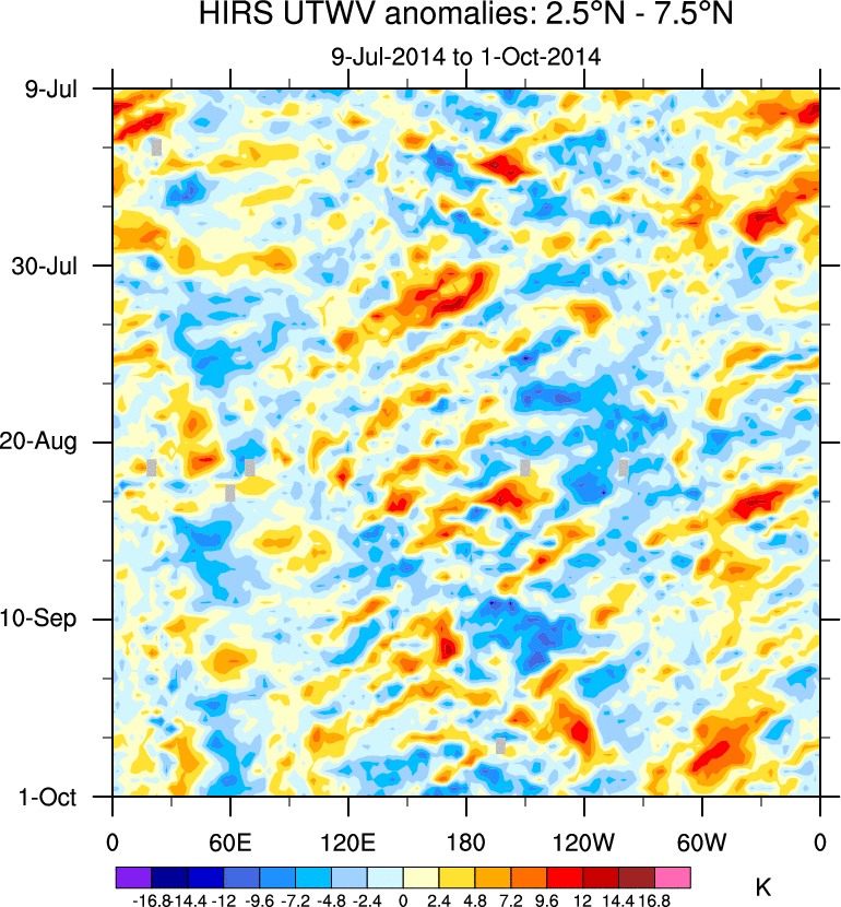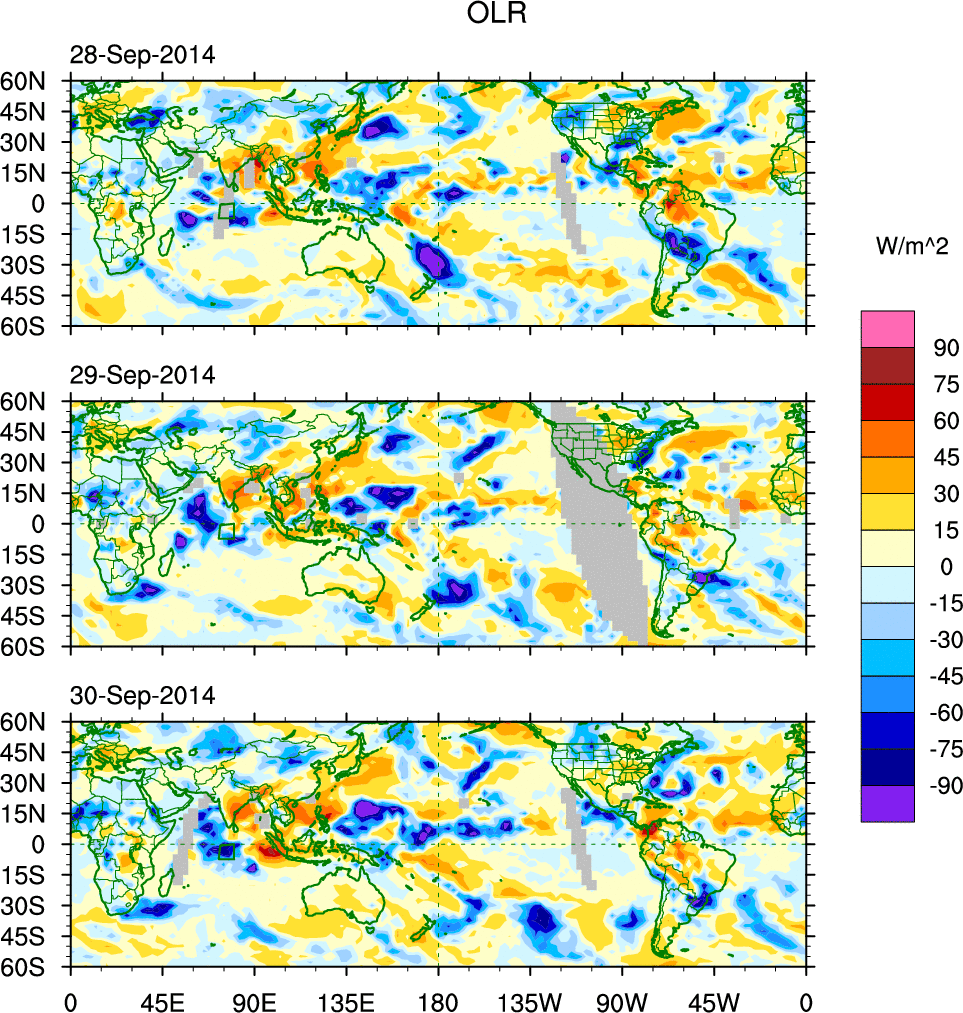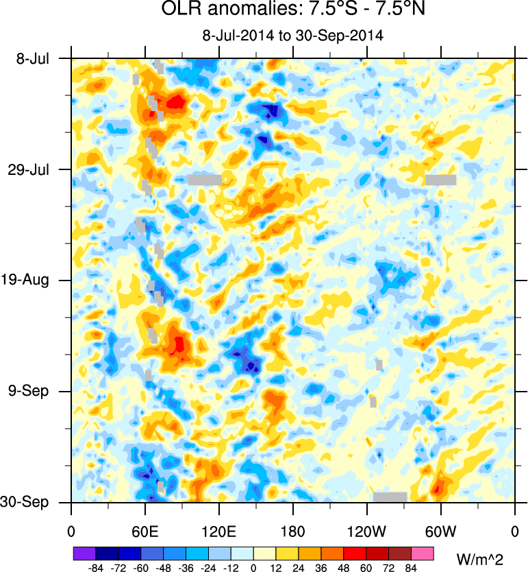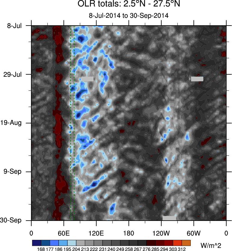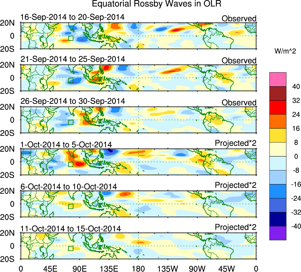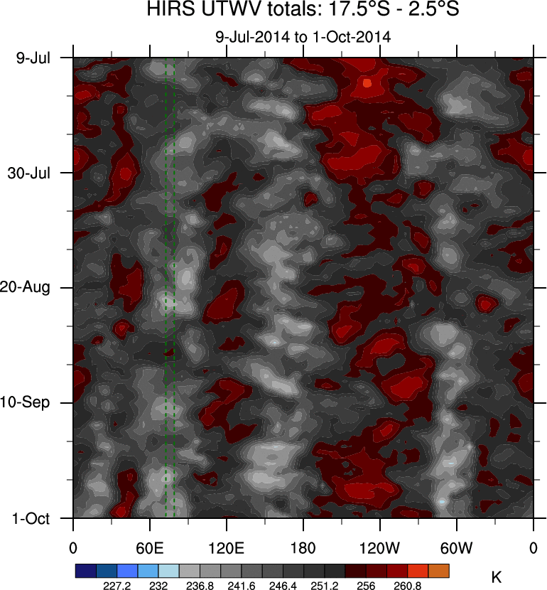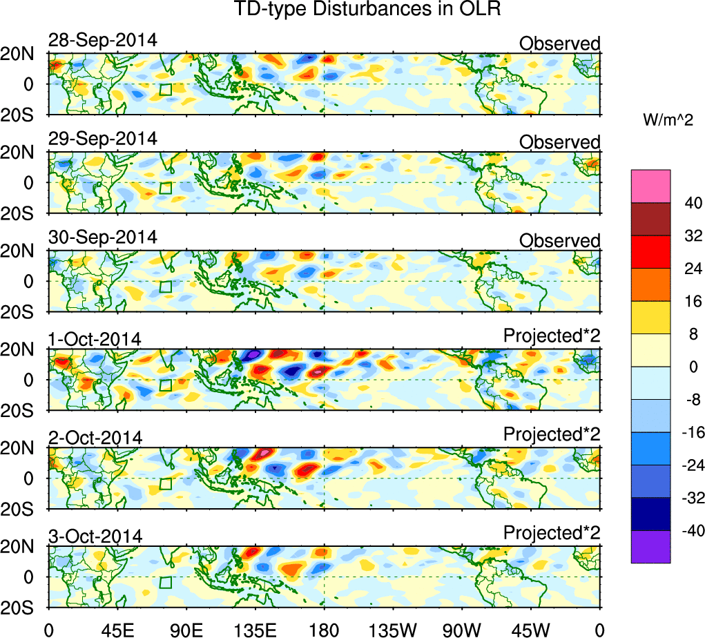 To identify tropical waves in near real-time, the OLR and UTWV data are filtered following Wheeler & Weickmann (2001 MWR). The daily anomalies are calculated using the first 3 harmonics of the seasonal cycle for 1979–2009. Missing values are then filled using linear interpolation in space and time. The most recent 365 days of anomalies are padded with 659 days of zeroes, and the result is filtered for each wave type.
