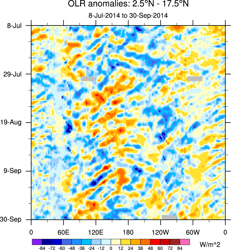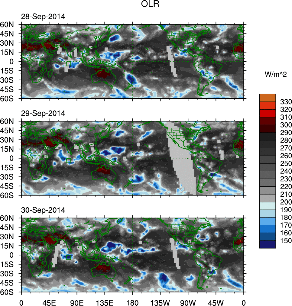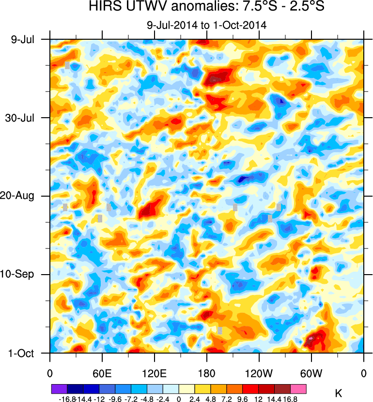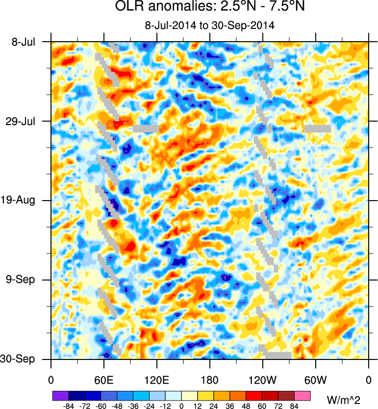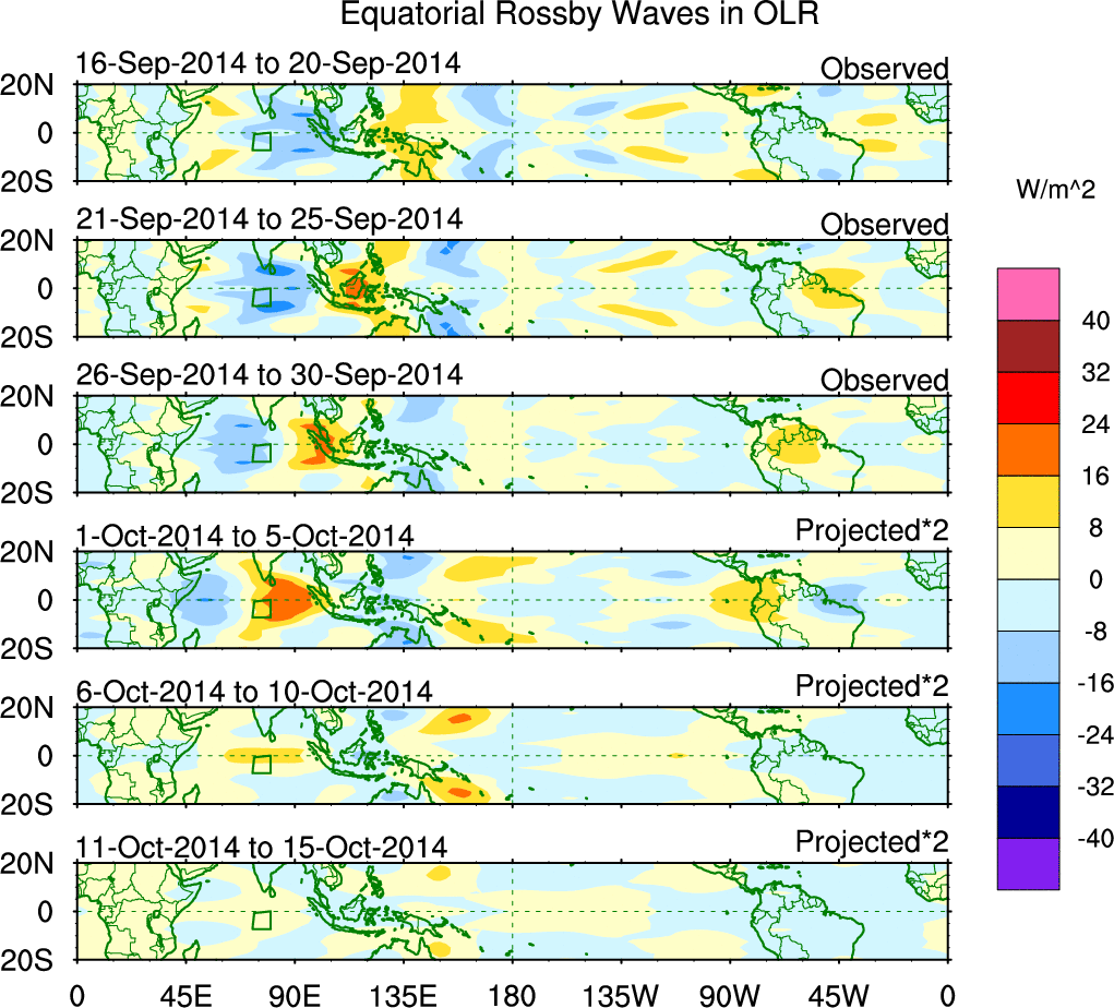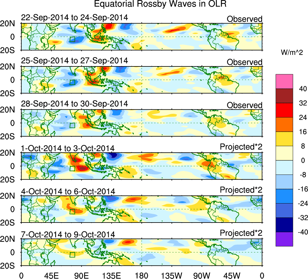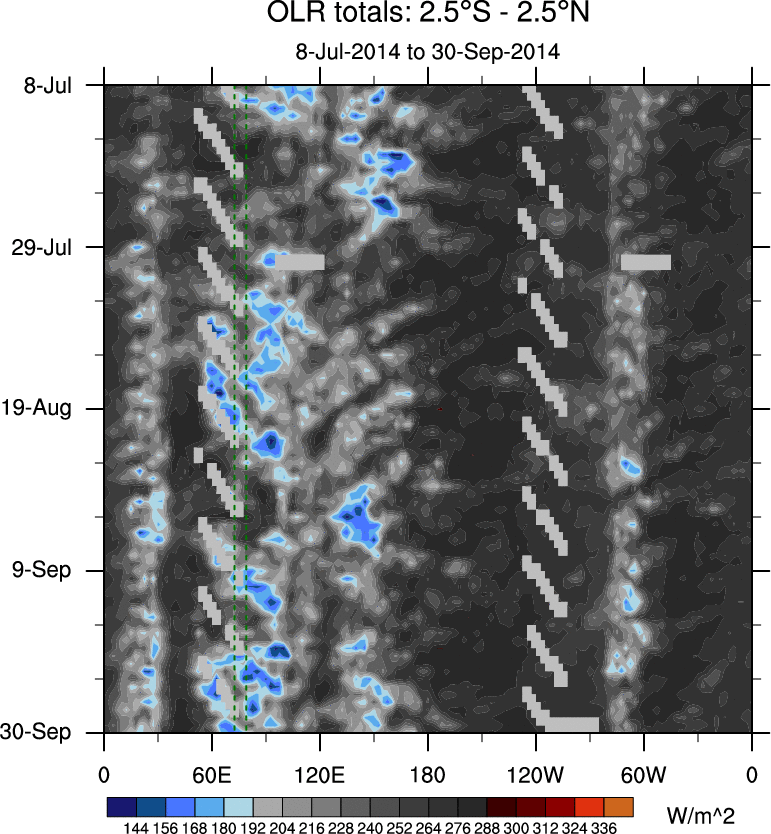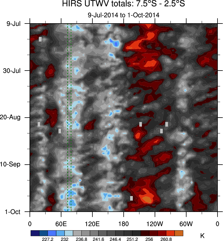 To identify tropical waves in near real-time, the OLR and UTWV data are filtered following Wheeler & Weickmann (2001 MWR). The daily anomalies are calculated using the first 3 harmonics of the seasonal cycle for 1979–2009. Missing values are then filled using linear interpolation in space and time. The most recent 365 days of anomalies are padded with 659 days of zeroes, and the result is filtered for each wave type.