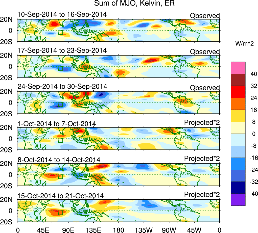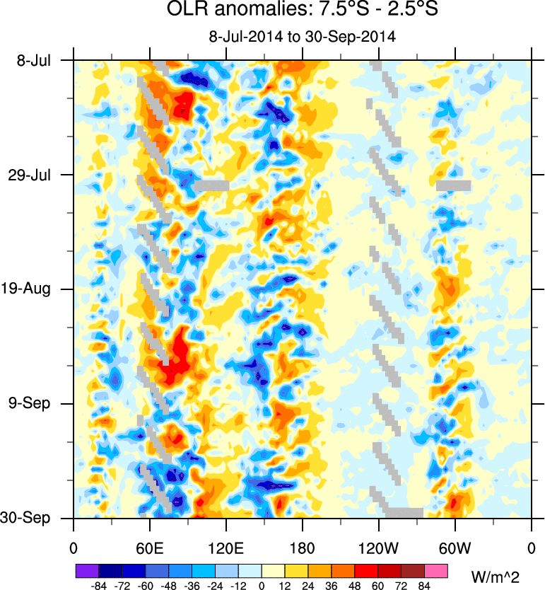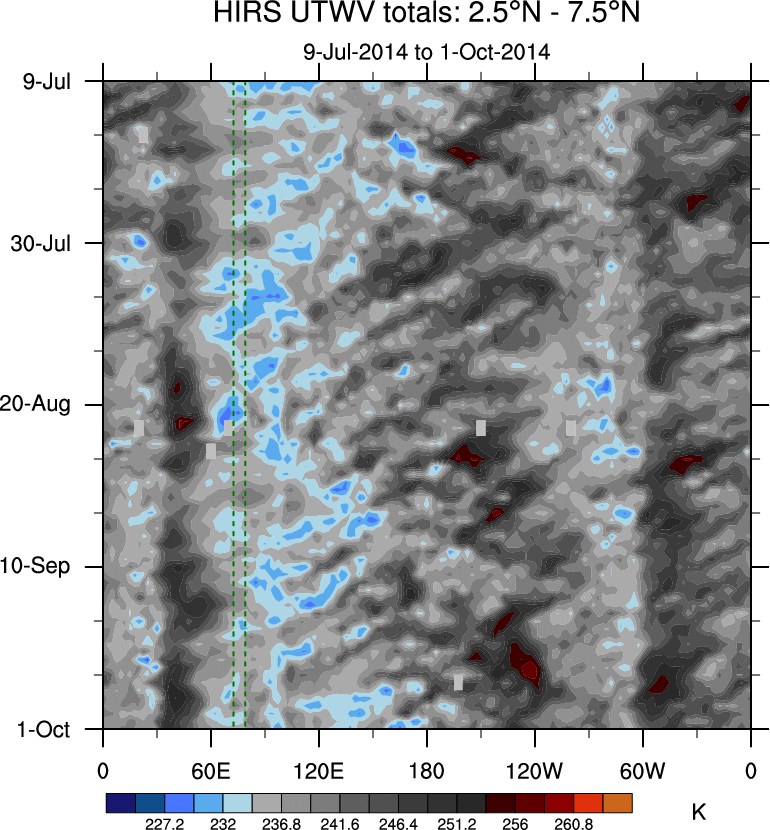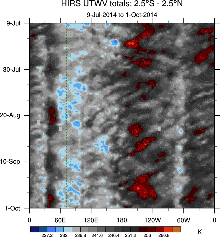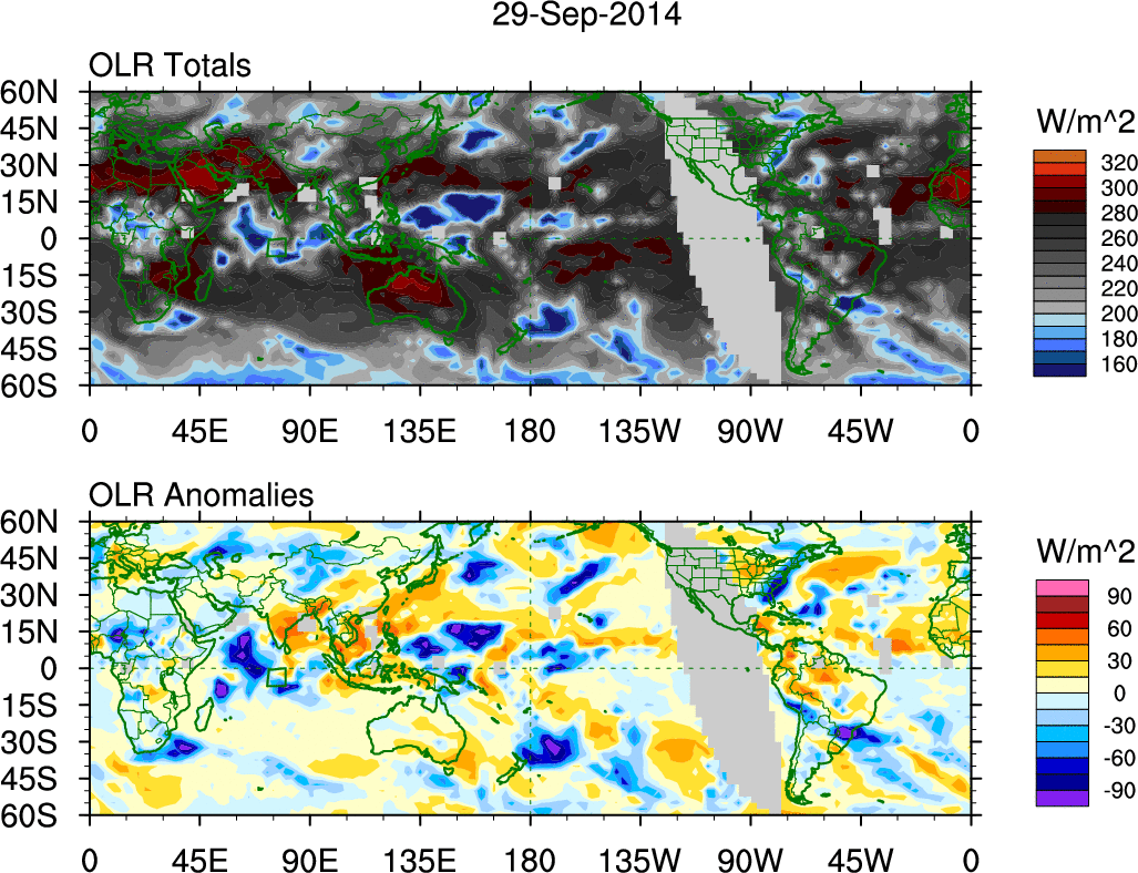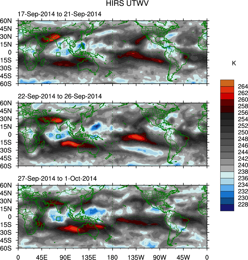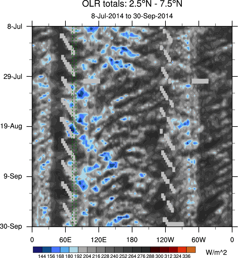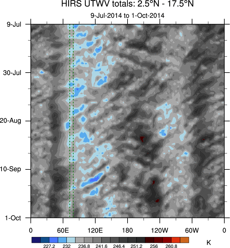 To identify tropical waves in near real-time, the OLR and UTWV data are filtered following Wheeler & Weickmann (2001 MWR). The daily anomalies are calculated using the first 3 harmonics of the seasonal cycle for 1979–2009. Missing values are then filled using linear interpolation in space and time. The most recent 365 days of anomalies are padded with 659 days of zeroes, and the result is filtered for each wave type.