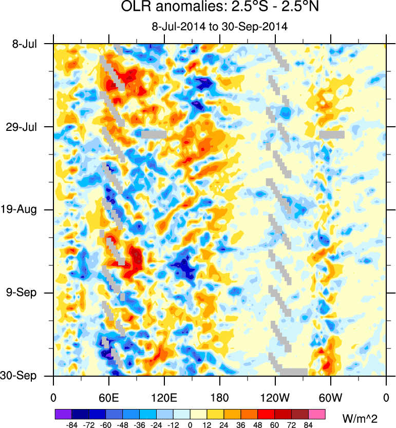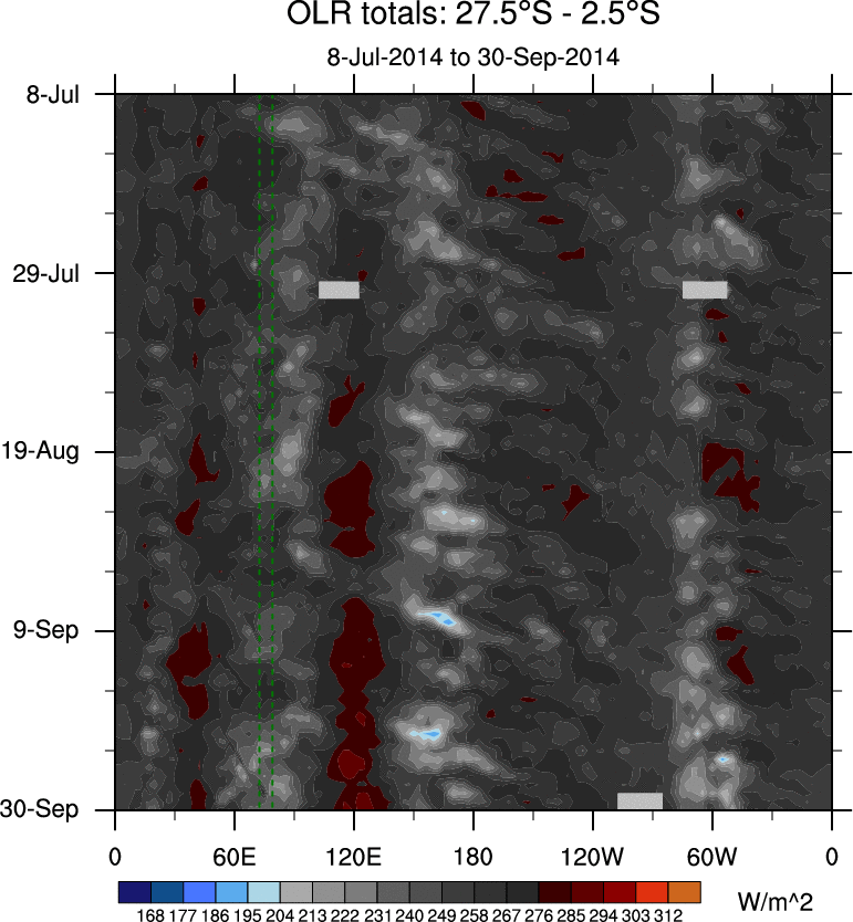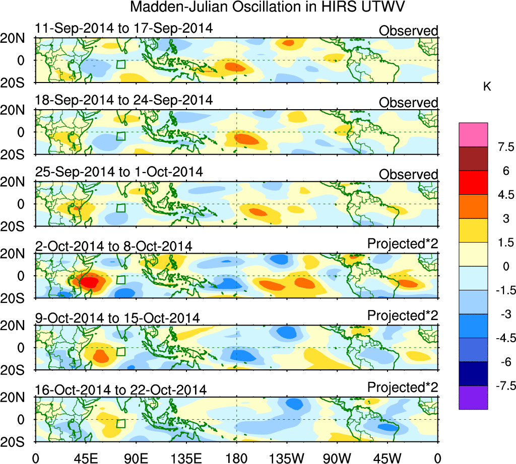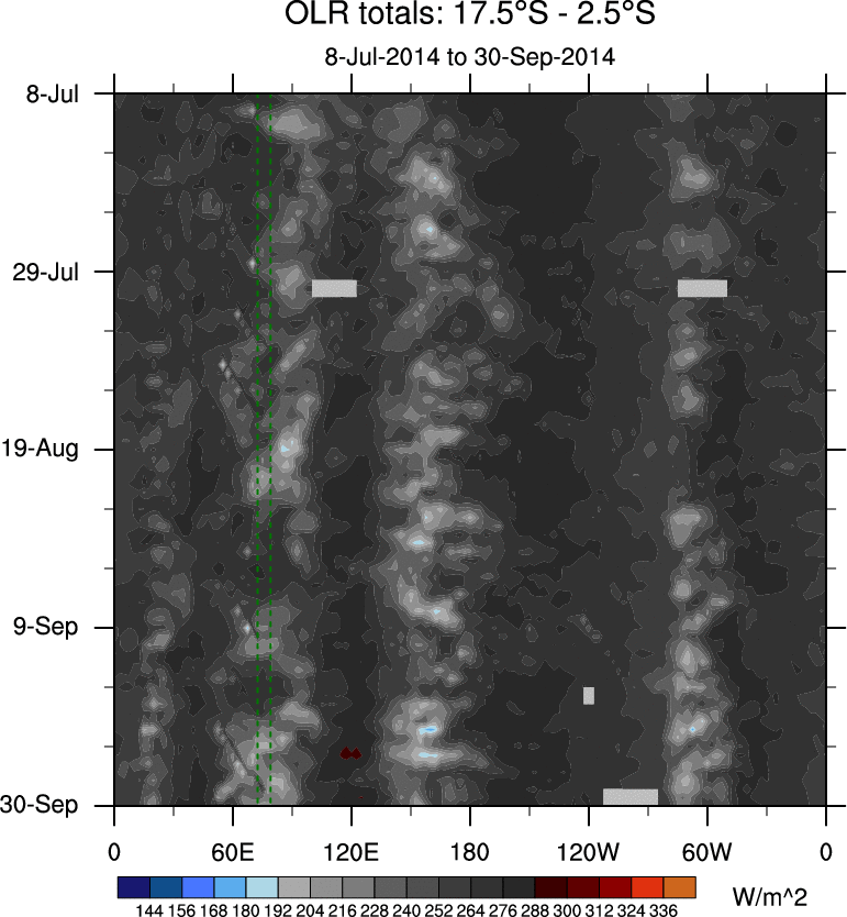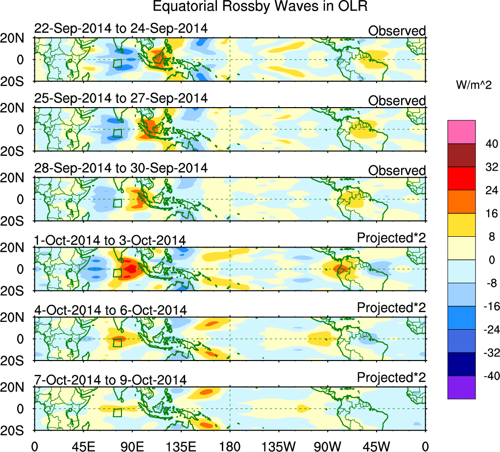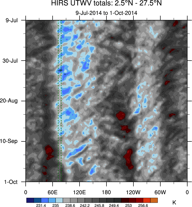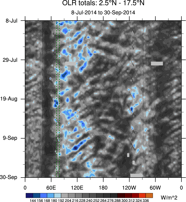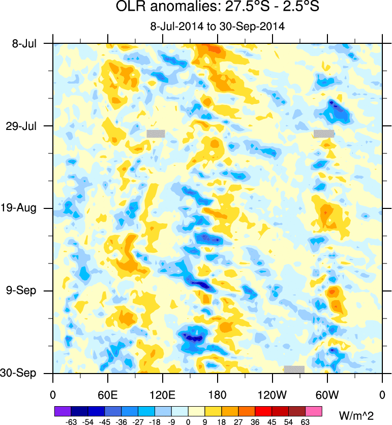 To identify tropical waves in near real-time, the OLR and UTWV data are filtered following Wheeler & Weickmann (2001 MWR). The daily anomalies are calculated using the first 3 harmonics of the seasonal cycle for 1979–2009. Missing values are then filled using linear interpolation in space and time. The most recent 365 days of anomalies are padded with 659 days of zeroes, and the result is filtered for each wave type.
