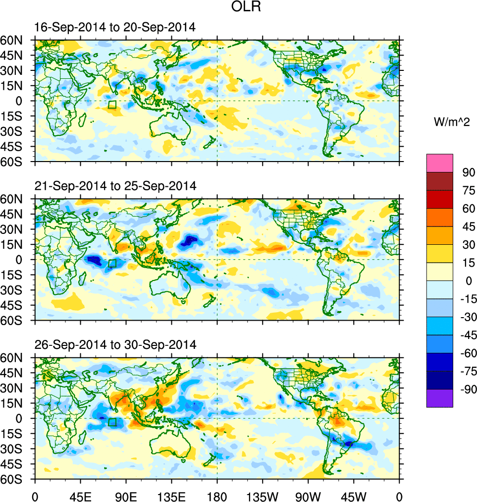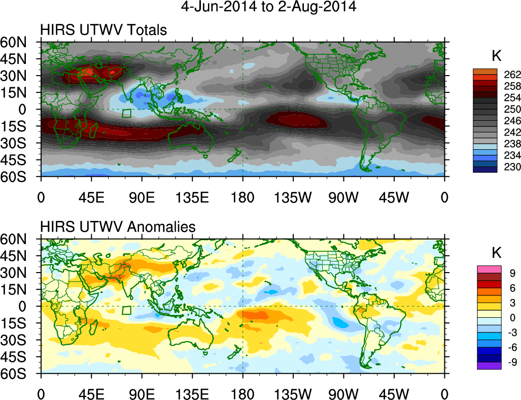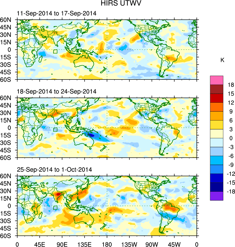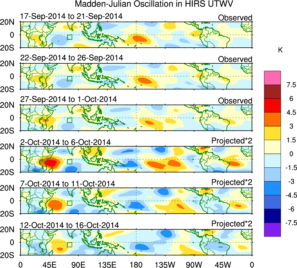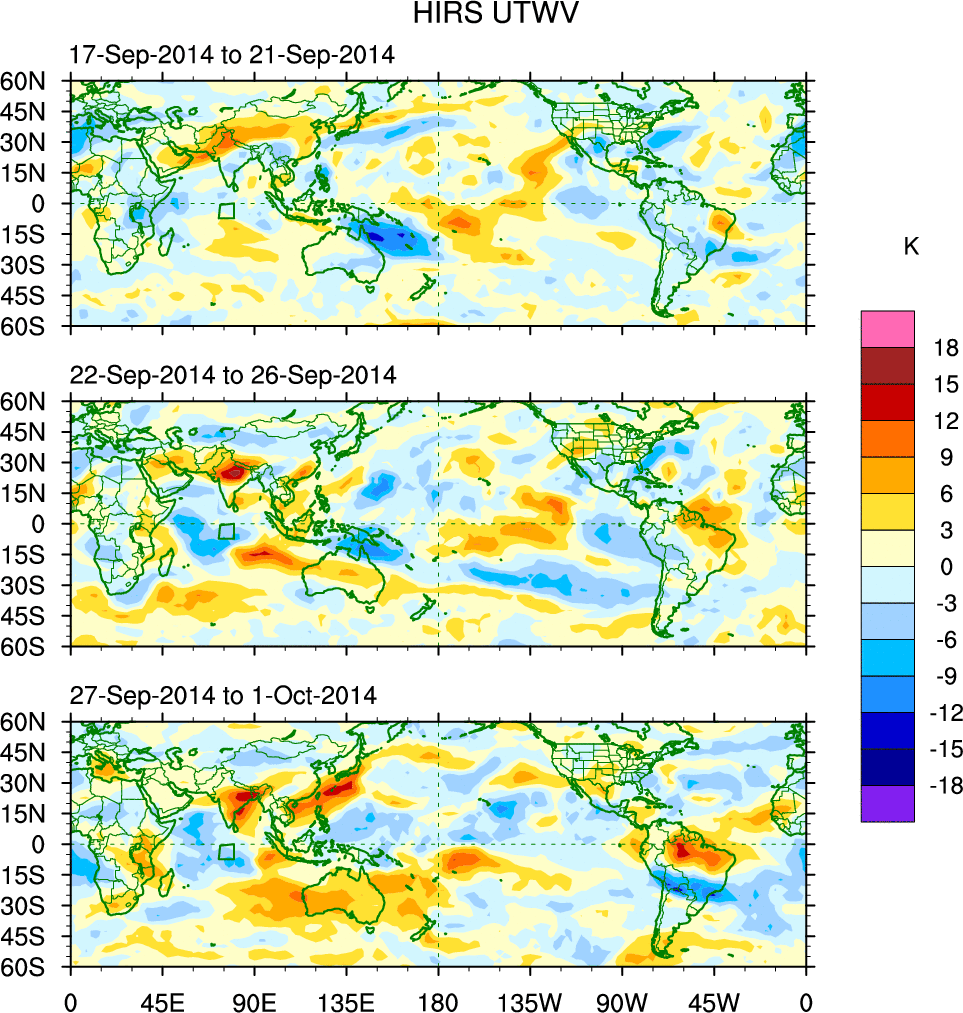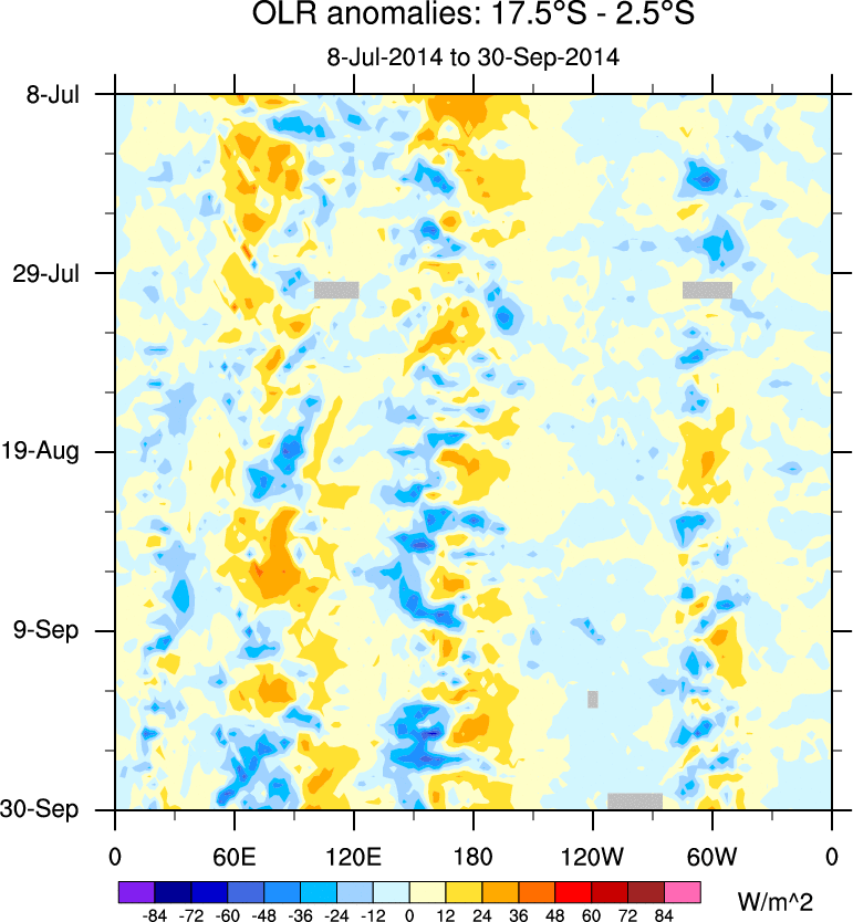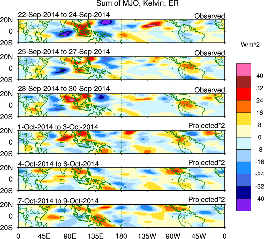 To identify tropical waves in near real-time, the OLR and UTWV data are filtered following Wheeler & Weickmann (2001 MWR). The daily anomalies are calculated using the first 3 harmonics of the seasonal cycle for 1979–2009. Missing values are then filled using linear interpolation in space and time. The most recent 365 days of anomalies are padded with 659 days of zeroes, and the result is filtered for each wave type.