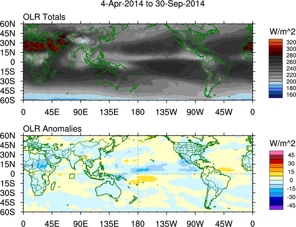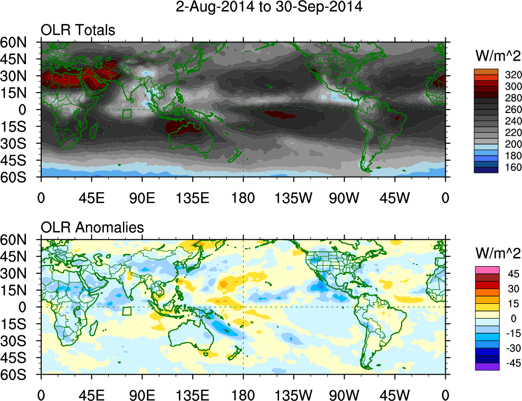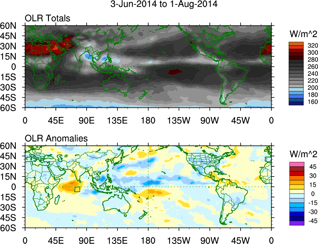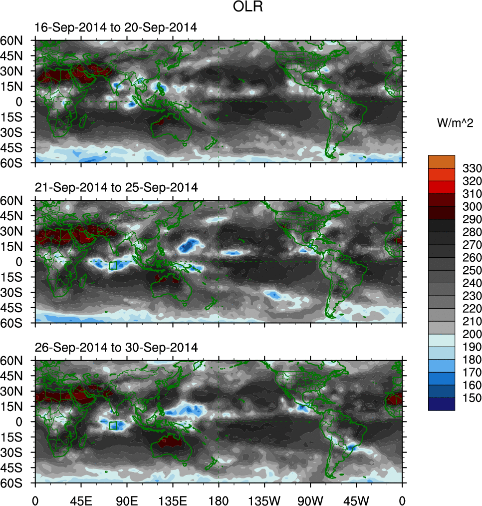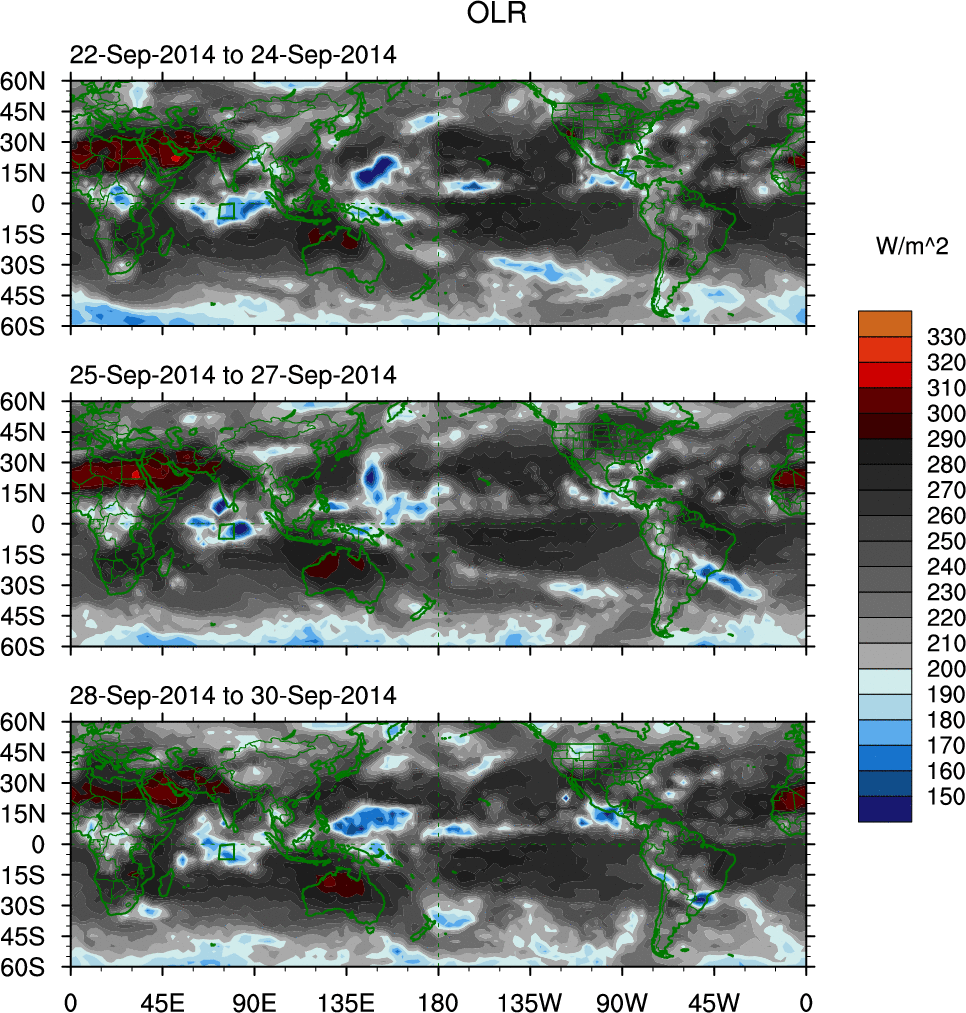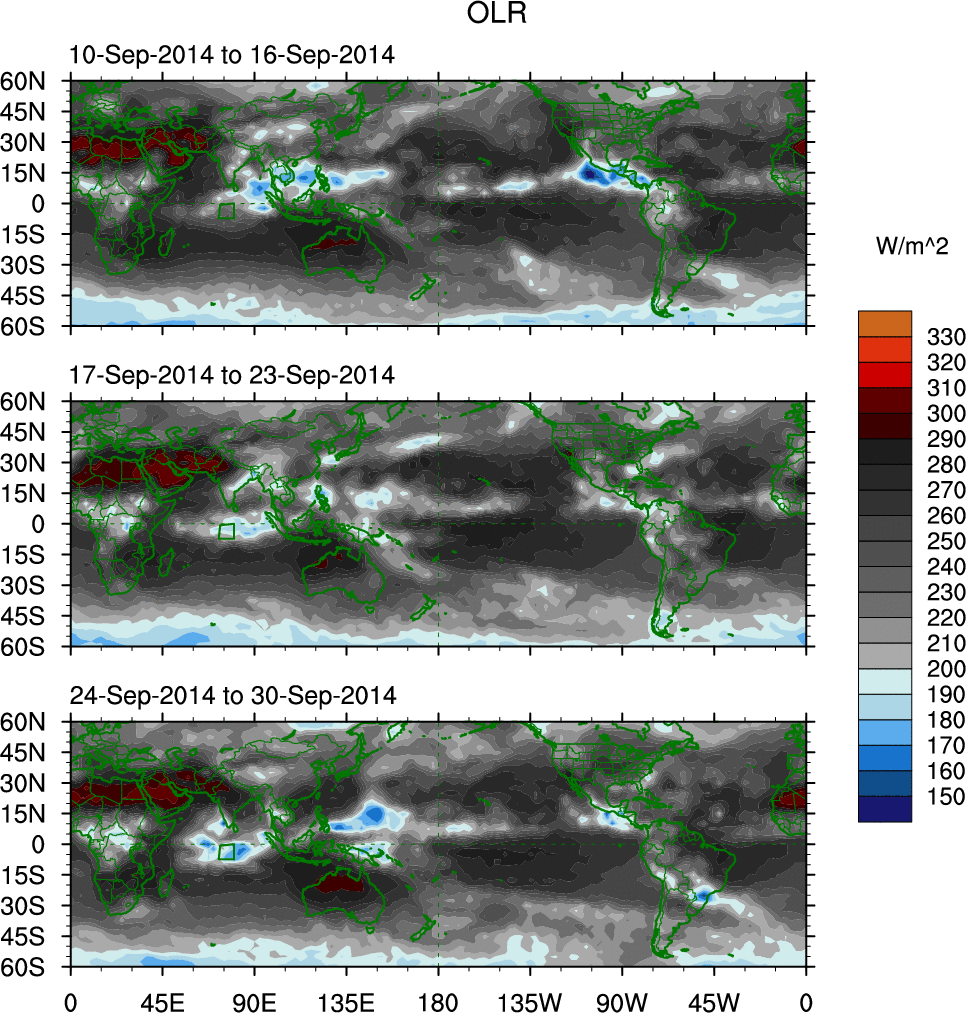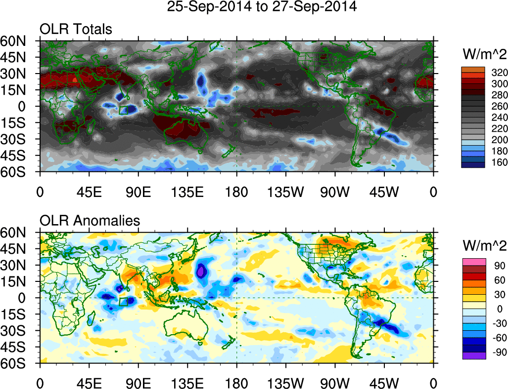 To identify tropical waves in near real-time, the OLR and UTWV data are filtered following Wheeler & Weickmann (2001 MWR). The daily anomalies are calculated using the first 3 harmonics of the seasonal cycle for 1979–2009. Missing values are then filled using linear interpolation in space and time. The most recent 365 days of anomalies are padded with 659 days of zeroes, and the result is filtered for each wave type.