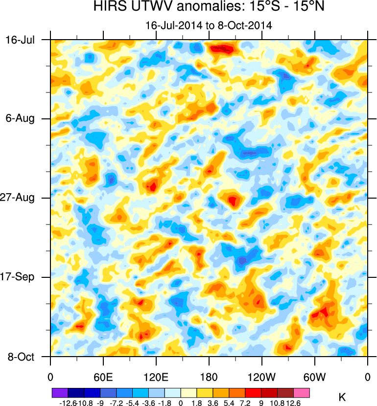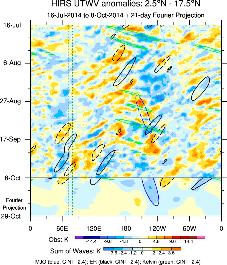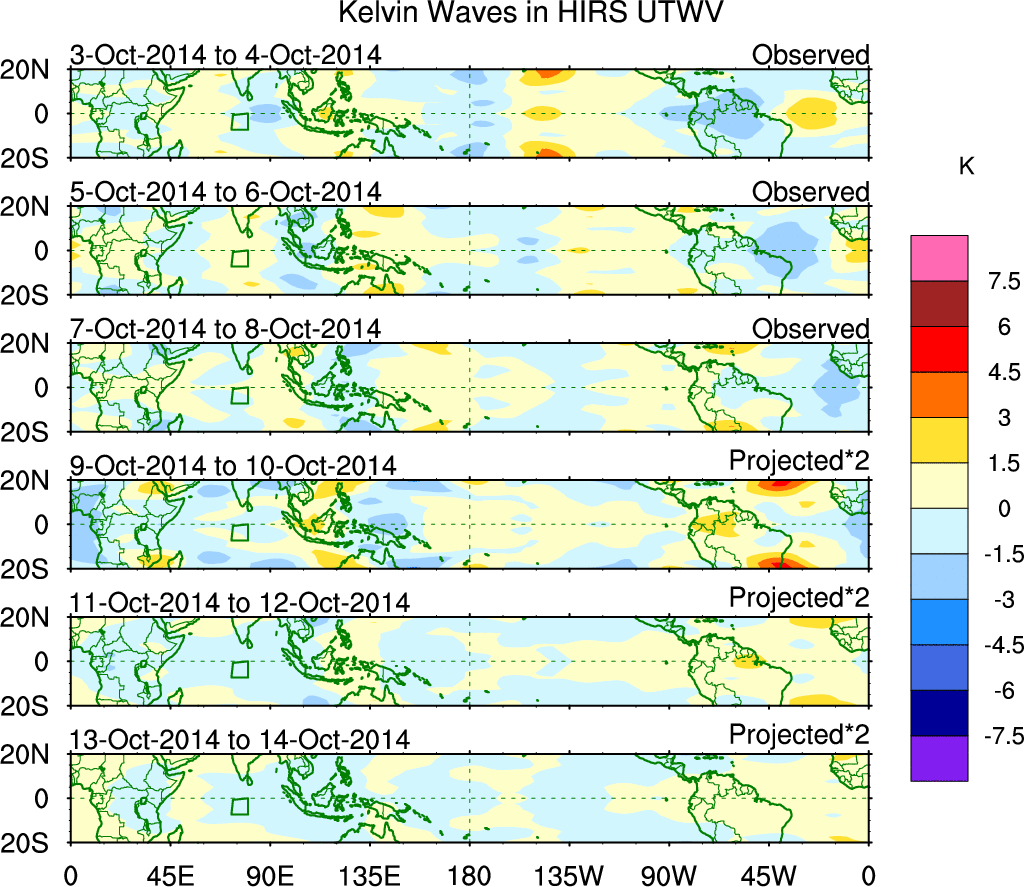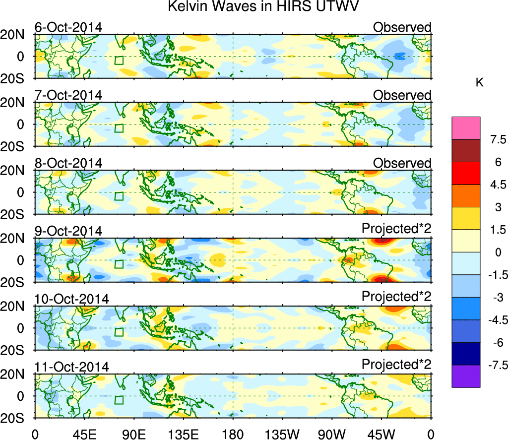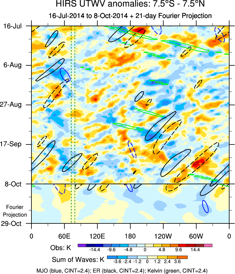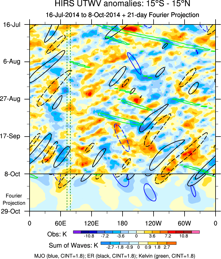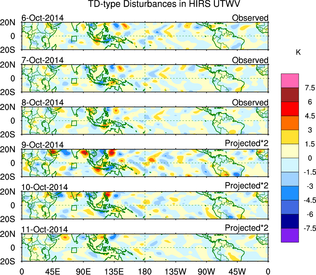 To identify tropical waves in near real-time, the OLR and UTWV data are filtered following Wheeler & Weickmann (2001 MWR). The daily anomalies are calculated using the first 3 harmonics of the seasonal cycle for 1979–2009. Missing values are then filled using linear interpolation in space and time. The most recent 365 days of anomalies are padded with 659 days of zeroes, and the result is filtered for each wave type.