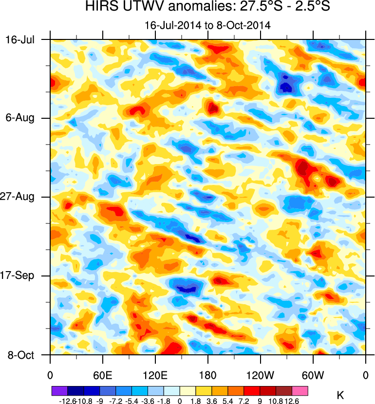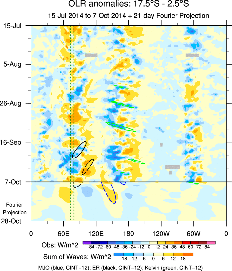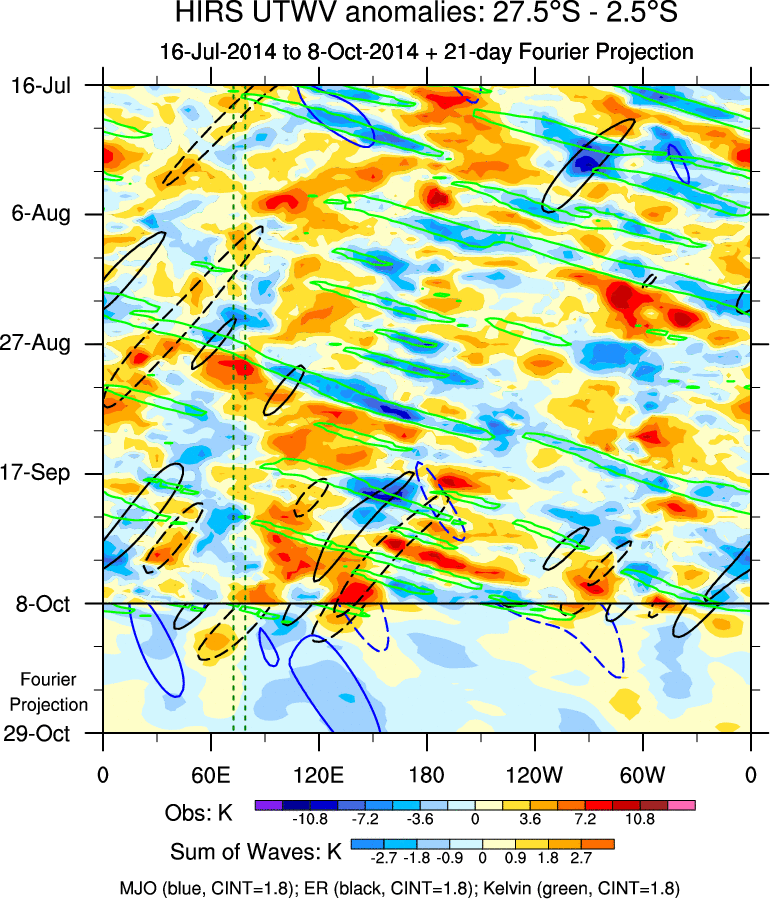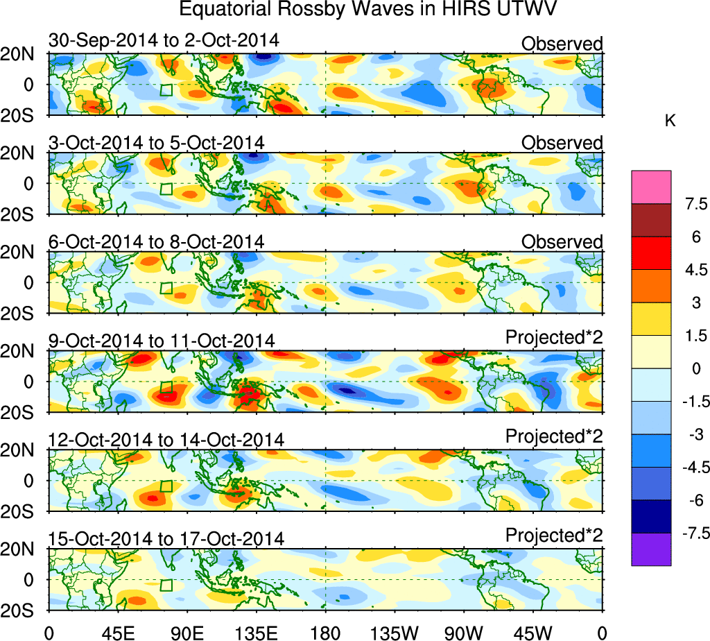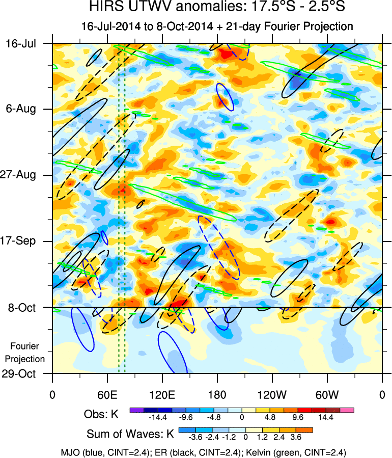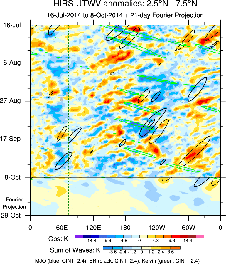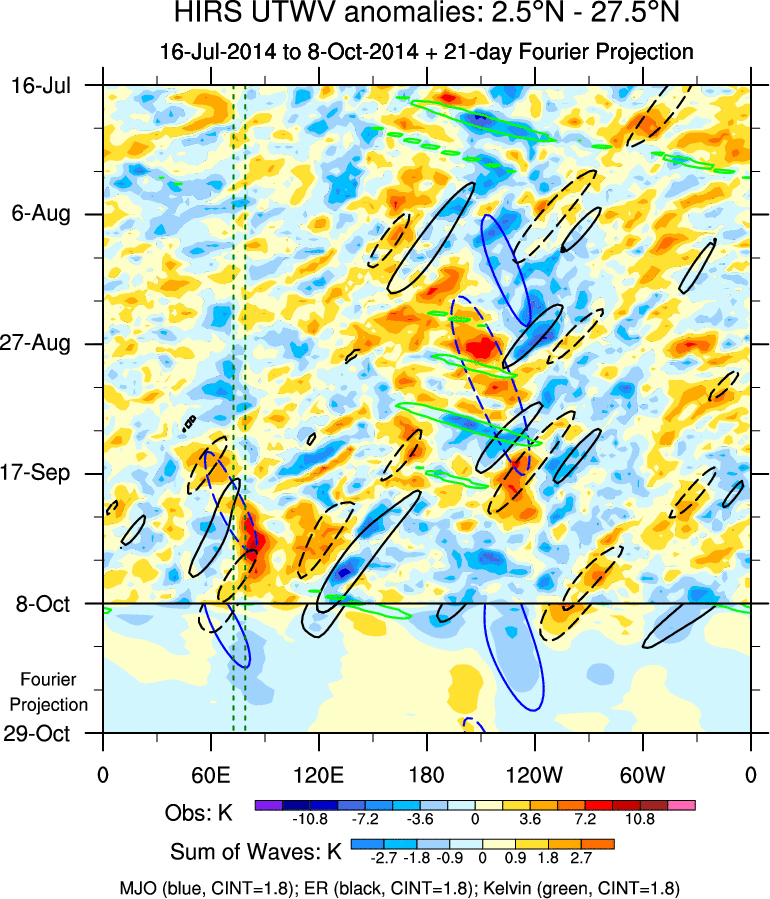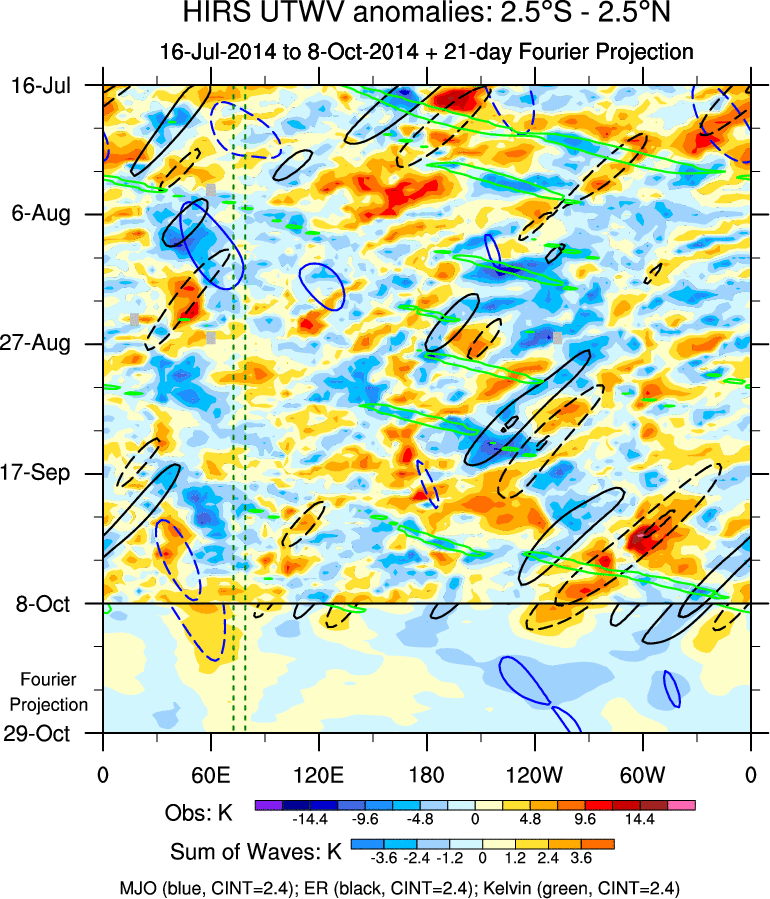 To identify tropical waves in near real-time, the OLR and UTWV data are filtered following Wheeler & Weickmann (2001 MWR). The daily anomalies are calculated using the first 3 harmonics of the seasonal cycle for 1979–2009. Missing values are then filled using linear interpolation in space and time. The most recent 365 days of anomalies are padded with 659 days of zeroes, and the result is filtered for each wave type.