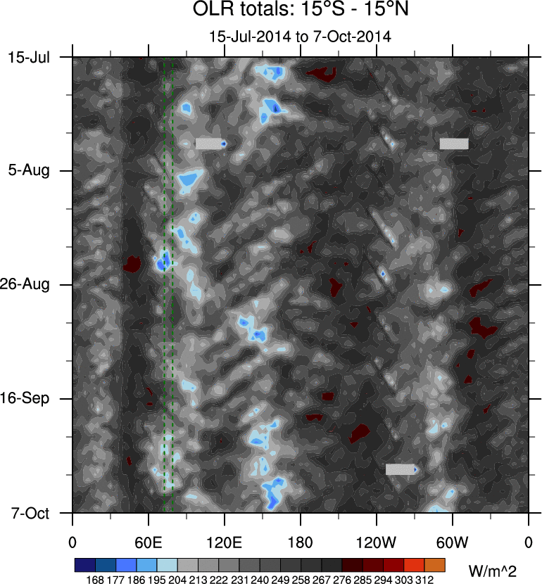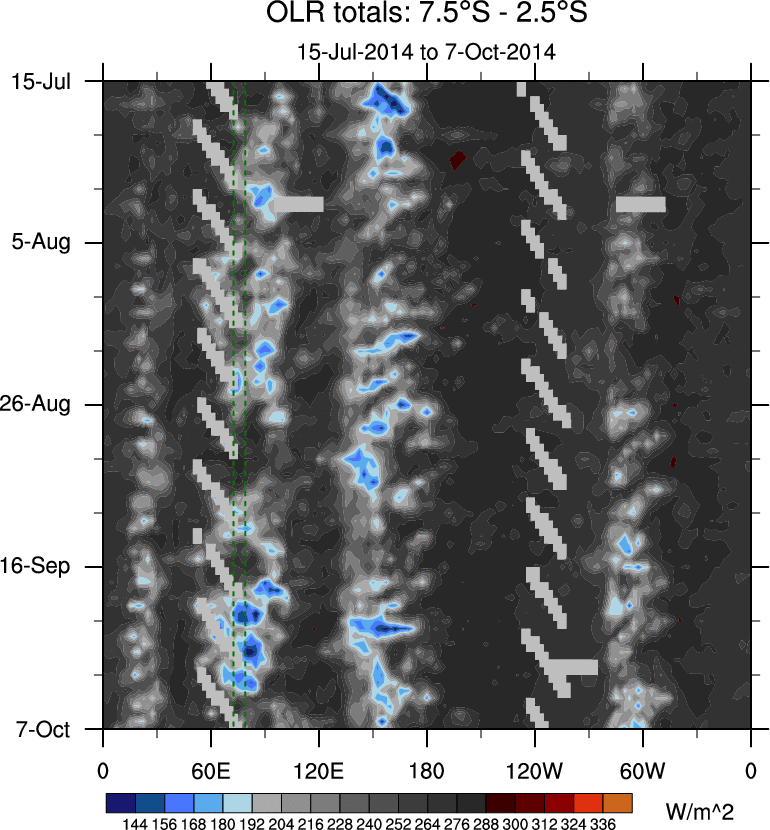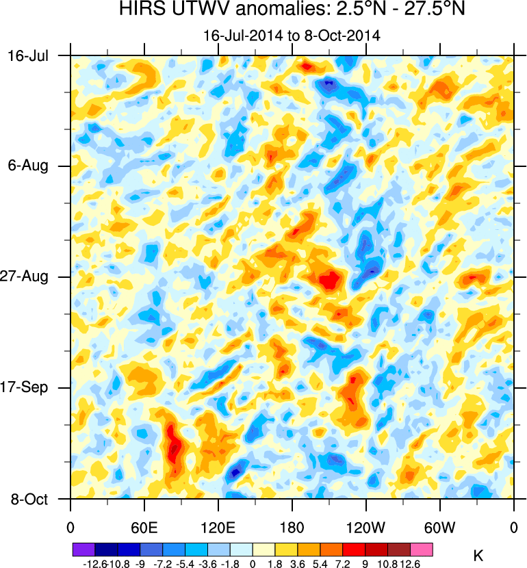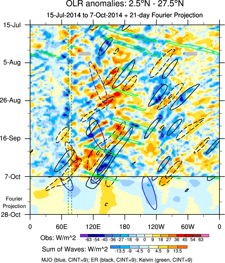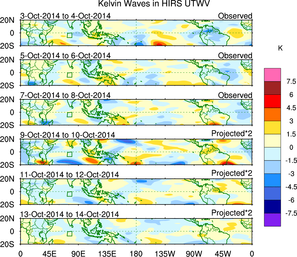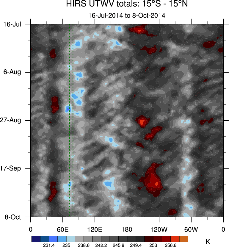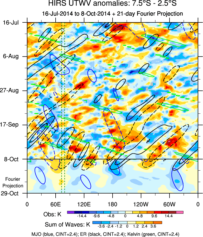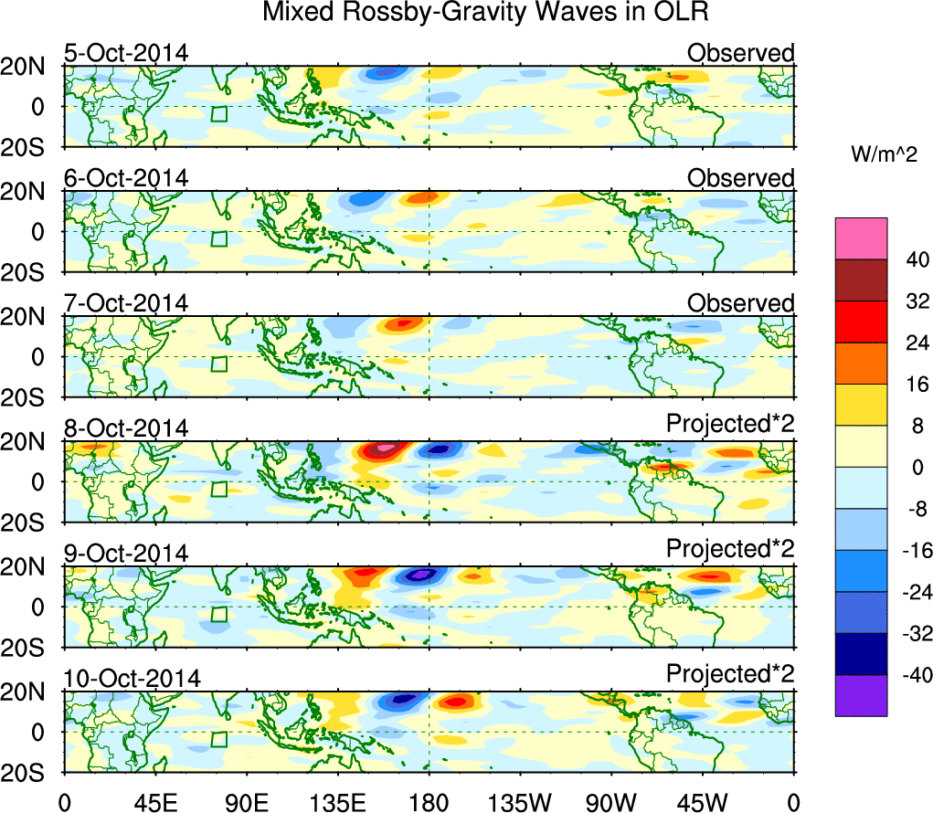 To identify tropical waves in near real-time, the OLR and UTWV data are filtered following Wheeler & Weickmann (2001 MWR). The daily anomalies are calculated using the first 3 harmonics of the seasonal cycle for 1979–2009. Missing values are then filled using linear interpolation in space and time. The most recent 365 days of anomalies are padded with 659 days of zeroes, and the result is filtered for each wave type.