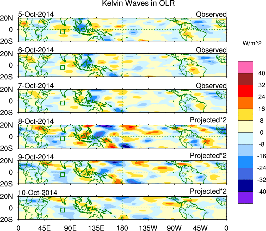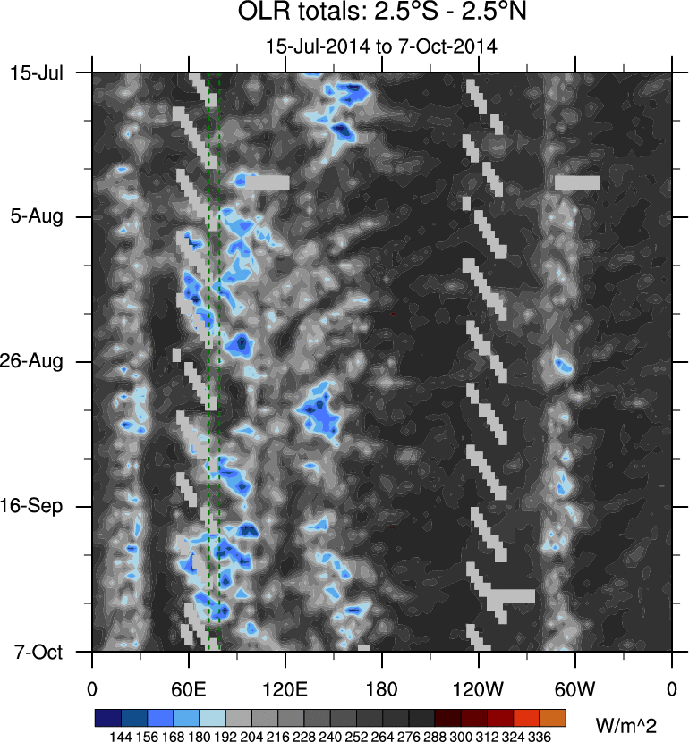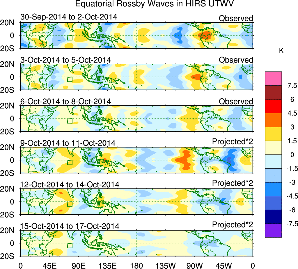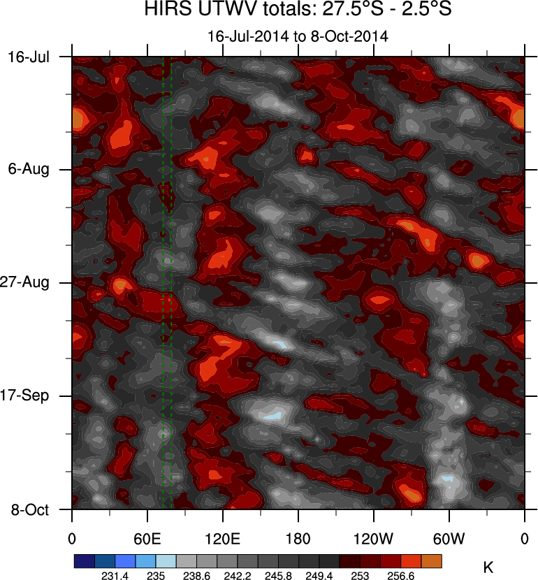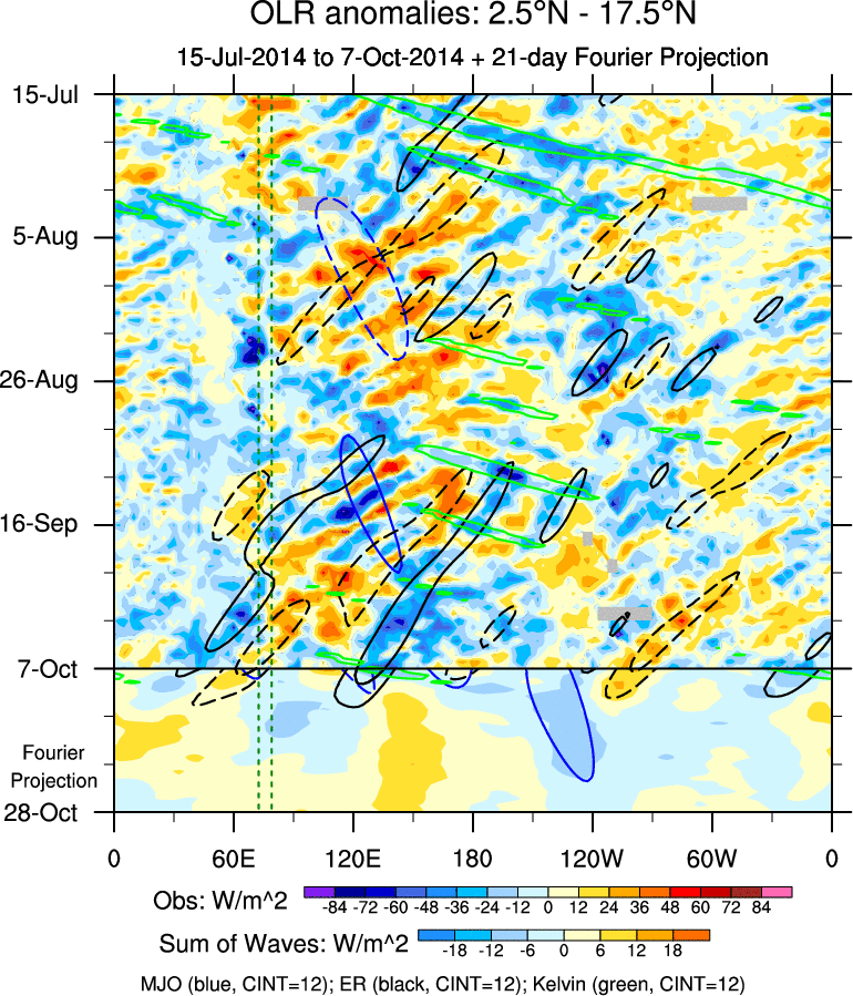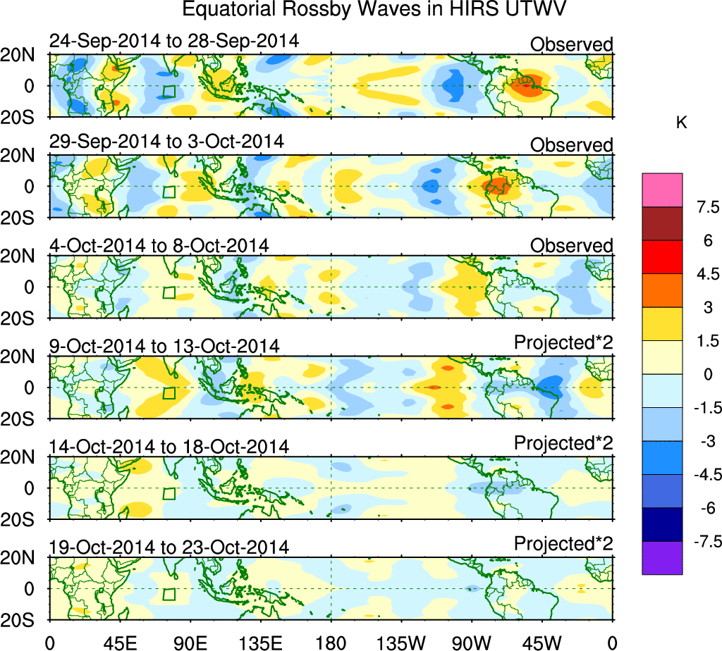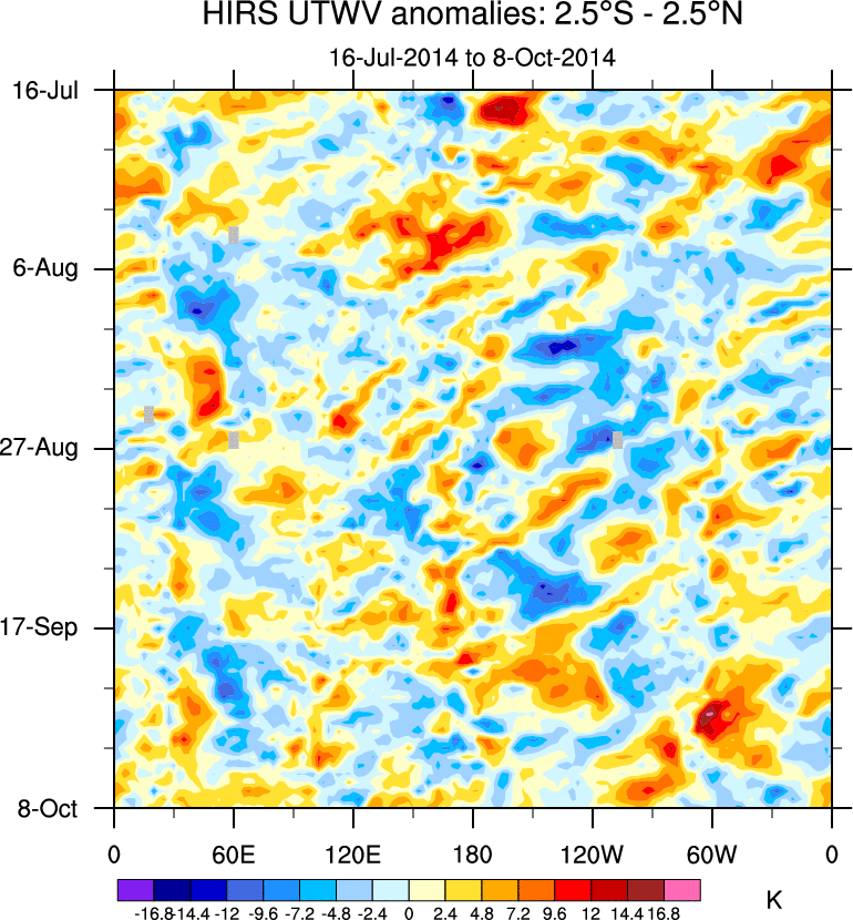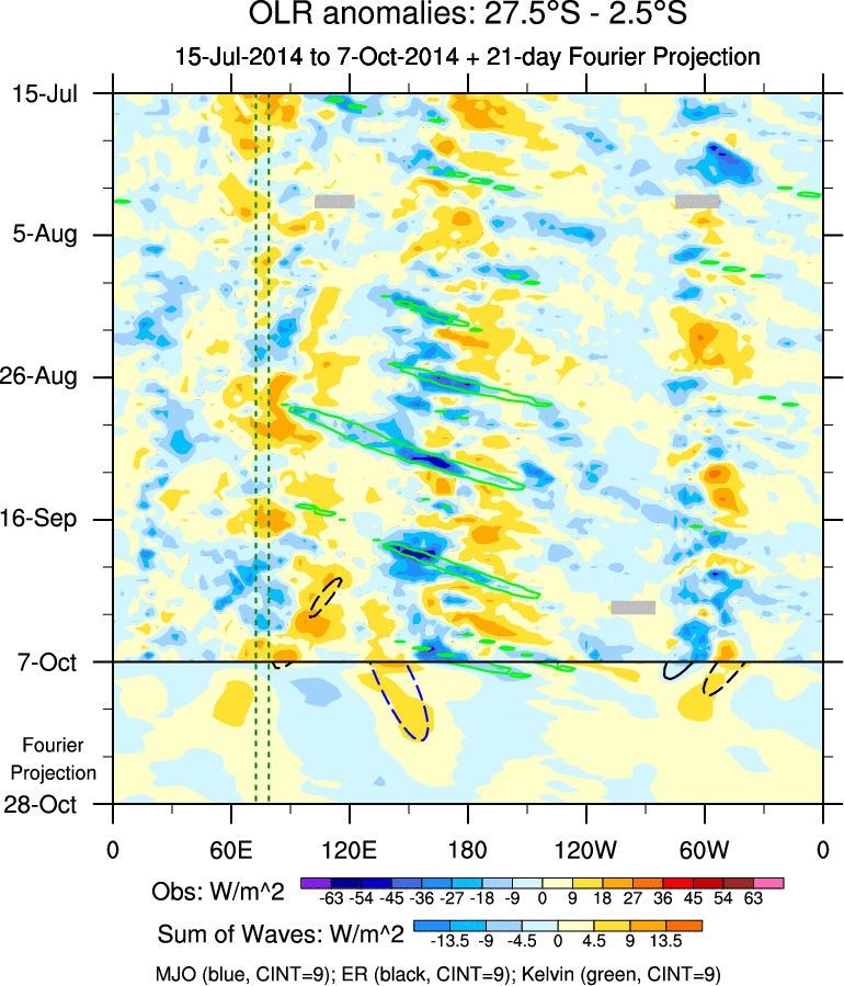 To identify tropical waves in near real-time, the OLR and UTWV data are filtered following Wheeler & Weickmann (2001 MWR). The daily anomalies are calculated using the first 3 harmonics of the seasonal cycle for 1979–2009. Missing values are then filled using linear interpolation in space and time. The most recent 365 days of anomalies are padded with 659 days of zeroes, and the result is filtered for each wave type.