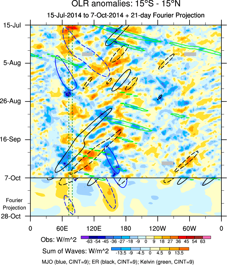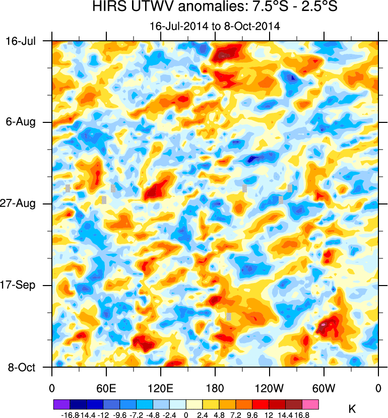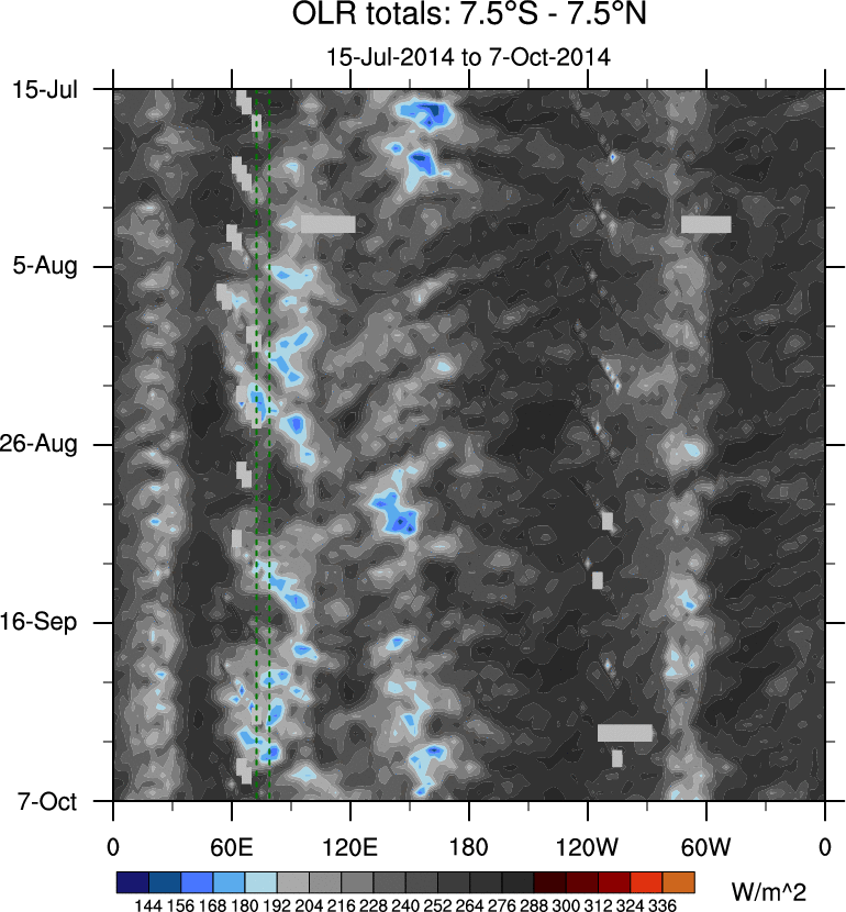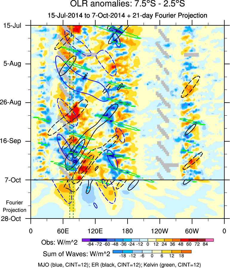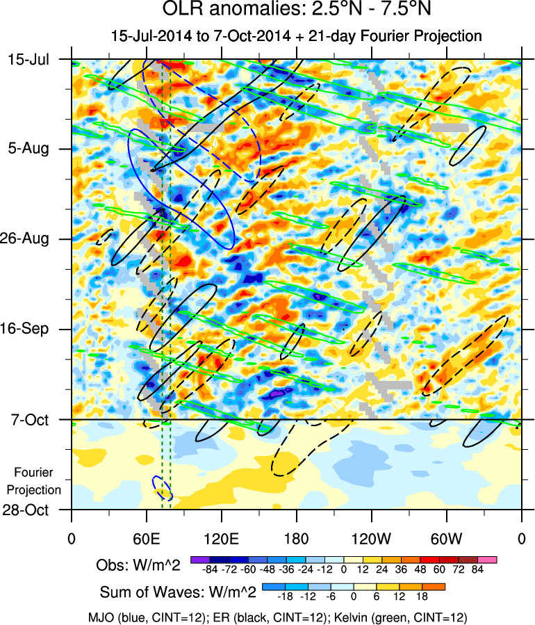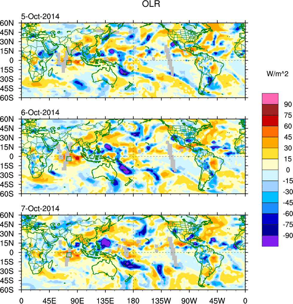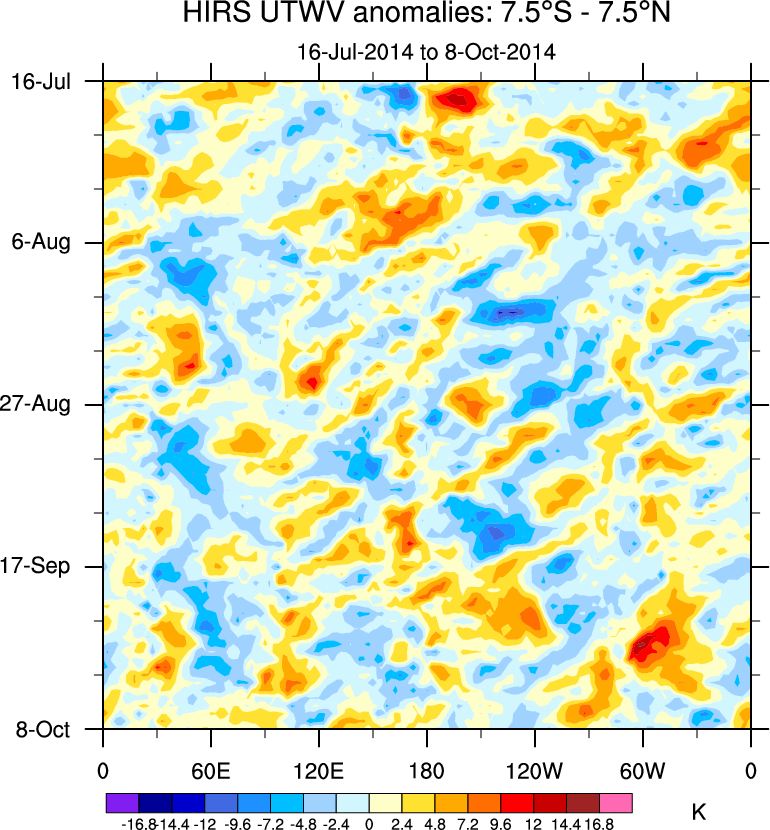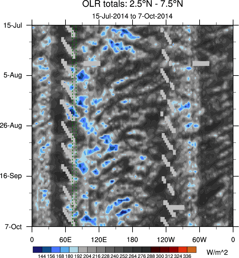 To identify tropical waves in near real-time, the OLR and UTWV data are filtered following Wheeler & Weickmann (2001 MWR). The daily anomalies are calculated using the first 3 harmonics of the seasonal cycle for 1979–2009. Missing values are then filled using linear interpolation in space and time. The most recent 365 days of anomalies are padded with 659 days of zeroes, and the result is filtered for each wave type.