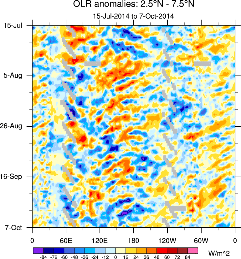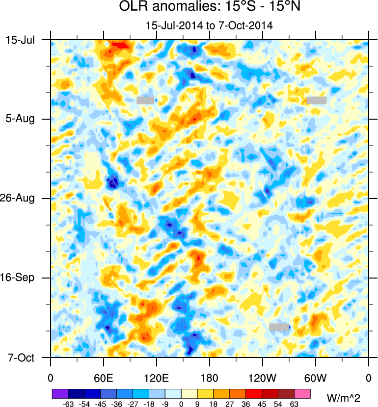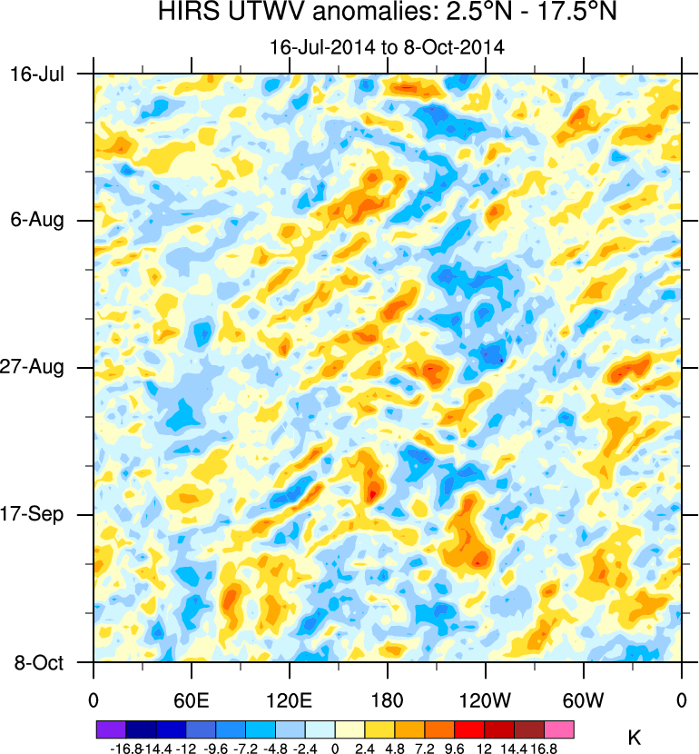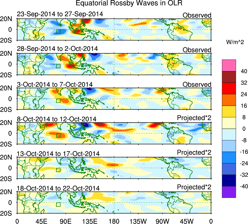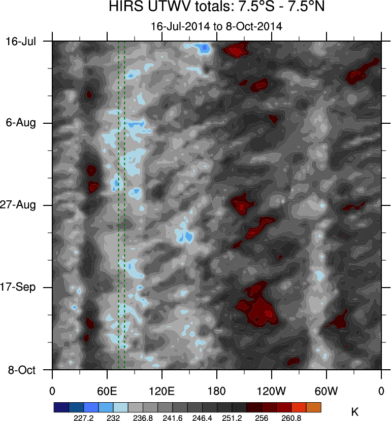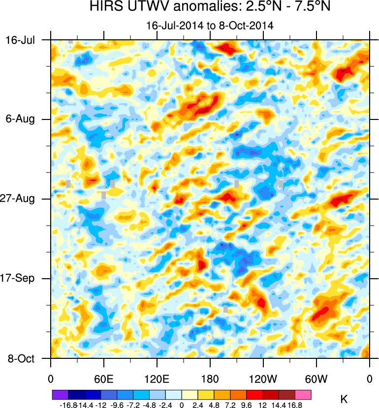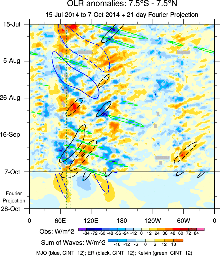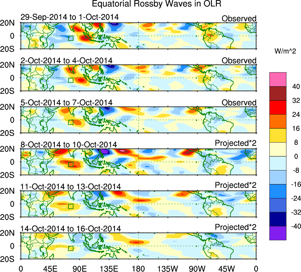 To identify tropical waves in near real-time, the OLR and UTWV data are filtered following Wheeler & Weickmann (2001 MWR). The daily anomalies are calculated using the first 3 harmonics of the seasonal cycle for 1979–2009. Missing values are then filled using linear interpolation in space and time. The most recent 365 days of anomalies are padded with 659 days of zeroes, and the result is filtered for each wave type.