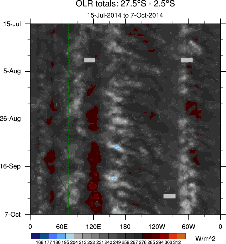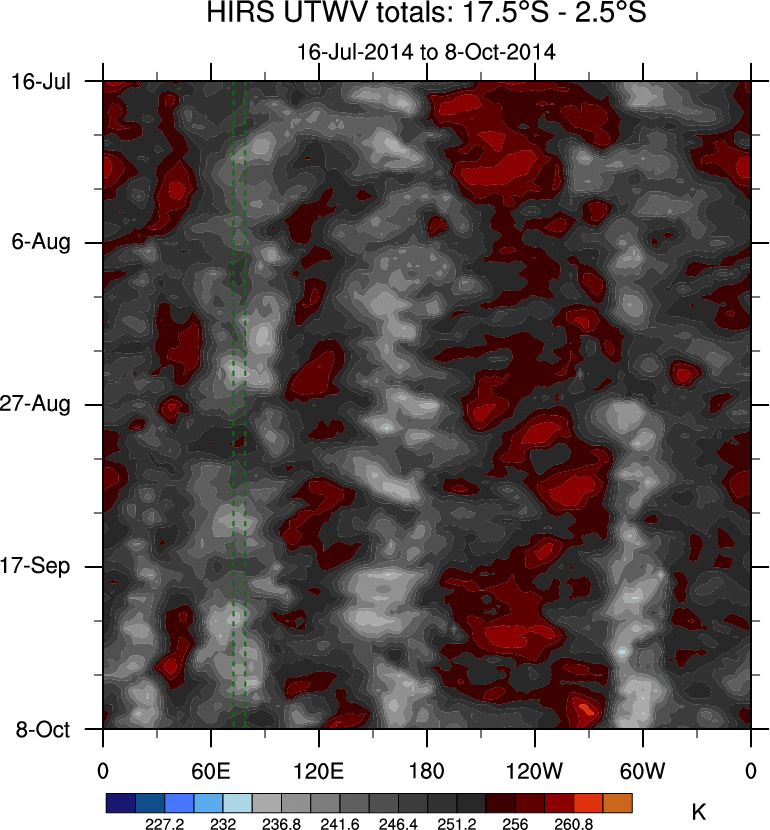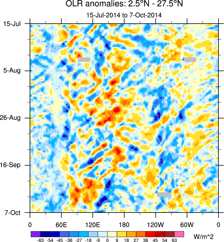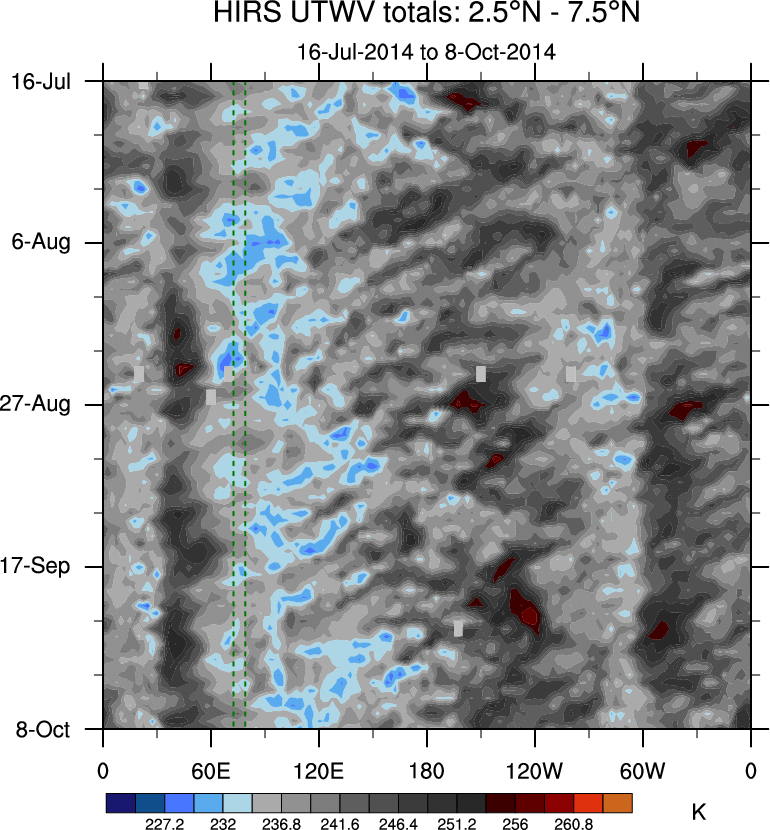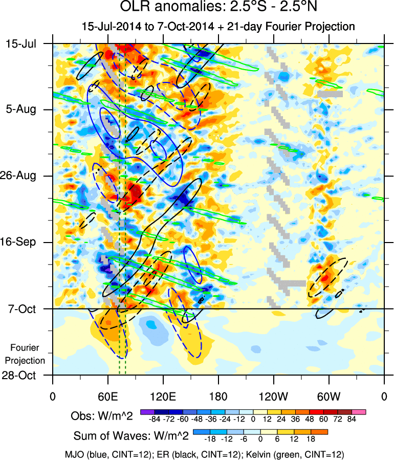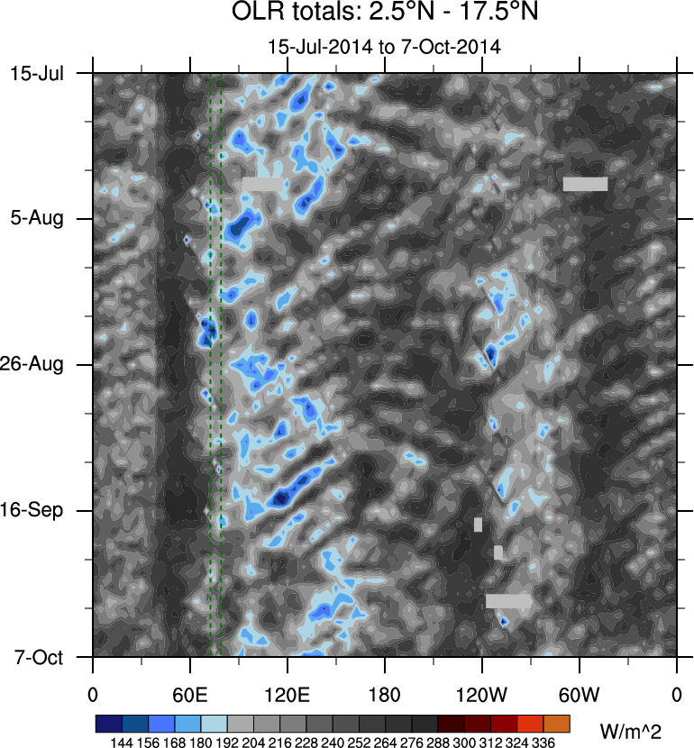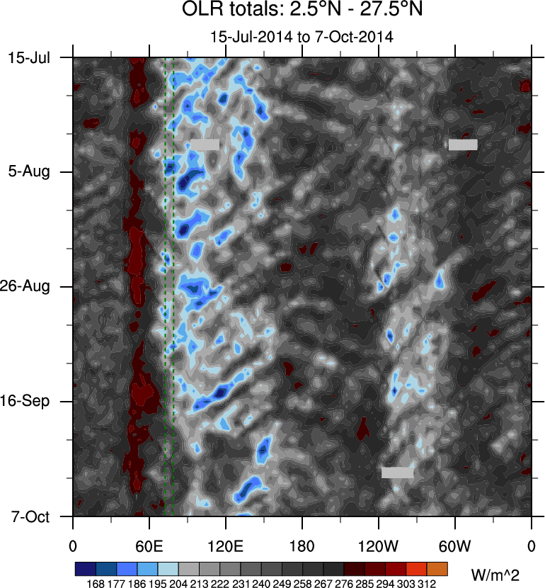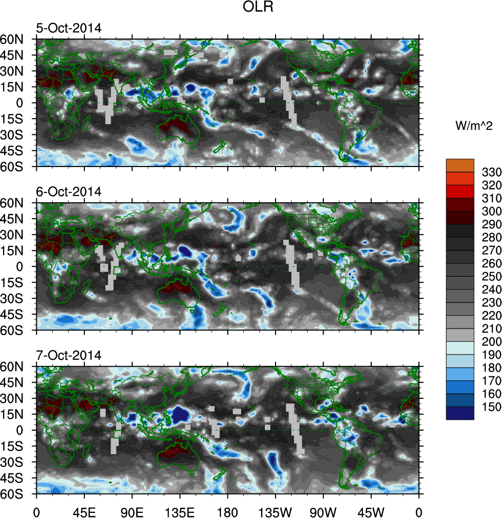 To identify tropical waves in near real-time, the OLR and UTWV data are filtered following Wheeler & Weickmann (2001 MWR). The daily anomalies are calculated using the first 3 harmonics of the seasonal cycle for 1979–2009. Missing values are then filled using linear interpolation in space and time. The most recent 365 days of anomalies are padded with 659 days of zeroes, and the result is filtered for each wave type.