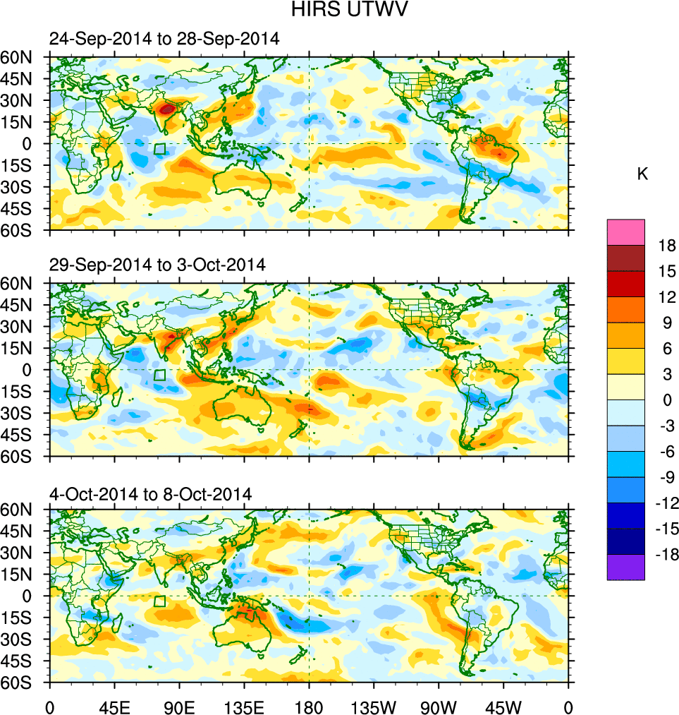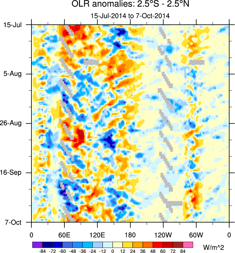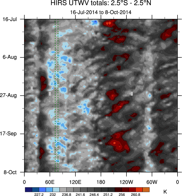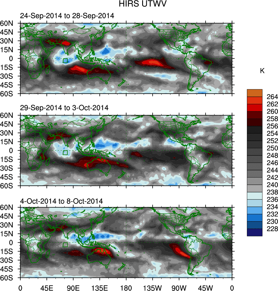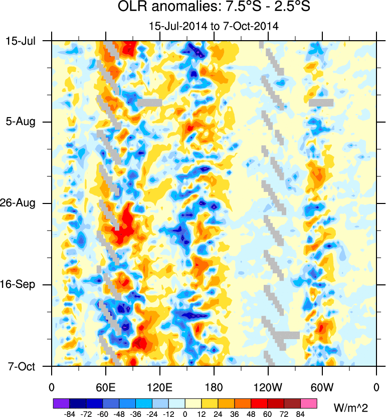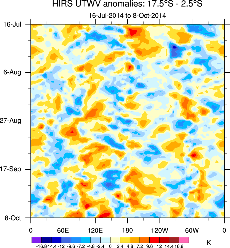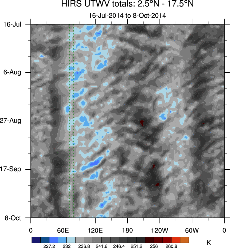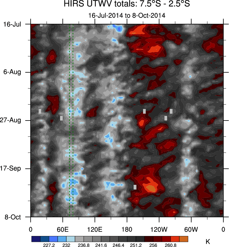 To identify tropical waves in near real-time, the OLR and UTWV data are filtered following Wheeler & Weickmann (2001 MWR). The daily anomalies are calculated using the first 3 harmonics of the seasonal cycle for 1979–2009. Missing values are then filled using linear interpolation in space and time. The most recent 365 days of anomalies are padded with 659 days of zeroes, and the result is filtered for each wave type.