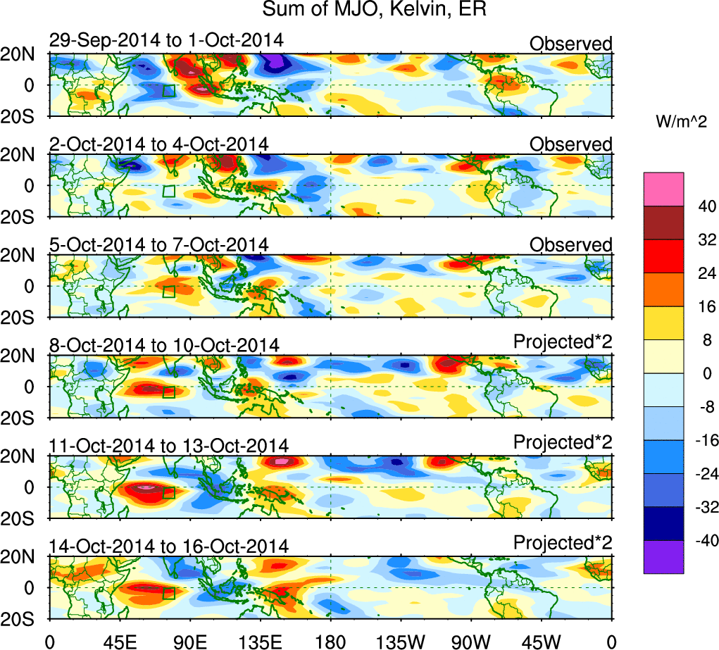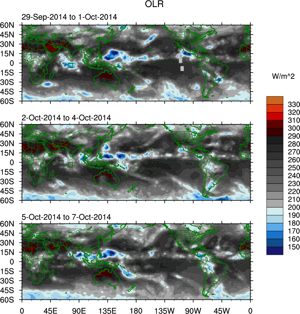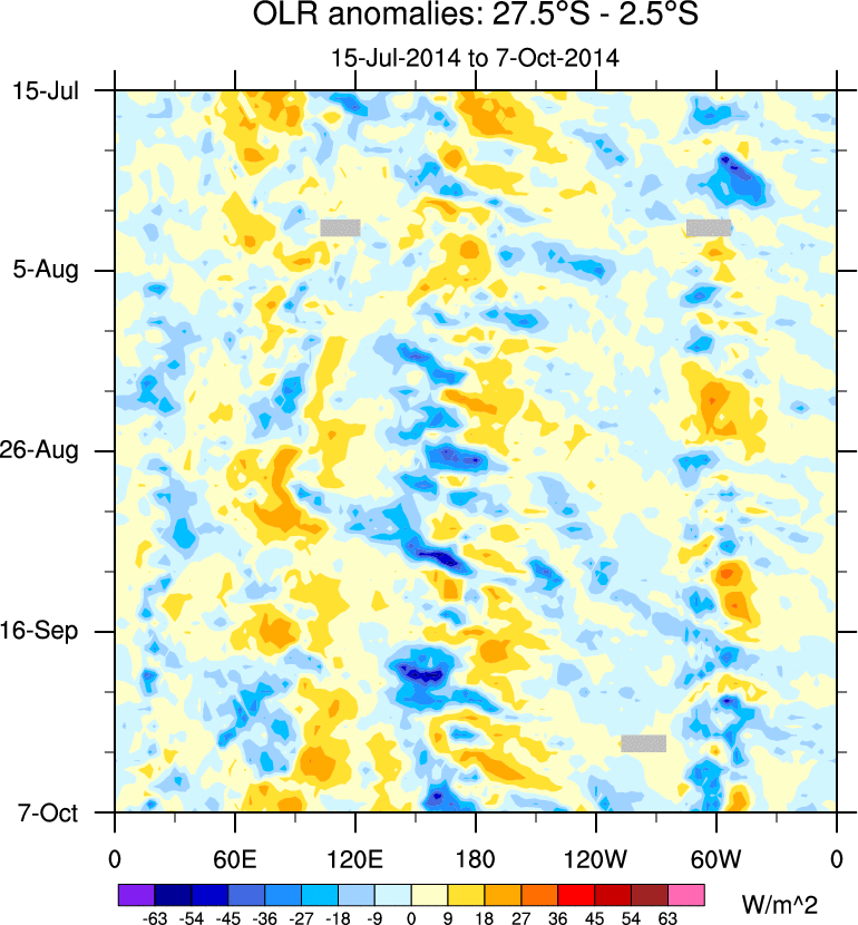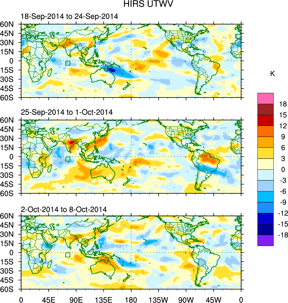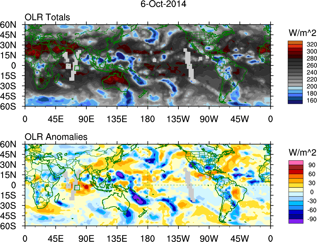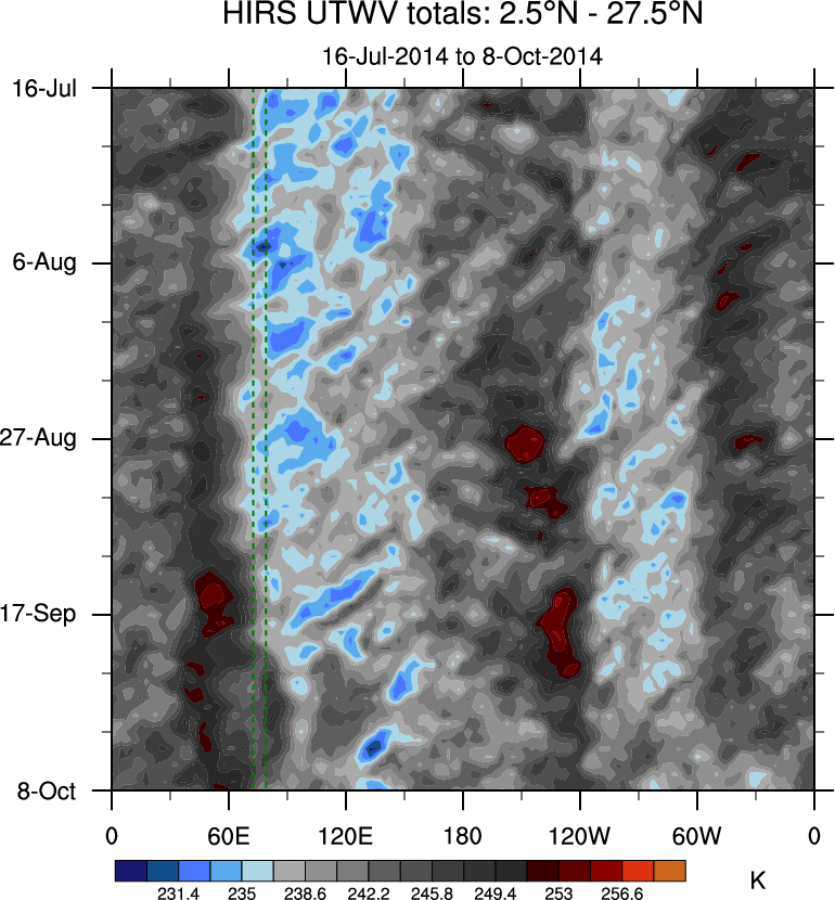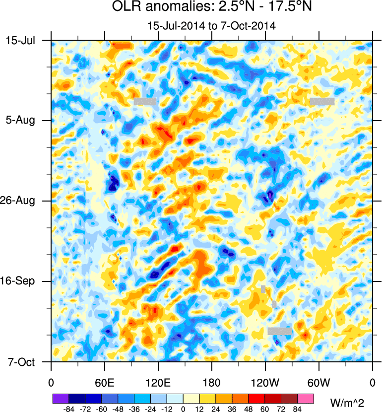 To identify tropical waves in near real-time, the OLR and UTWV data are filtered following Wheeler & Weickmann (2001 MWR). The daily anomalies are calculated using the first 3 harmonics of the seasonal cycle for 1979–2009. Missing values are then filled using linear interpolation in space and time. The most recent 365 days of anomalies are padded with 659 days of zeroes, and the result is filtered for each wave type.