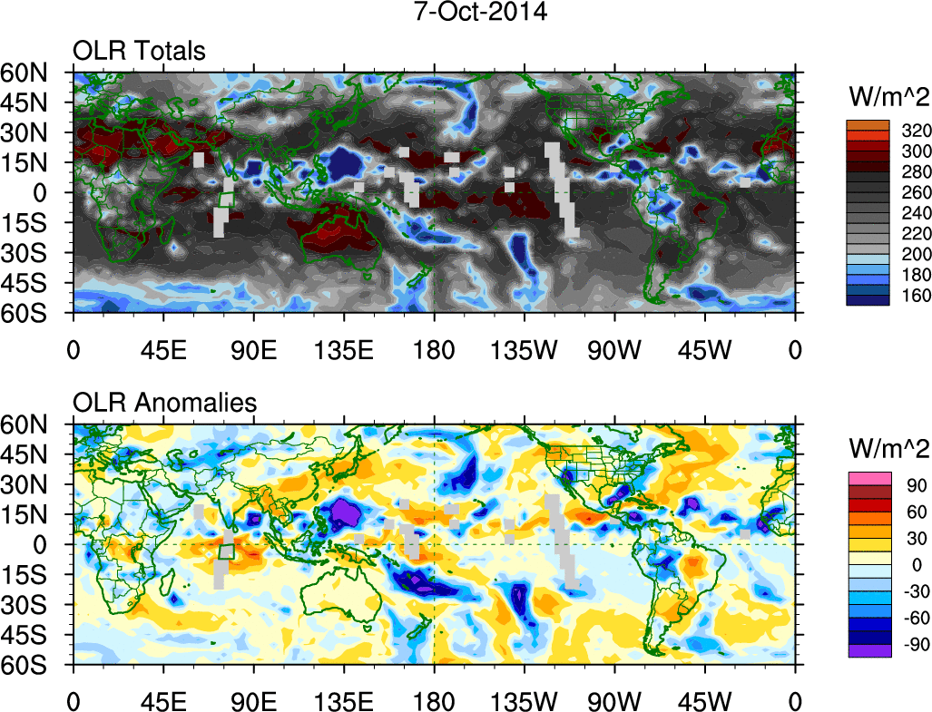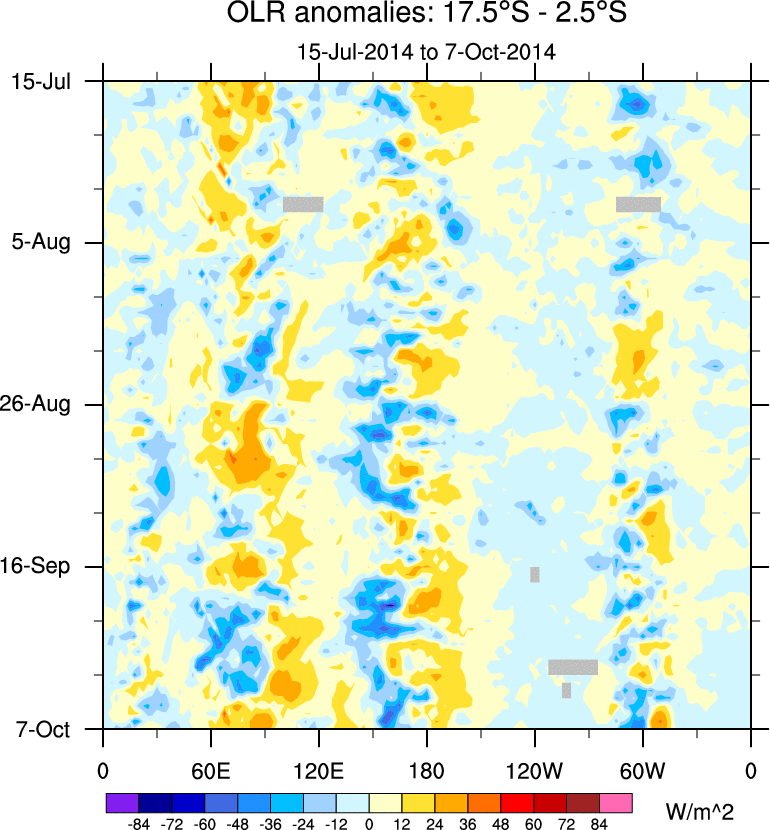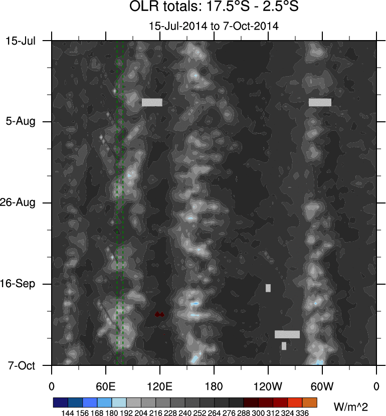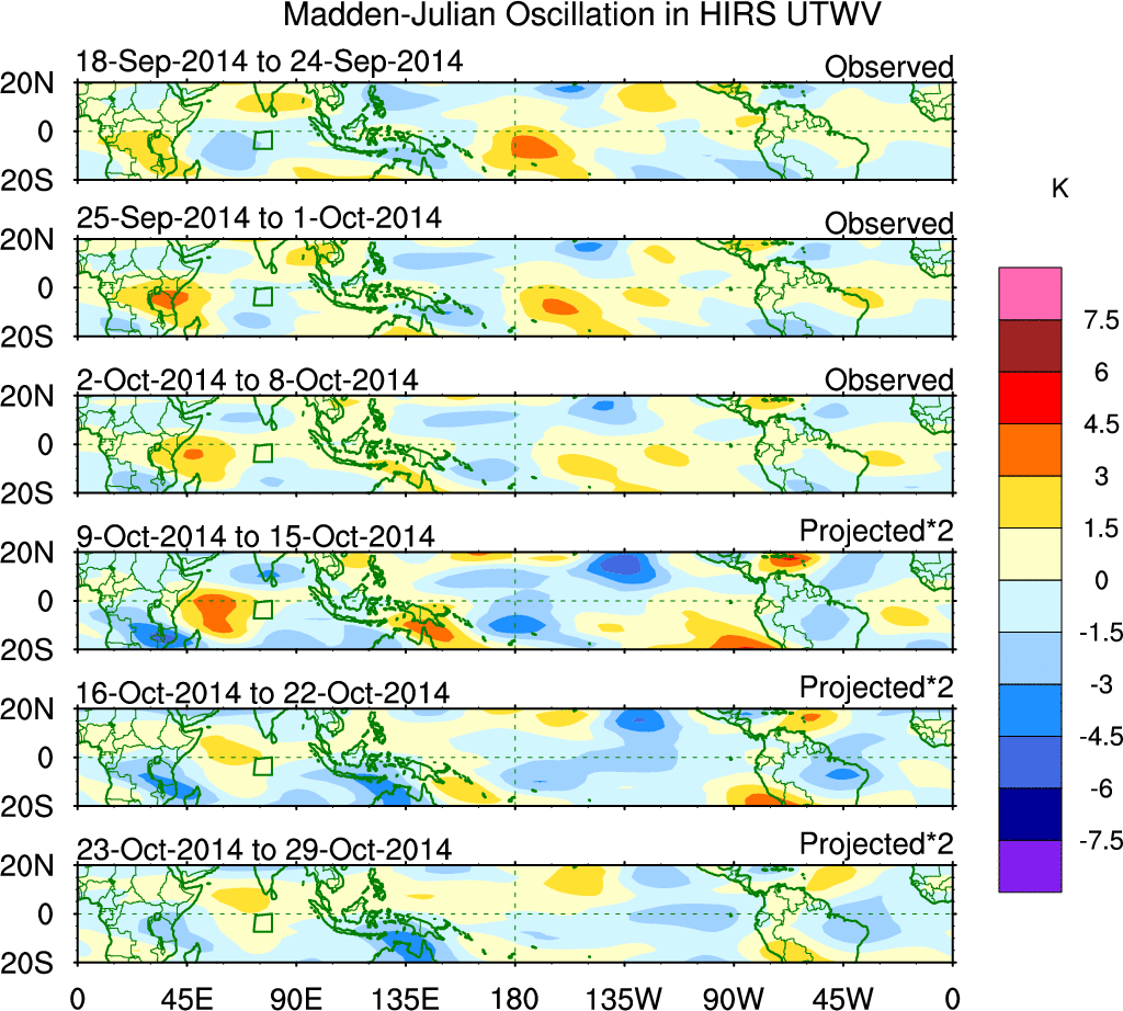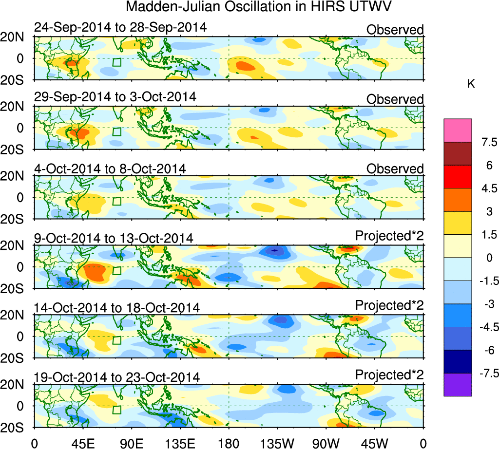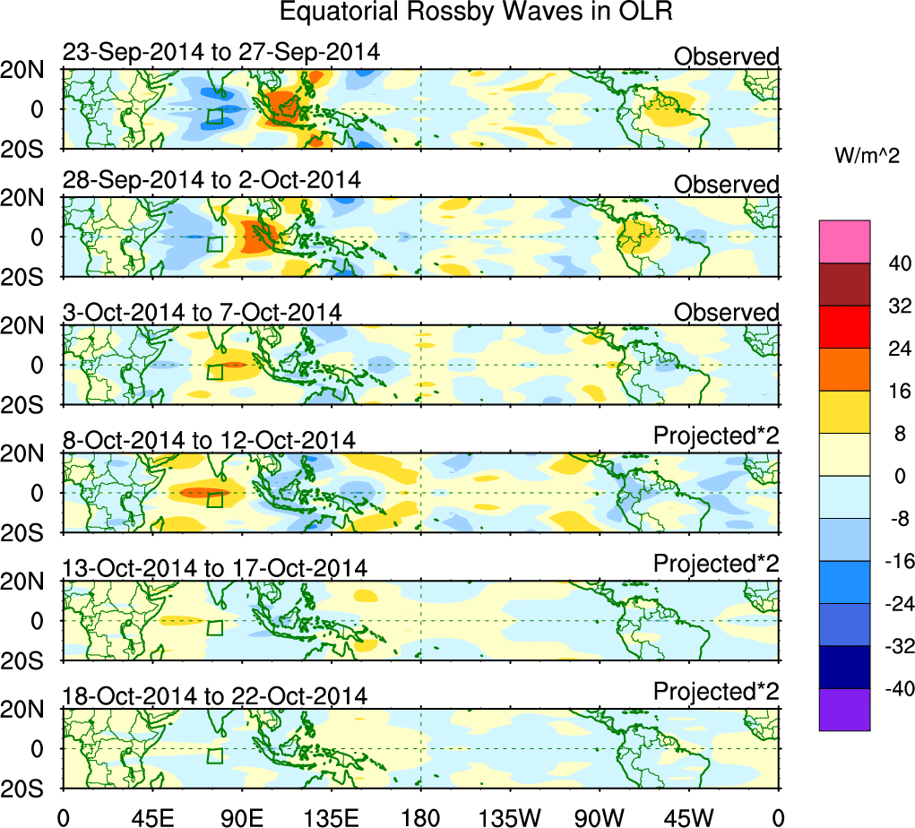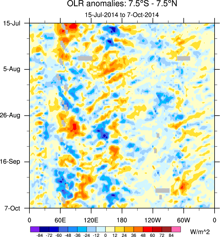 To identify tropical waves in near real-time, the OLR and UTWV data are filtered following Wheeler & Weickmann (2001 MWR). The daily anomalies are calculated using the first 3 harmonics of the seasonal cycle for 1979–2009. Missing values are then filled using linear interpolation in space and time. The most recent 365 days of anomalies are padded with 659 days of zeroes, and the result is filtered for each wave type.