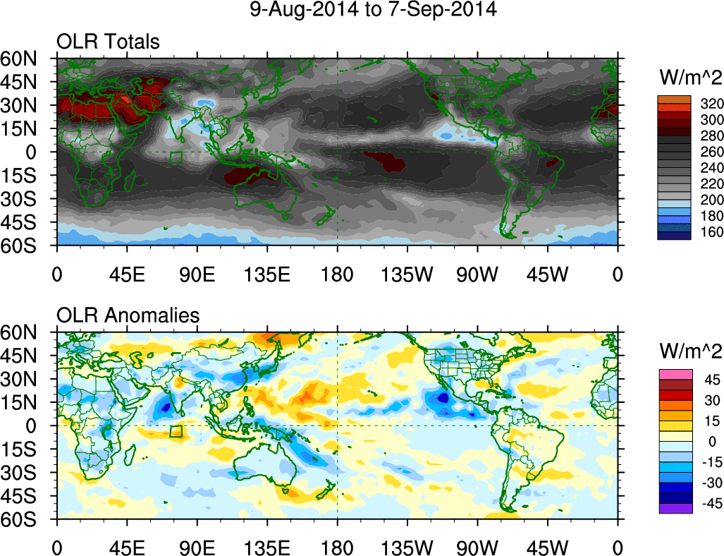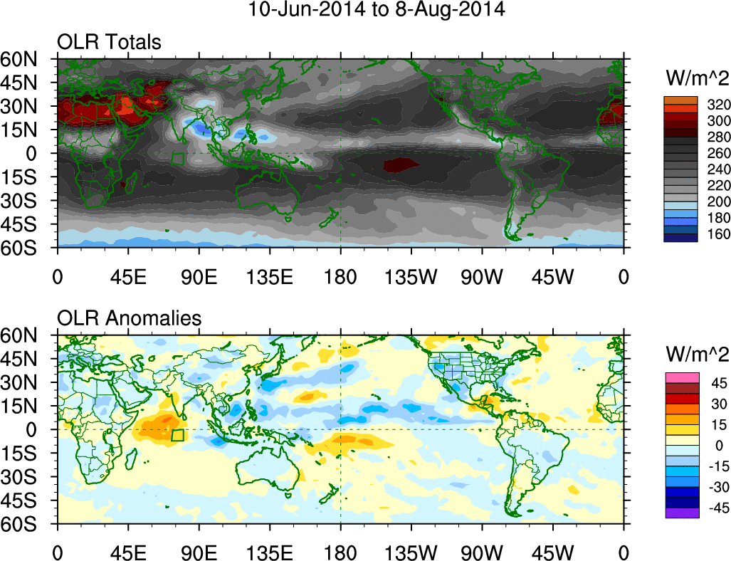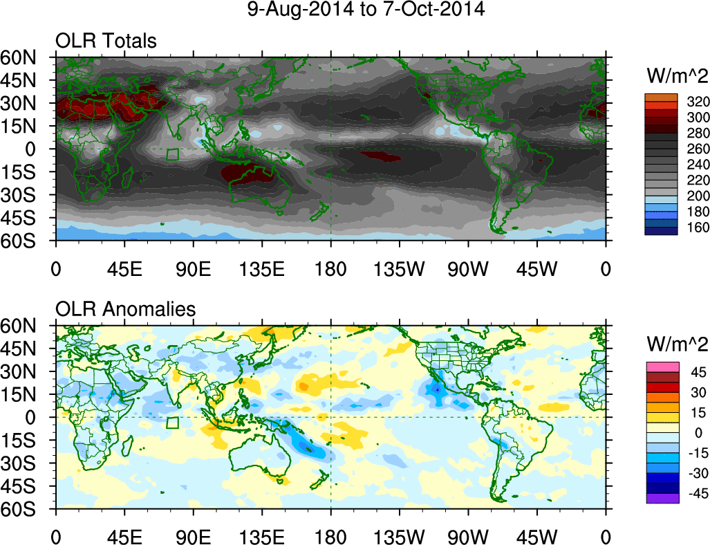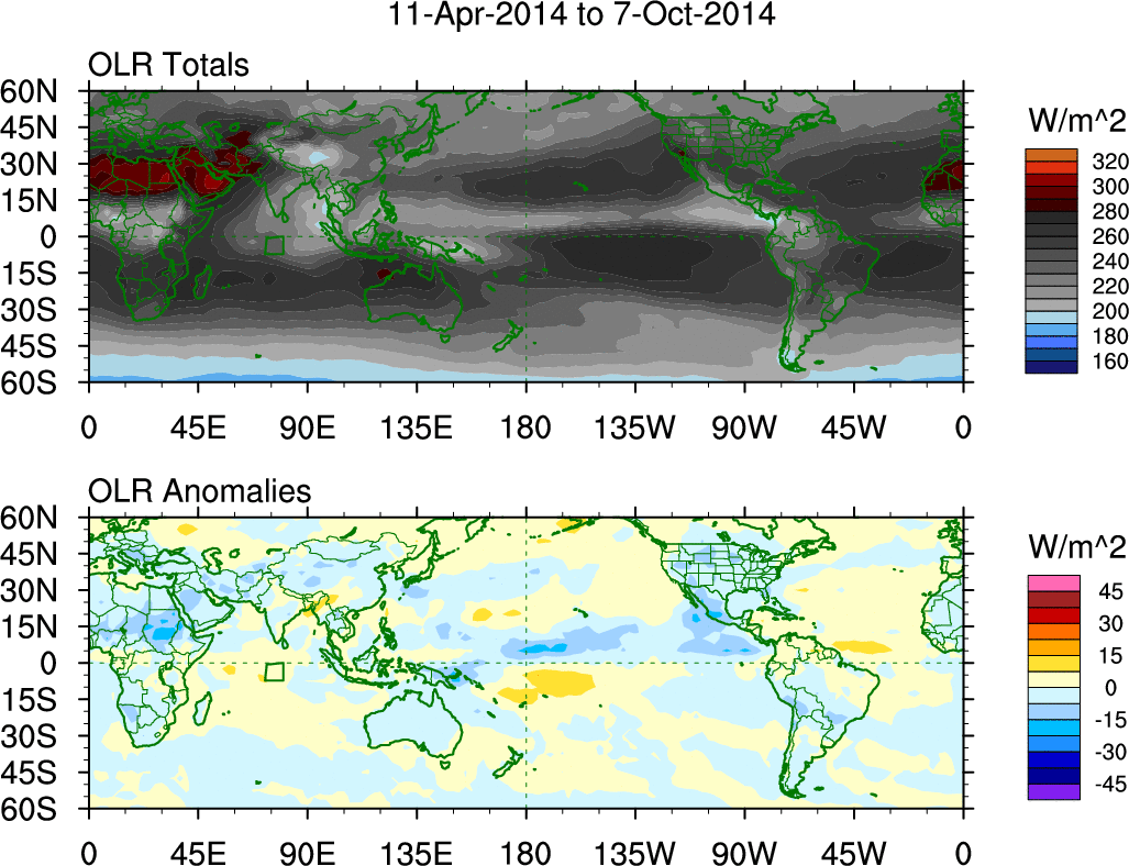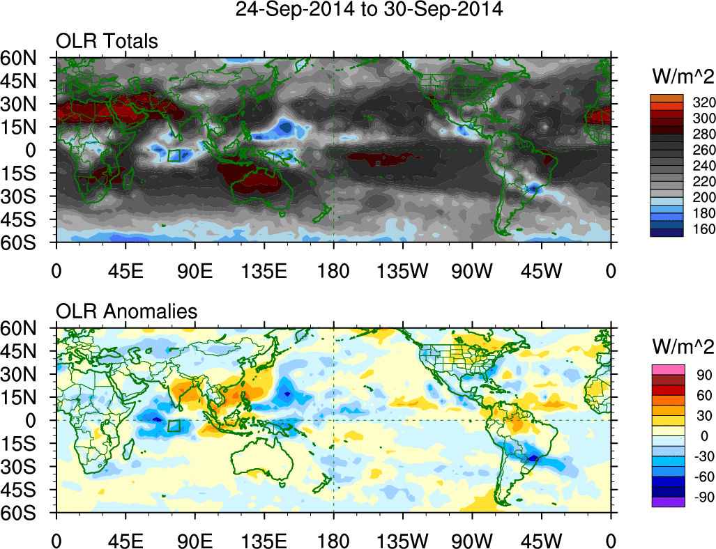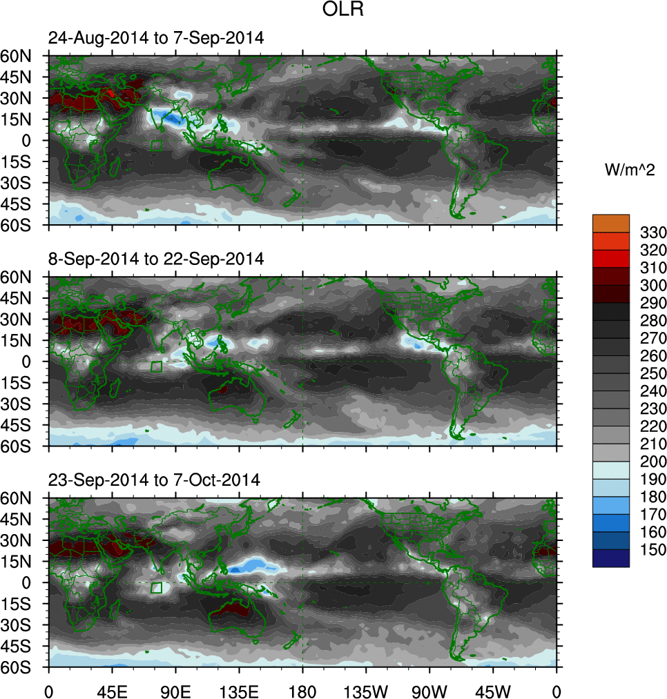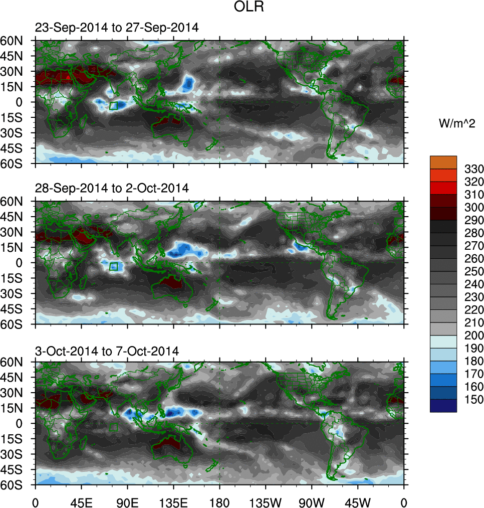 To identify tropical waves in near real-time, the OLR and UTWV data are filtered following Wheeler & Weickmann (2001 MWR). The daily anomalies are calculated using the first 3 harmonics of the seasonal cycle for 1979–2009. Missing values are then filled using linear interpolation in space and time. The most recent 365 days of anomalies are padded with 659 days of zeroes, and the result is filtered for each wave type.