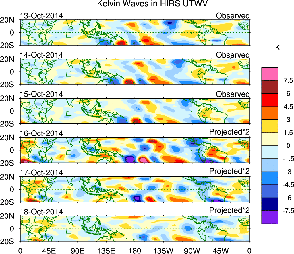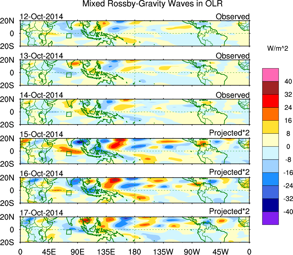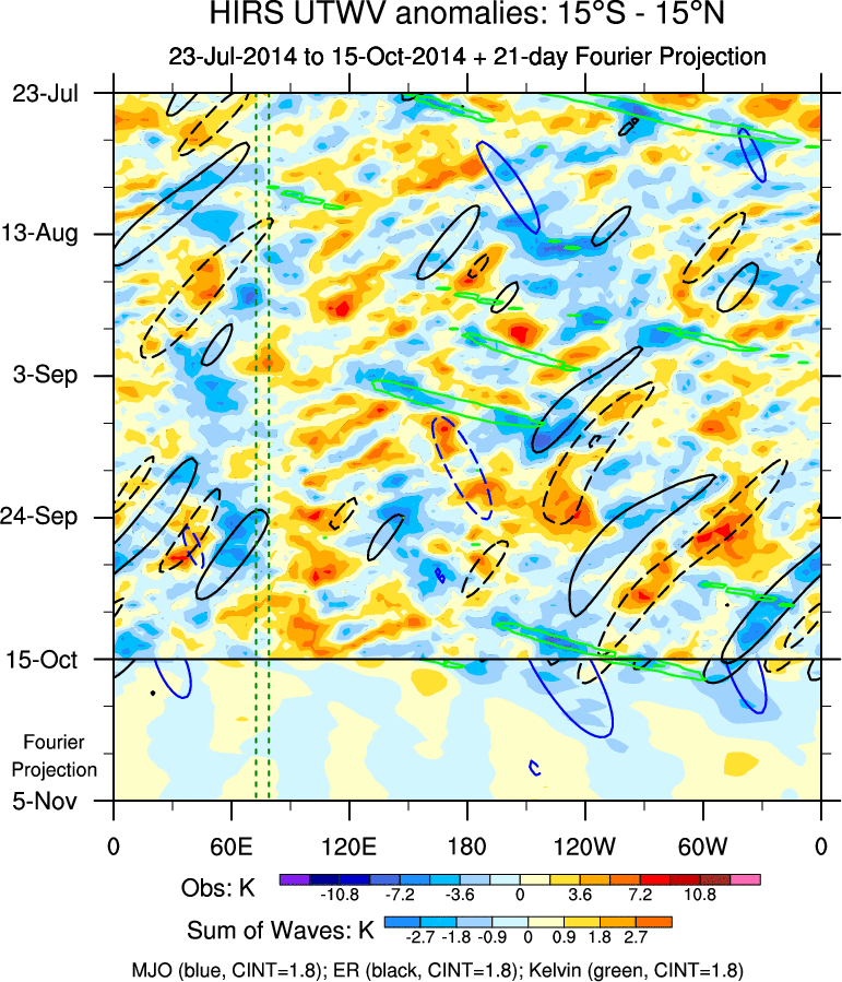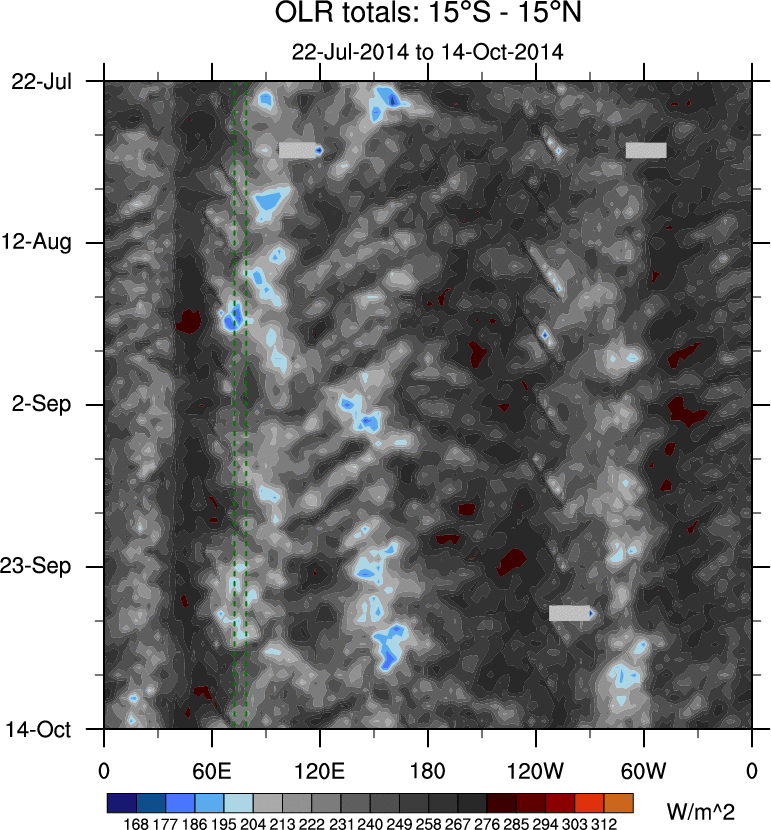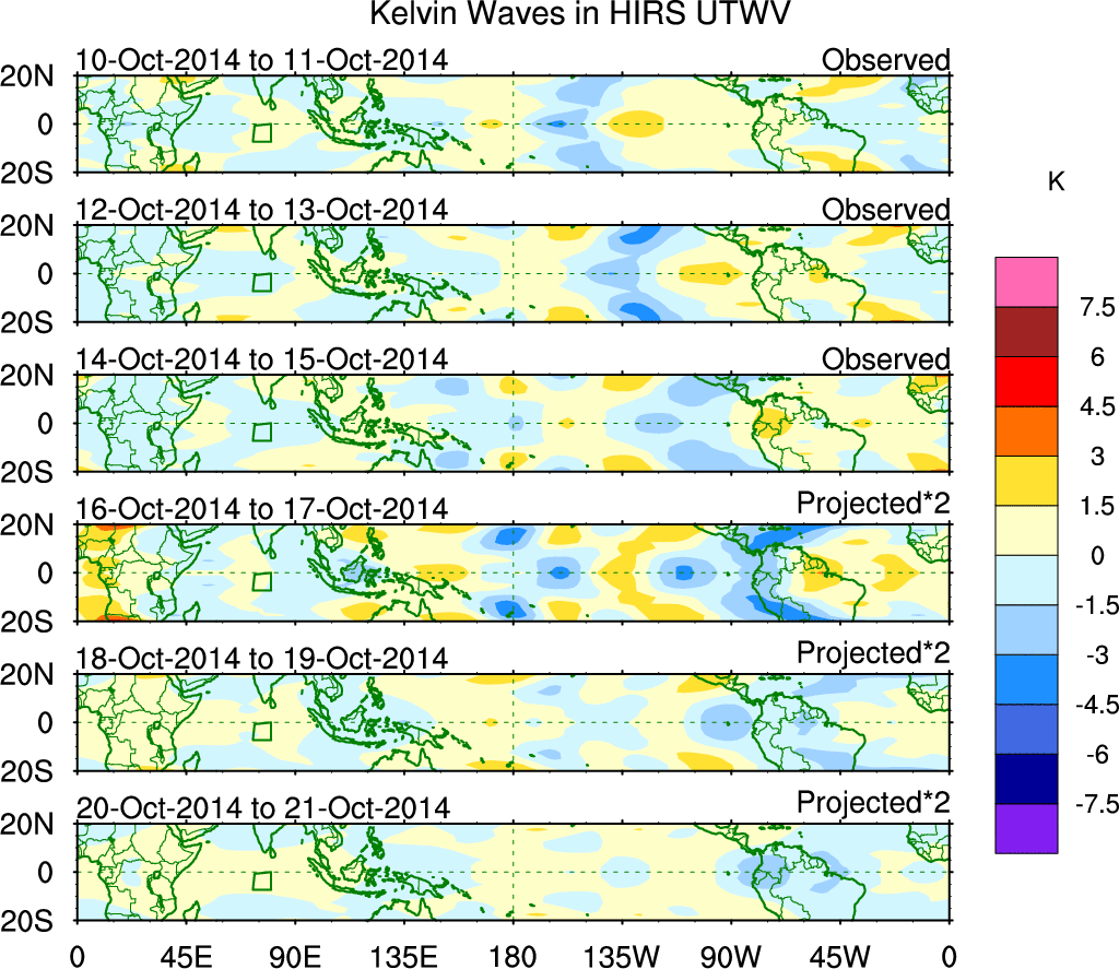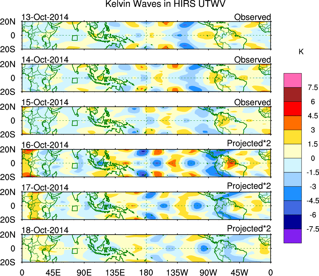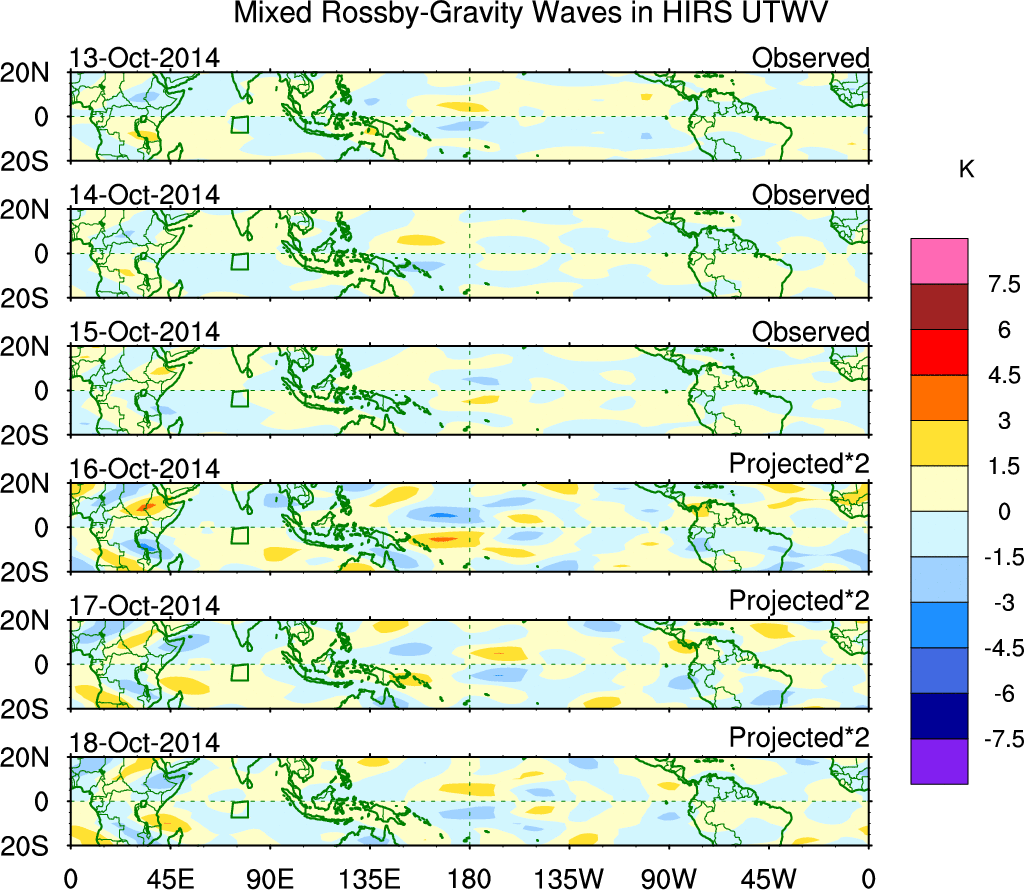 To identify tropical waves in near real-time, the OLR and UTWV data are filtered following Wheeler & Weickmann (2001 MWR). The daily anomalies are calculated using the first 3 harmonics of the seasonal cycle for 1979–2009. Missing values are then filled using linear interpolation in space and time. The most recent 365 days of anomalies are padded with 659 days of zeroes, and the result is filtered for each wave type.