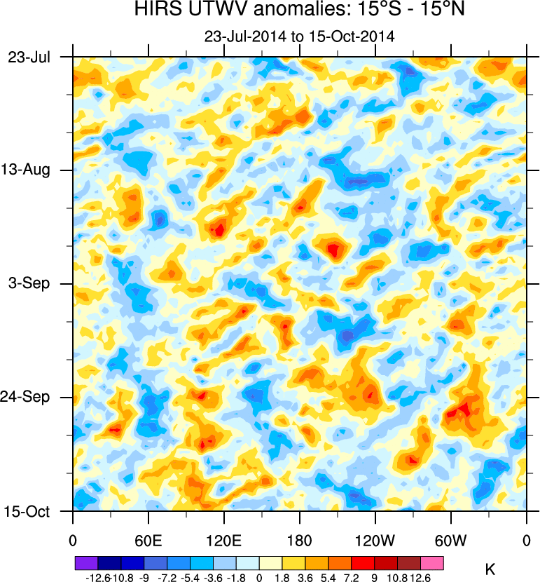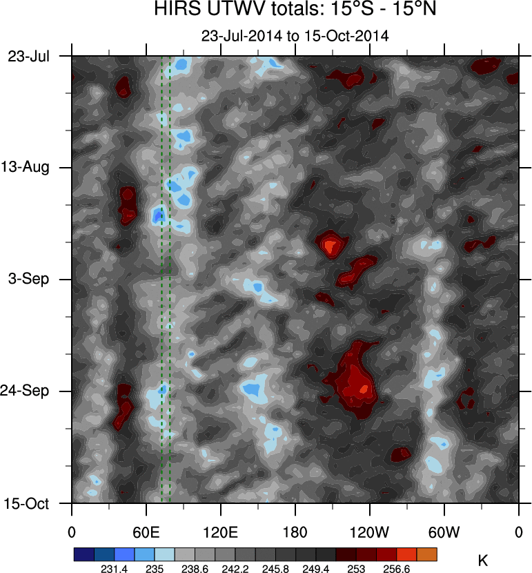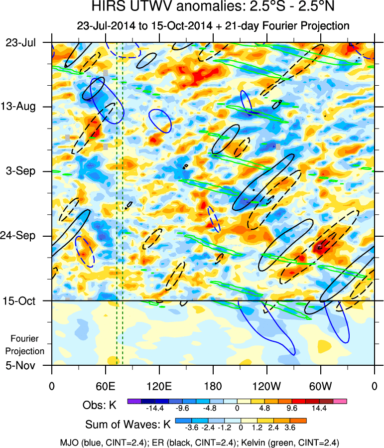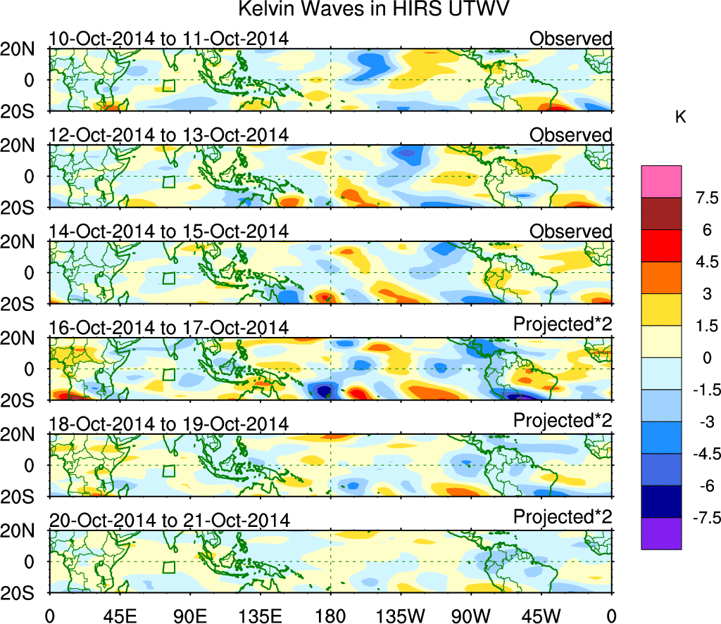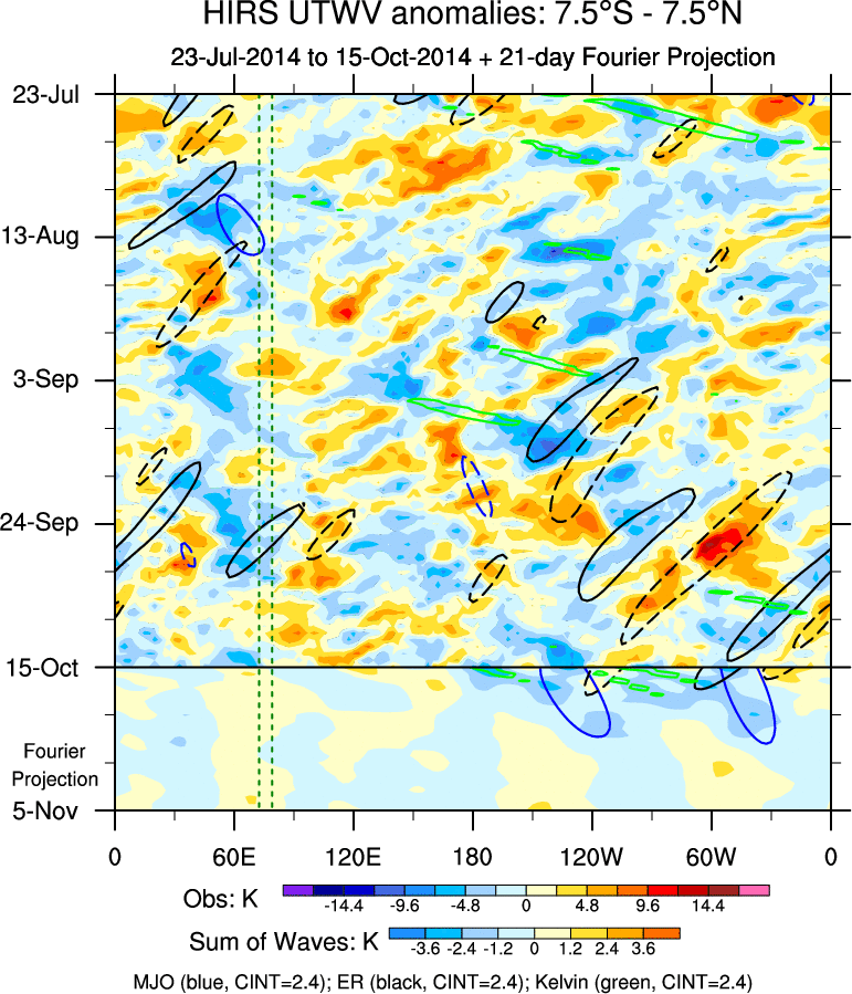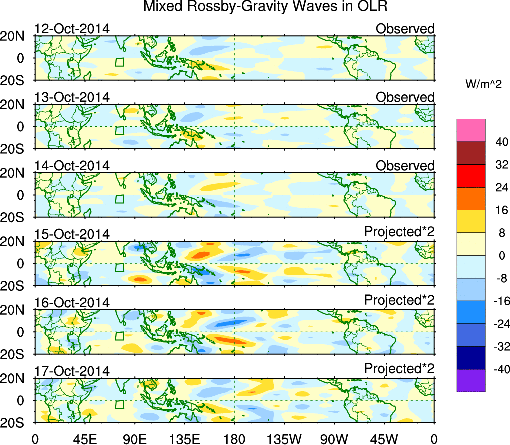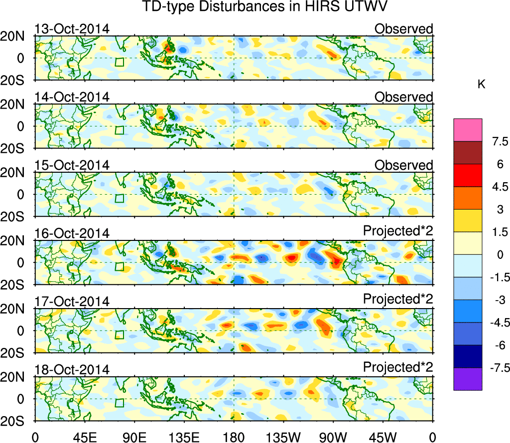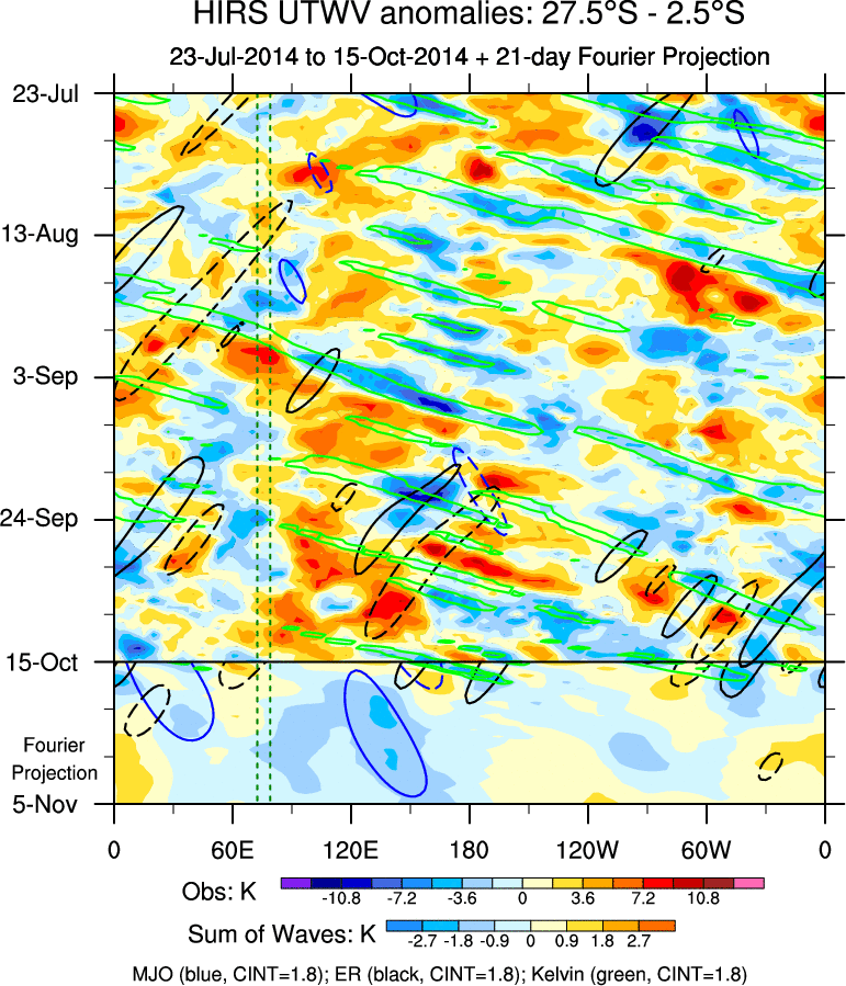 To identify tropical waves in near real-time, the OLR and UTWV data are filtered following Wheeler & Weickmann (2001 MWR). The daily anomalies are calculated using the first 3 harmonics of the seasonal cycle for 1979–2009. Missing values are then filled using linear interpolation in space and time. The most recent 365 days of anomalies are padded with 659 days of zeroes, and the result is filtered for each wave type.