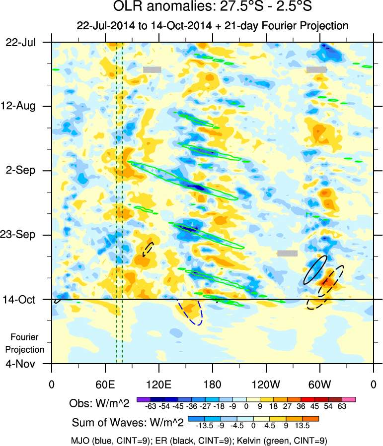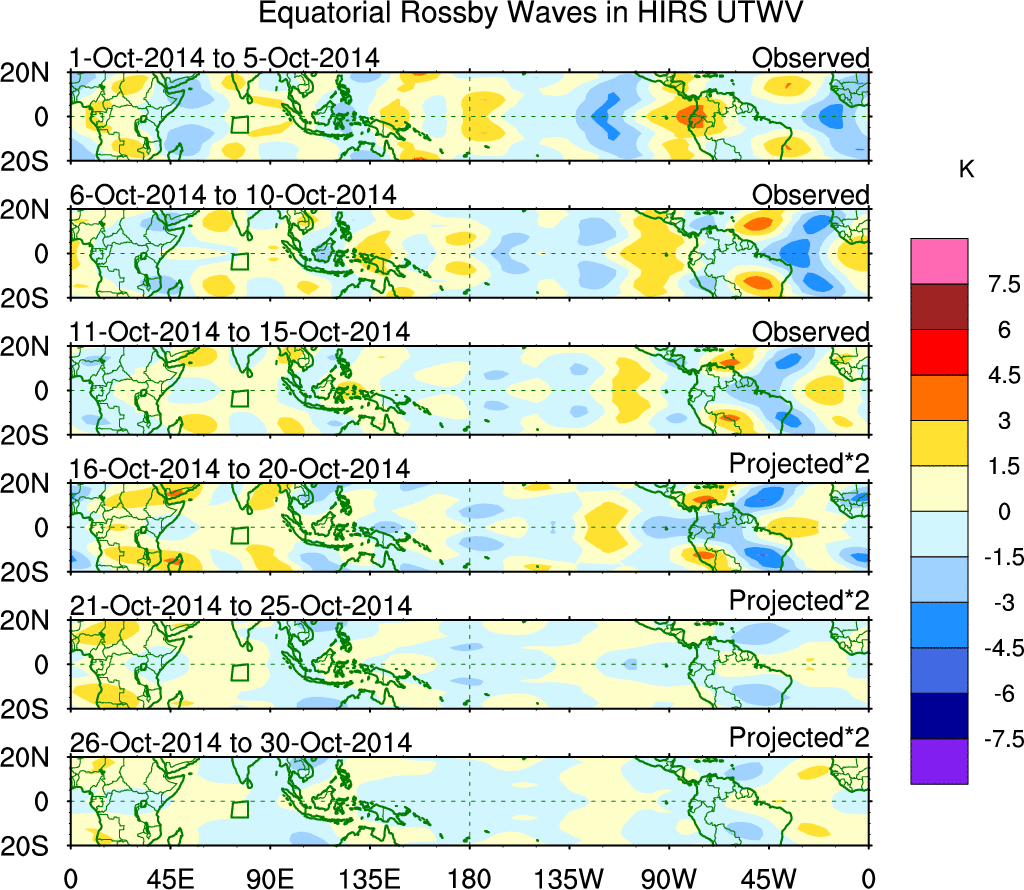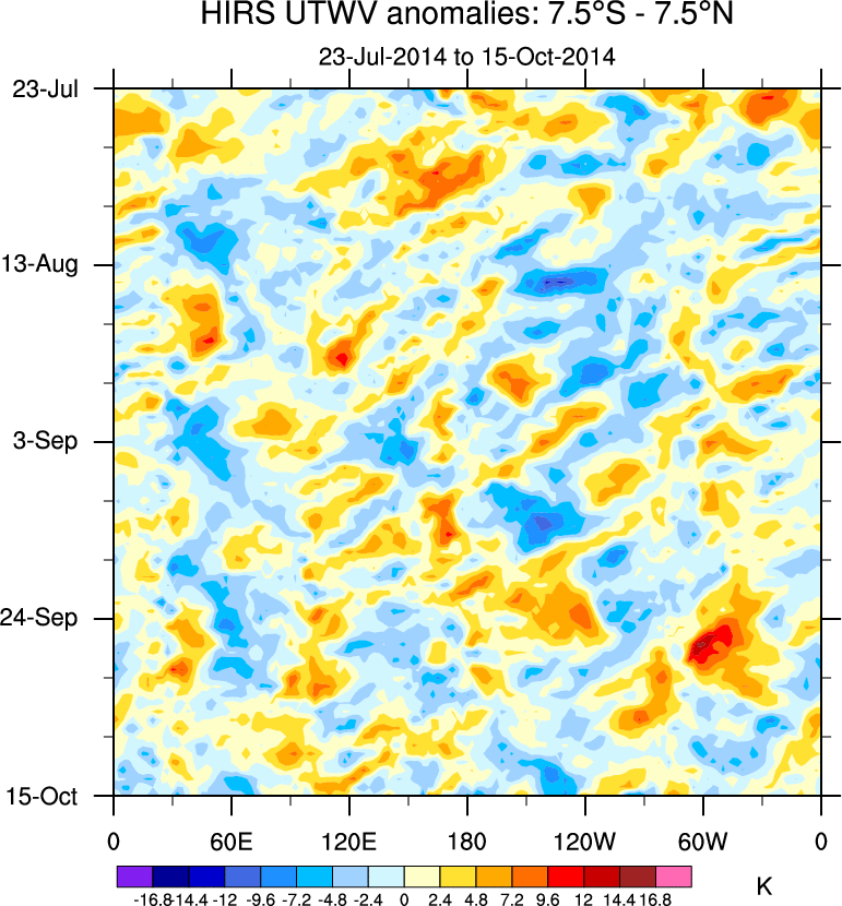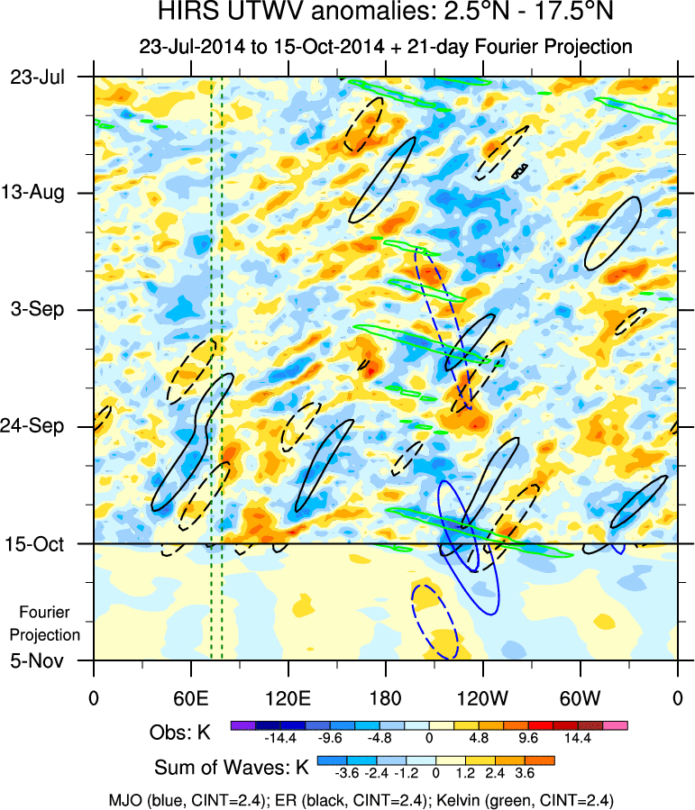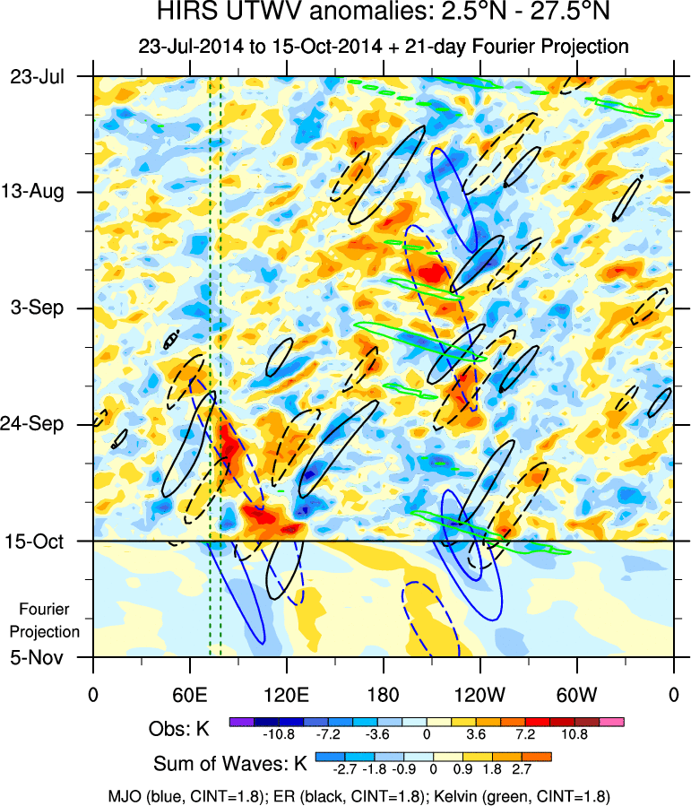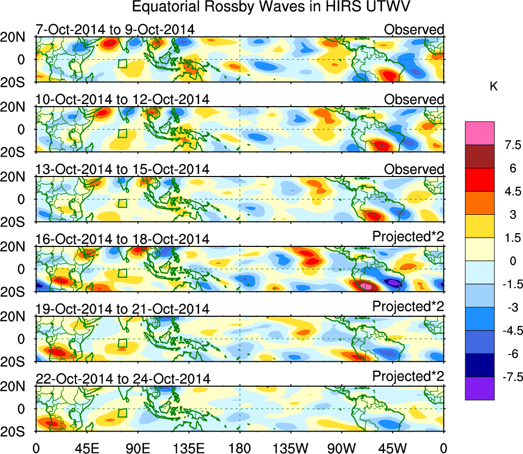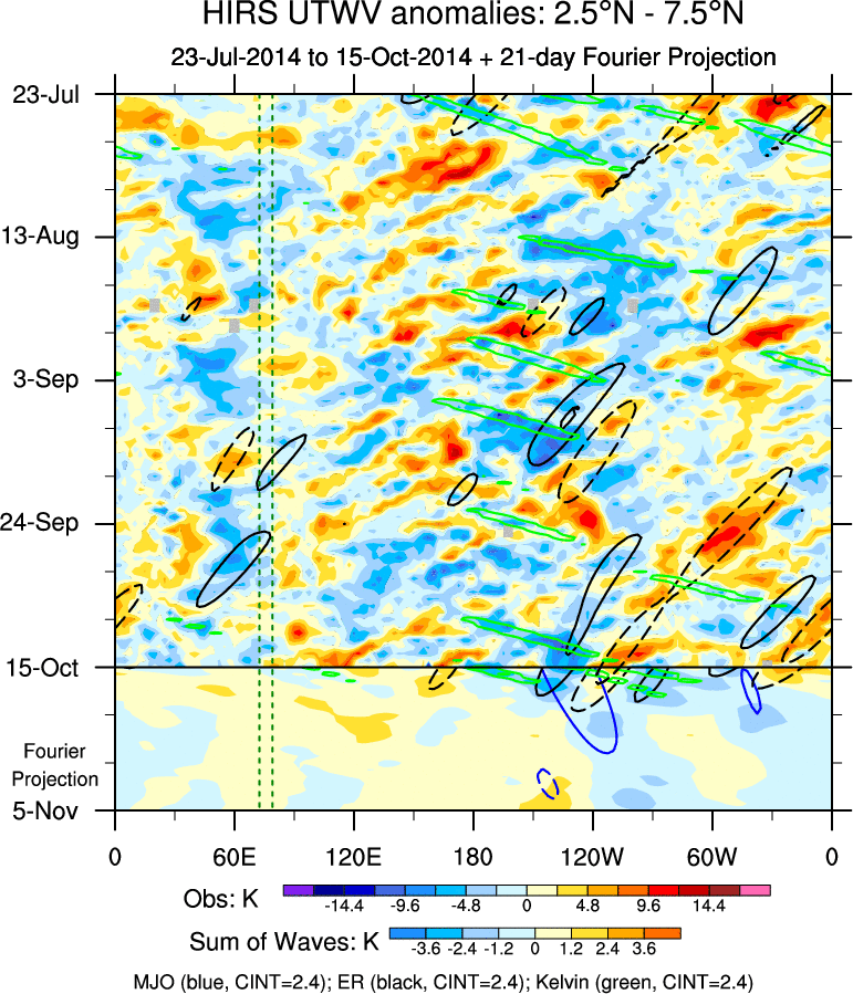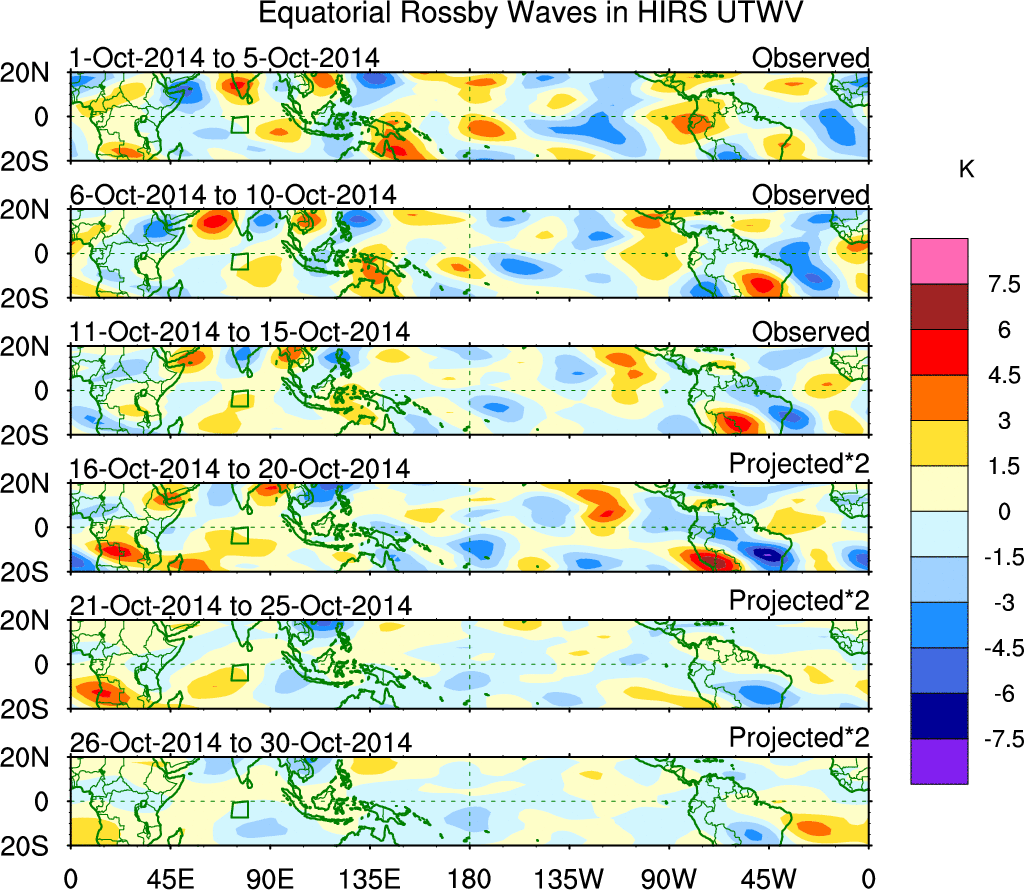 To identify tropical waves in near real-time, the OLR and UTWV data are filtered following Wheeler & Weickmann (2001 MWR). The daily anomalies are calculated using the first 3 harmonics of the seasonal cycle for 1979–2009. Missing values are then filled using linear interpolation in space and time. The most recent 365 days of anomalies are padded with 659 days of zeroes, and the result is filtered for each wave type.