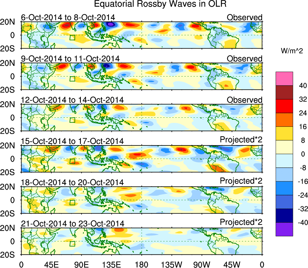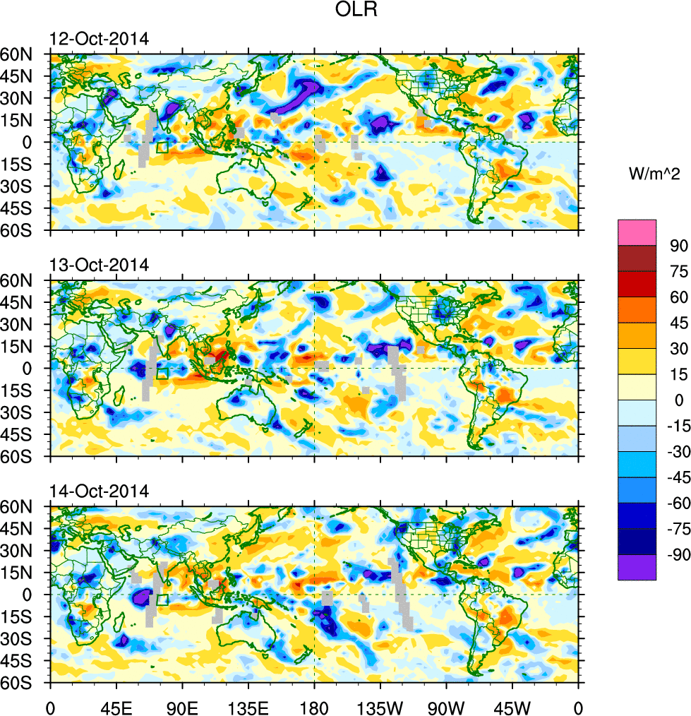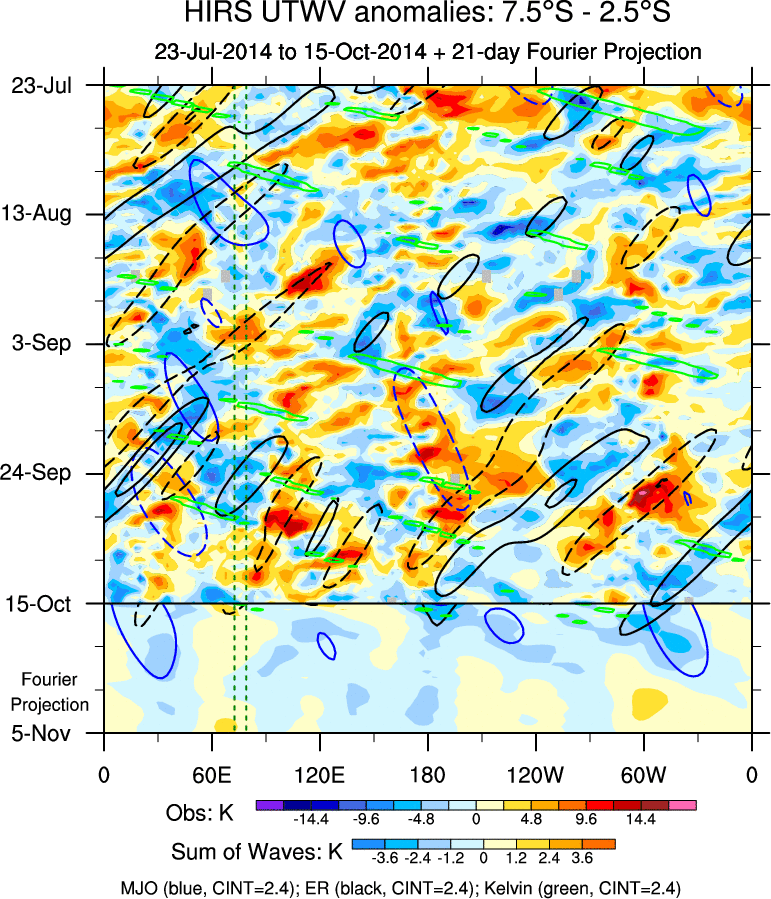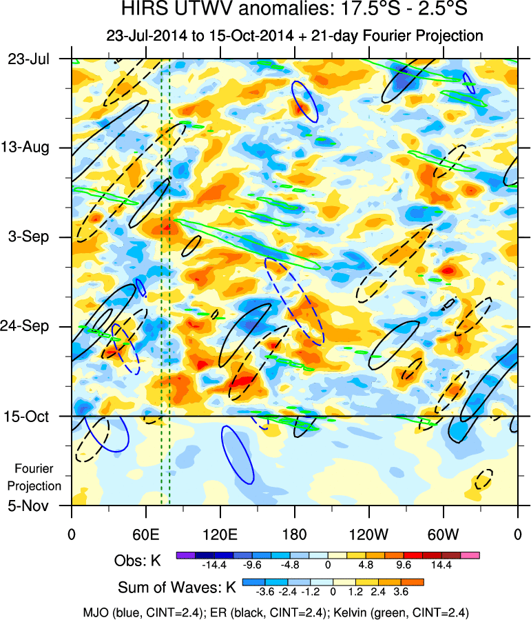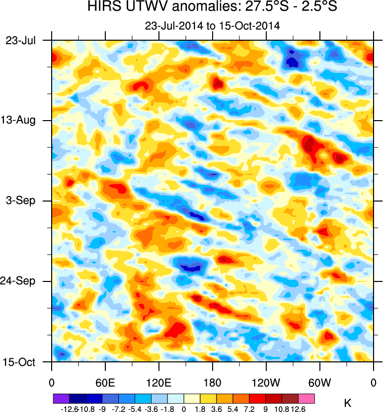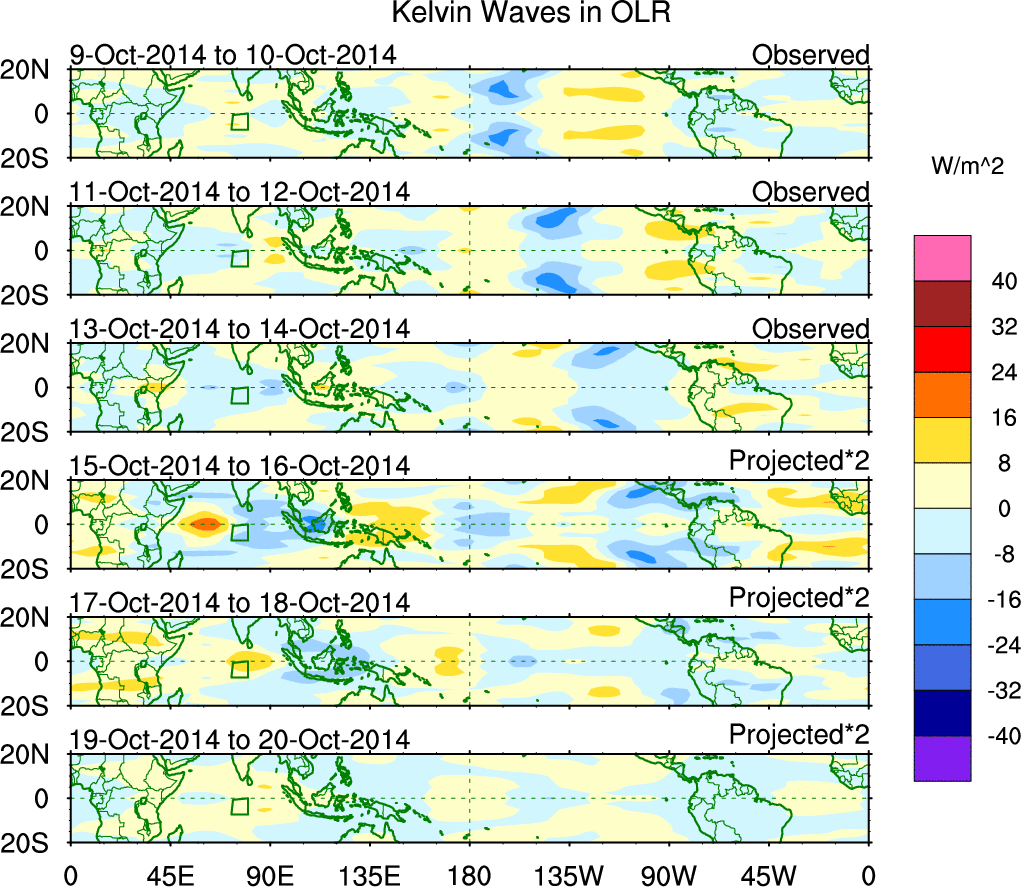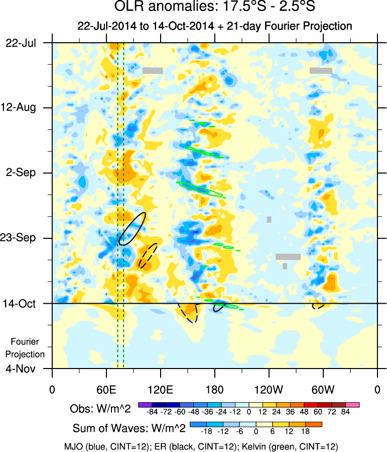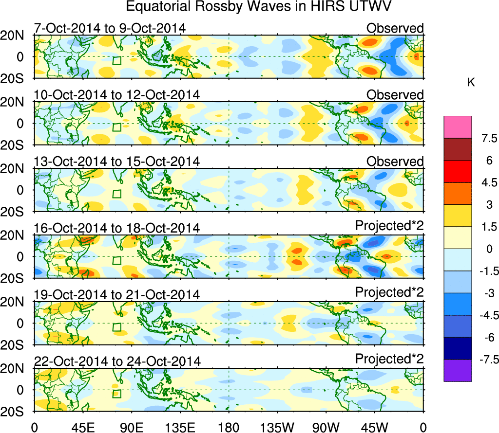 To identify tropical waves in near real-time, the OLR and UTWV data are filtered following Wheeler & Weickmann (2001 MWR). The daily anomalies are calculated using the first 3 harmonics of the seasonal cycle for 1979–2009. Missing values are then filled using linear interpolation in space and time. The most recent 365 days of anomalies are padded with 659 days of zeroes, and the result is filtered for each wave type.