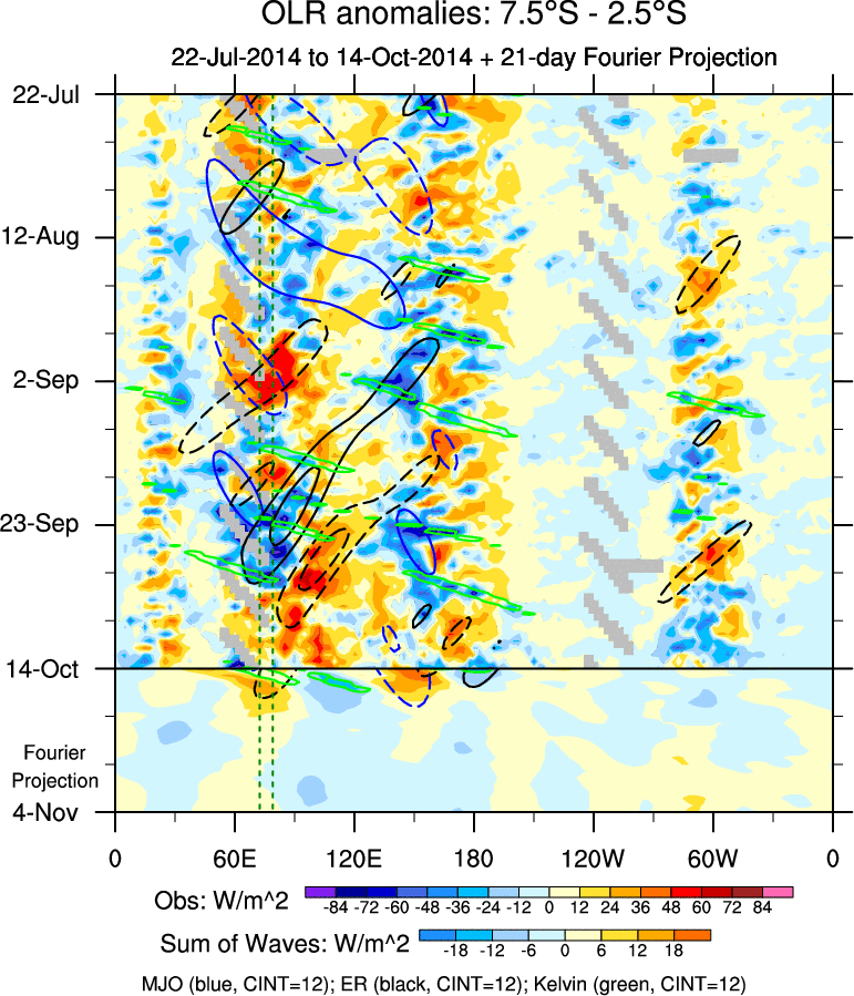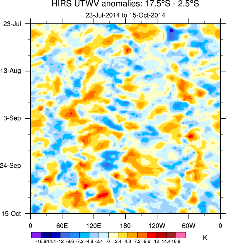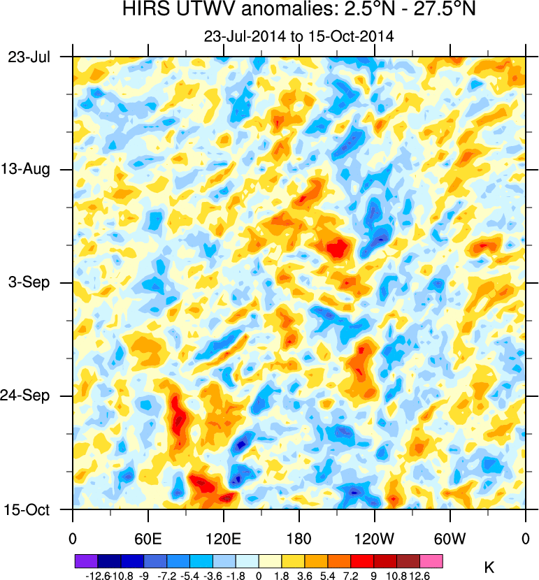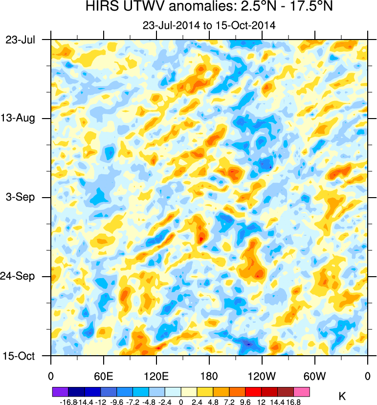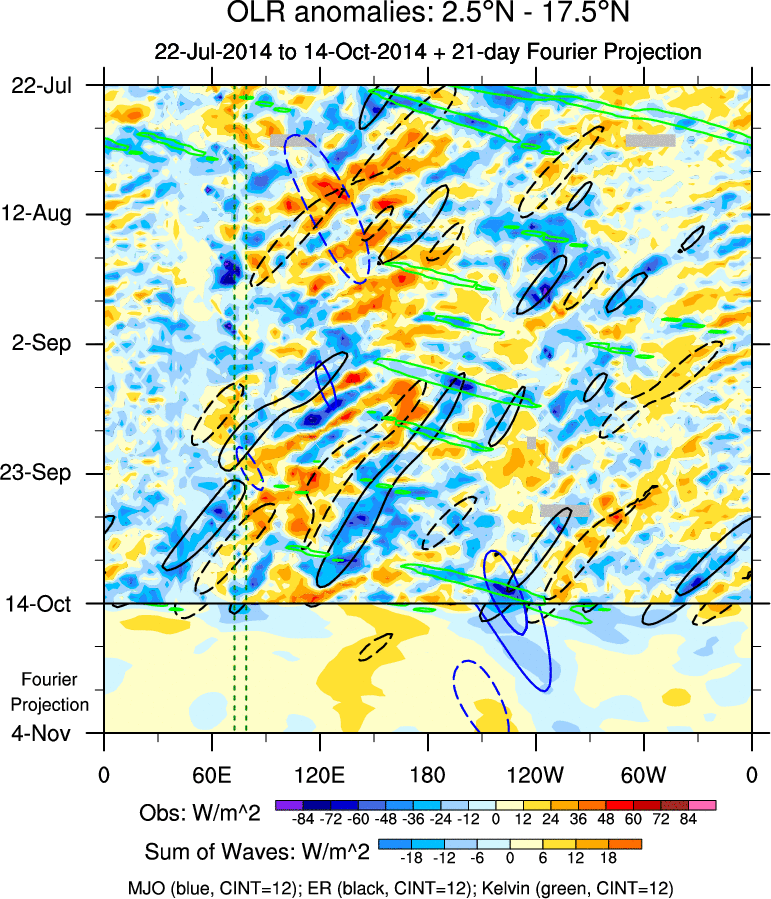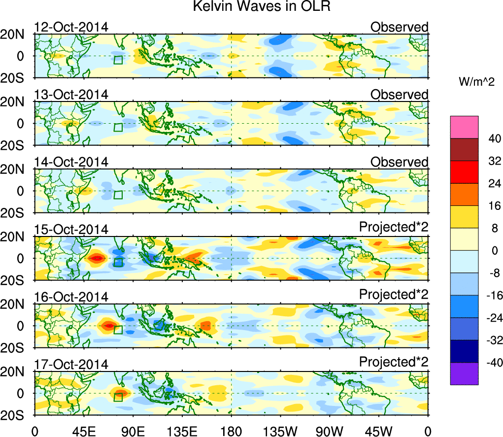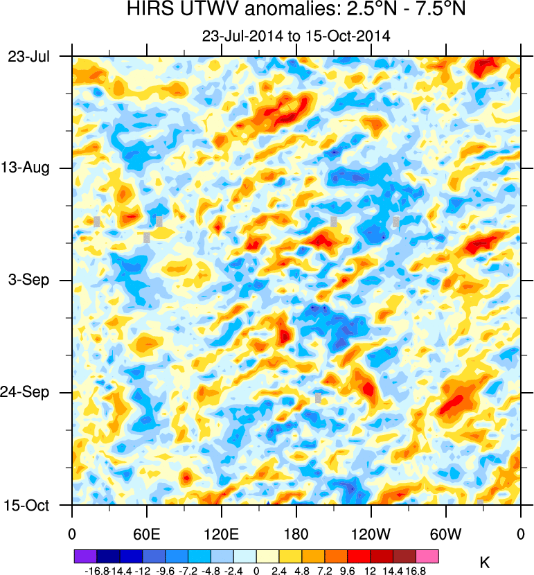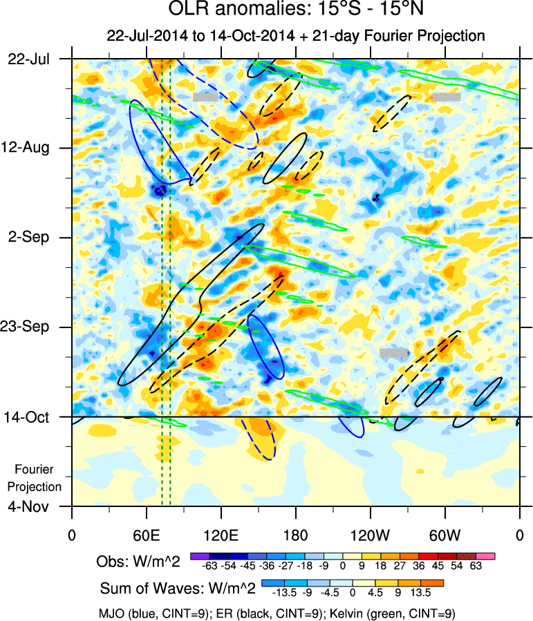 To identify tropical waves in near real-time, the OLR and UTWV data are filtered following Wheeler & Weickmann (2001 MWR). The daily anomalies are calculated using the first 3 harmonics of the seasonal cycle for 1979–2009. Missing values are then filled using linear interpolation in space and time. The most recent 365 days of anomalies are padded with 659 days of zeroes, and the result is filtered for each wave type.