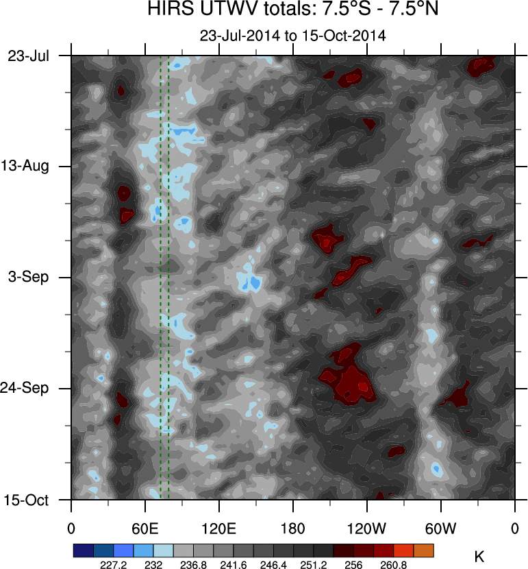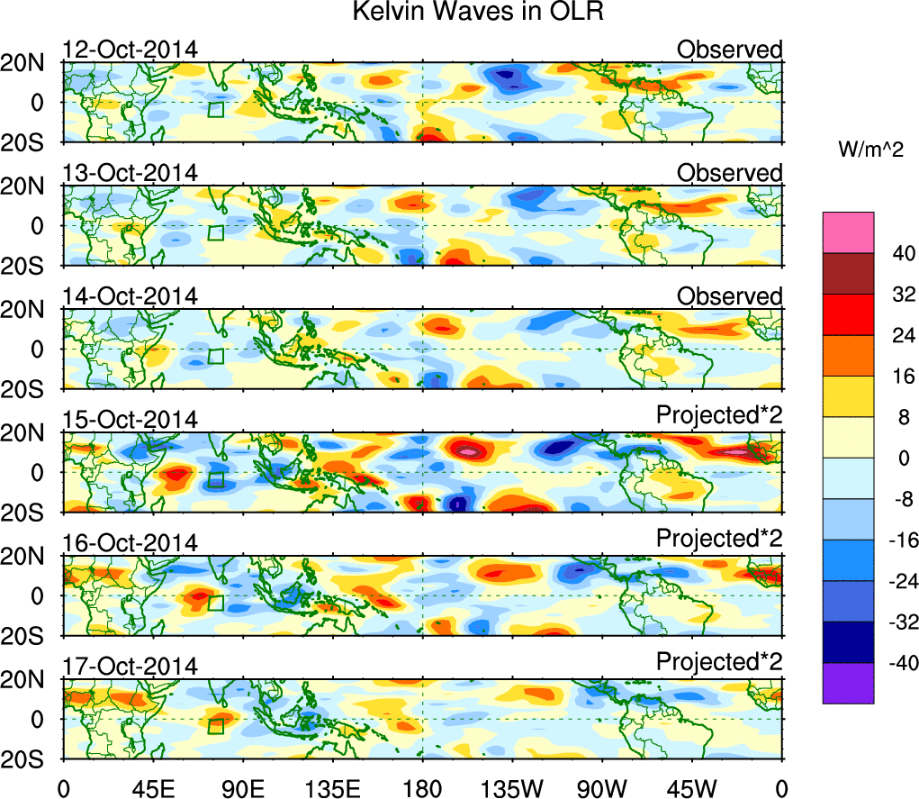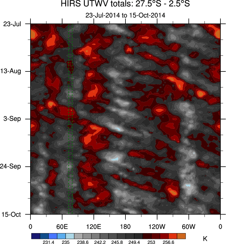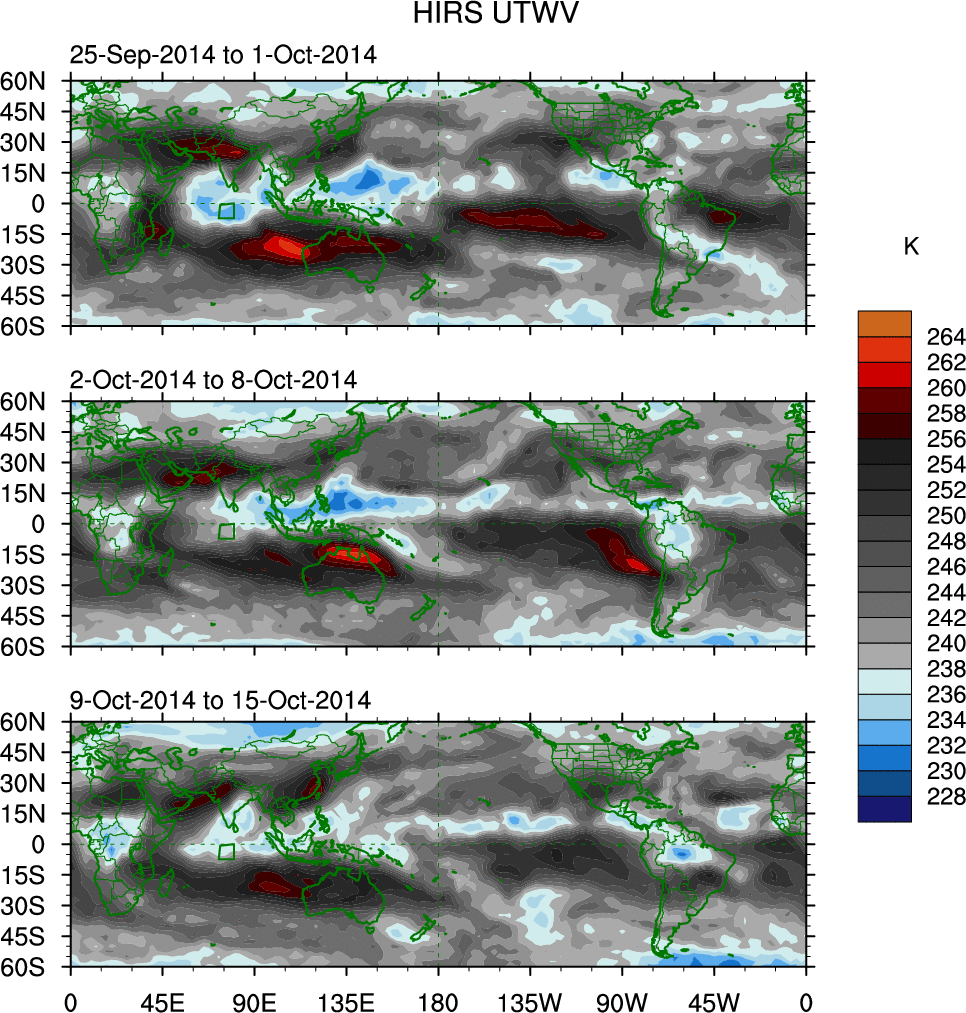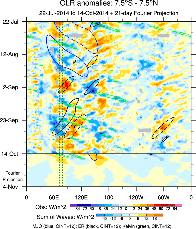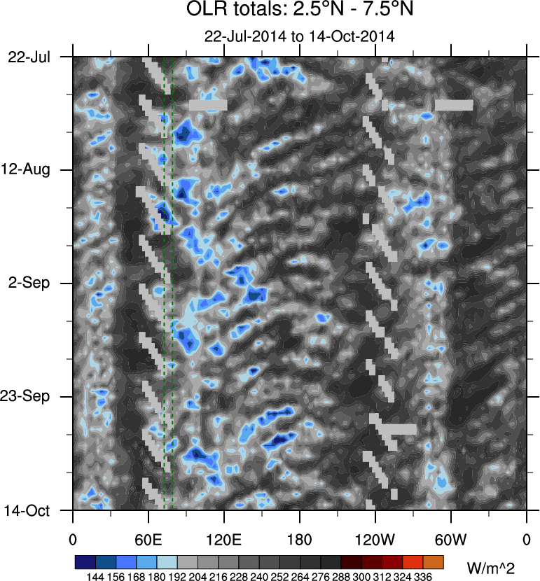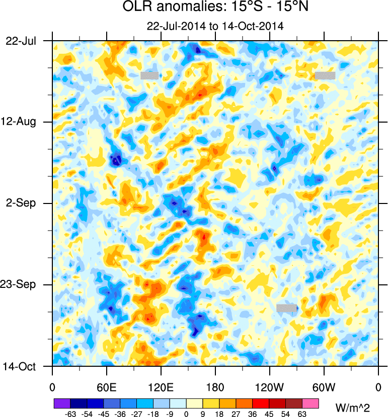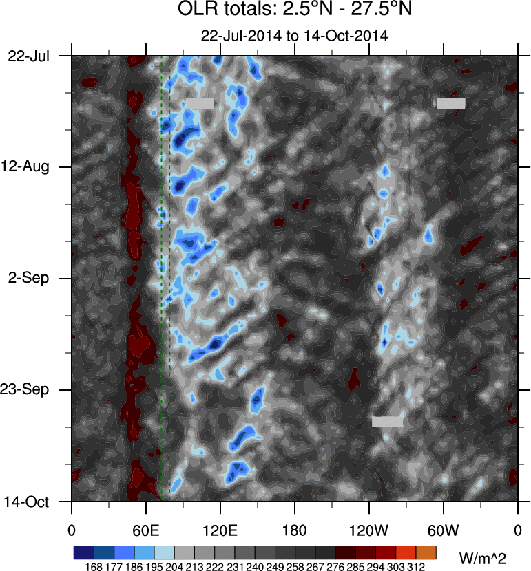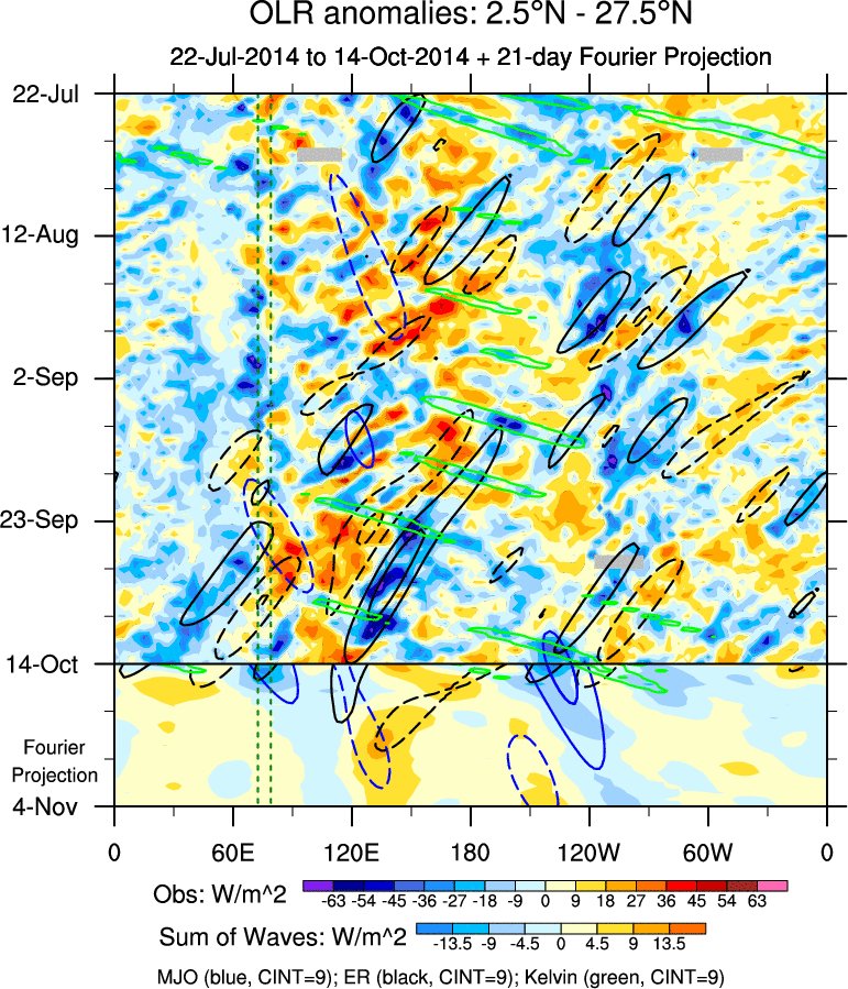 To identify tropical waves in near real-time, the OLR and UTWV data are filtered following Wheeler & Weickmann (2001 MWR). The daily anomalies are calculated using the first 3 harmonics of the seasonal cycle for 1979–2009. Missing values are then filled using linear interpolation in space and time. The most recent 365 days of anomalies are padded with 659 days of zeroes, and the result is filtered for each wave type.