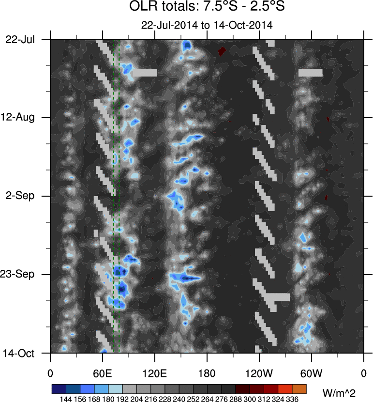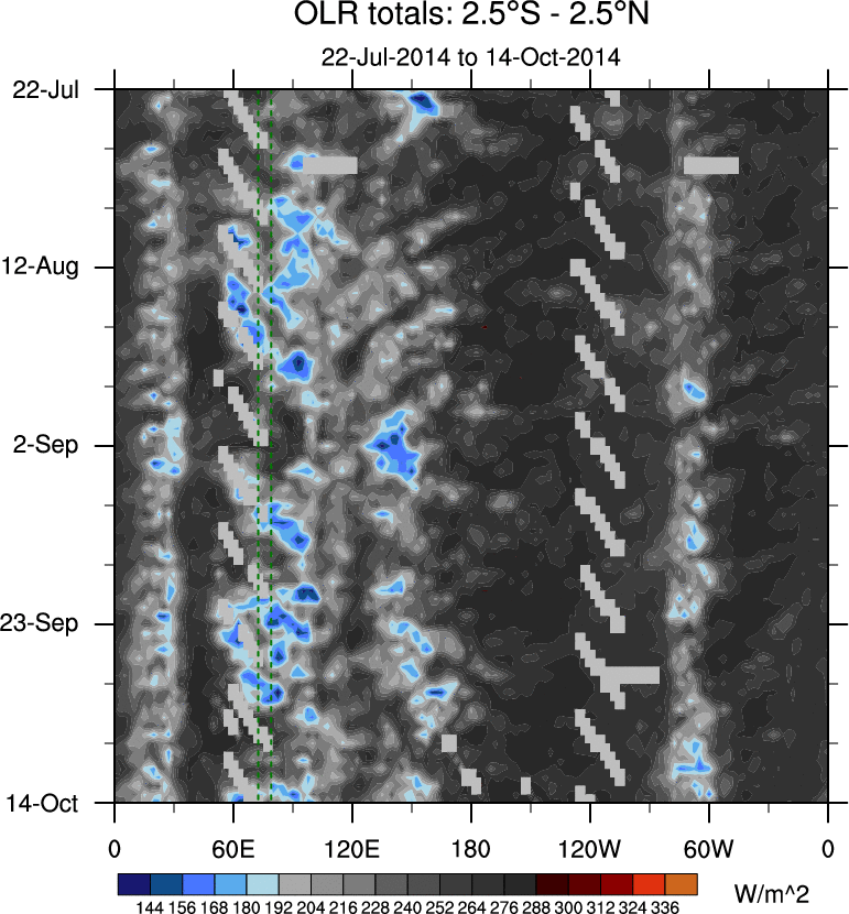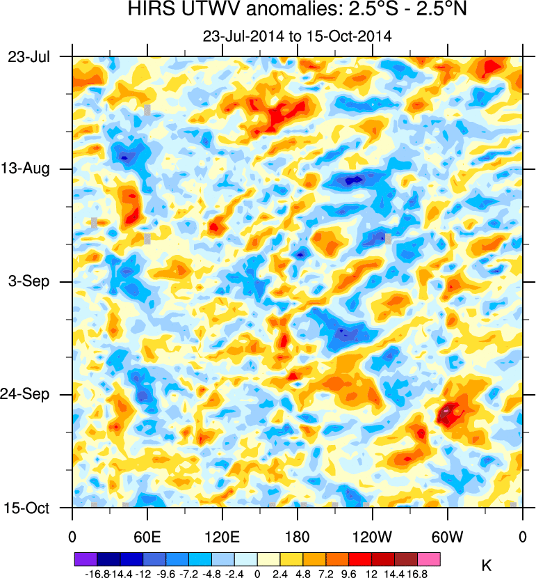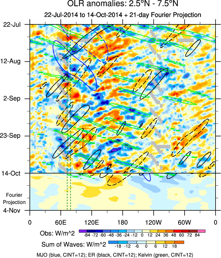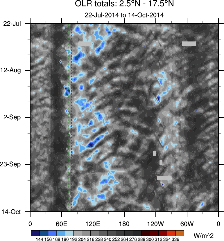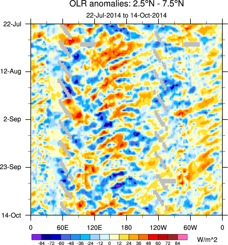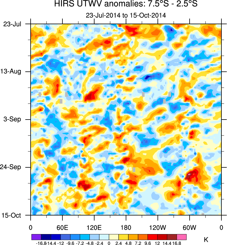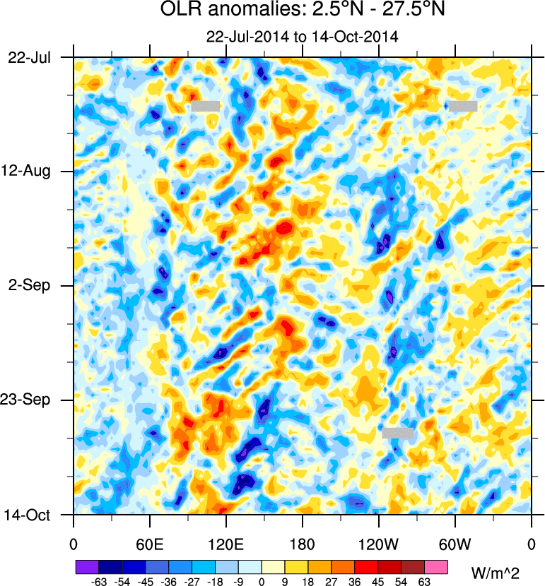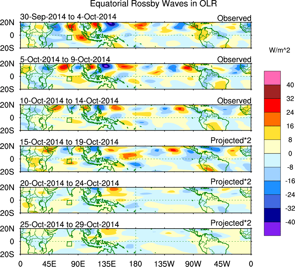 To identify tropical waves in near real-time, the OLR and UTWV data are filtered following Wheeler & Weickmann (2001 MWR). The daily anomalies are calculated using the first 3 harmonics of the seasonal cycle for 1979–2009. Missing values are then filled using linear interpolation in space and time. The most recent 365 days of anomalies are padded with 659 days of zeroes, and the result is filtered for each wave type.