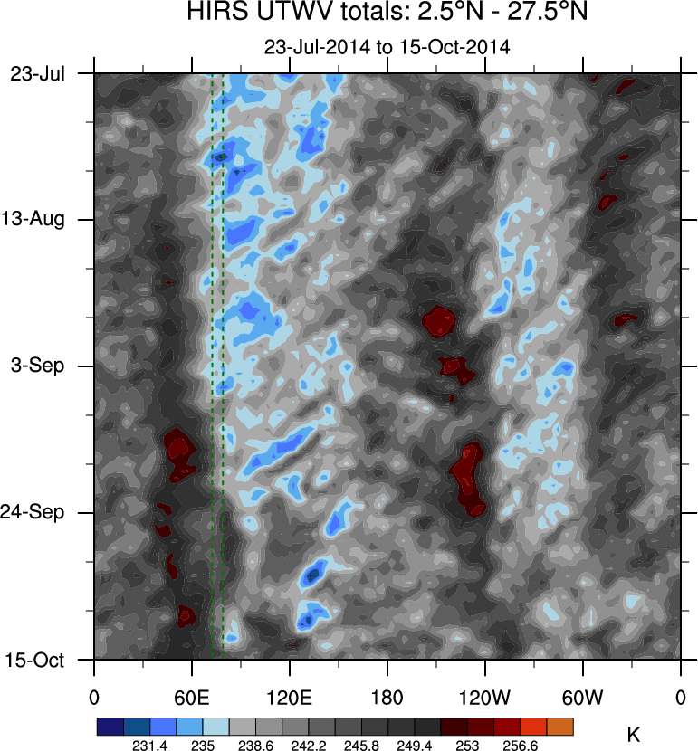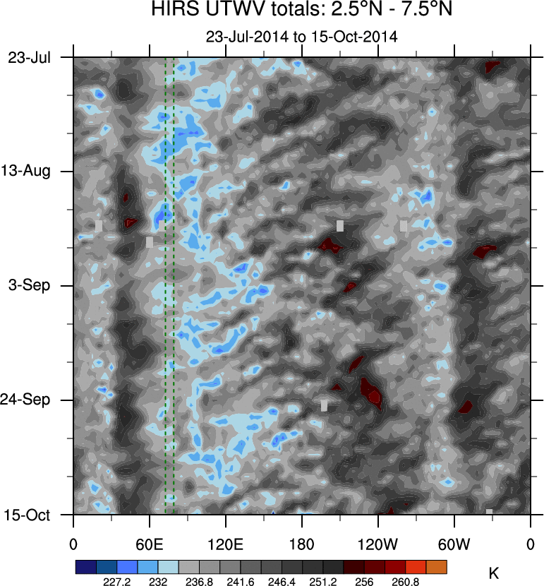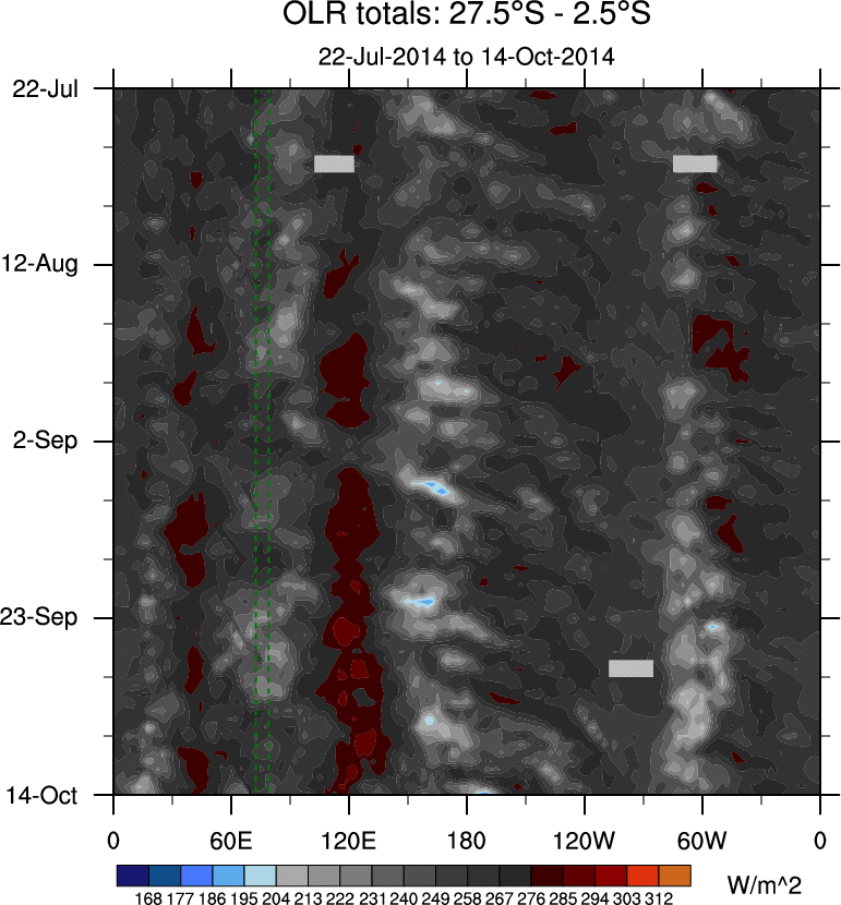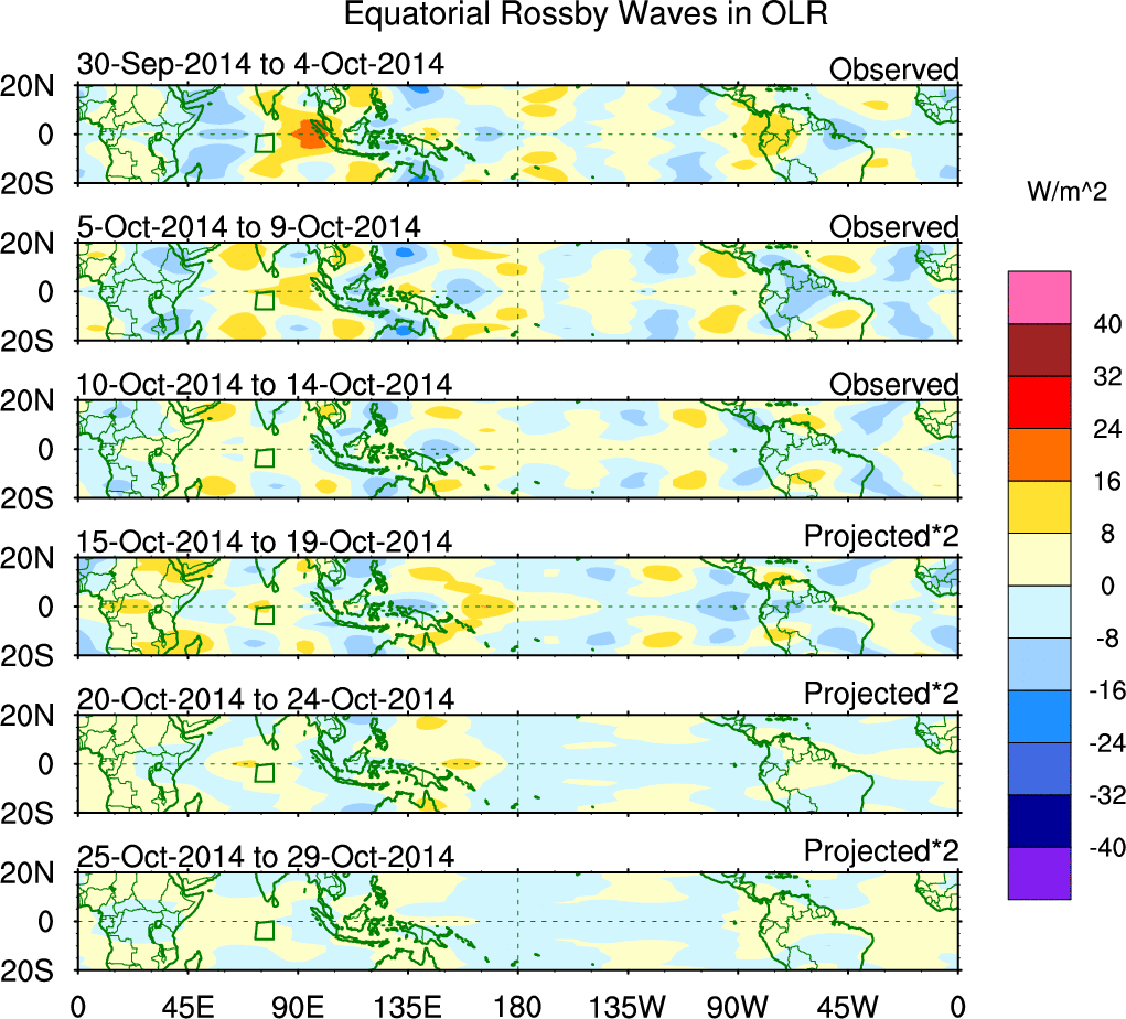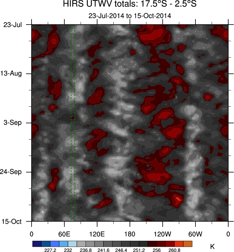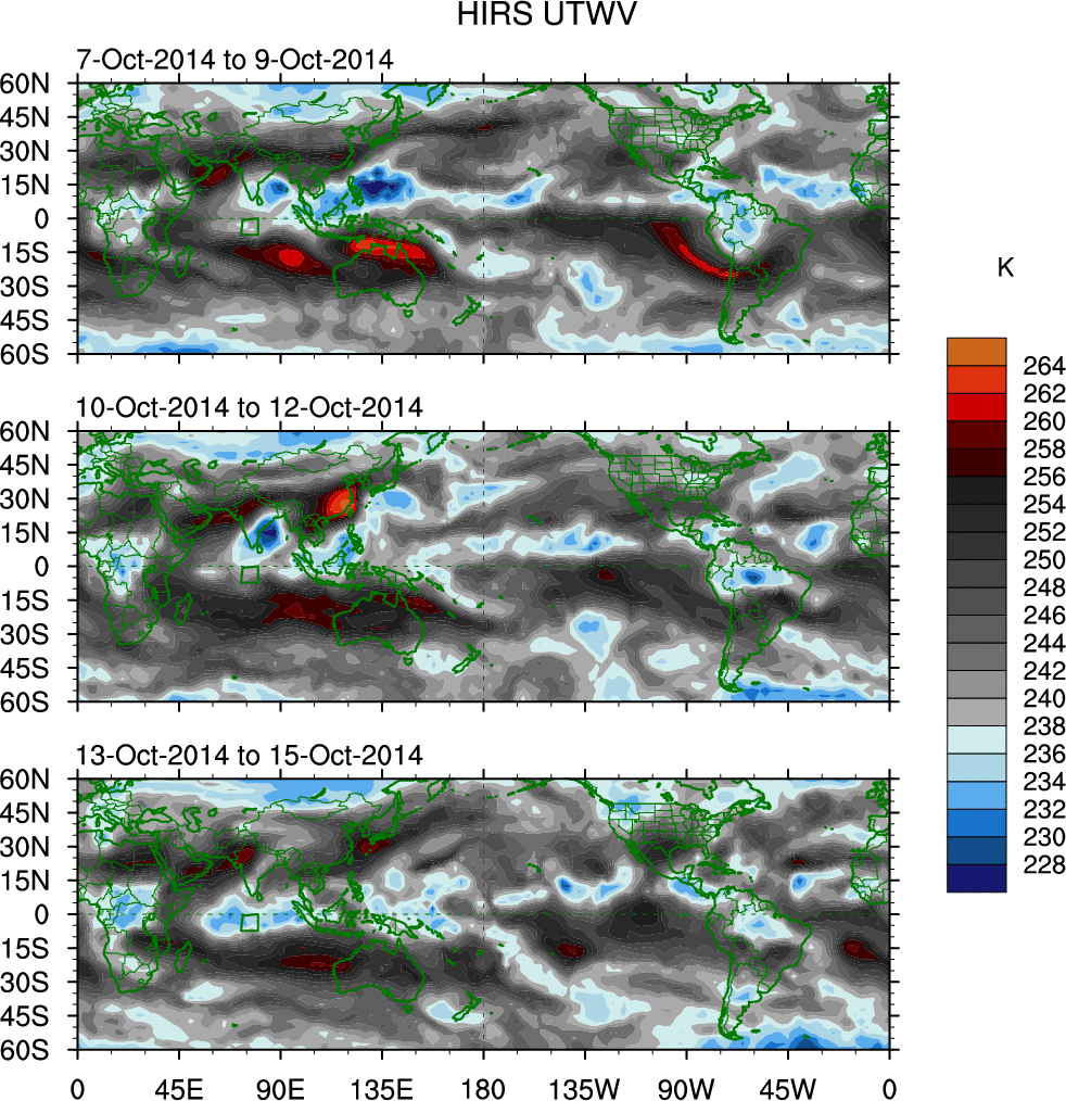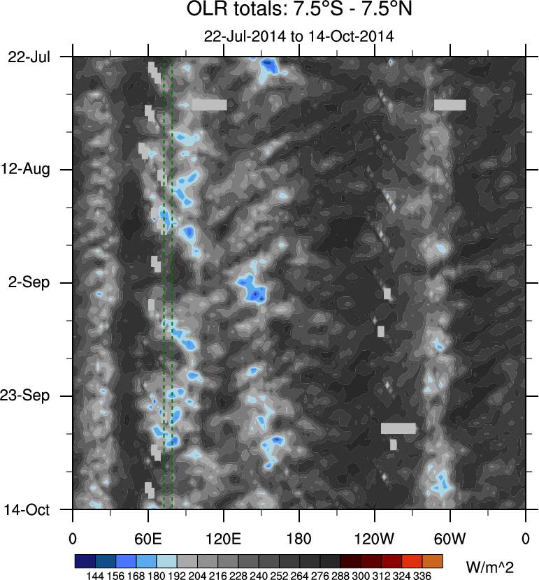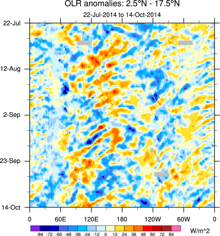To identify tropical waves in near real-time, the OLR and UTWV data are filtered following Wheeler & Weickmann (2001 MWR). The daily anomalies are calculated using the first 3 harmonics of the seasonal cycle for 1979–2009. Missing values are then filled using linear interpolation in space and time. The most recent 365 days of anomalies are padded with 659 days of zeroes, and the result is filtered for each wave type.