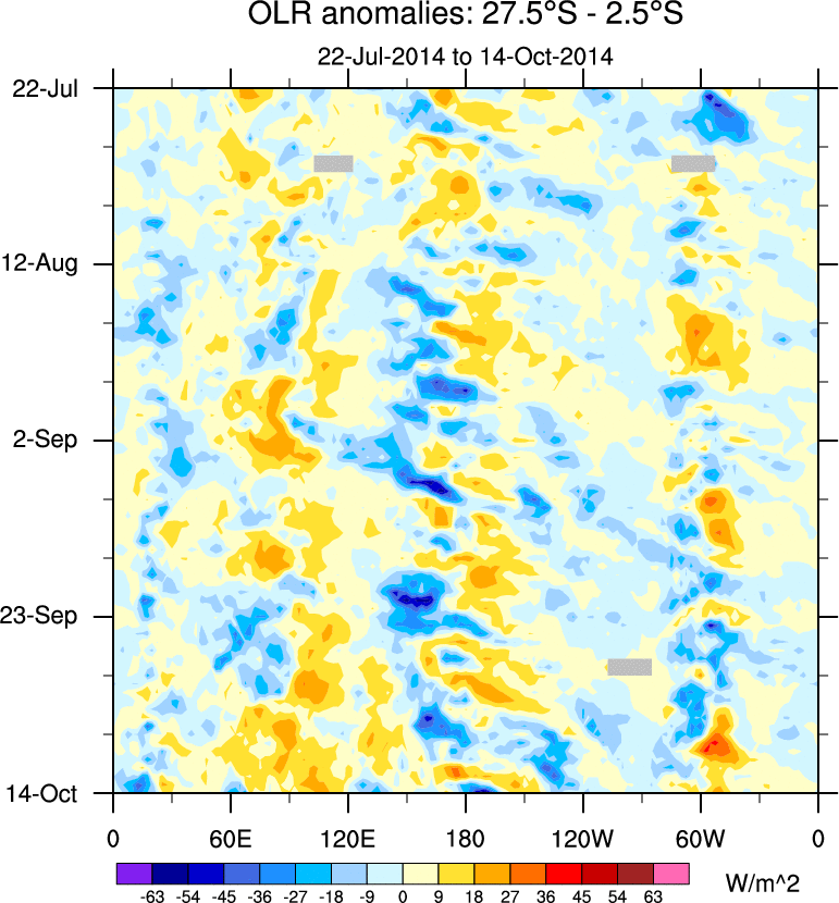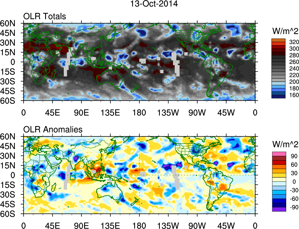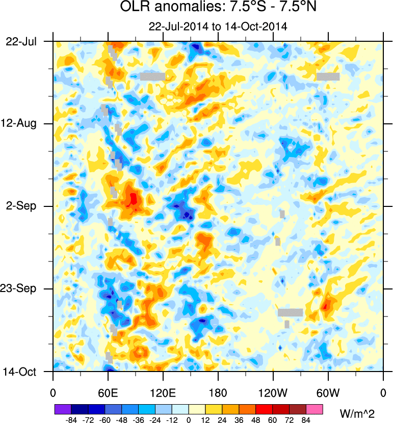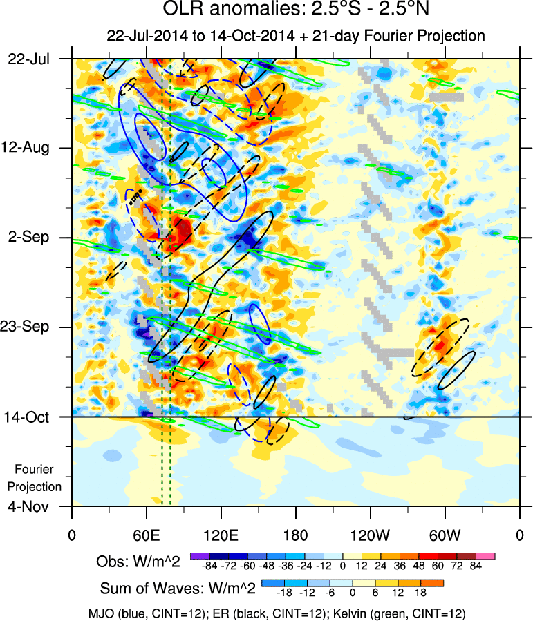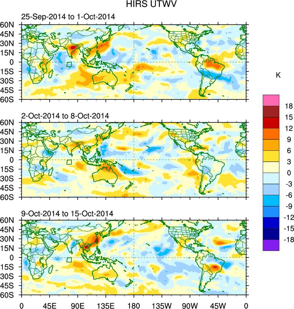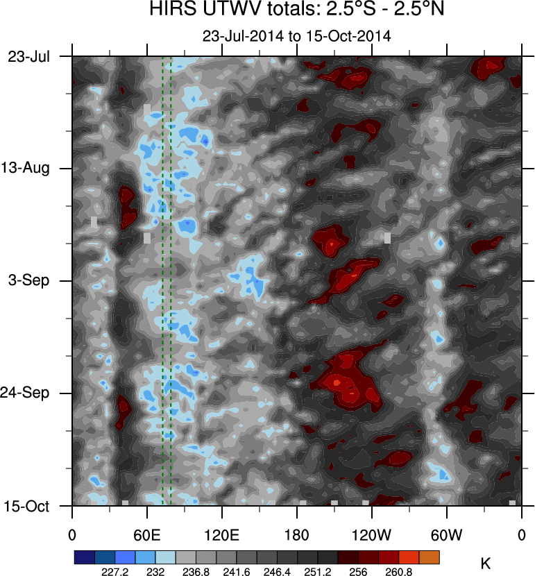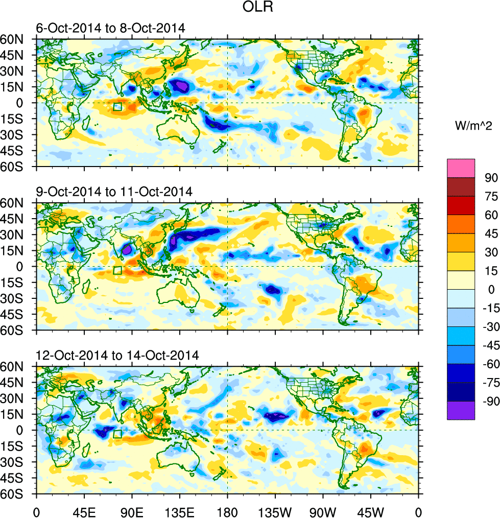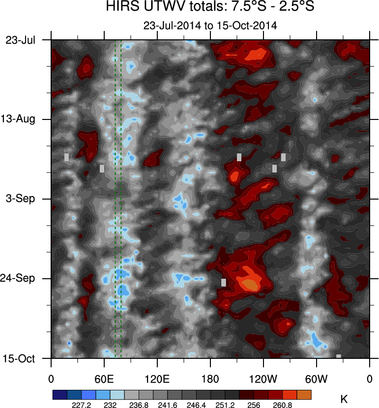 To identify tropical waves in near real-time, the OLR and UTWV data are filtered following Wheeler & Weickmann (2001 MWR). The daily anomalies are calculated using the first 3 harmonics of the seasonal cycle for 1979–2009. Missing values are then filled using linear interpolation in space and time. The most recent 365 days of anomalies are padded with 659 days of zeroes, and the result is filtered for each wave type.
